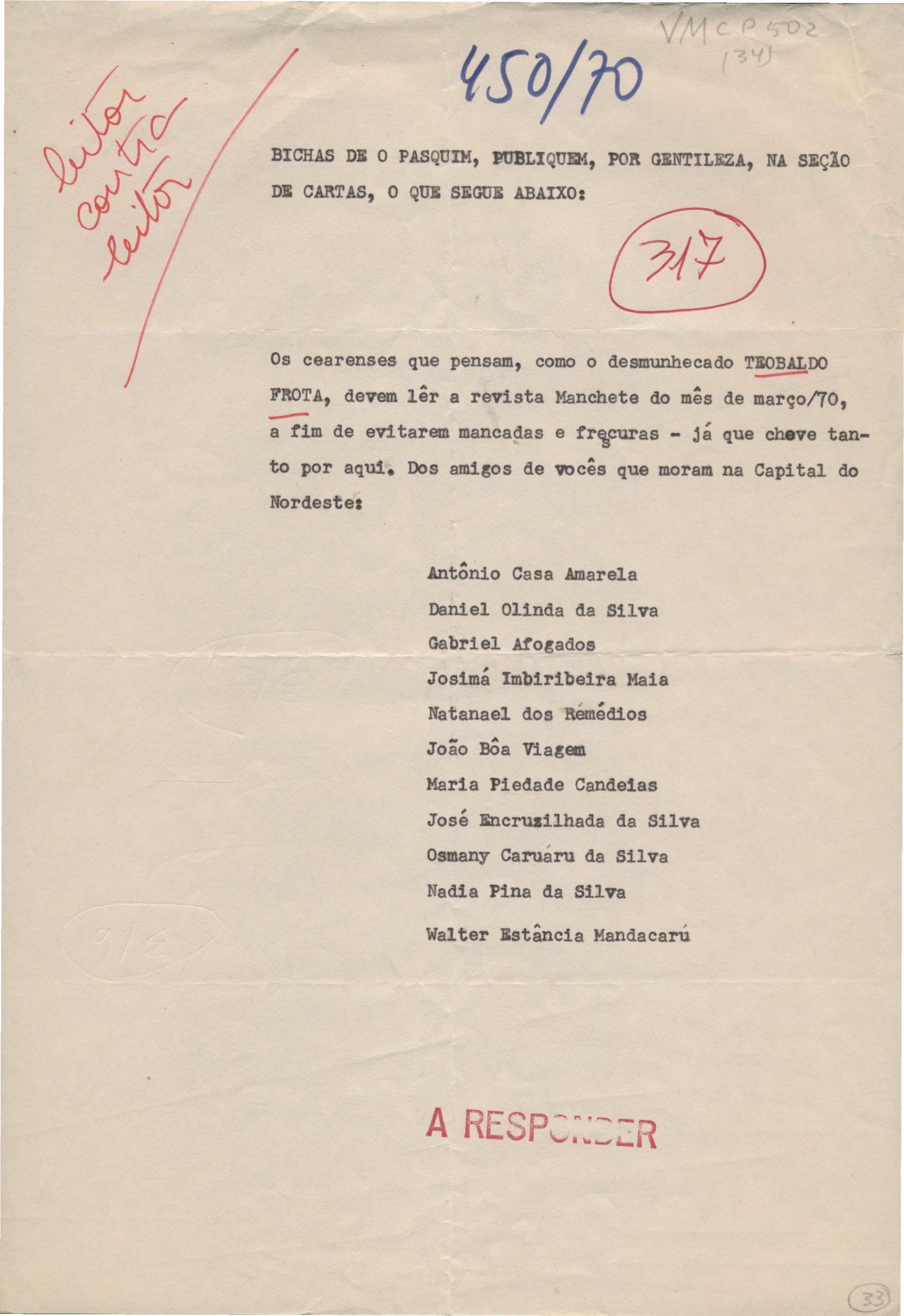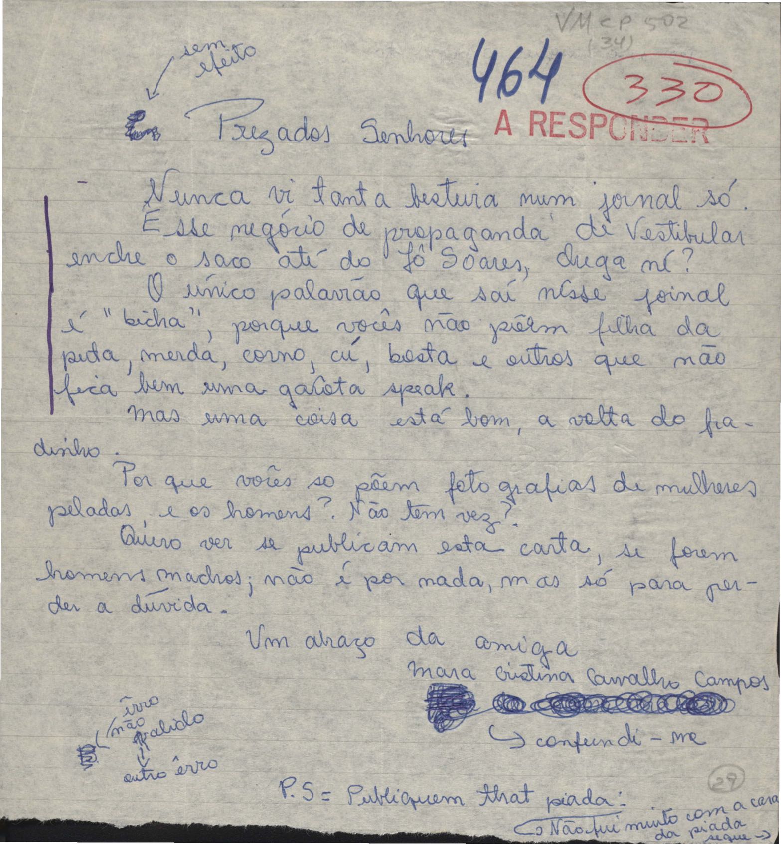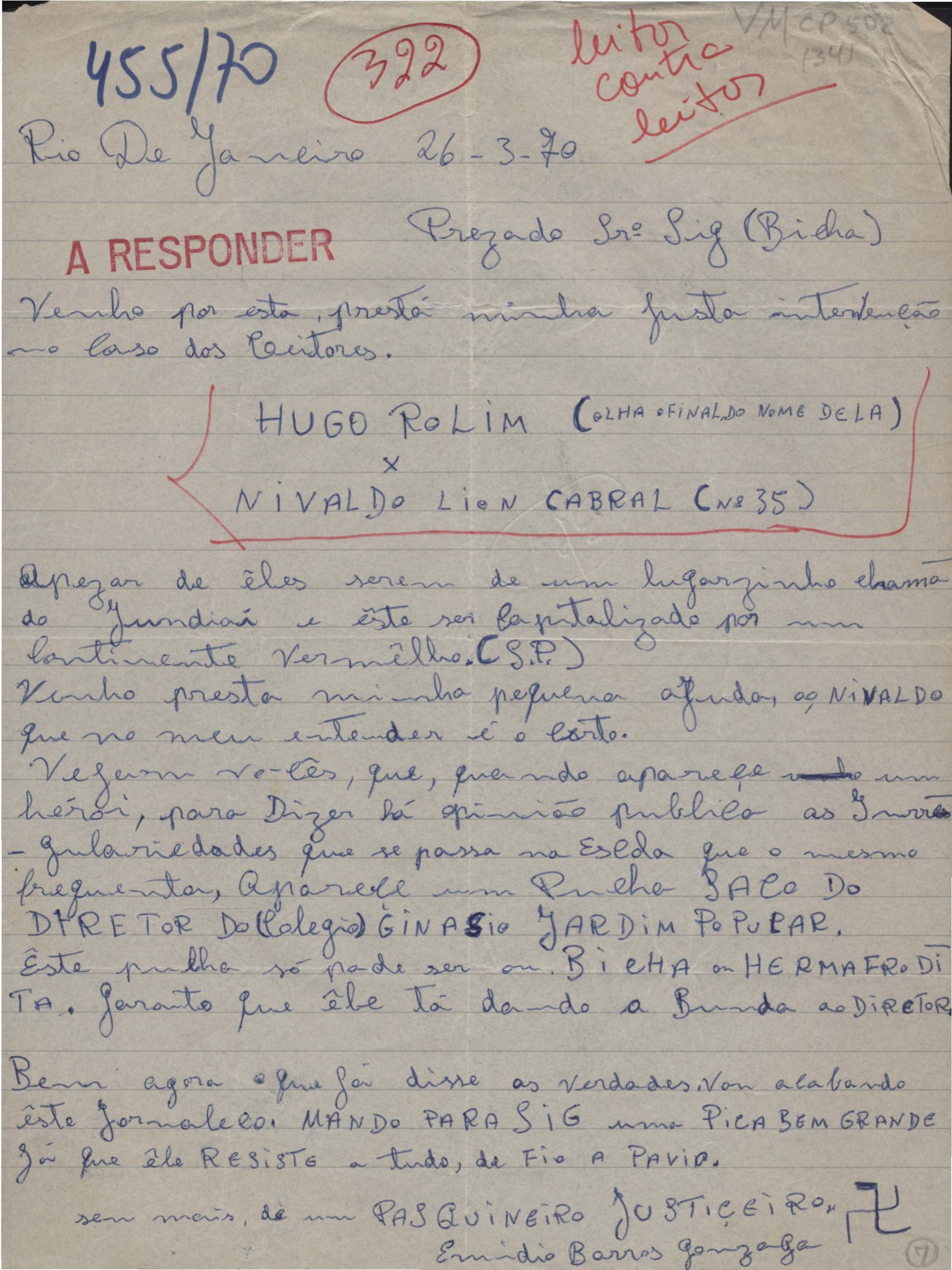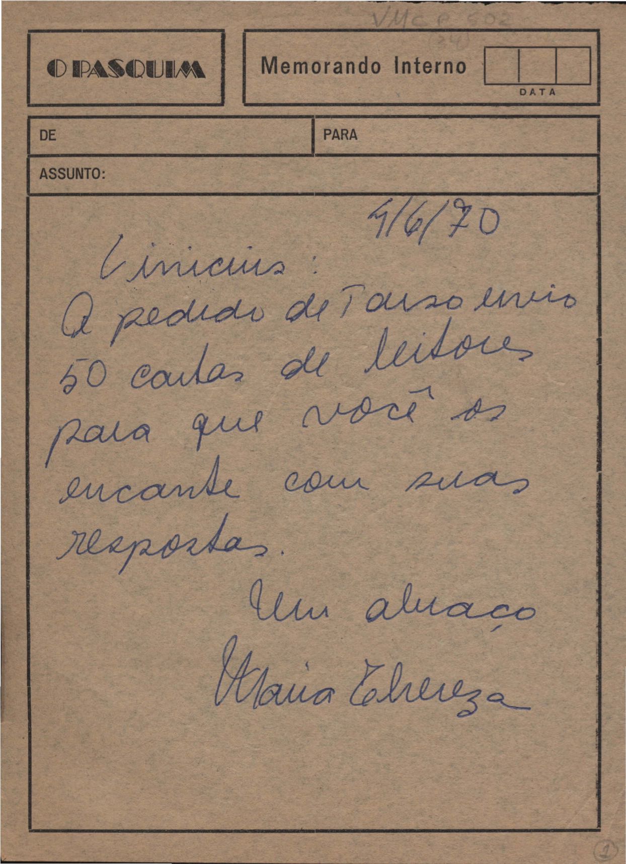 Remessa de cartas de leitores a fim de serem respondidas por VM. Anexos: Cartas de leitores do jornal.