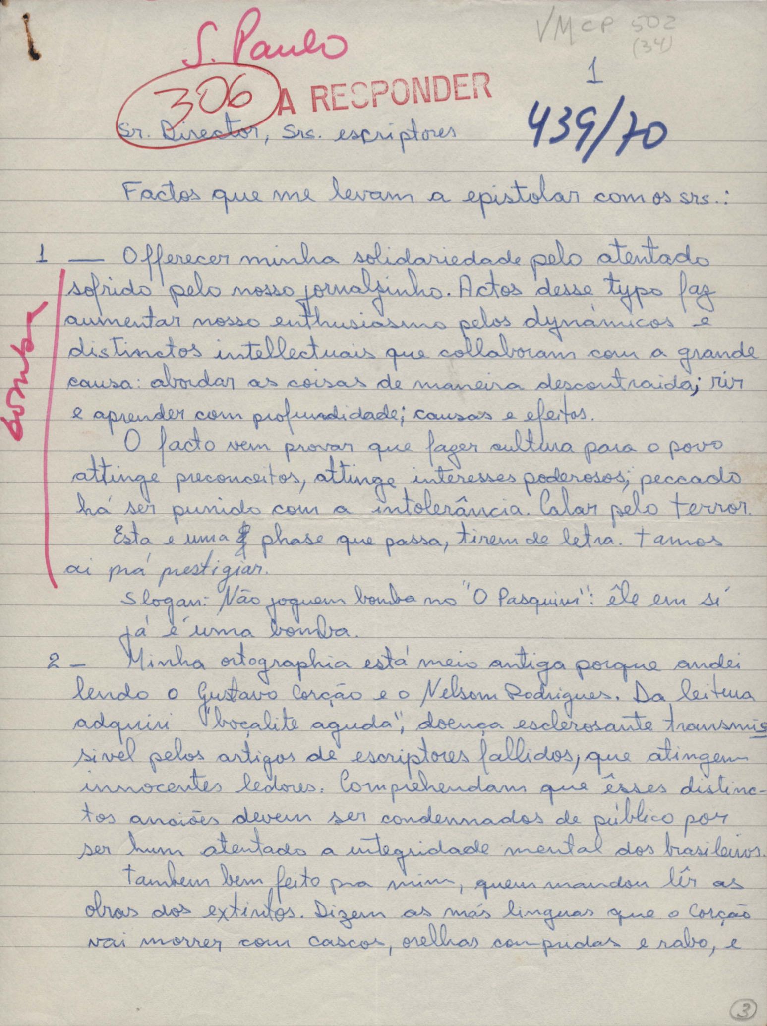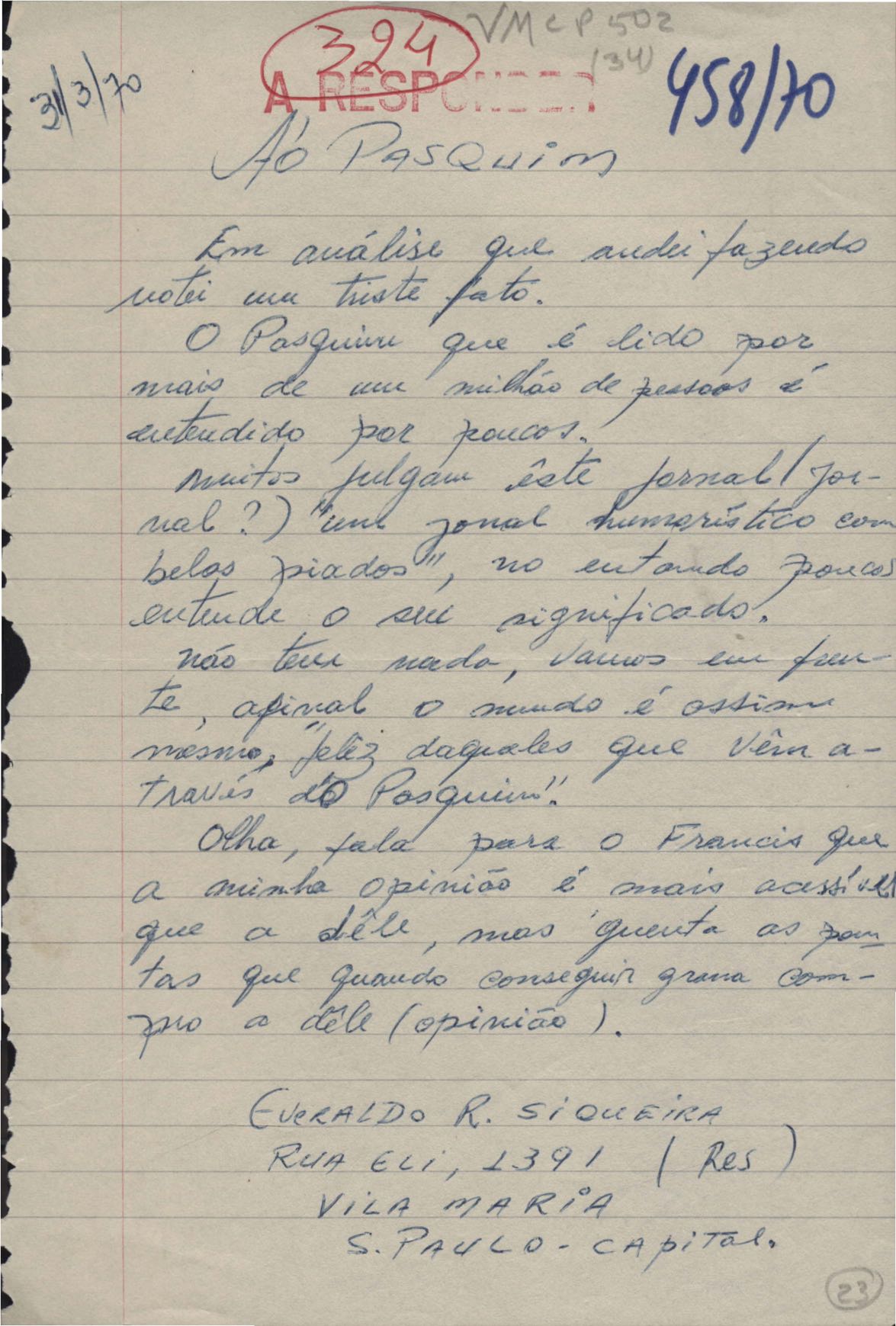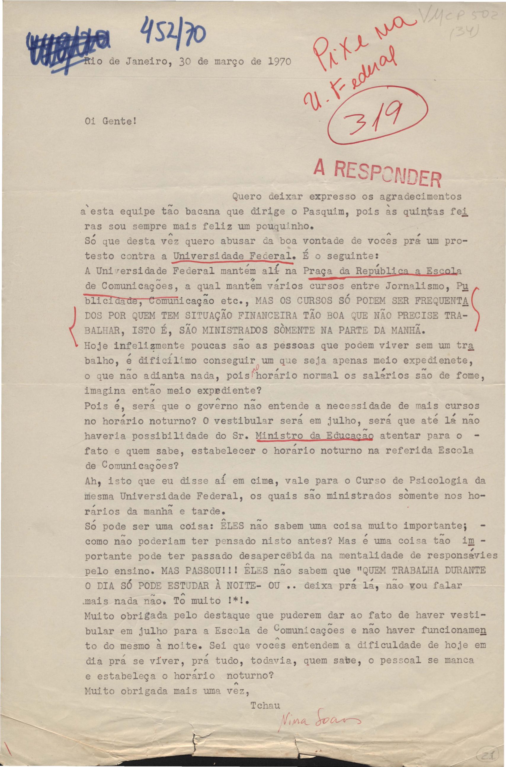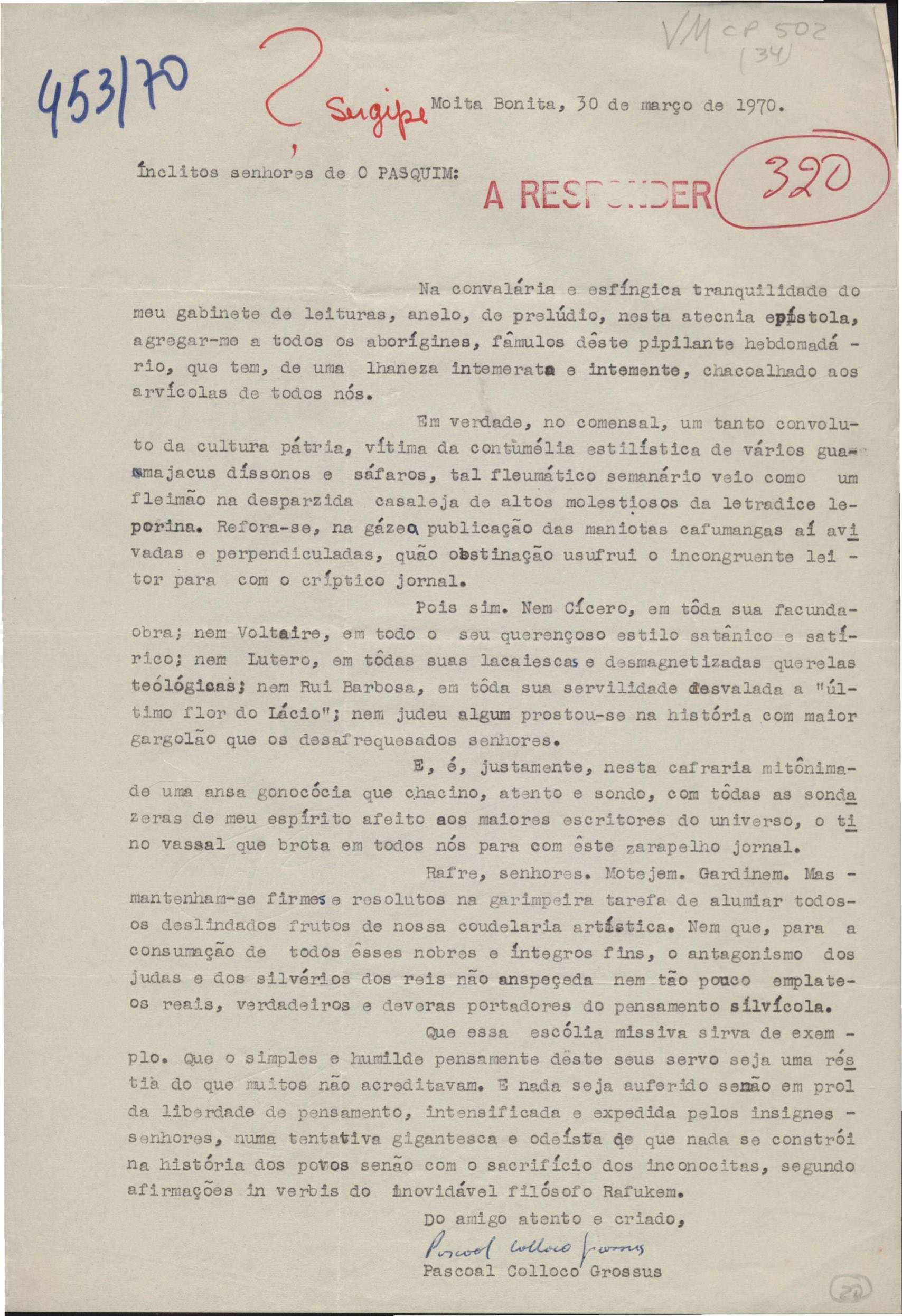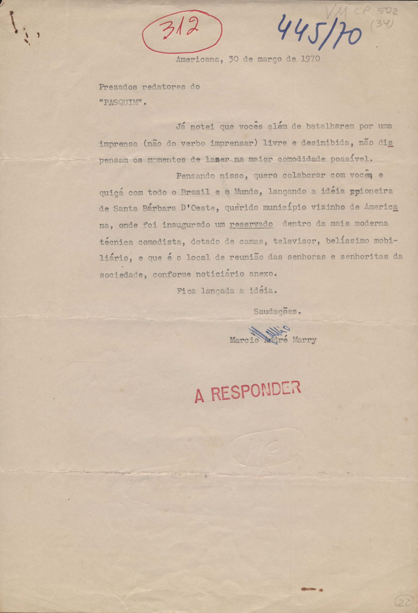 Remessa de cartas de leitores a fim de serem respondidas por VM. Anexos: Cartas de leitores do jornal.