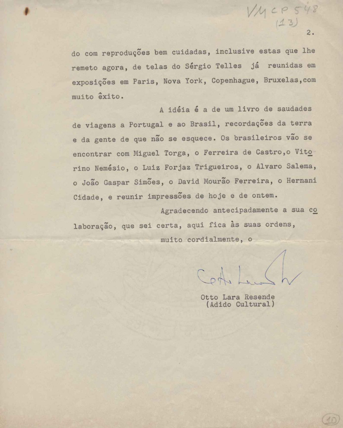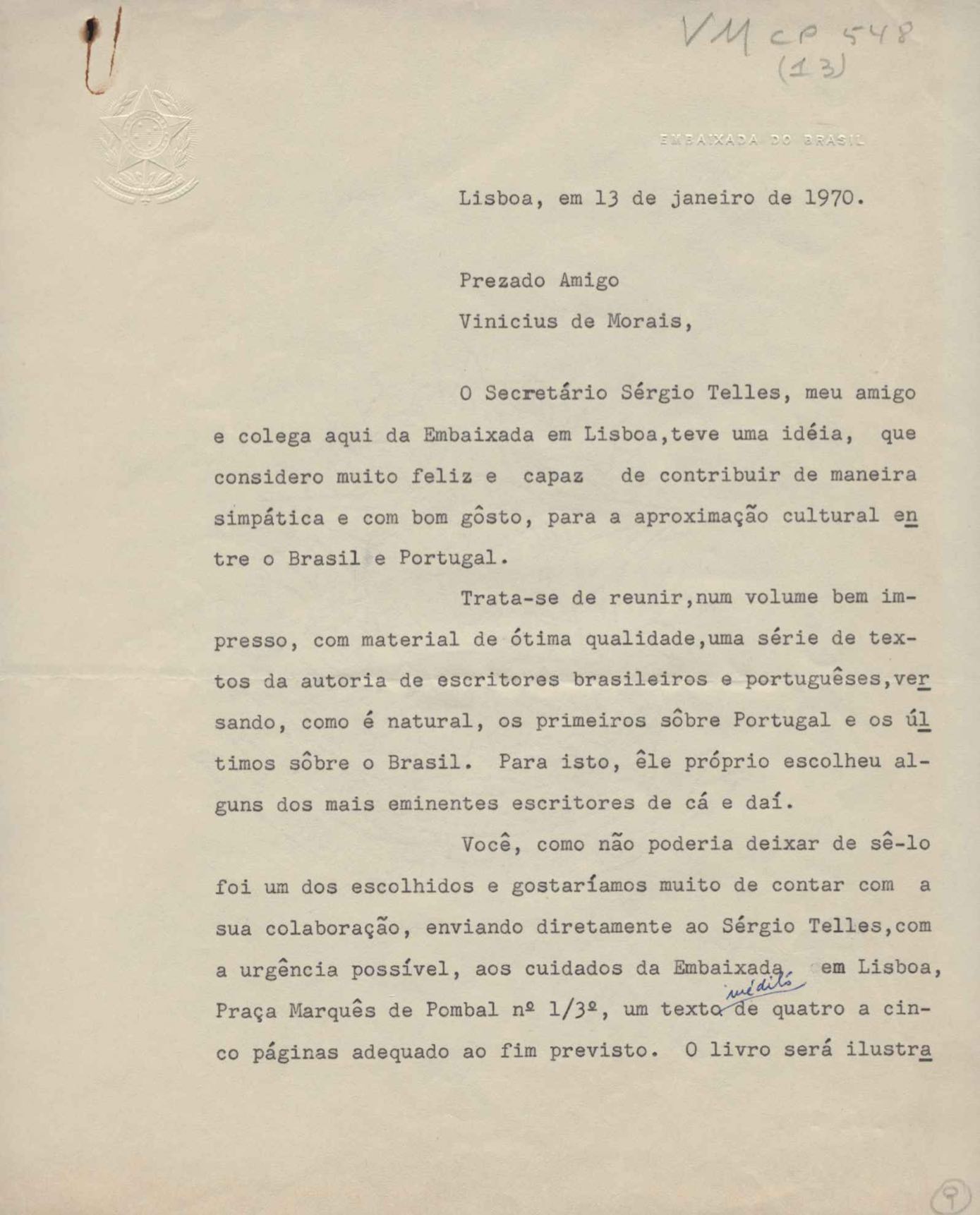 Notícias sobre sua estada em Lisboa, sobre show de Caetano Veloso e Gilberto Gil e sobre os 60 anos de Rubem Braga. Pedido de colaboração de VM para livro a ser editado pelo Itamaraty. Considerações sobre os sucessos de músicas de VM e da conferência "From Chaucer to T.S. Eliot". Comentários sobre João Cabral de Melo Neto e sobre crônica de Carlos Drummond de Andrade a respeito da entrada daquele para a Academia Brasileira de Letras.