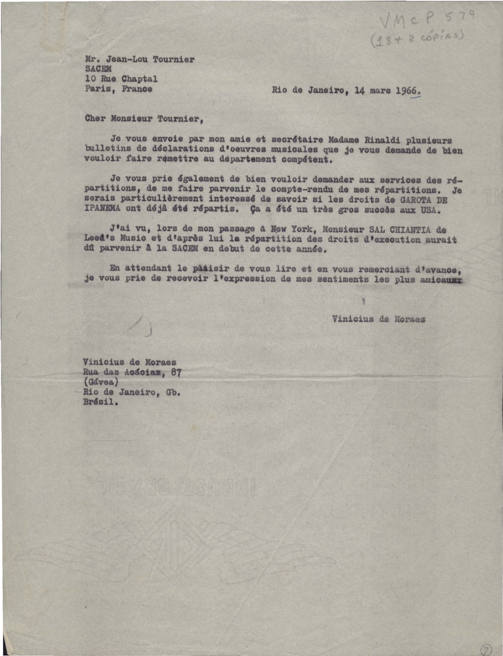 Carta à Société des Auteurs, Compositeurs et Éditeurs de Musique (SACEM)