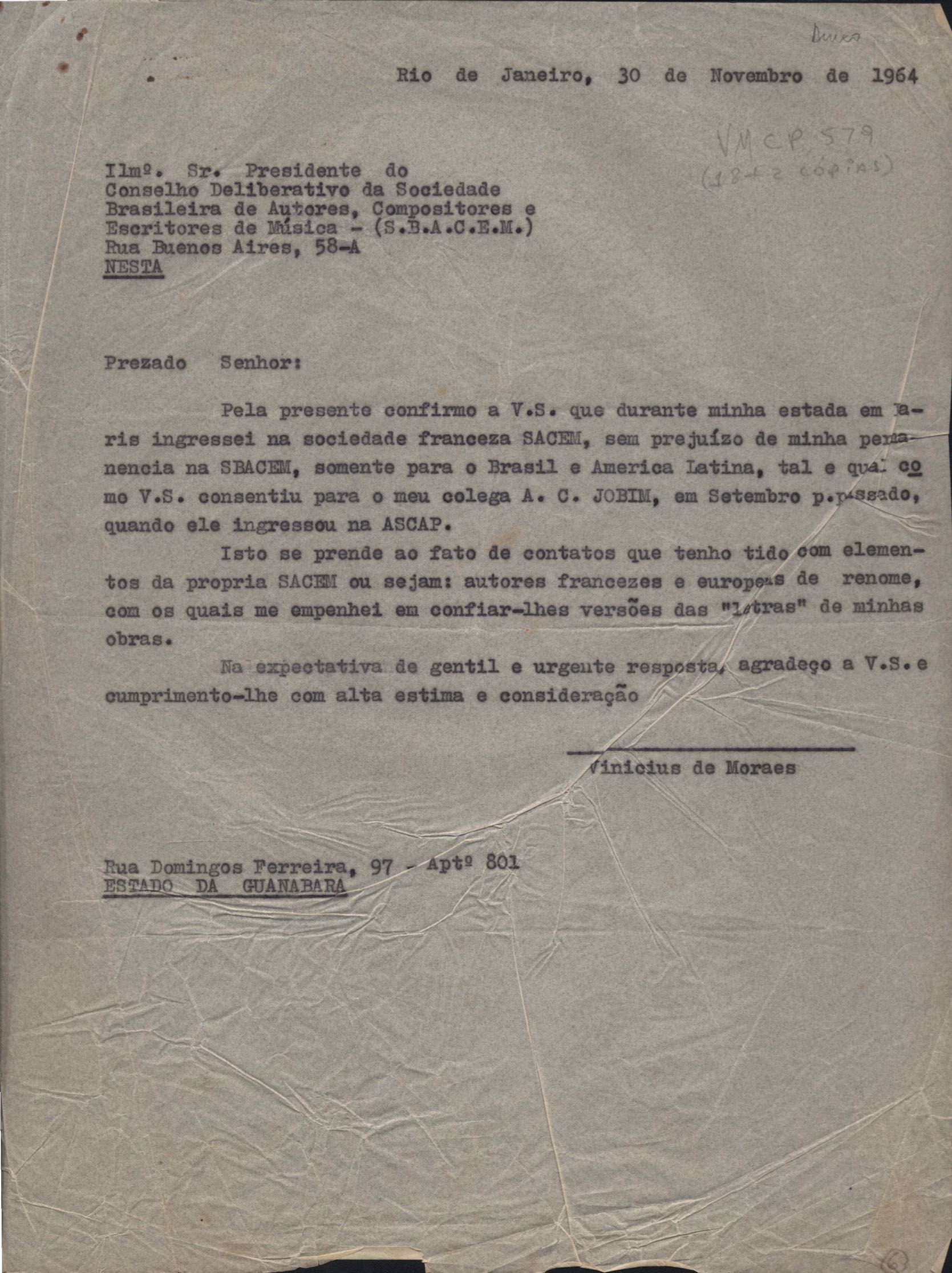 Carta à Sociedade Brasileira de Autores, Compositores e Escritores de música (SBACEM)