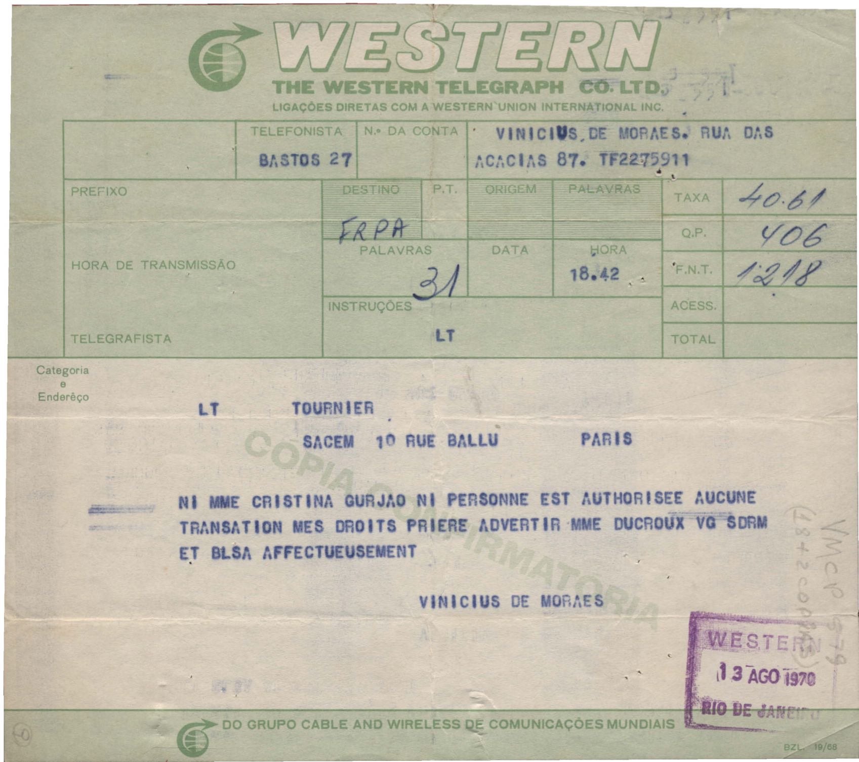 Telegrama à Société des Auteurs, Compositeurs et Éditeurs de Musique (SACEM)