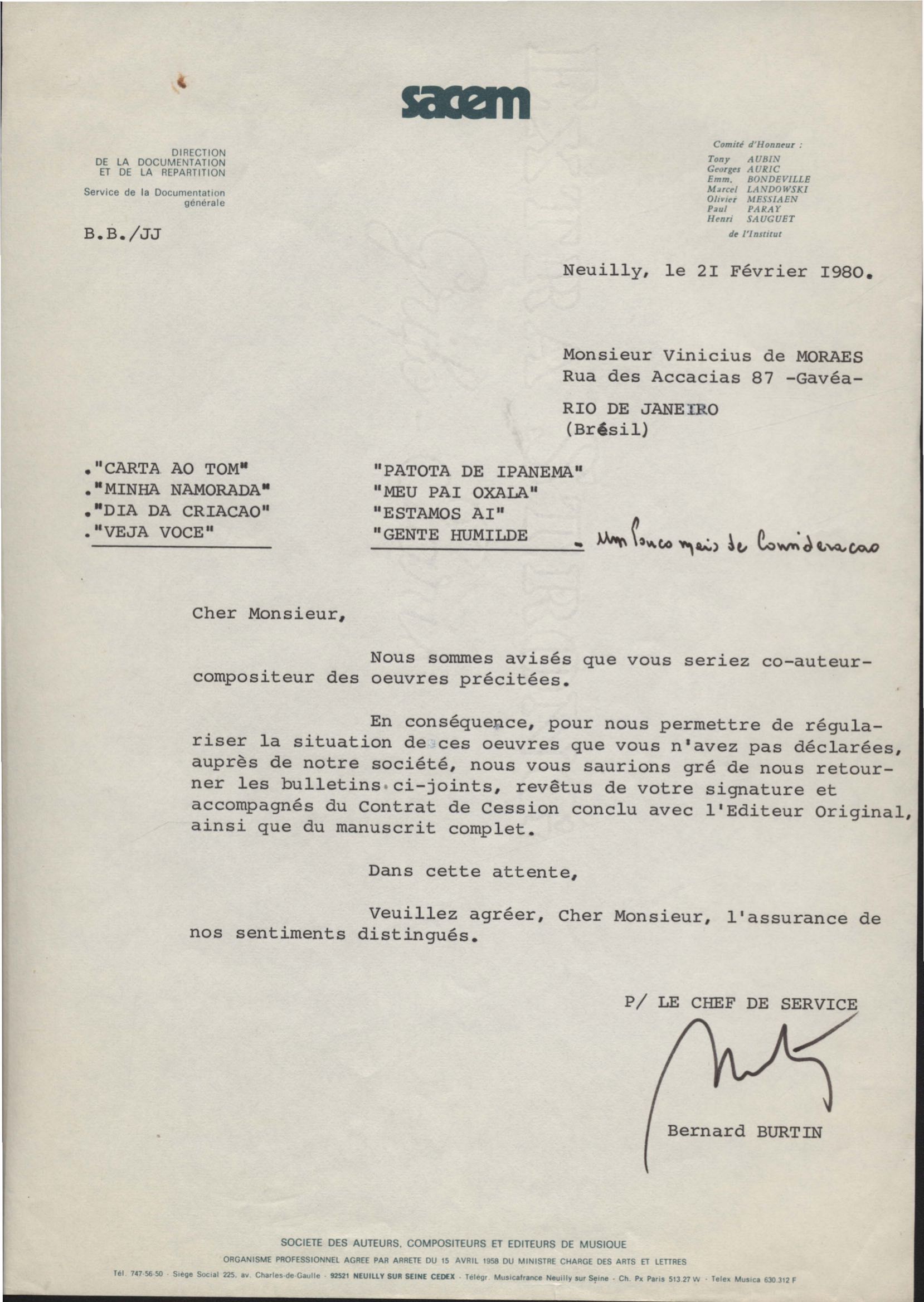 Pedido de esclarecimento sobre pagamento de direitos autorais. VM informa que ingressou na SACEM, sem se desligar da SBACEM.