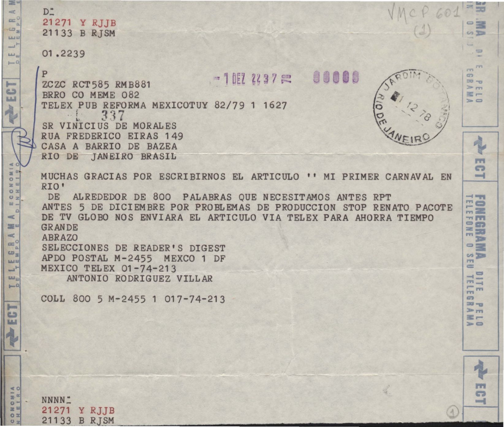 Agradecimentos pelo artigo "Mi primer carnaval in Rio", de autoria de VM.