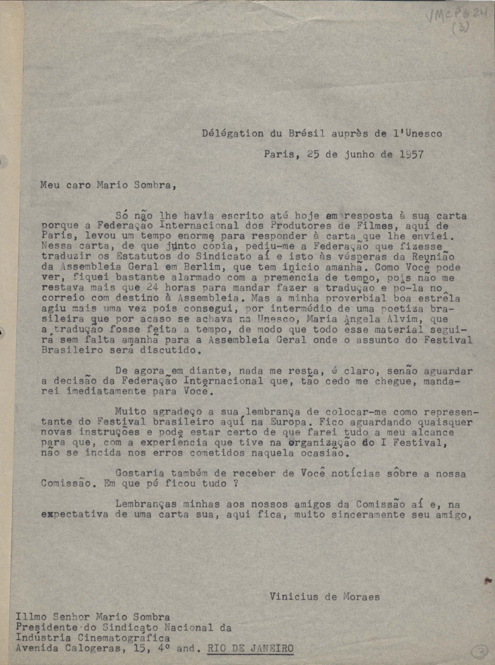 Comentários sobre a realização do II Festival Internacional Cinematográfico no Brasil. Pedido de inscrição do Sindicato Nacional da Indústria Cinematográfica do Brasil na Federação Internacional das Associações de Produtores de Filmes. Anexo: Carta do Sindicato à Fédération Internationale des Associations de Producteurs de Films.