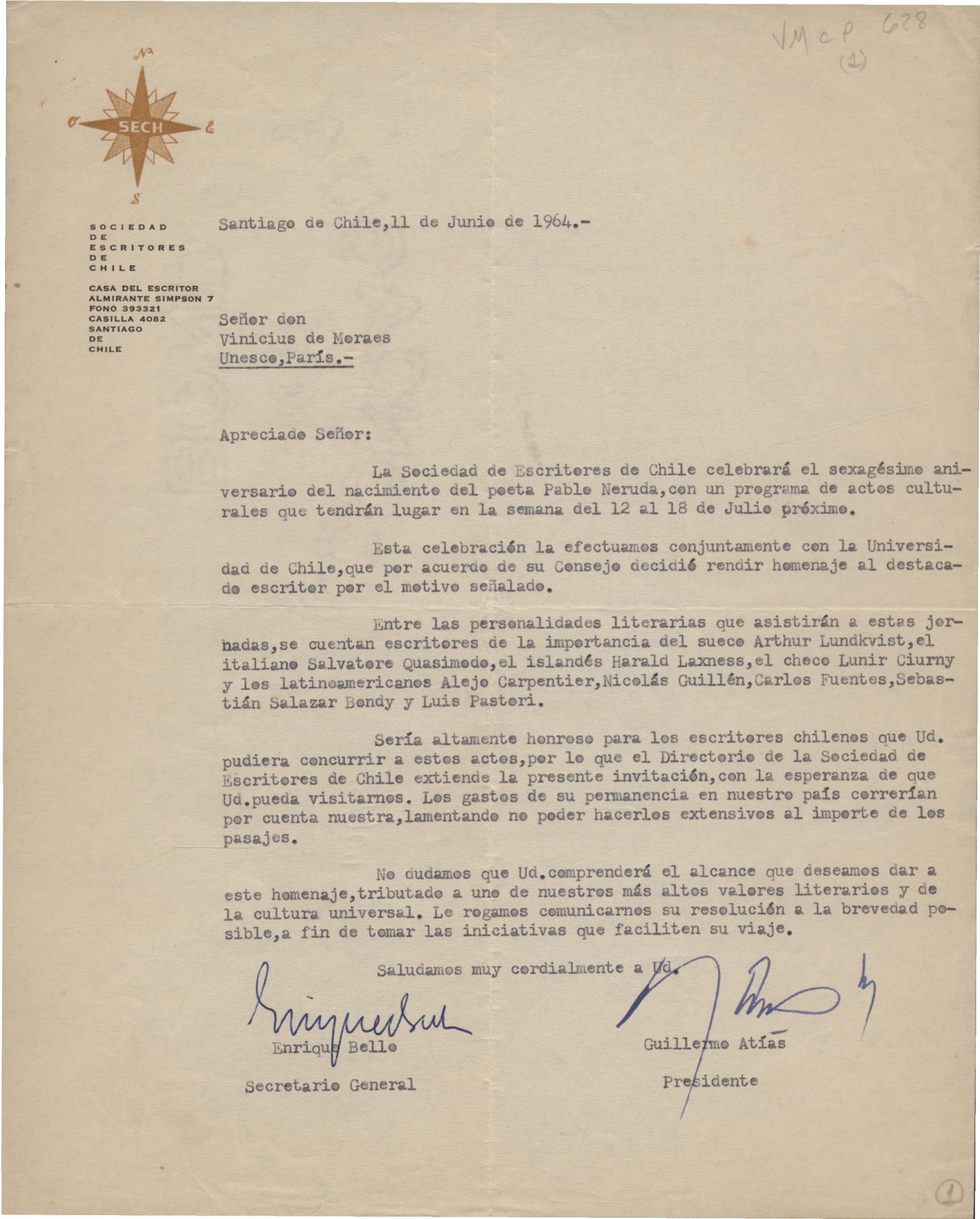 Convite para VM participar do sexagésimo aniversário de Pablo Neruda.
