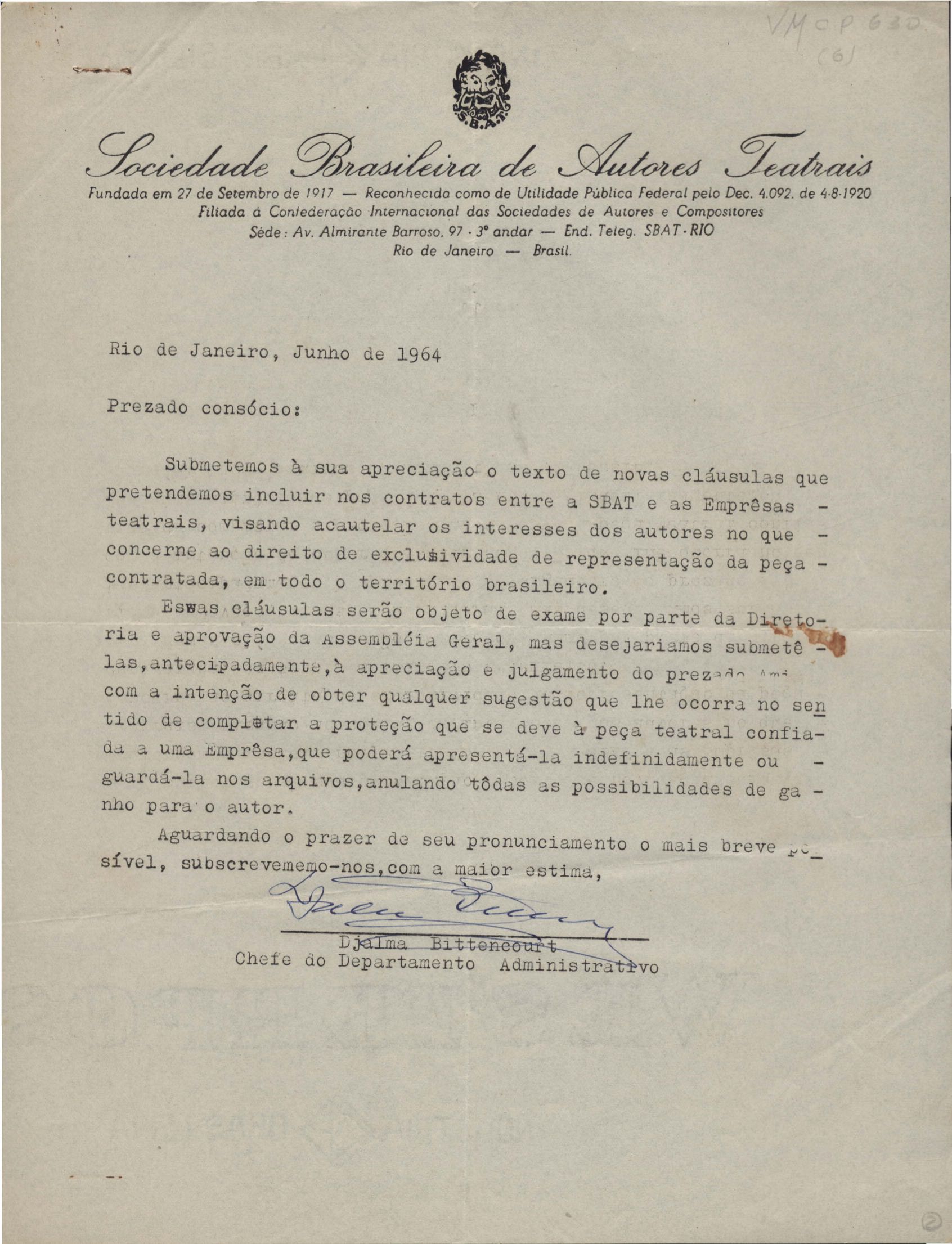 Informação de que a Agência Teatral e Literária Tchecoslovaca, de Praga, solicitou cópia da peça Orfeu da Conceição. Remessa, para apreciação de VM, do texto com as novas cláusulas de contrato entre a SBAT e as empresas teatrais. Informação de que Graça Melo pretende excursionar com a peça Receita para Vinicius em seu repertório.