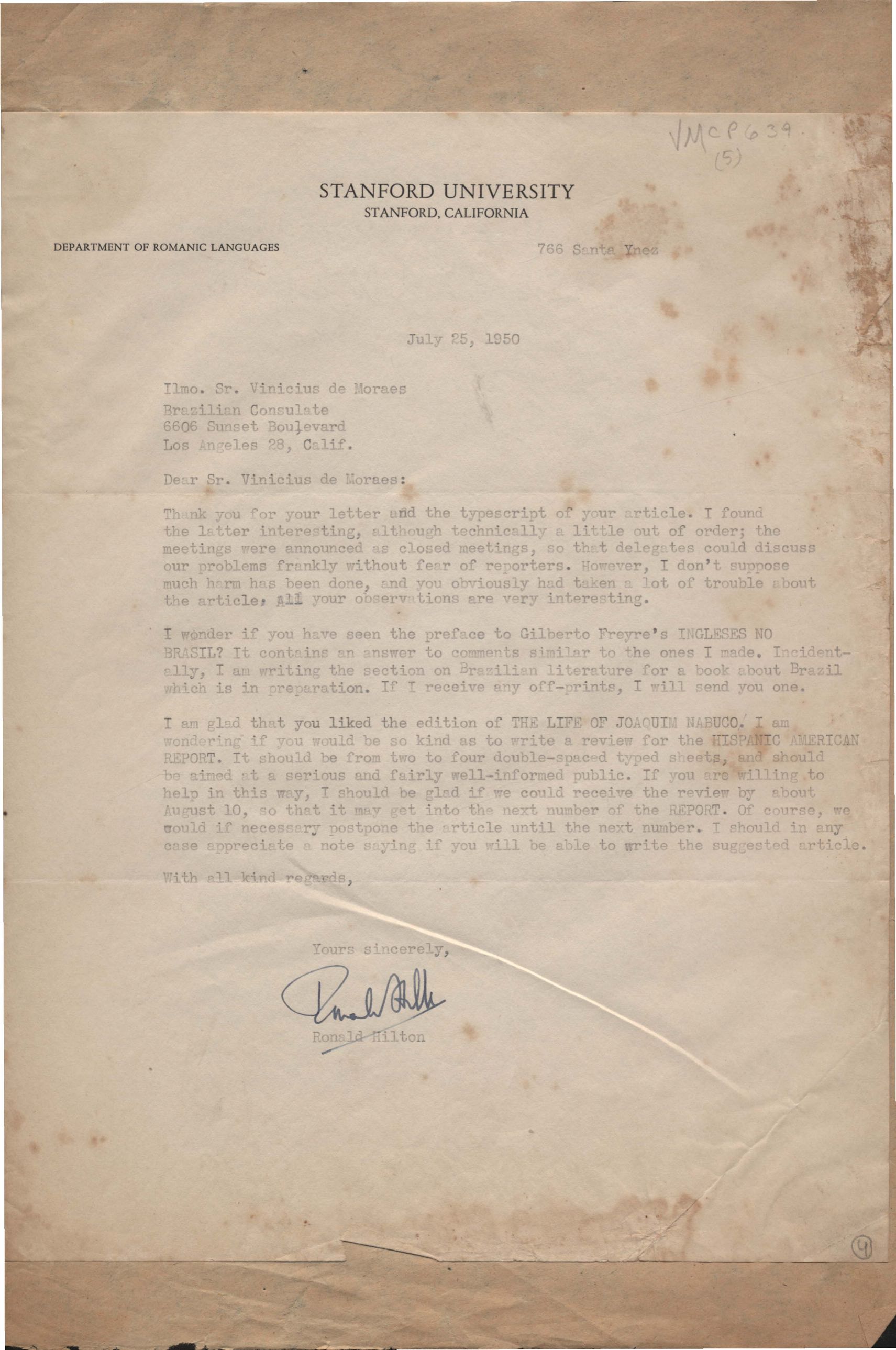 Convite para VM participar de encontro sobre o Brasil a ser realizado na Stanford University. Pedido para VM adaptar o trabalho a ser por ele apresentado no encontro a fim de ser publicado na Hispanic American Report. Anexo: Programa do Stanford Meeting of Brazilianists.