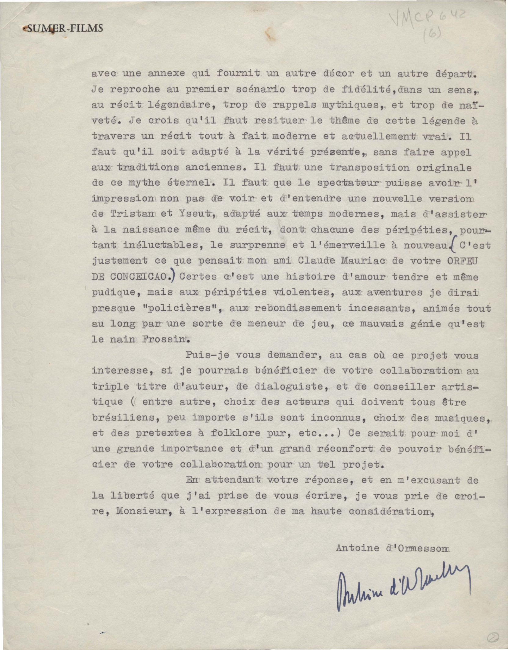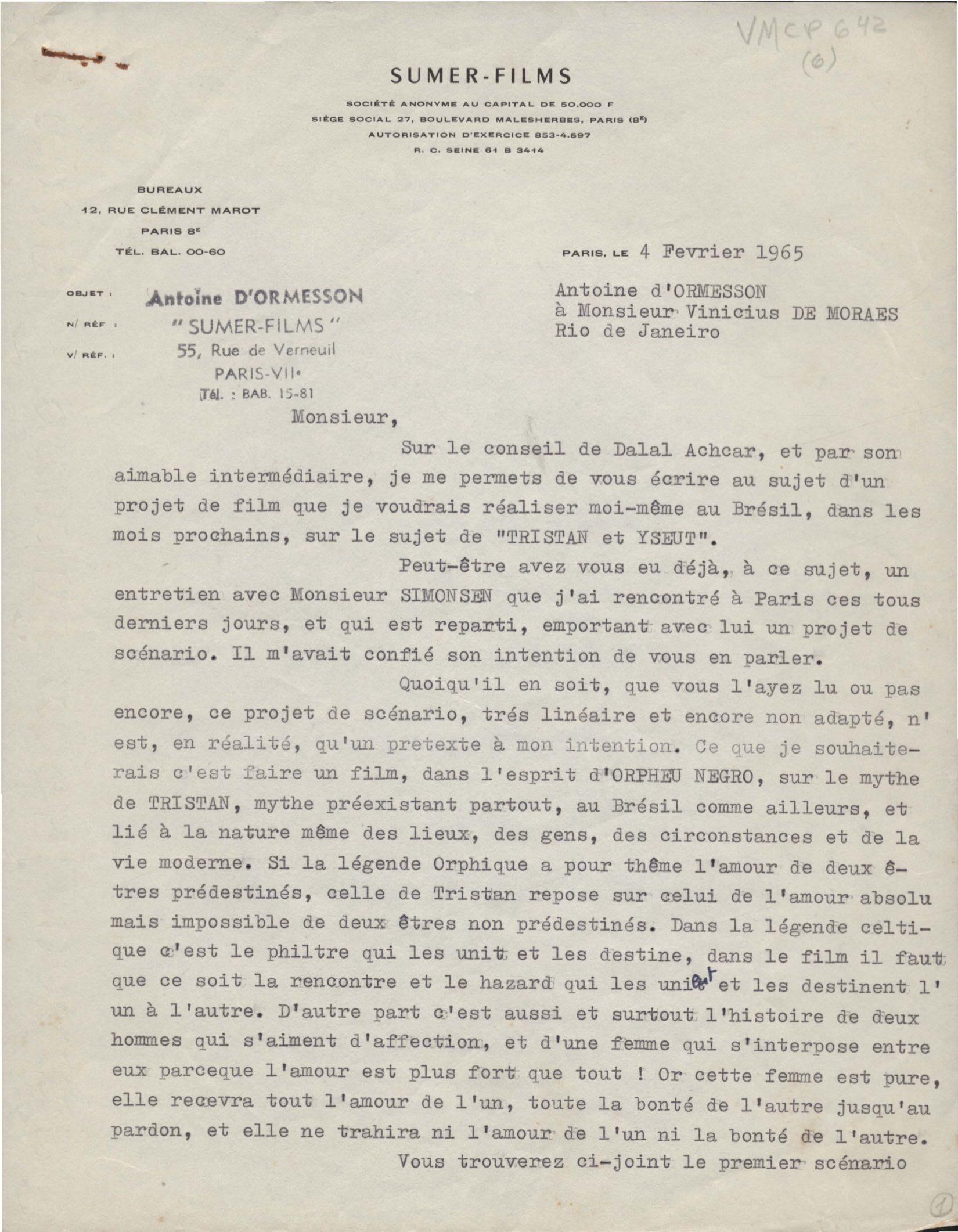 Encaminhamento, com pedido de colaboração de VM, de projeto de filme sobre Tristão e Isolda, que a firma pretende realizar. Remessa de cláusula de contrato para aprovação de VM, na qualidade de coautor, junto com Antoine d'Omerson do filme provisoriamente intitulado Les amants de la mer.