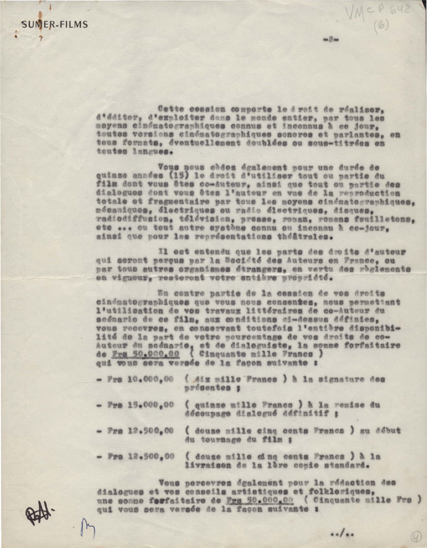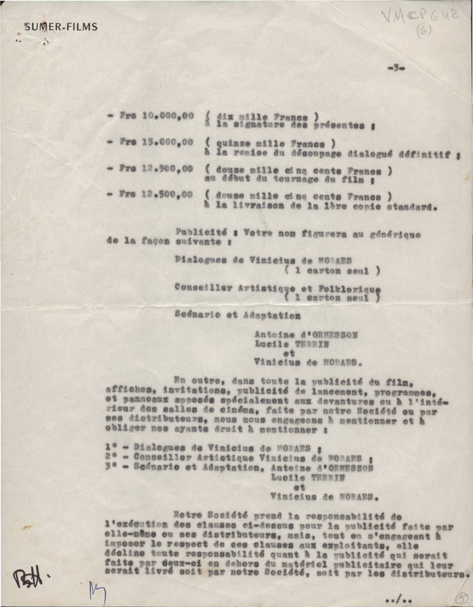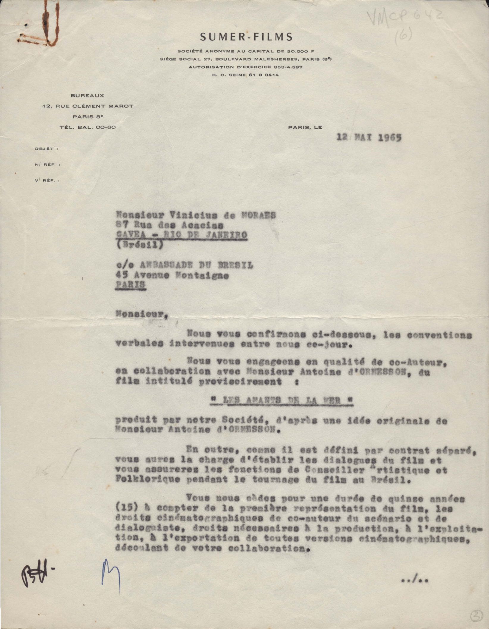 Encaminhamento, com pedido de colaboração de VM, de projeto de filme sobre Tristão e Isolda, que a firma pretende realizar. Remessa de cláusula de contrato para aprovação de VM, na qualidade de coautor, junto com Antoine d'Omerson do filme provisoriamente intitulado Les amants de la mer.