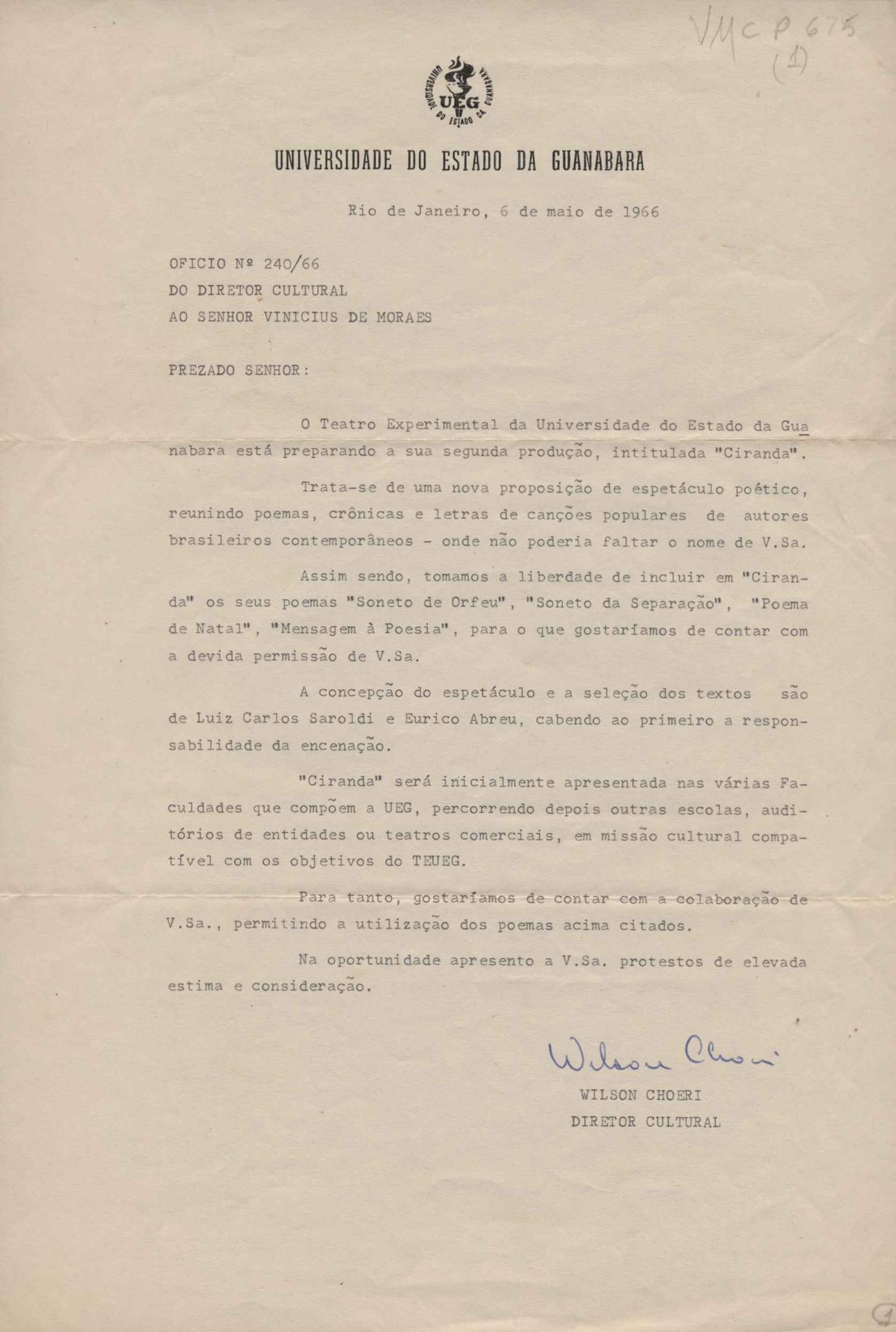 Comunicação da realização de uma "ciranda", coordenada pelo Teatro Experimental da Universidade, onde estarão incluídos poemas de VM.