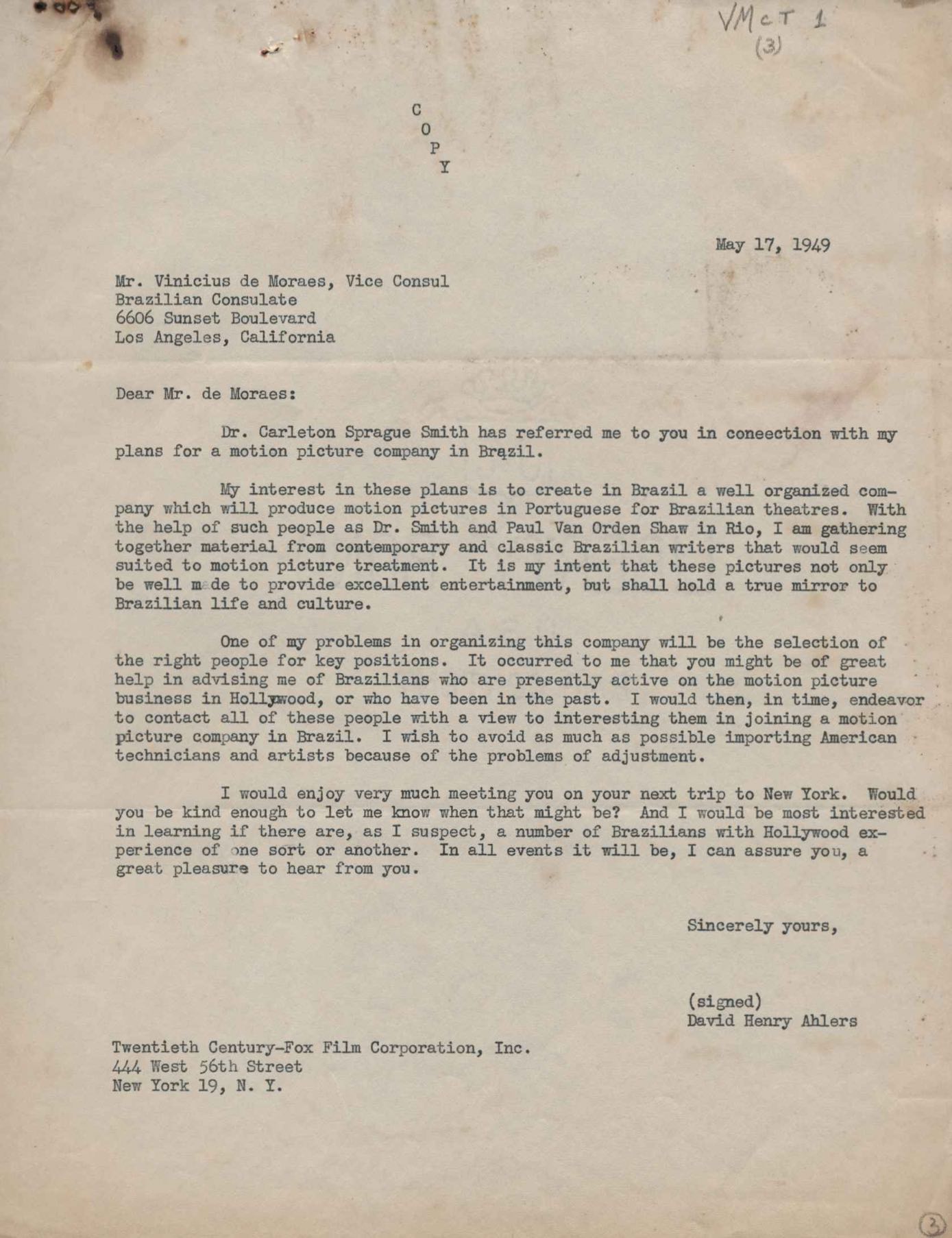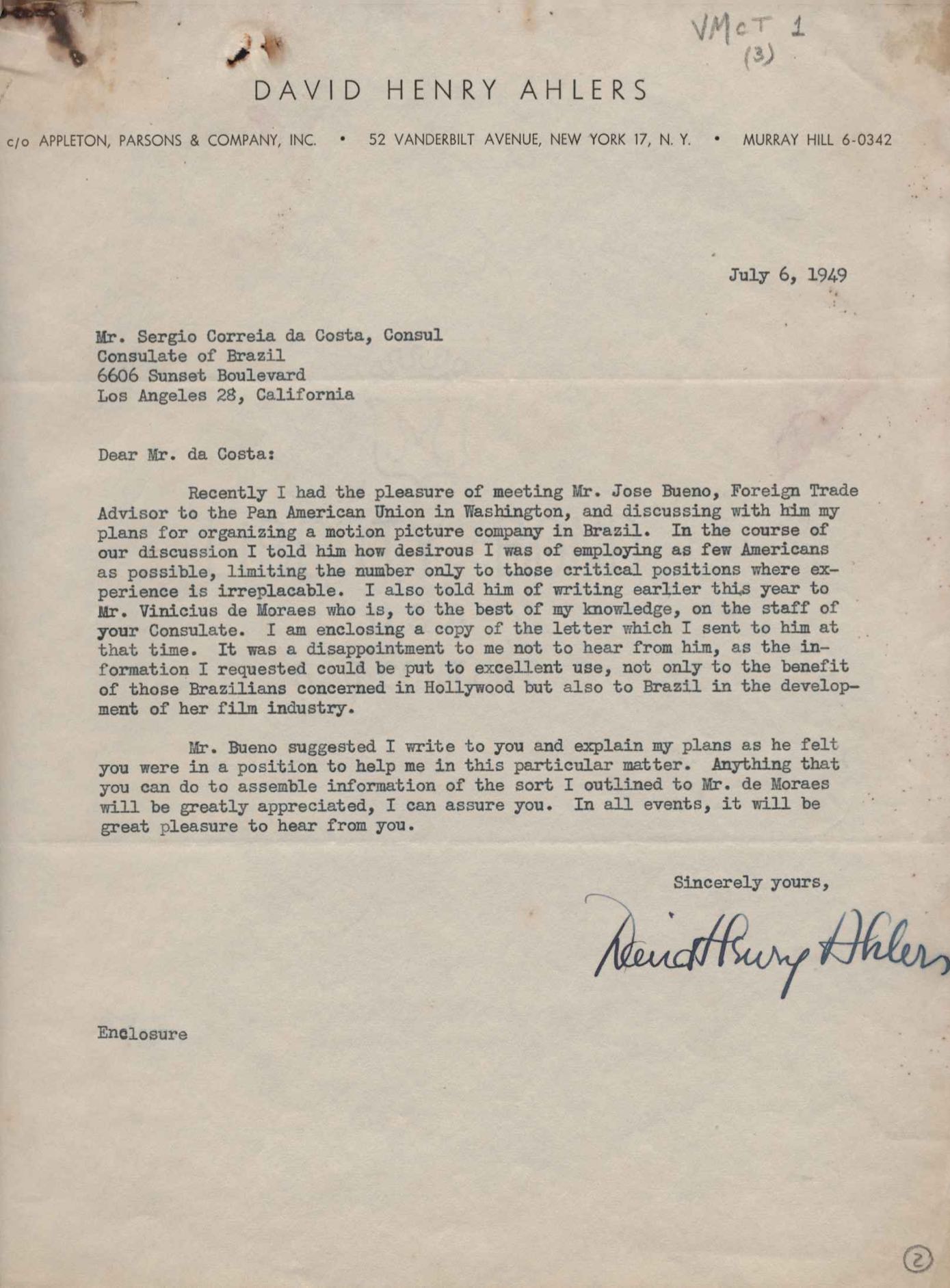 Pedido de ajuda para montagem de companhia cinematográfica no Brasil. Anexo: Carta a VM.