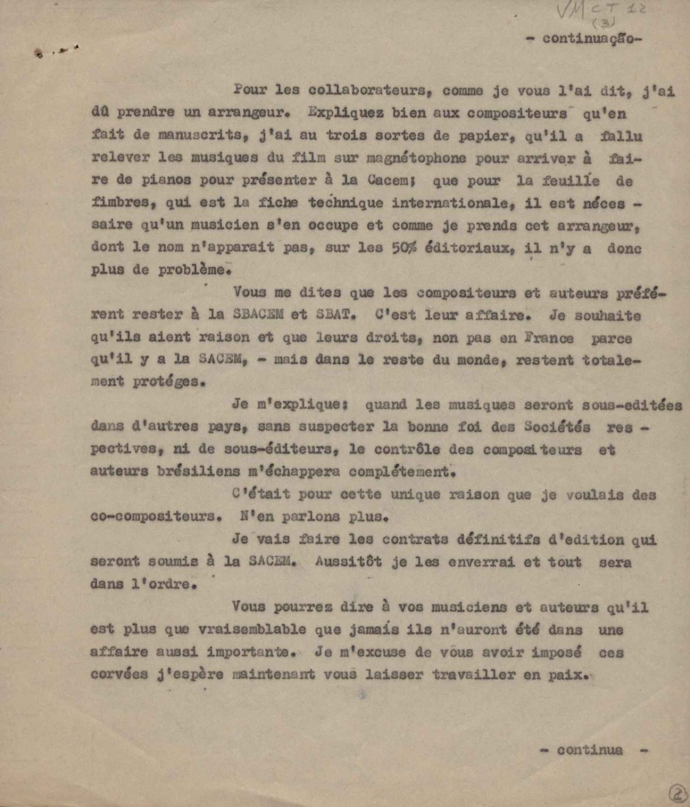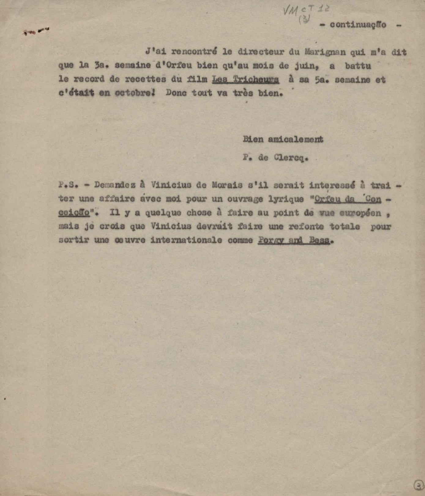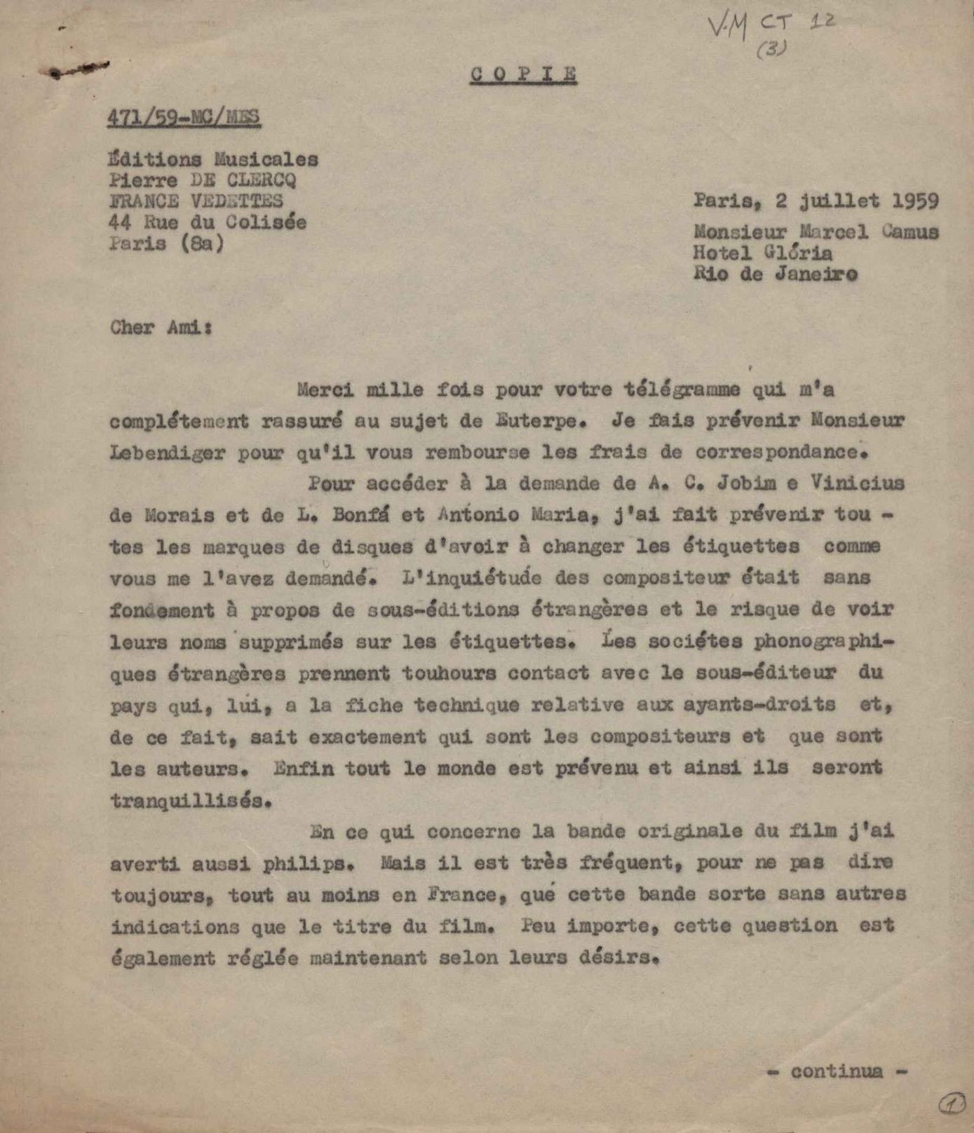 Considerações sobre problemas técnicos de gravação e filmagem e sobre preservação de direitos autorais de Orfeu negro.