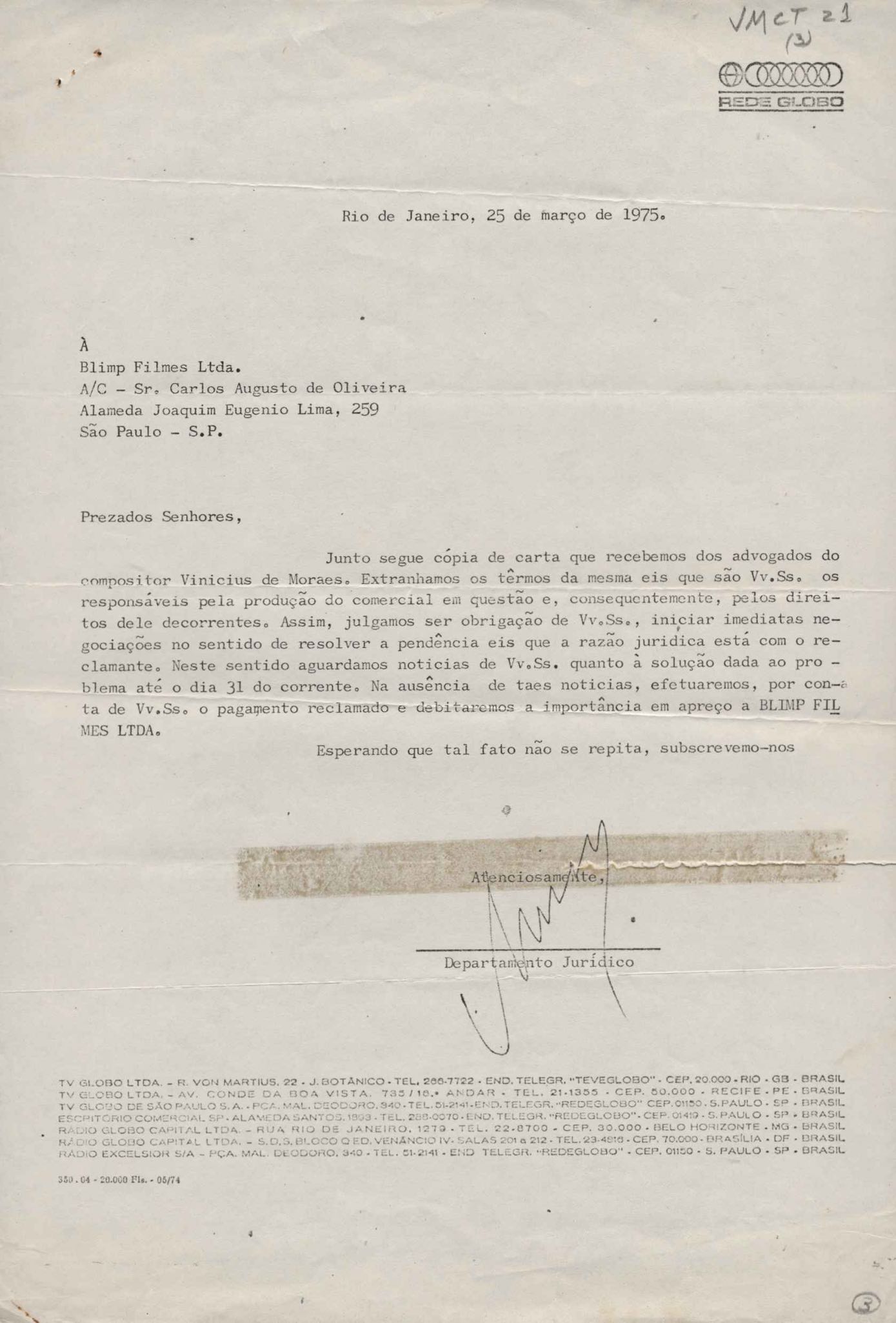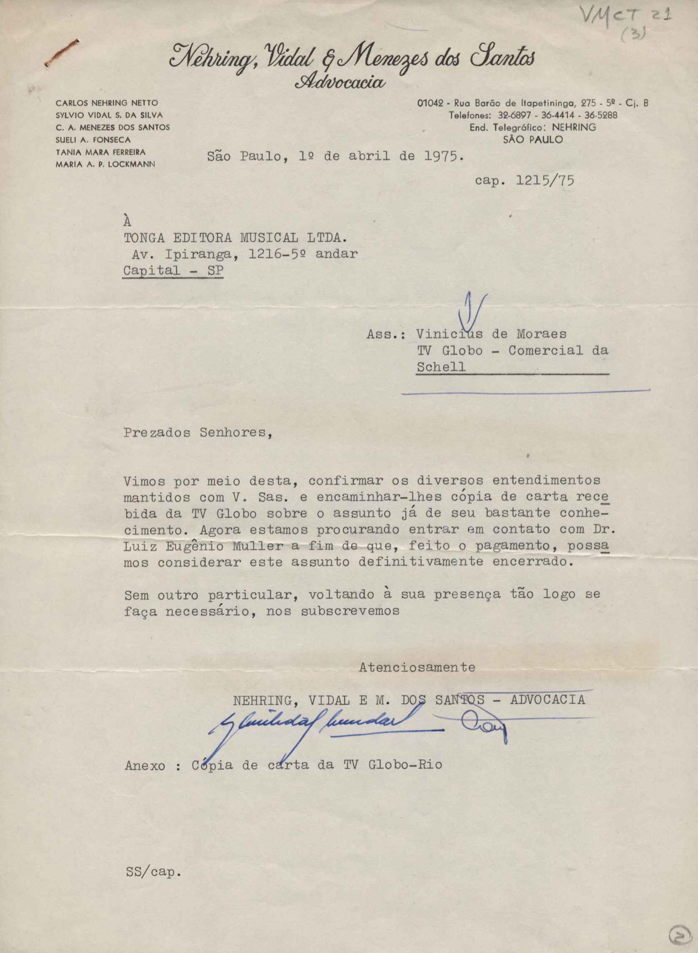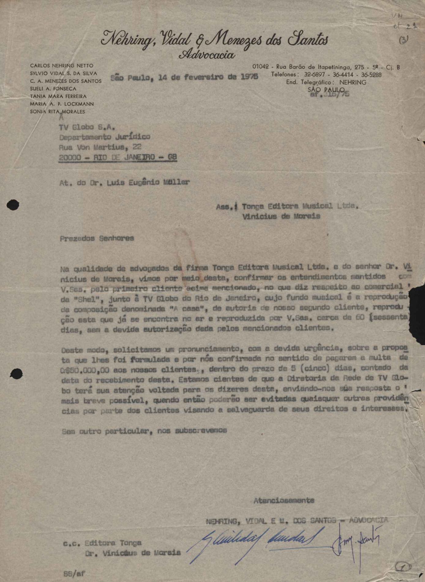 Solicitação de pronunciamento da TV Globo sobre a utilização de música de VM em comercial da Shell. Anexo: Carta de Nehring, Vidal & Menezes dos Santos à Tonga Editora Musical Ltda.