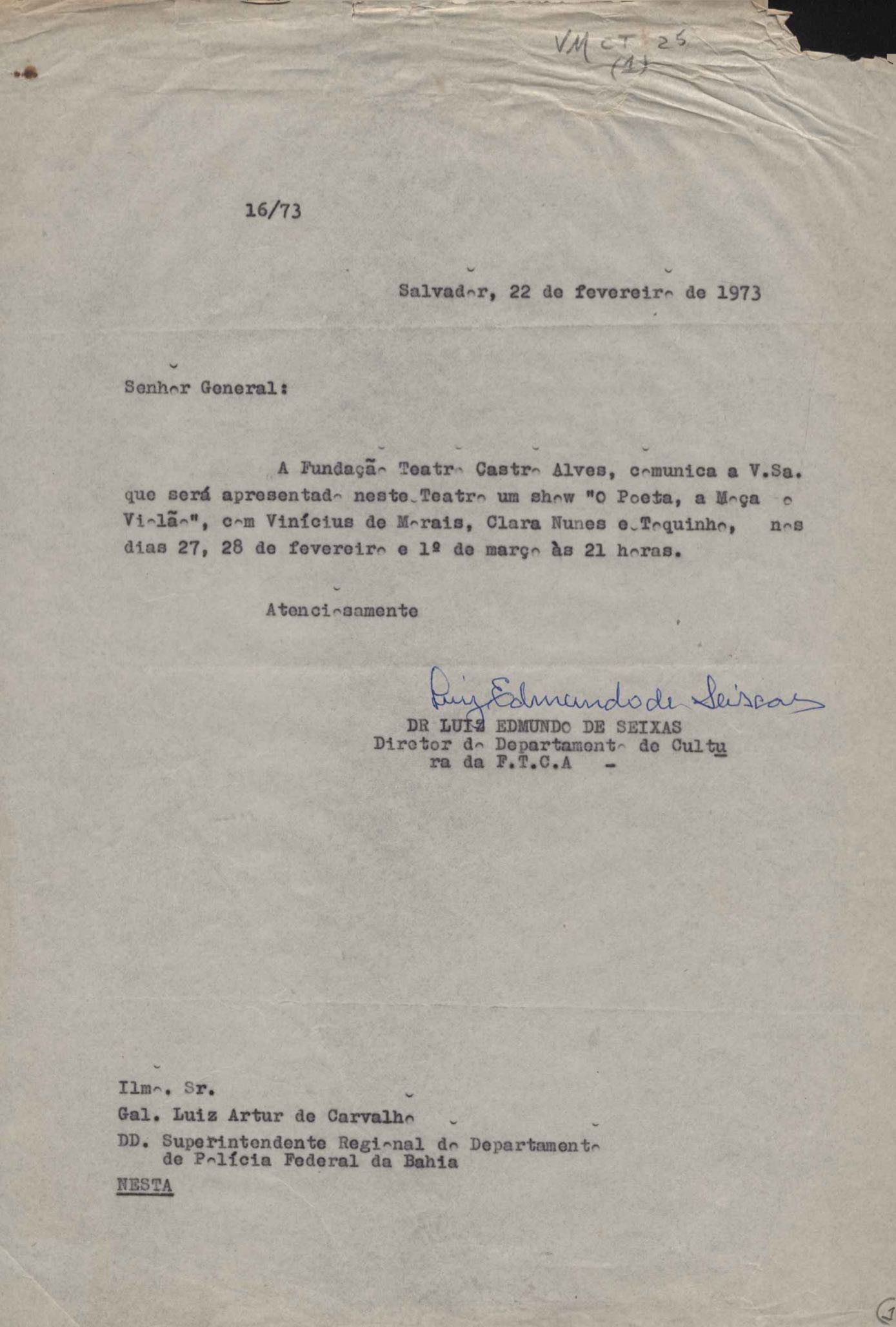Comunicado da Fundação Teatro Castro Alves sobre apresentação do show O poeta, a moça e o violão, com VM, Clara Nunes e Toquinho.
