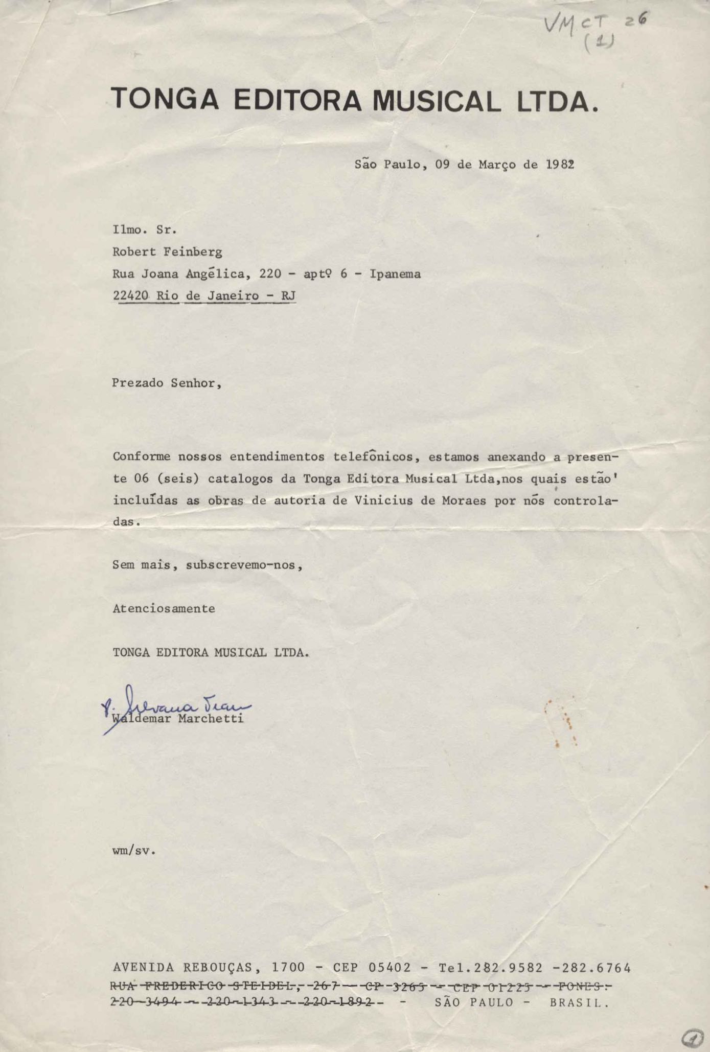 Remessa de catálogo musical com obras de VM.