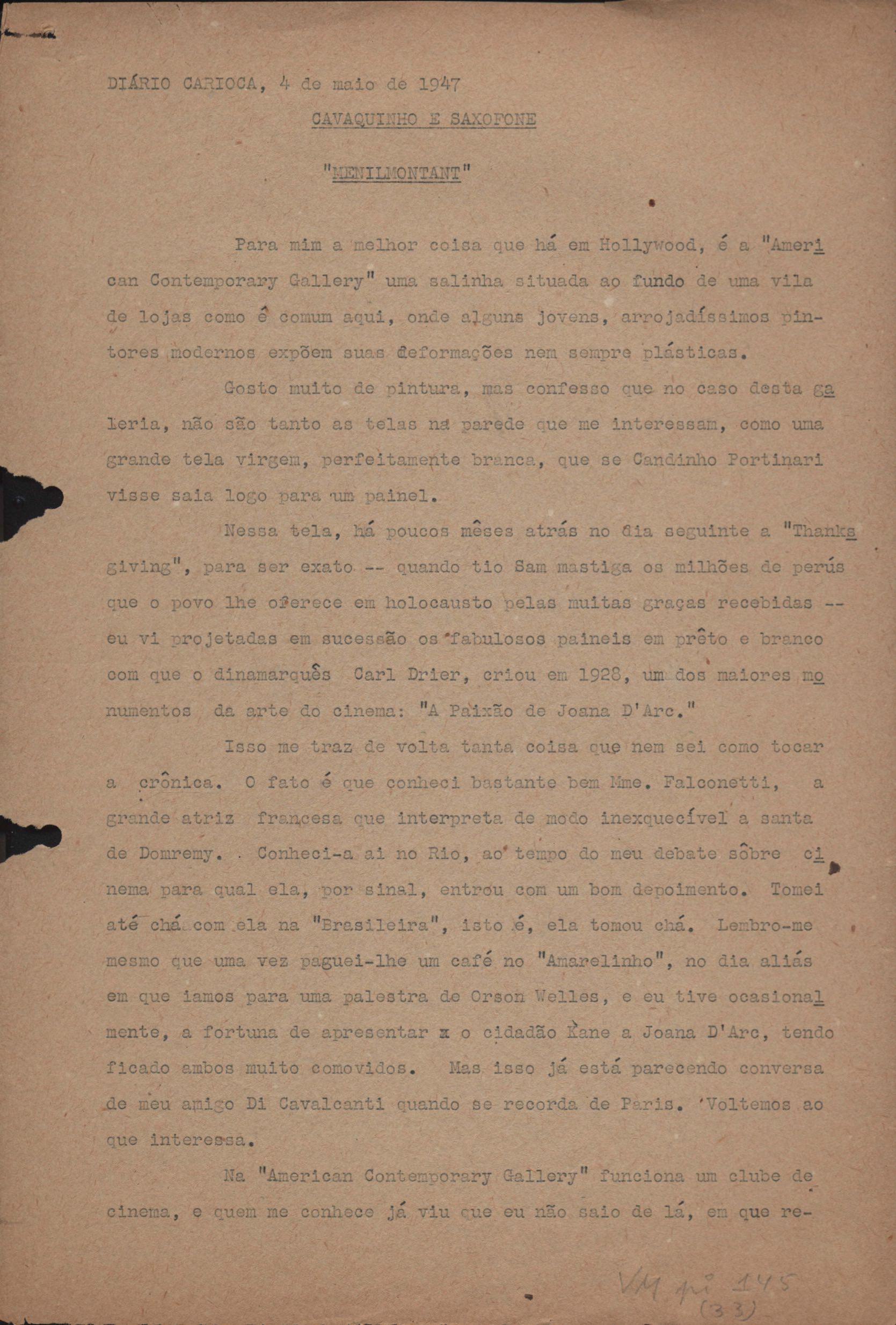 Publicado na coluna "Cavaquinho e Saxofone", do periódico O Diário Carioca.