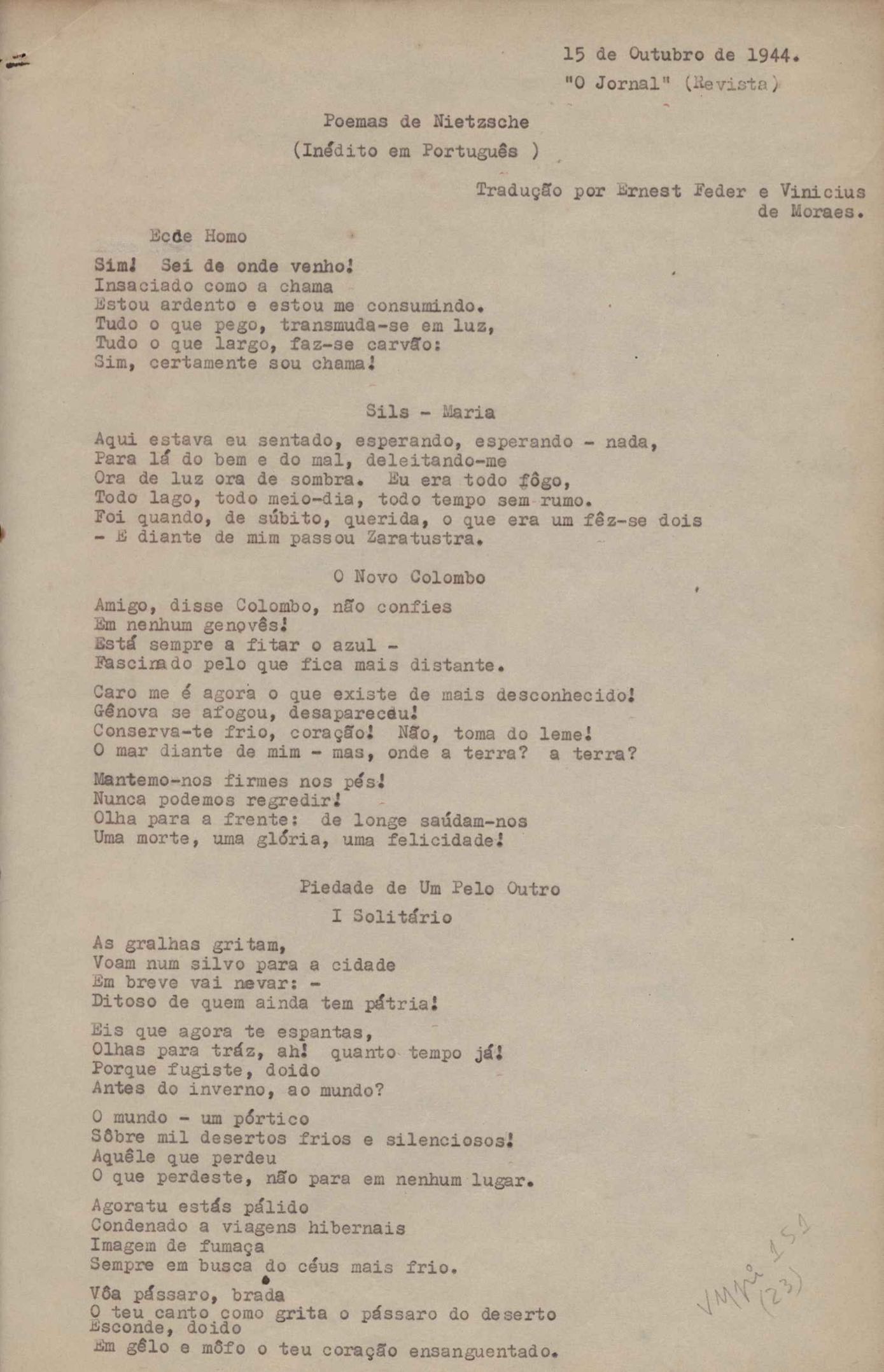 Poemas traduzidos por Ernest Feder e VM.