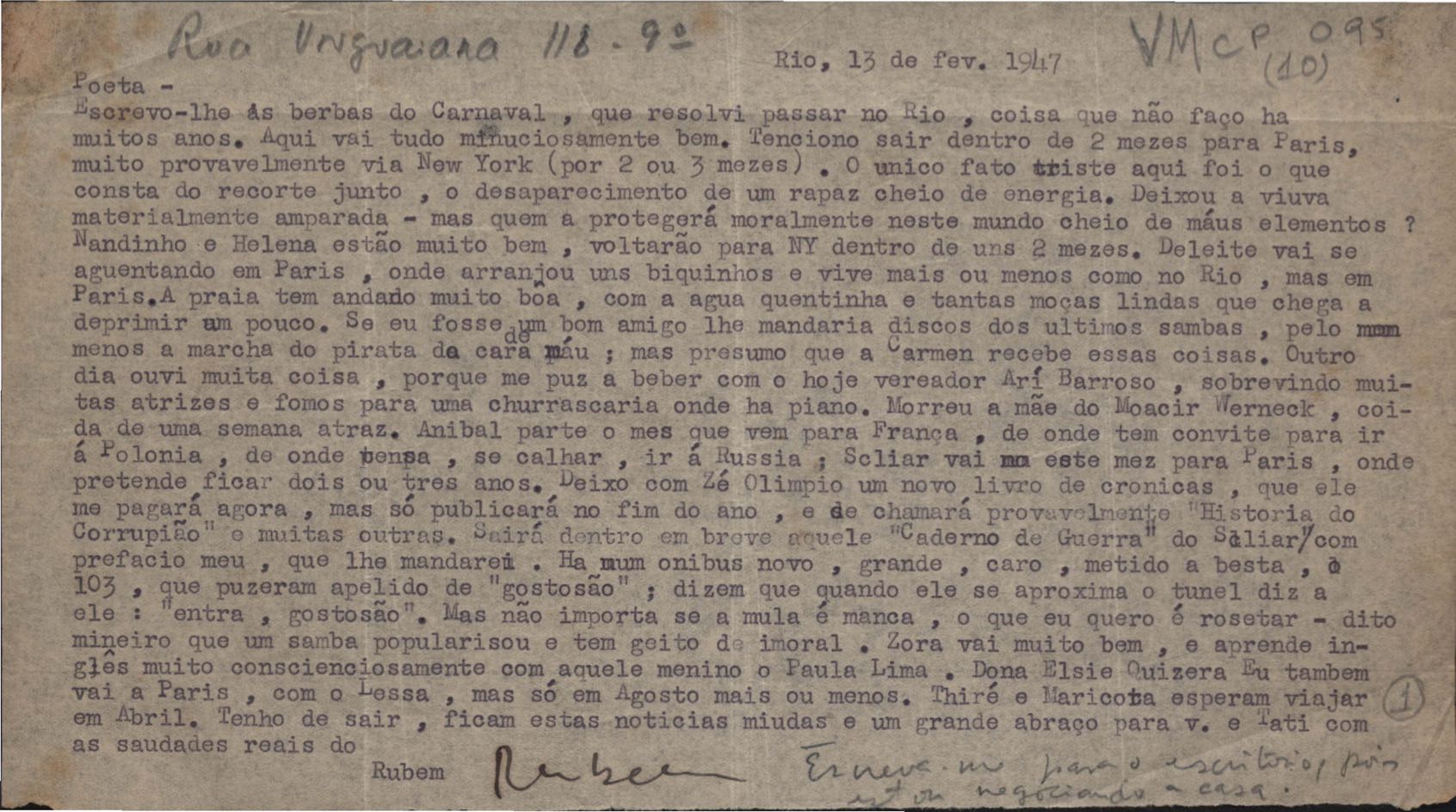 Comentários sobre a publicação de História da corrupção, pela José Olympio Editora, e de Caderno de guerra, de Scliar. Breves comentários sobre a obra de VM. Notícias do seu cotidiano e de amigos em comum. Anexos: 1. Carta de Rubem Braga a [Zora Soljan]; 2. Menu com assinaturas e desenhos.