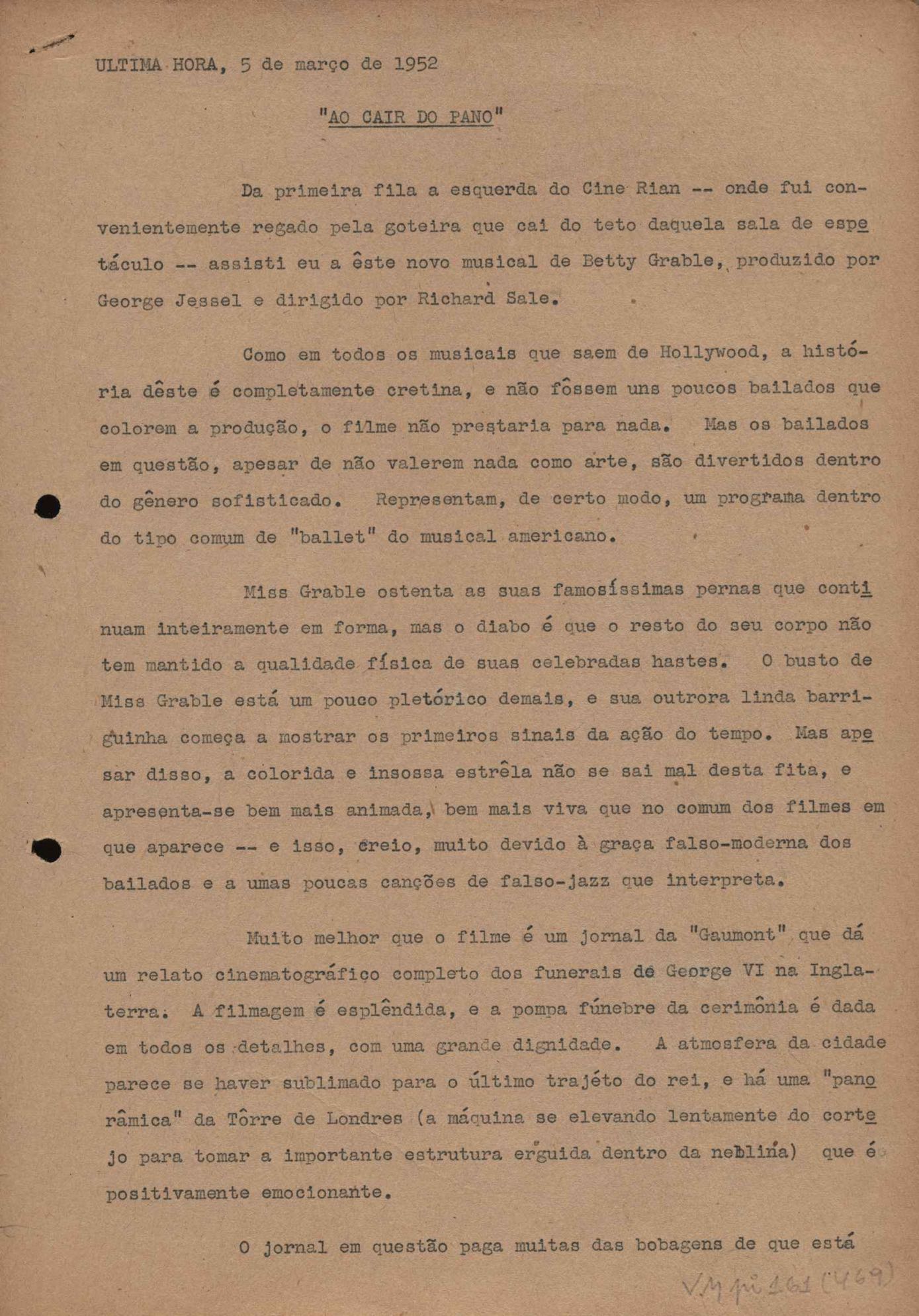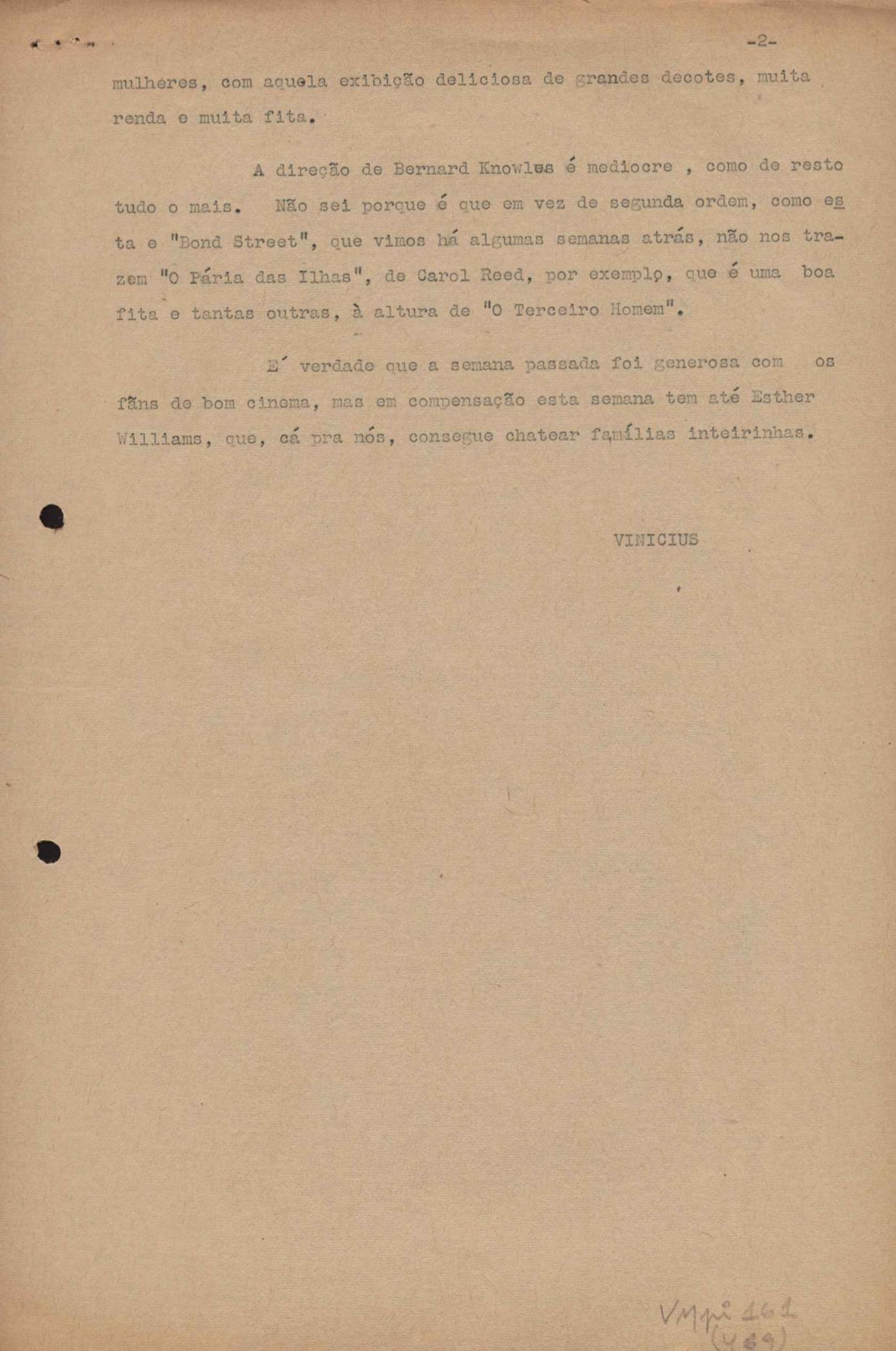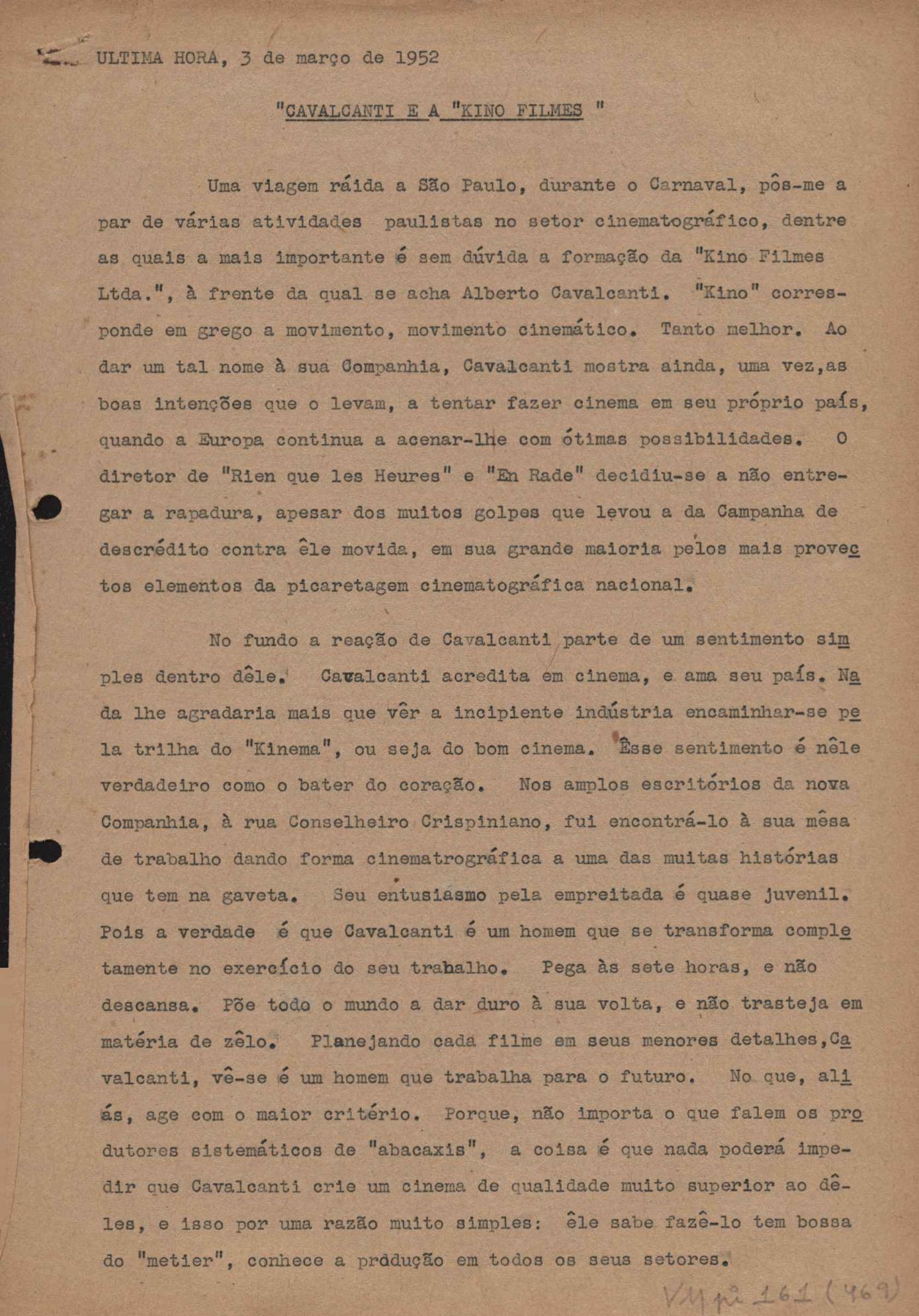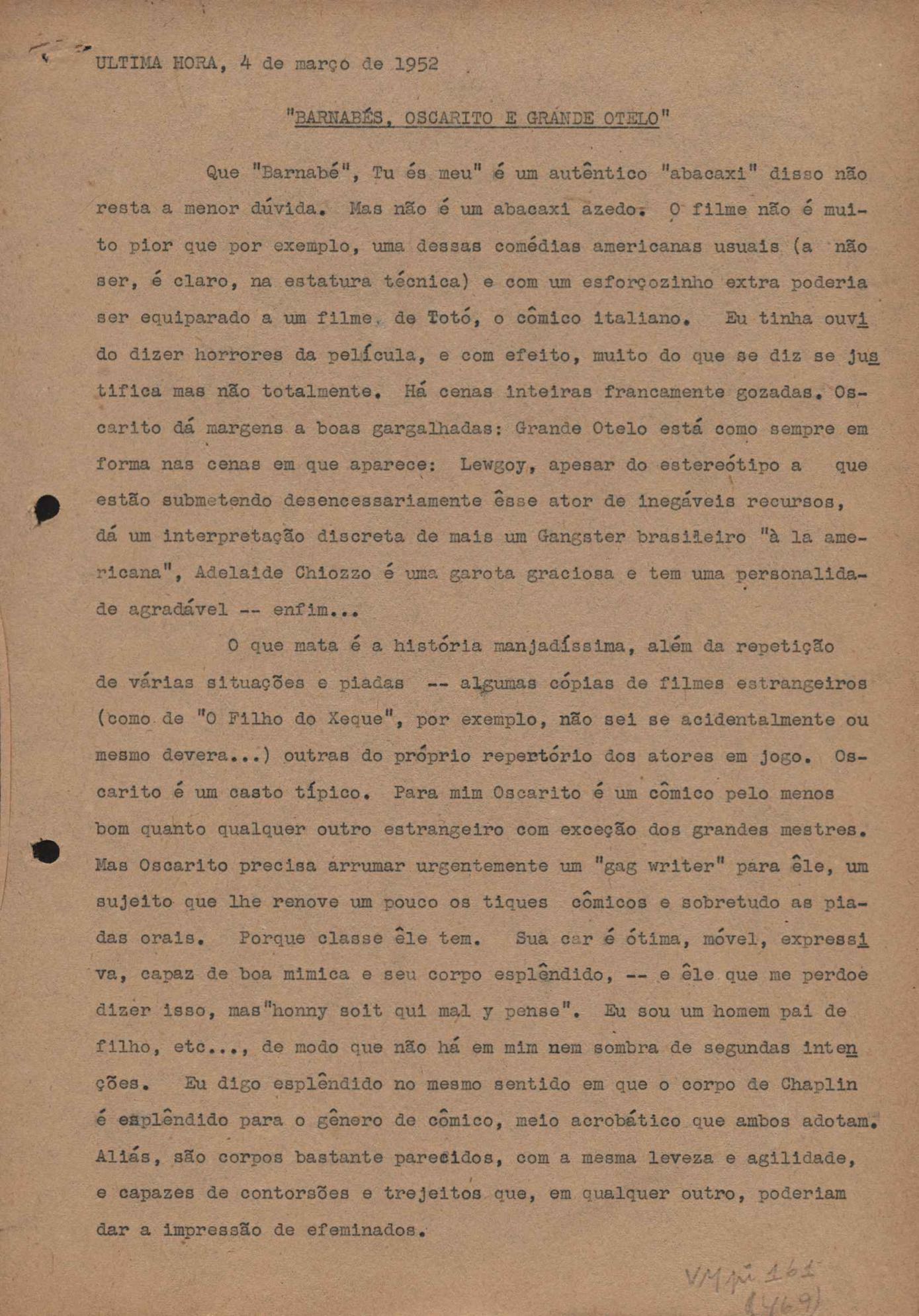 "A extinção do 'Crown Film Unit’ britânico", "Cavalcanti e a Kino Filmes", "Barnabés, Oscarito e Grande Otelo", "Ao cair do pano", "Sua última missão", "O brotinho e as respeitosas", "Eu sou o pirata da perna de pau... pau... pau... (a propósito de dois filmes em cartaz)", "Com sua permissão, Sir Lawrence Olivier", "Ambição mortal", "Rommel... ou Romeu?", "Pierre Renoir", "Como se faz um filme (I)", "Como se faz um filme (II)", "Como se faz um filme (V) - Águas mortíferas aos pés dos santos do Aleijadinho", "Espada contra espada", "Foi muito 'Oscar' demais" e "O Primeiro Festival Internacional de Cinema do Brasil"