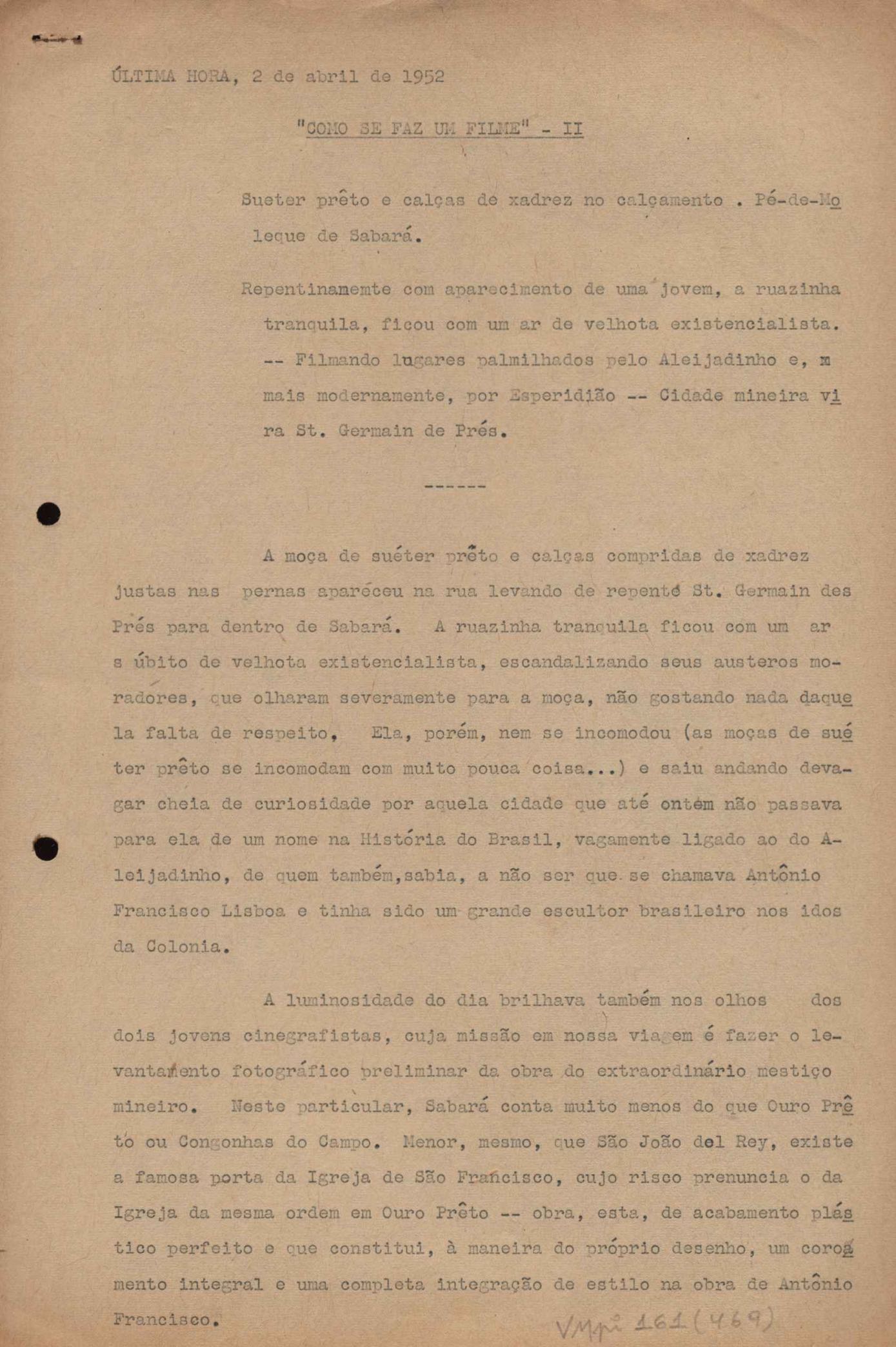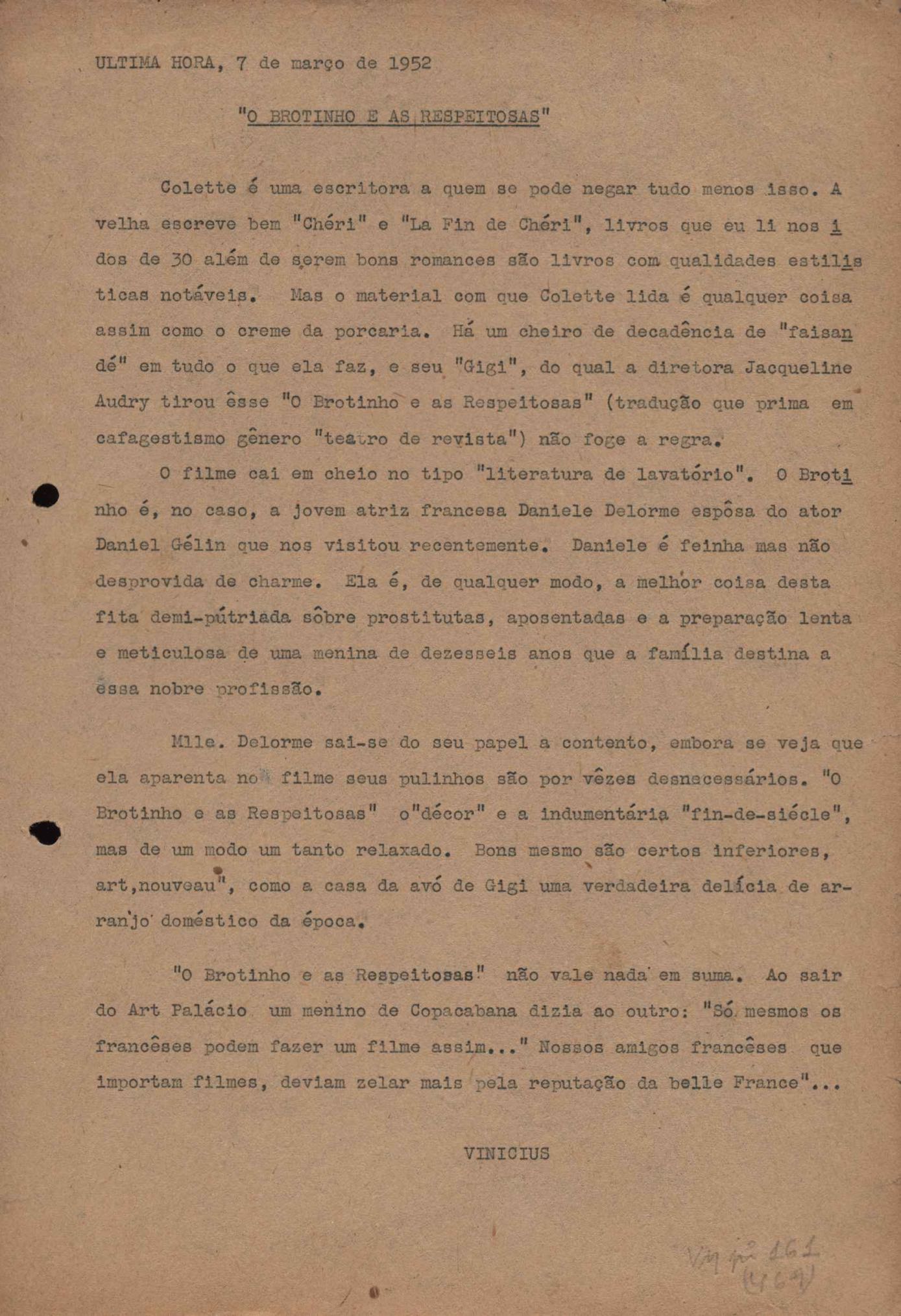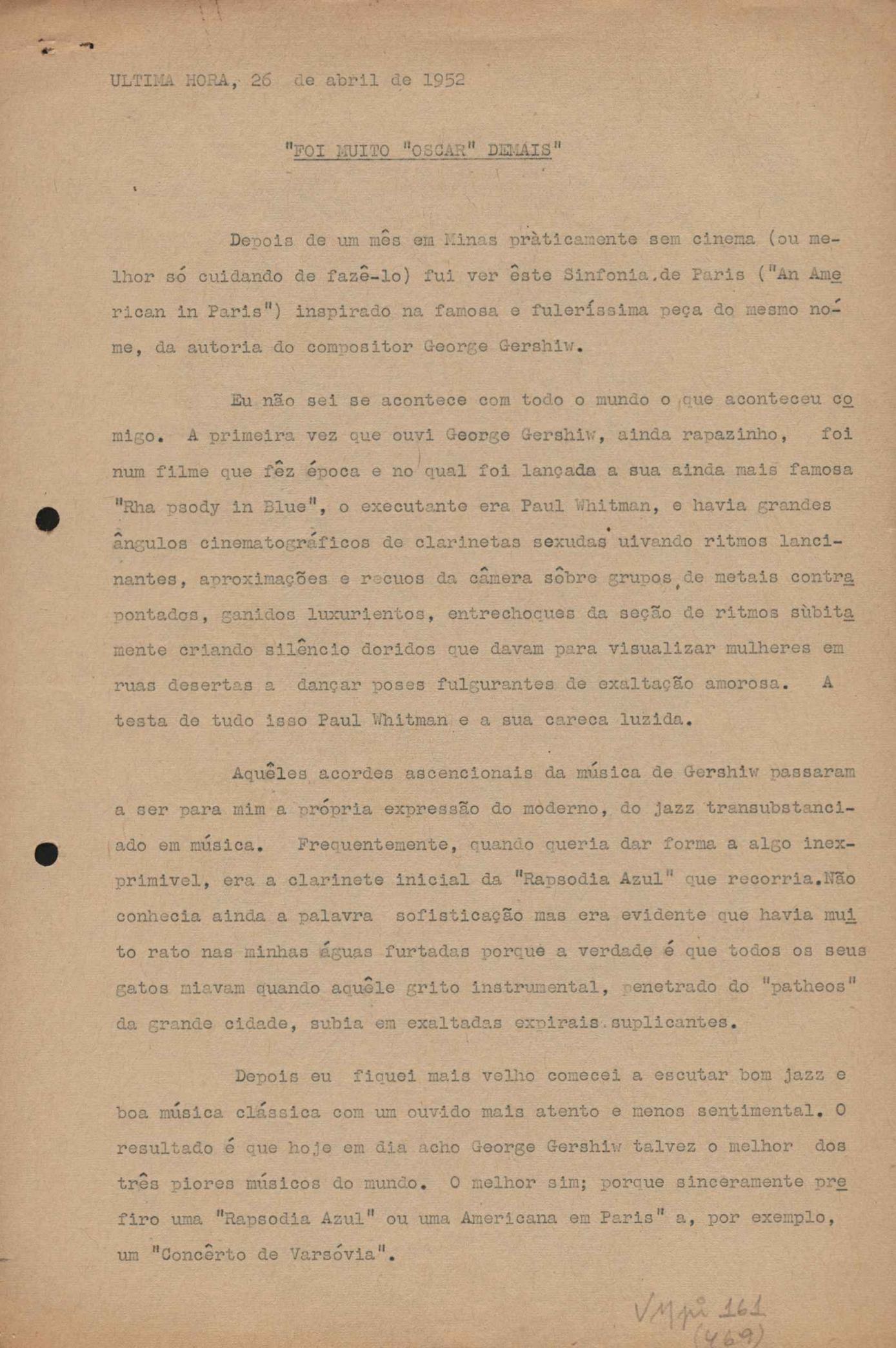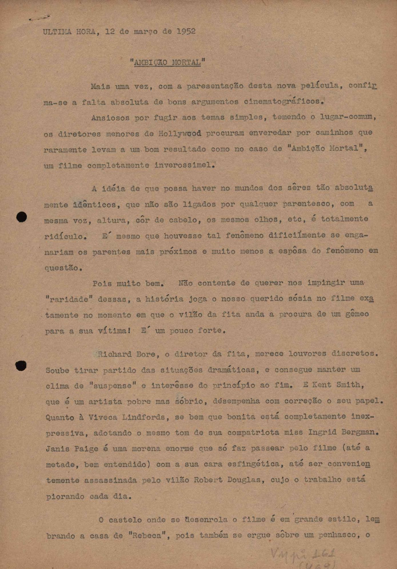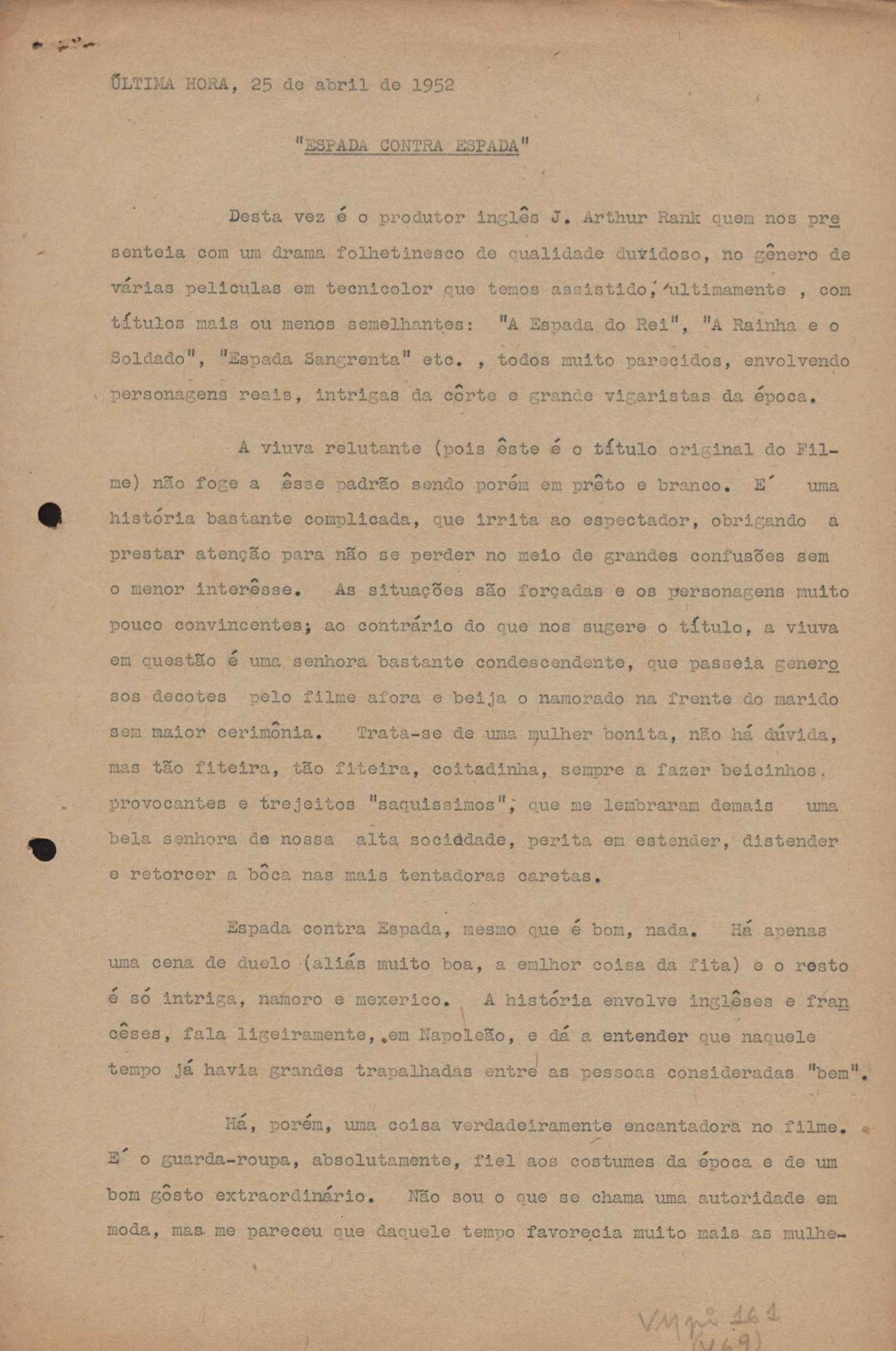 "A extinção do 'Crown Film Unit’ britânico", "Cavalcanti e a Kino Filmes", "Barnabés, Oscarito e Grande Otelo", "Ao cair do pano", "Sua última missão", "O brotinho e as respeitosas", "Eu sou o pirata da perna de pau... pau... pau... (a propósito de dois filmes em cartaz)", "Com sua permissão, Sir Lawrence Olivier", "Ambição mortal", "Rommel... ou Romeu?", "Pierre Renoir", "Como se faz um filme (I)", "Como se faz um filme (II)", "Como se faz um filme (V) - Águas mortíferas aos pés dos santos do Aleijadinho", "Espada contra espada", "Foi muito 'Oscar' demais" e "O Primeiro Festival Internacional de Cinema do Brasil"