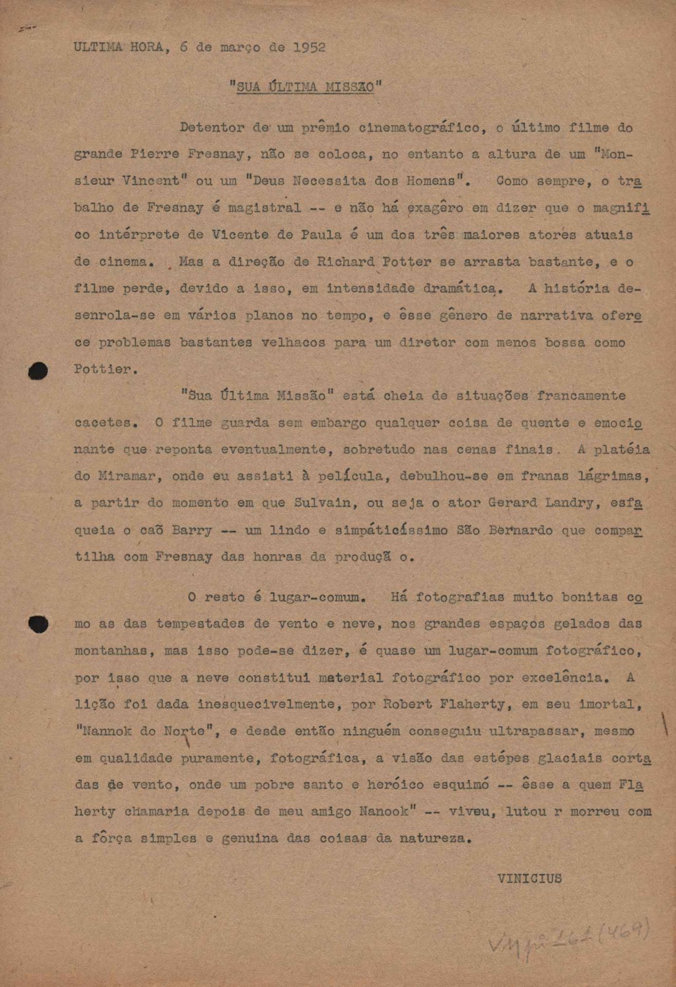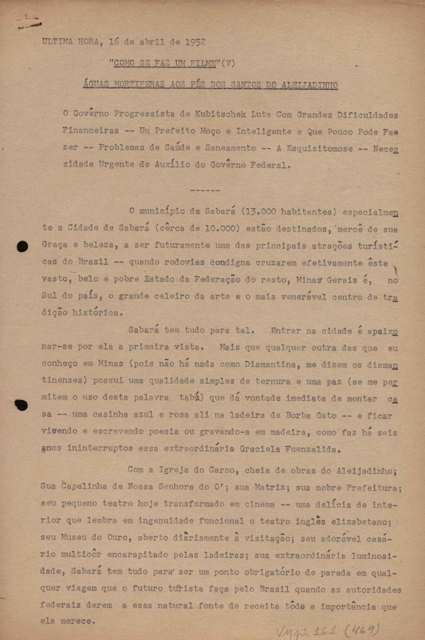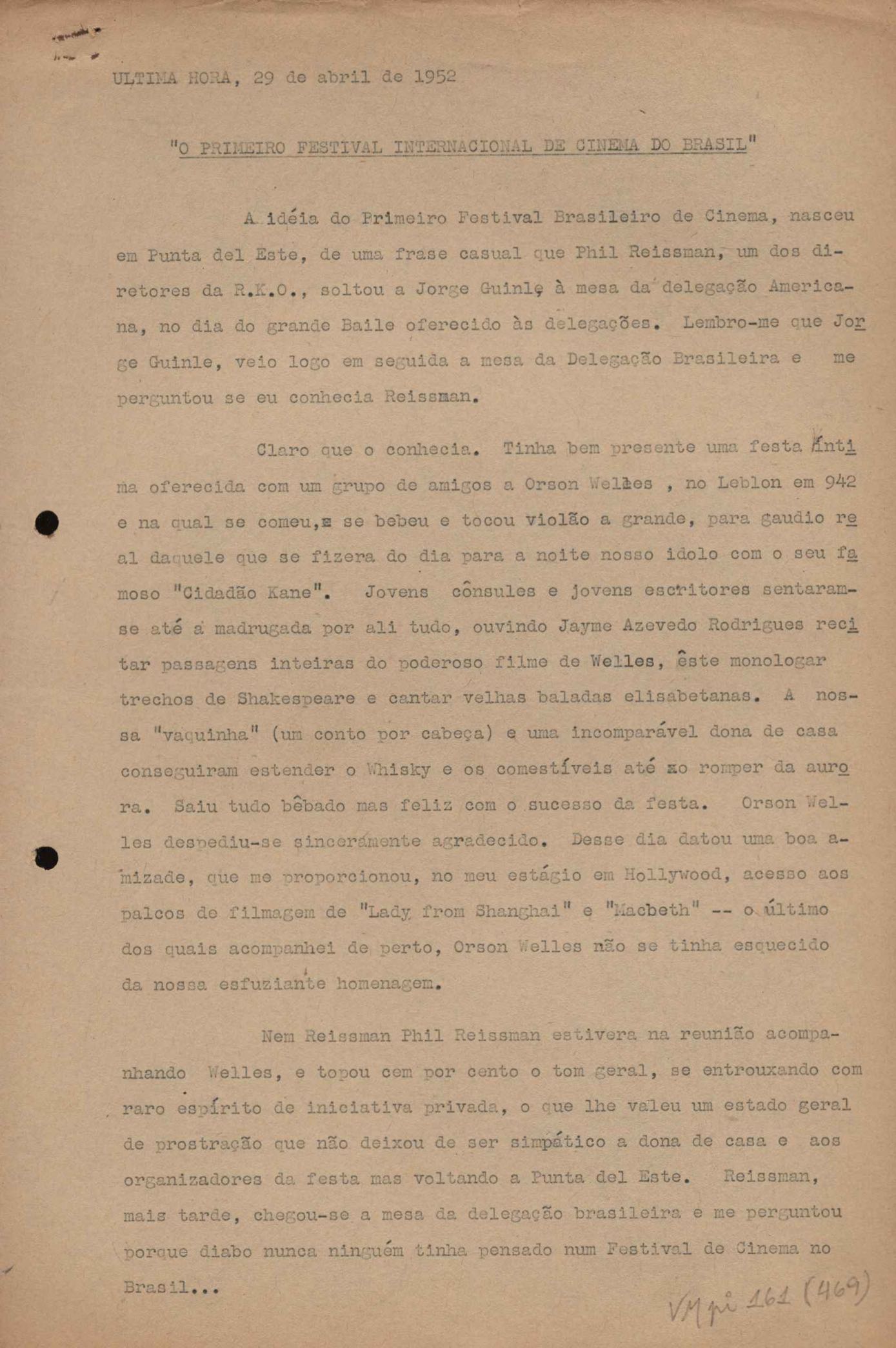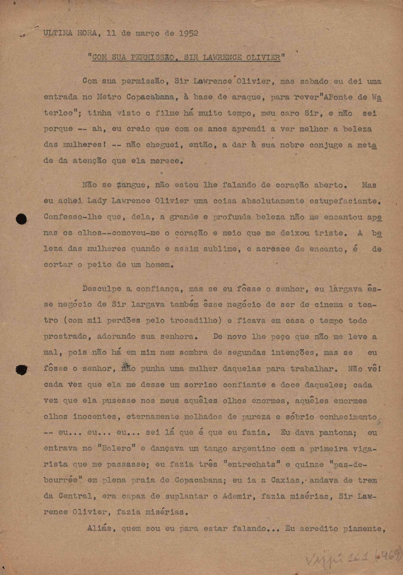 "A extinção do 'Crown Film Unit’ britânico", "Cavalcanti e a Kino Filmes", "Barnabés, Oscarito e Grande Otelo", "Ao cair do pano", "Sua última missão", "O brotinho e as respeitosas", "Eu sou o pirata da perna de pau... pau... pau... (a propósito de dois filmes em cartaz)", "Com sua permissão, Sir Lawrence Olivier", "Ambição mortal", "Rommel... ou Romeu?", "Pierre Renoir", "Como se faz um filme (I)", "Como se faz um filme (II)", "Como se faz um filme (V) - Águas mortíferas aos pés dos santos do Aleijadinho", "Espada contra espada", "Foi muito 'Oscar' demais" e "O Primeiro Festival Internacional de Cinema do Brasil"