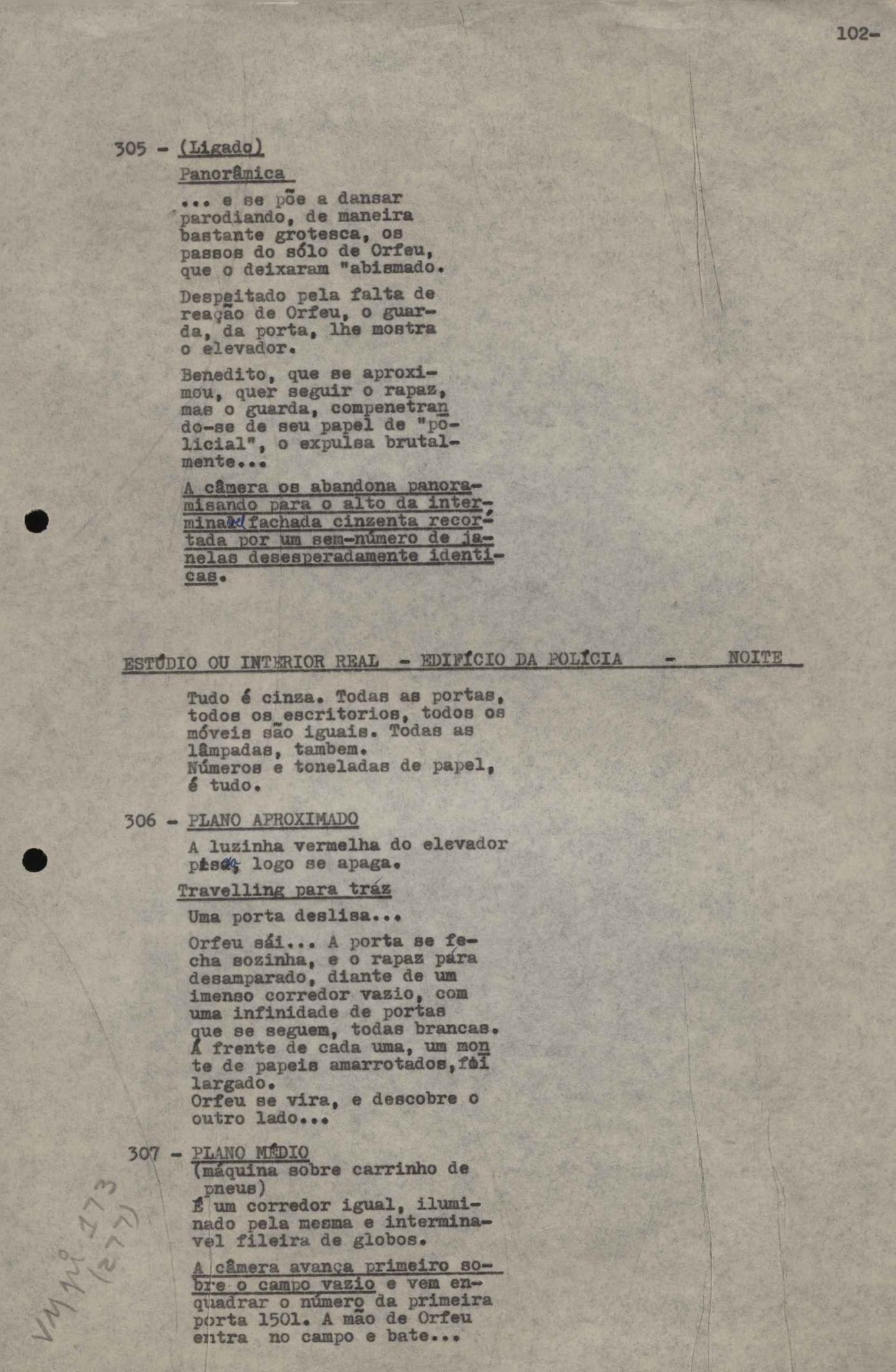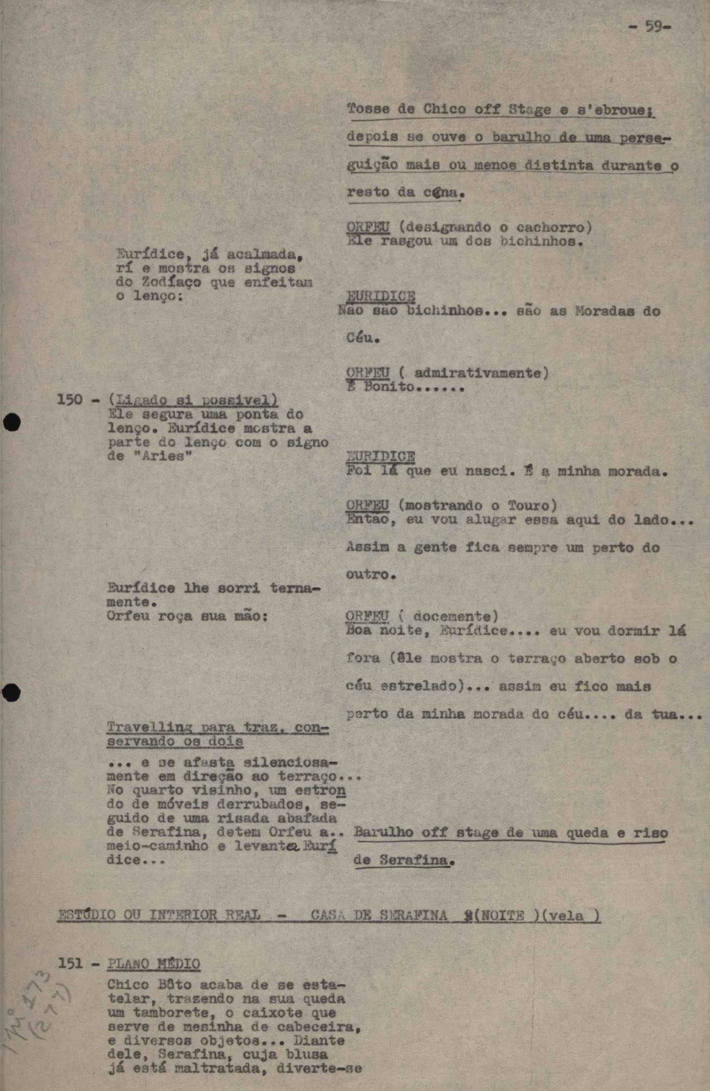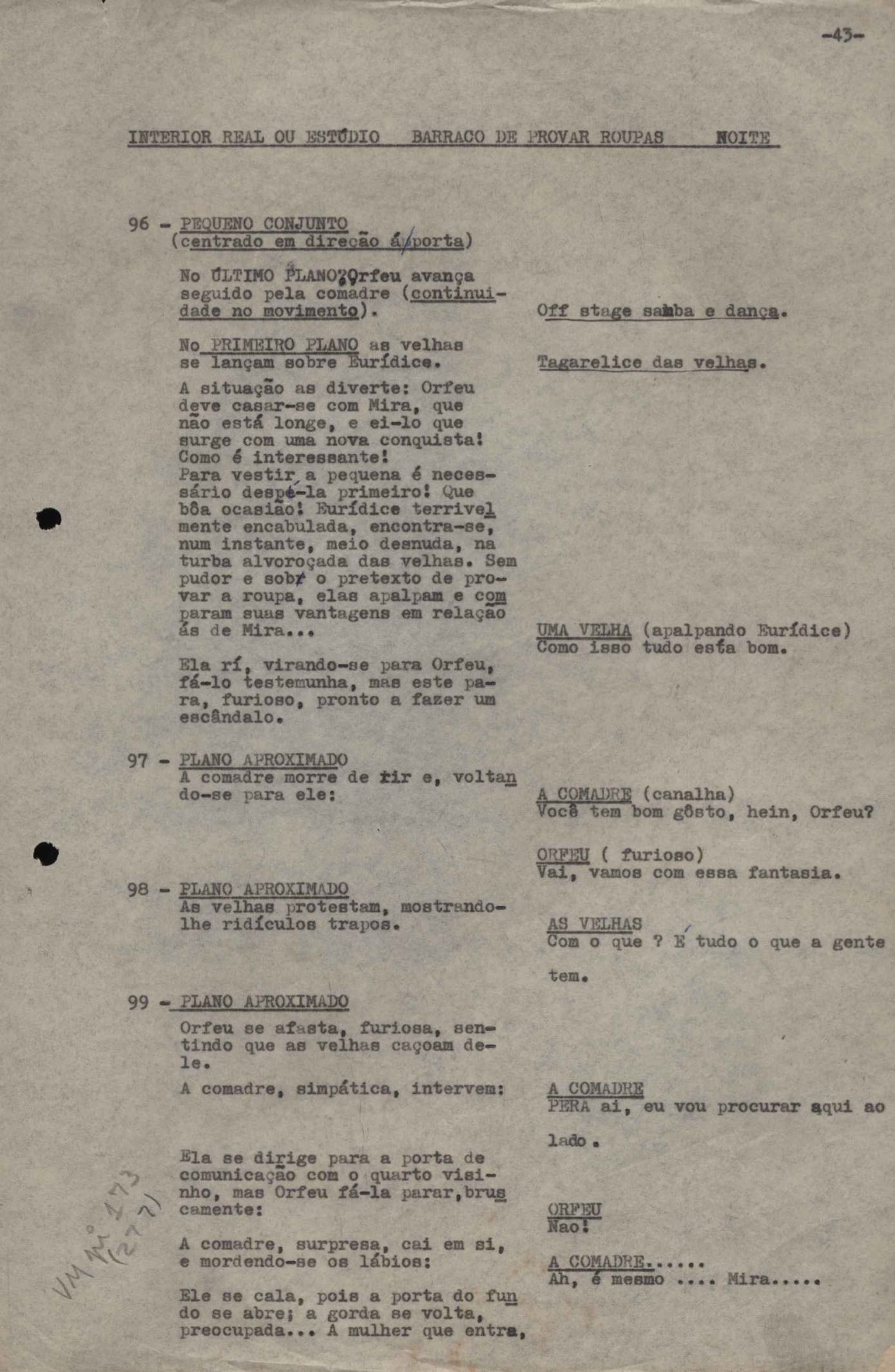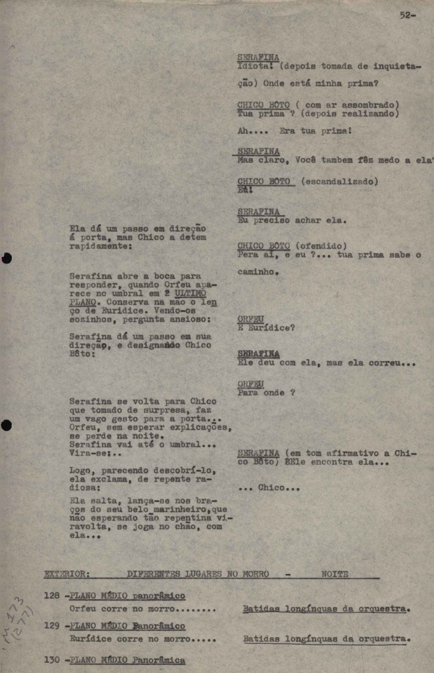 Roteiro cinematográfico decupado de Orfeu negro (1). Anexo: 1. Outra versão do roteiro decupado; 2. Duas versões do roteiro em francês; 3. Folha de rosto; 4. Nota explicativa; 5. Sinopse; 6. Informações diversas relativas à filmagem de Orfeu negro; 7. Artigo "A propos de Orfeu negro" (português e francês).