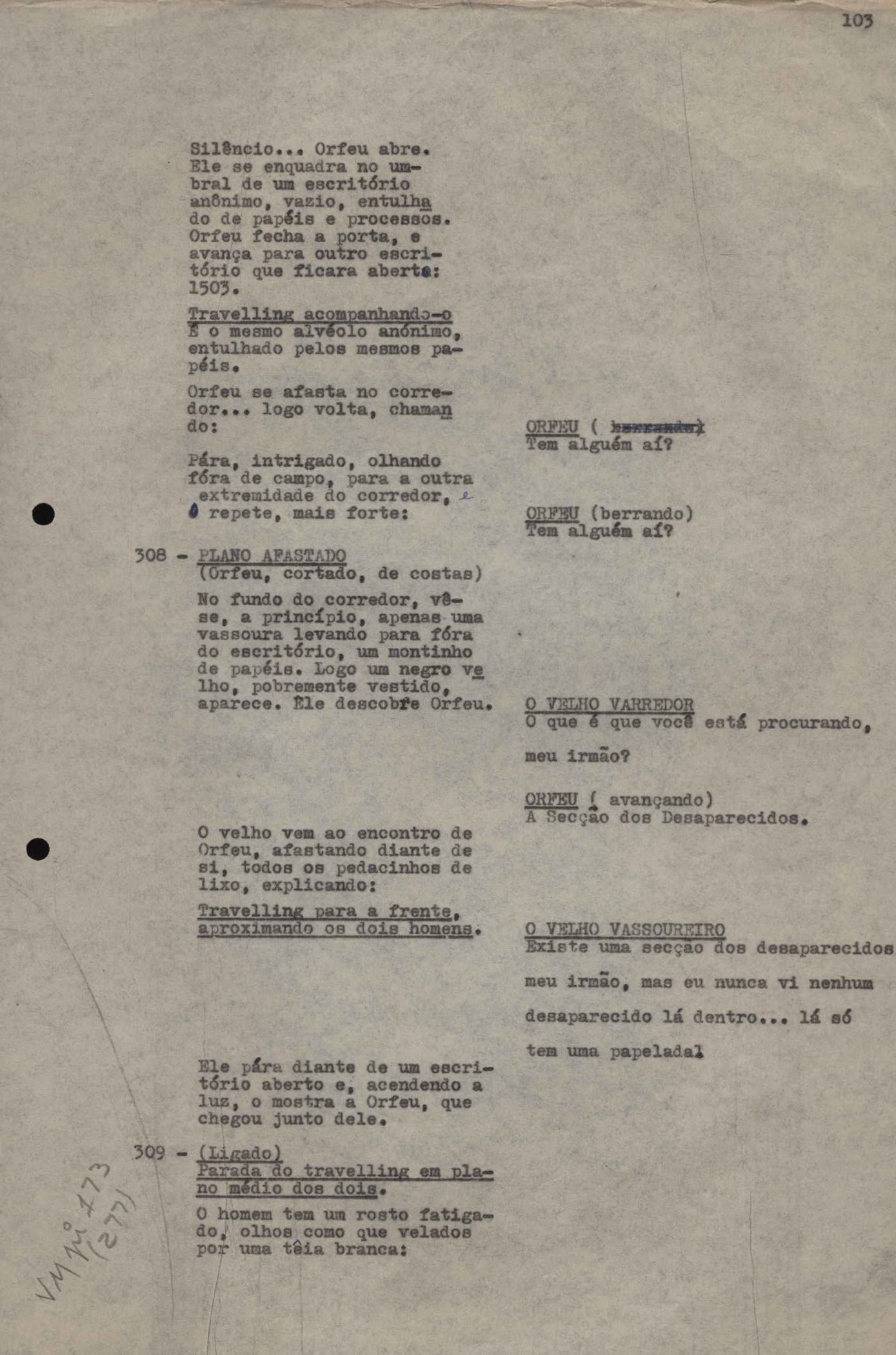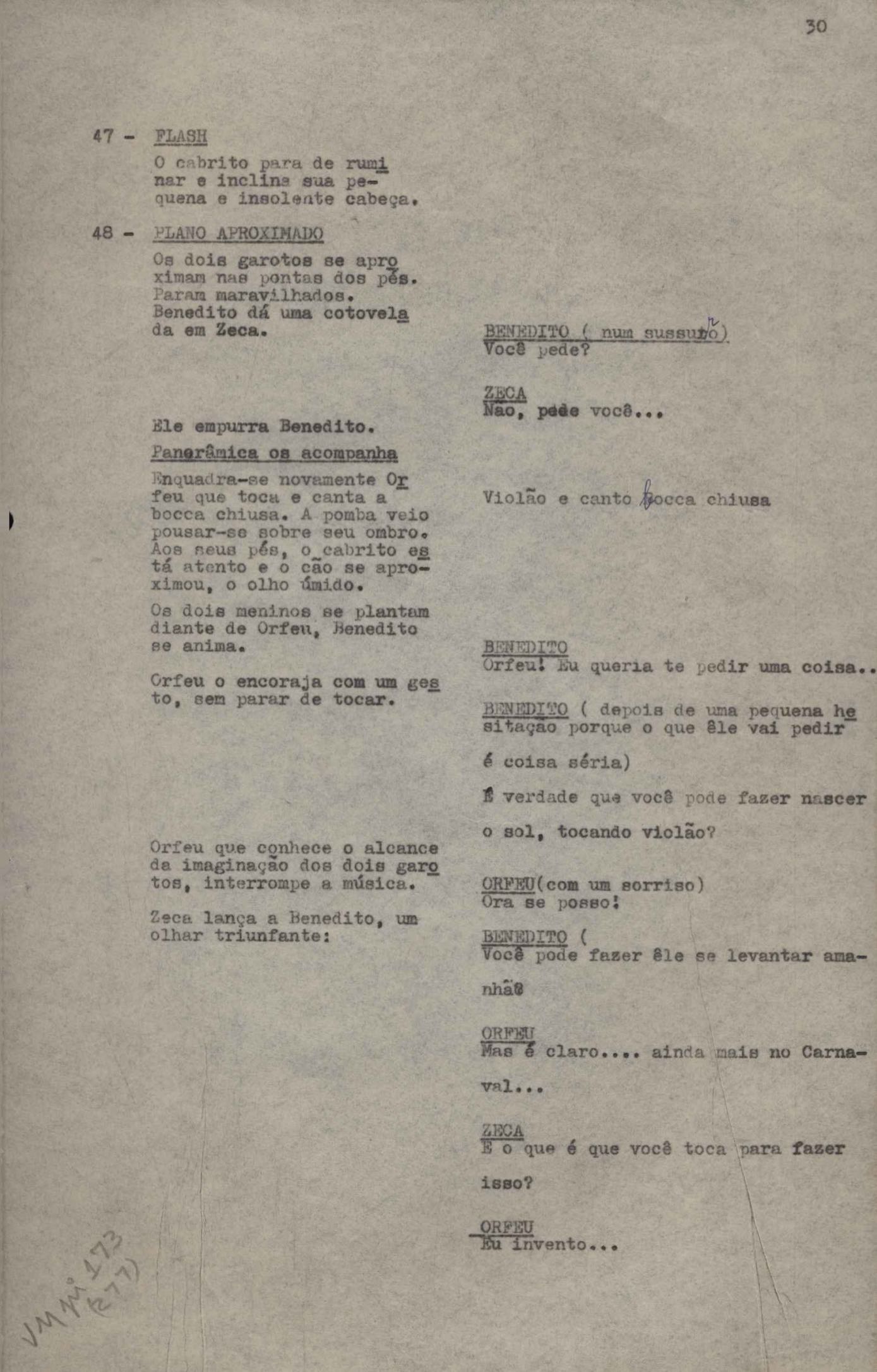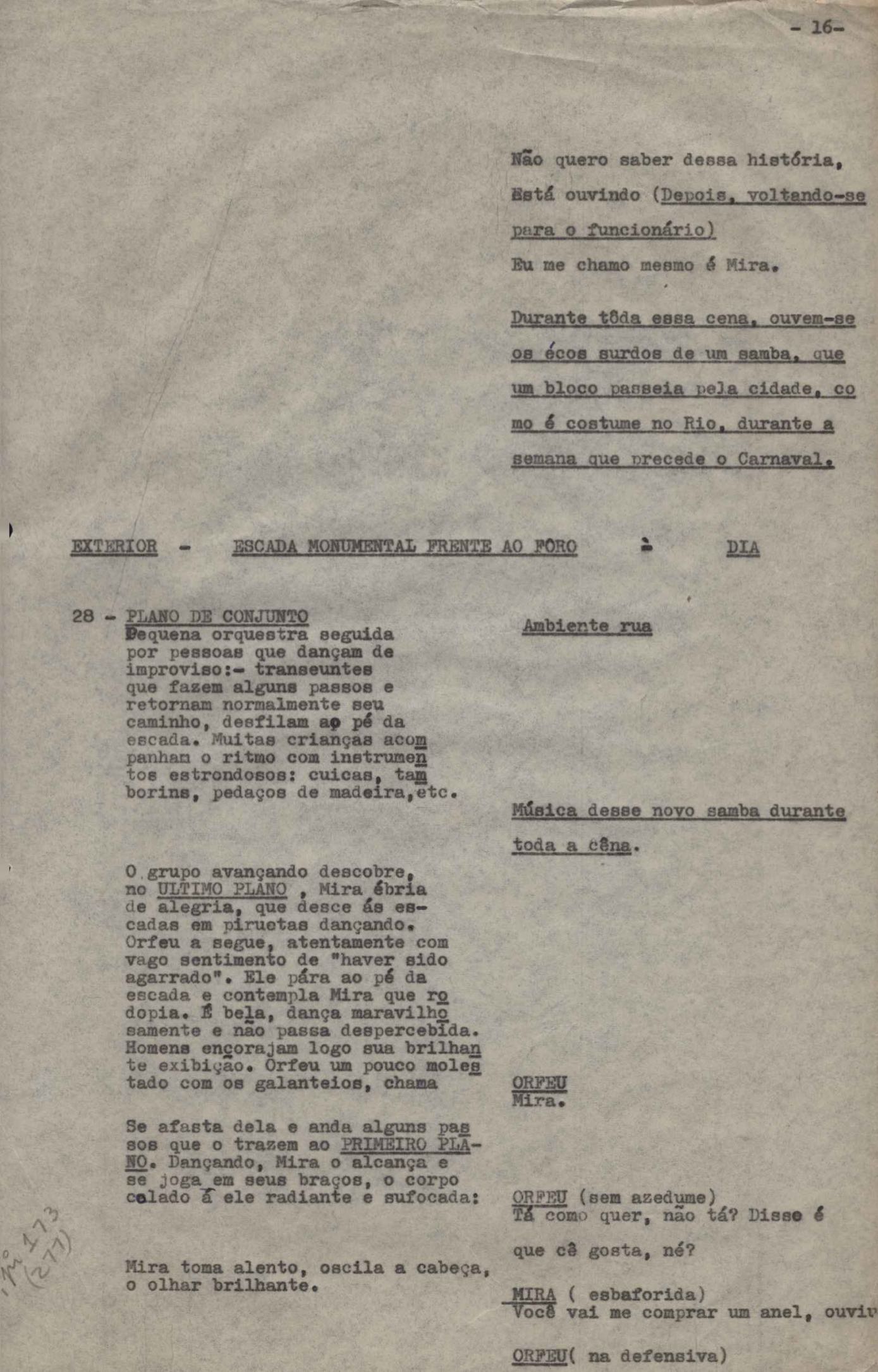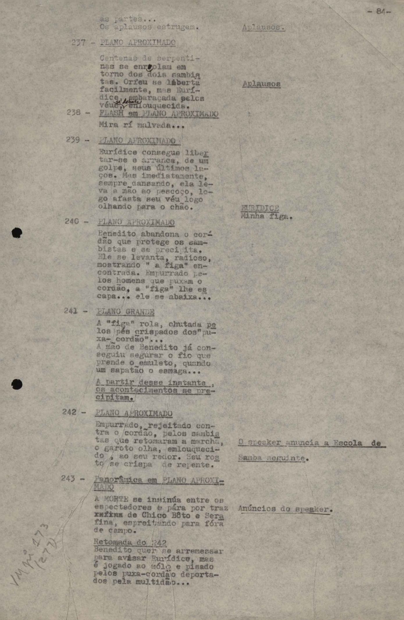 Roteiro cinematográfico decupado de Orfeu negro (1). Anexo: 1. Outra versão do roteiro decupado; 2. Duas versões do roteiro em francês; 3. Folha de rosto; 4. Nota explicativa; 5. Sinopse; 6. Informações diversas relativas à filmagem de Orfeu negro; 7. Artigo "A propos de Orfeu negro" (português e francês).