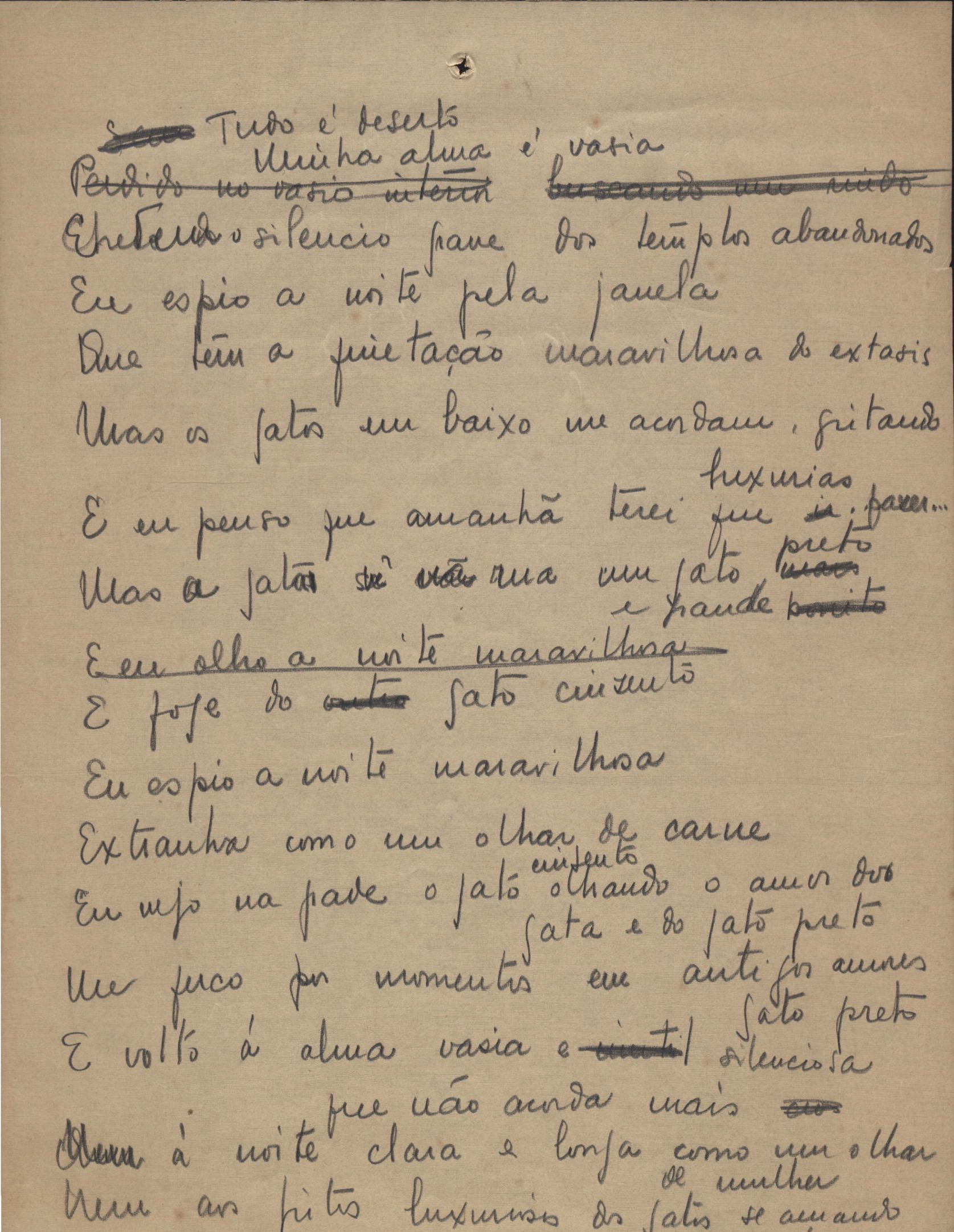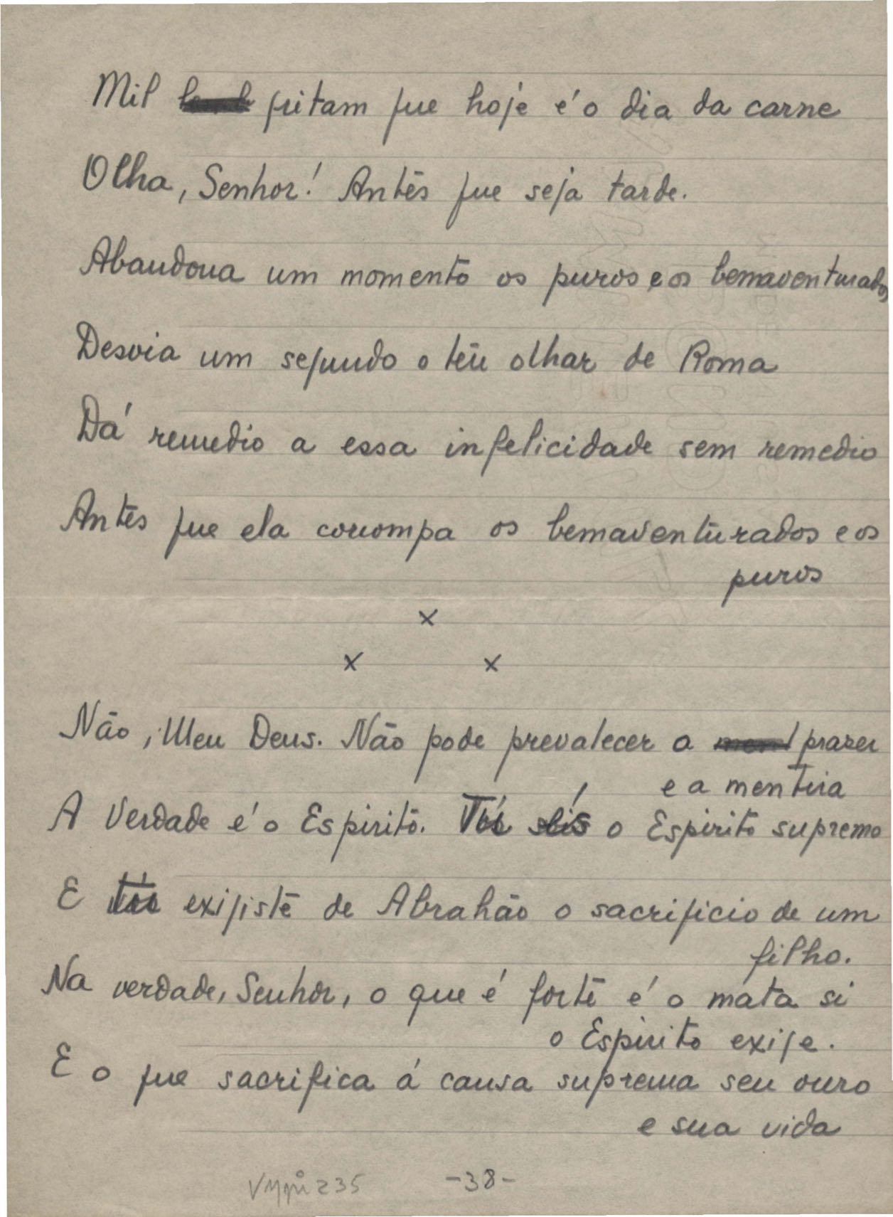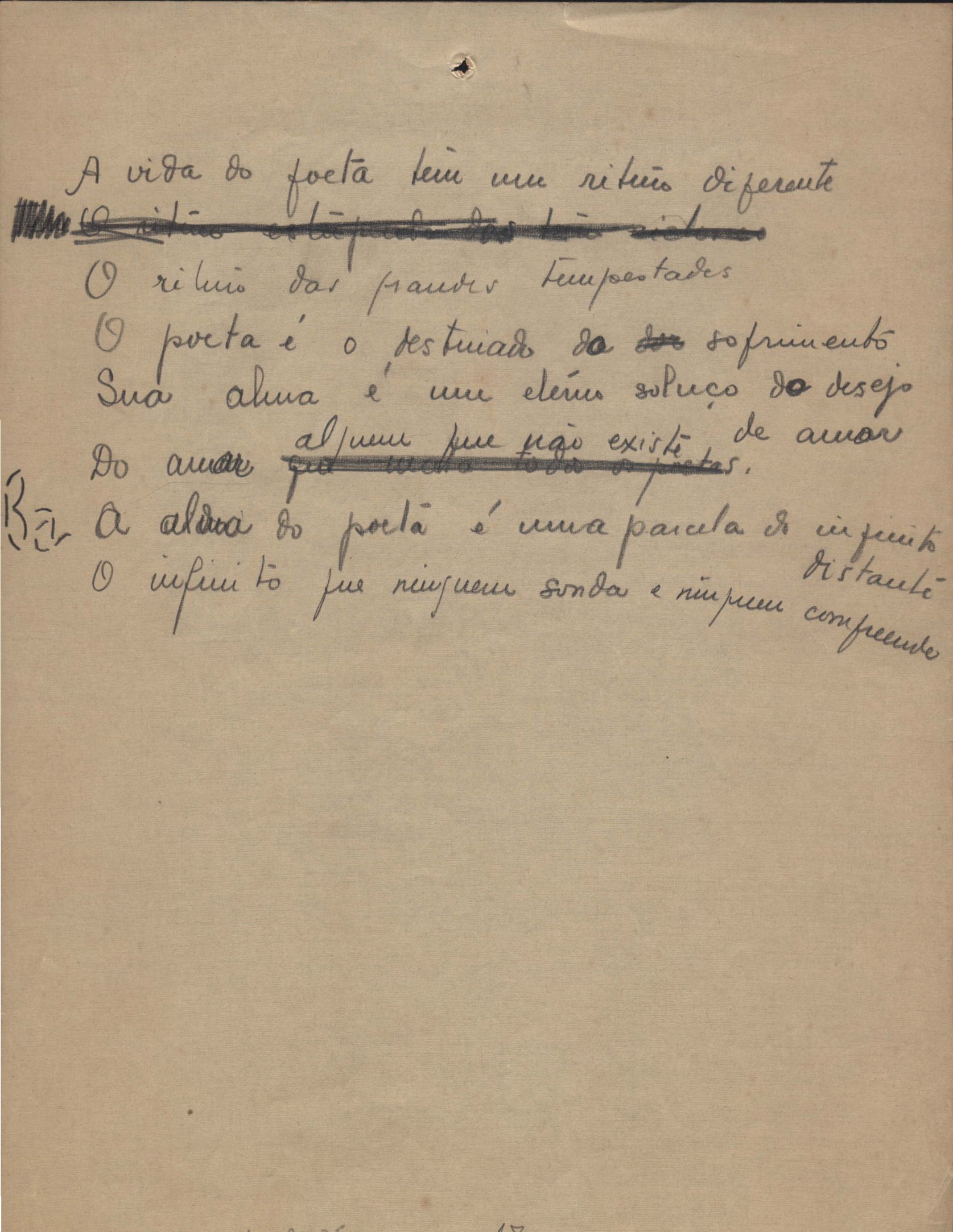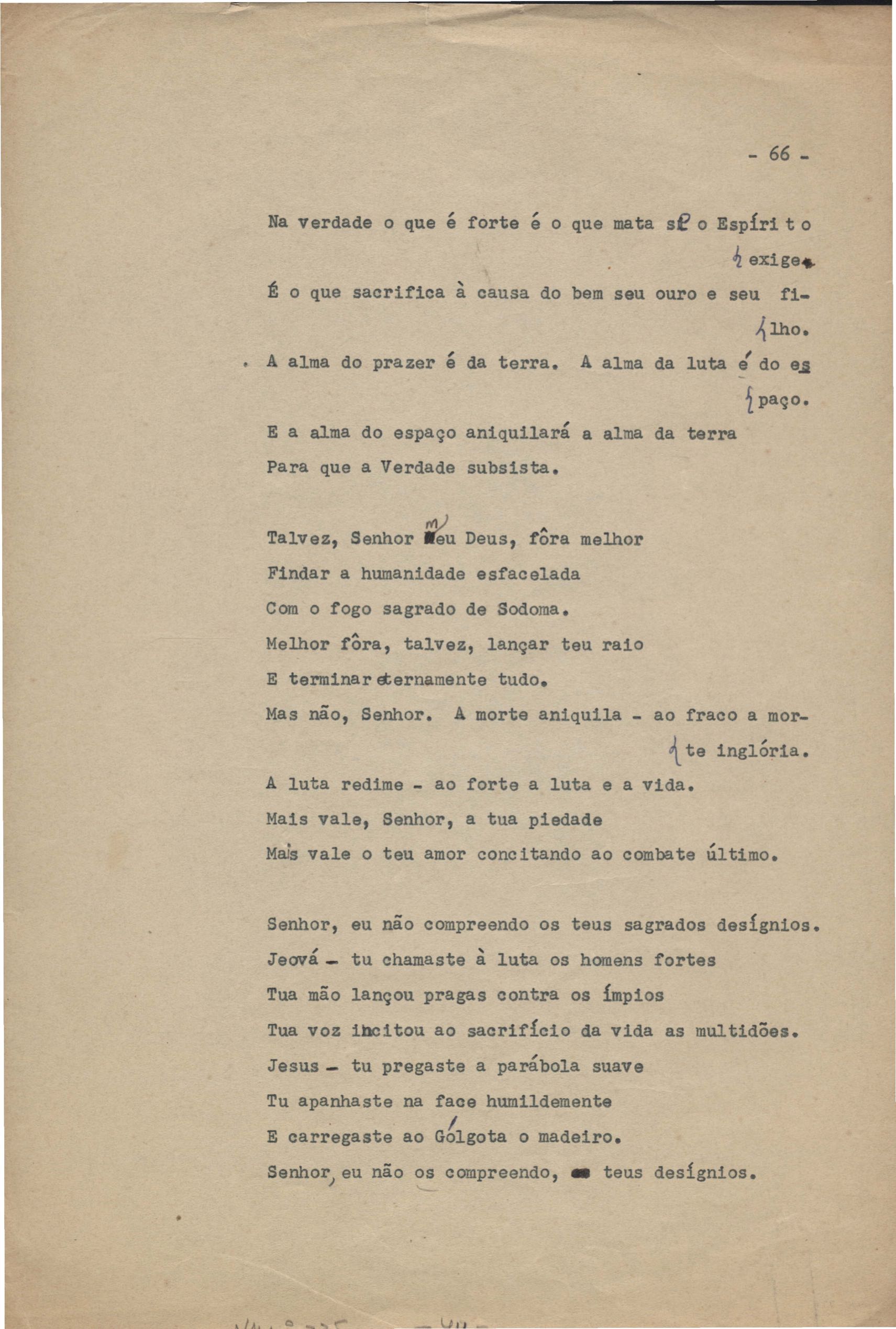 Poemas (40). "A que há de vir", "A uma mulher", "Ânsia", "O bom pastor", "Carne", "Desde sempre", "A esposa", "Extensão", "Fim", "A floresta", "A grande voz", "Inatingível", "Os inconsoláveis", "Introspecção", "Judeu errante", "Minha mãe", "Místico", "Mormaço", "Olhos mortos", "O poeta na madrugada", "O poeta", "Purificação", "Quietação", "Revolta", "Romanza", "Rua da Amargura", "Sacrifício", "Senhor, eu não sou digno", "Solidão", "Sonoridade", "Suspensão", "Tarde", "O terceiro filho", "O único caminho", "O vale do paraíso", "Vazio", "Velha história", "Velhice", "Vigília" e "Vinte anos". Anexo: 1. Recortes de alguns poemas impressos da 1ª edição com correções manuscritas; 2. Outras versões manuscritas e datilografadas, com emendas de: "A uma mulher", "O bom pastor", "Fim", "A grande voz", "Inatingível", "Introspecção", "Mormaço", "O poeta" (inc.), "Quietação", "Romanza", "Rua da amargura", "Solidão", "Sonoridade", "Suspensão", "Tarde", "O vale do paraíso", "Vazio", "Velha história" e "Vigília".