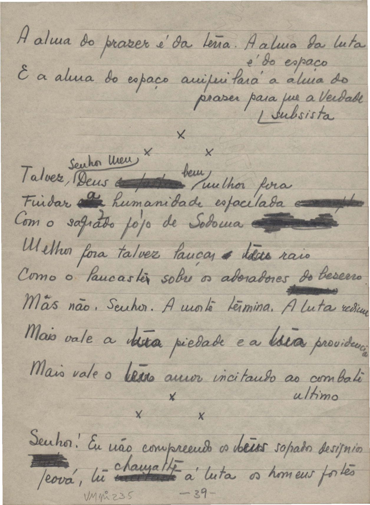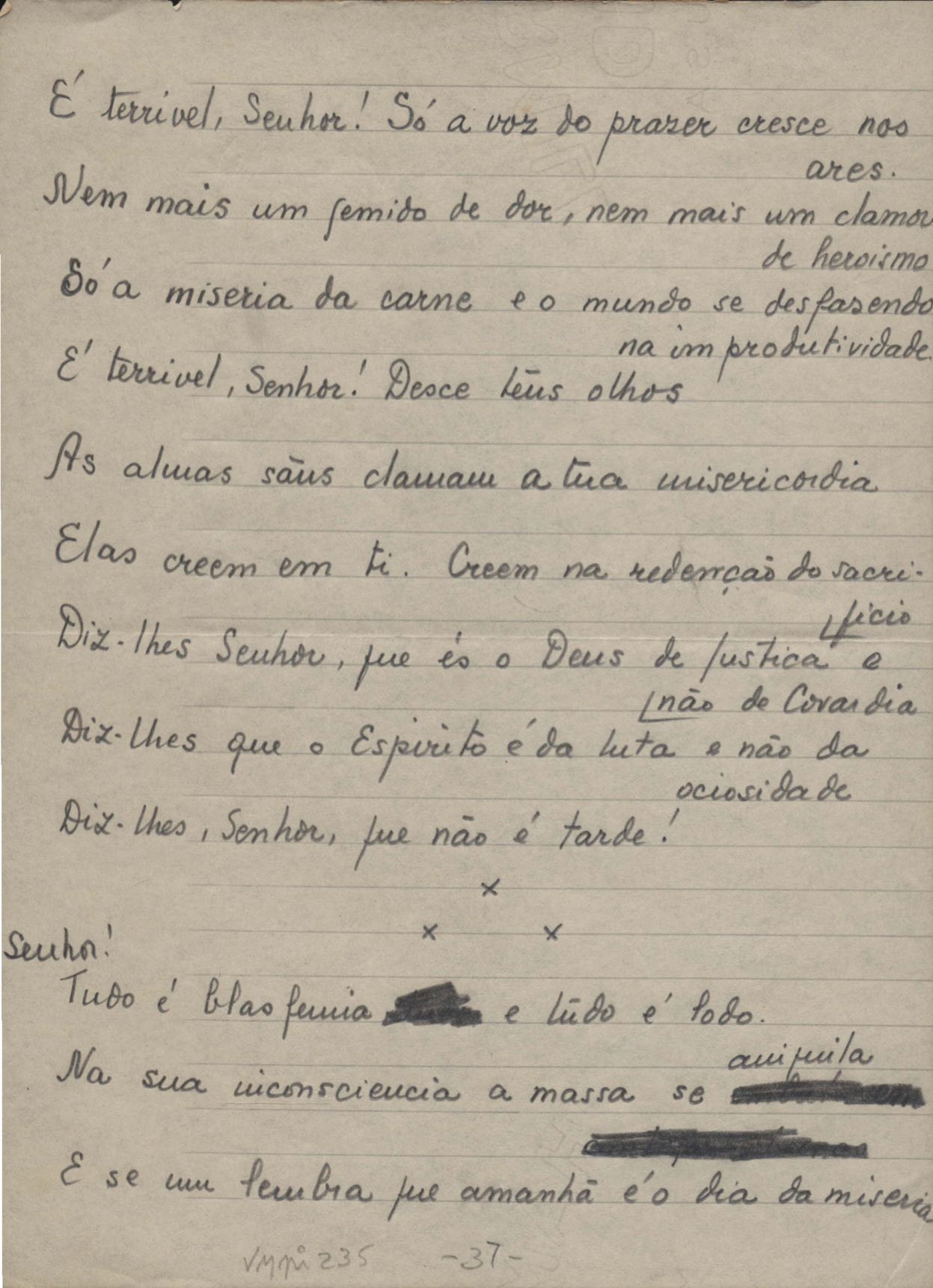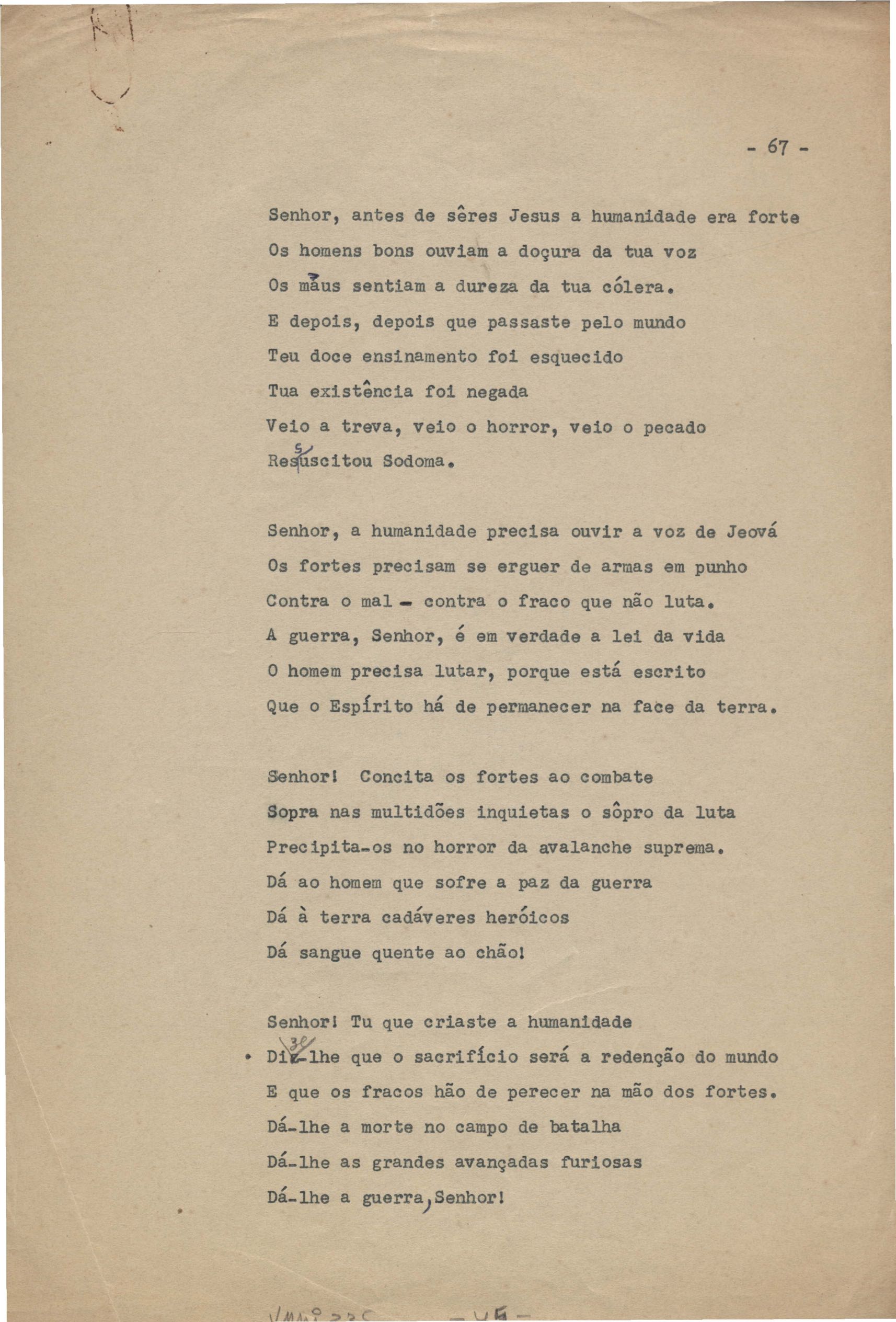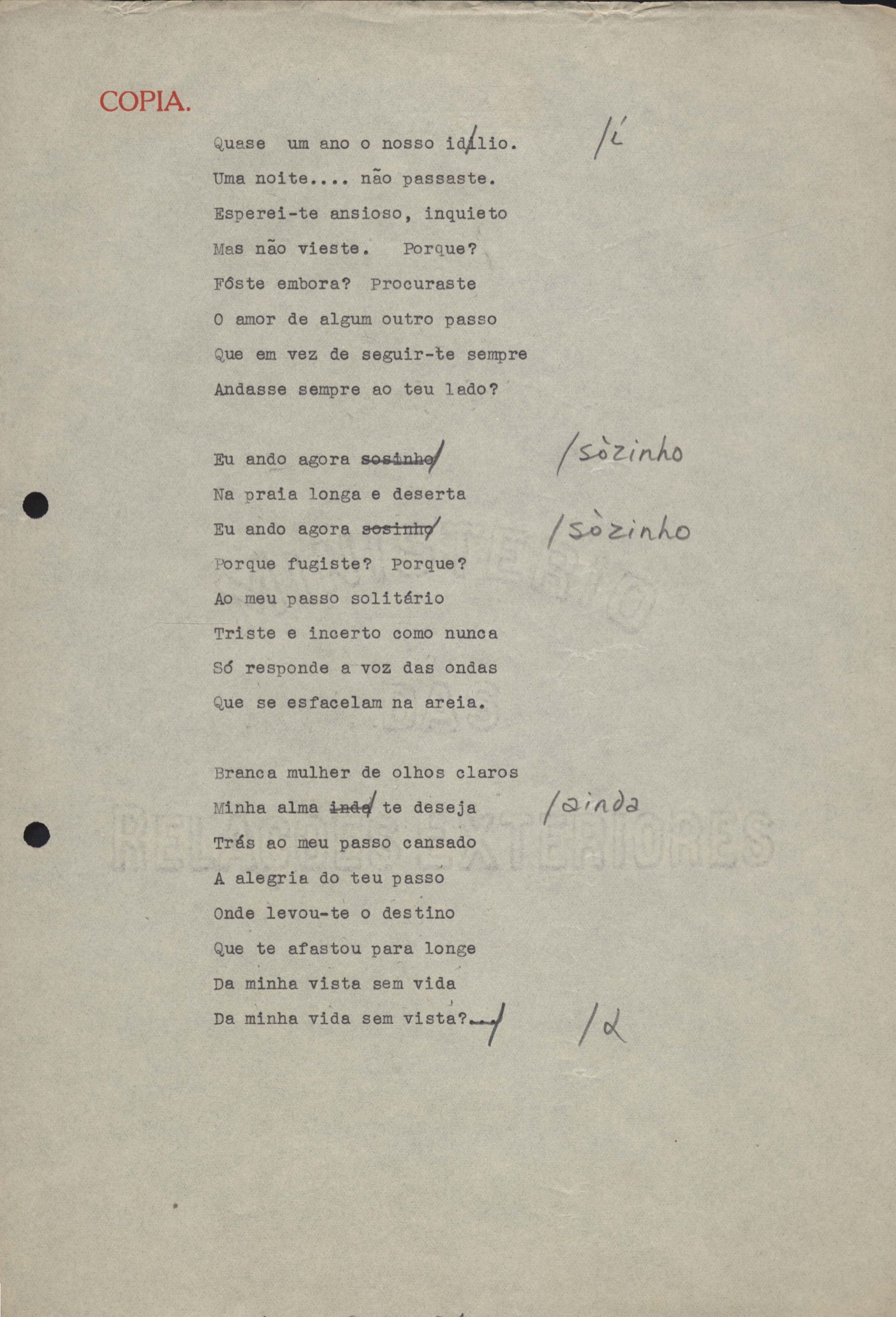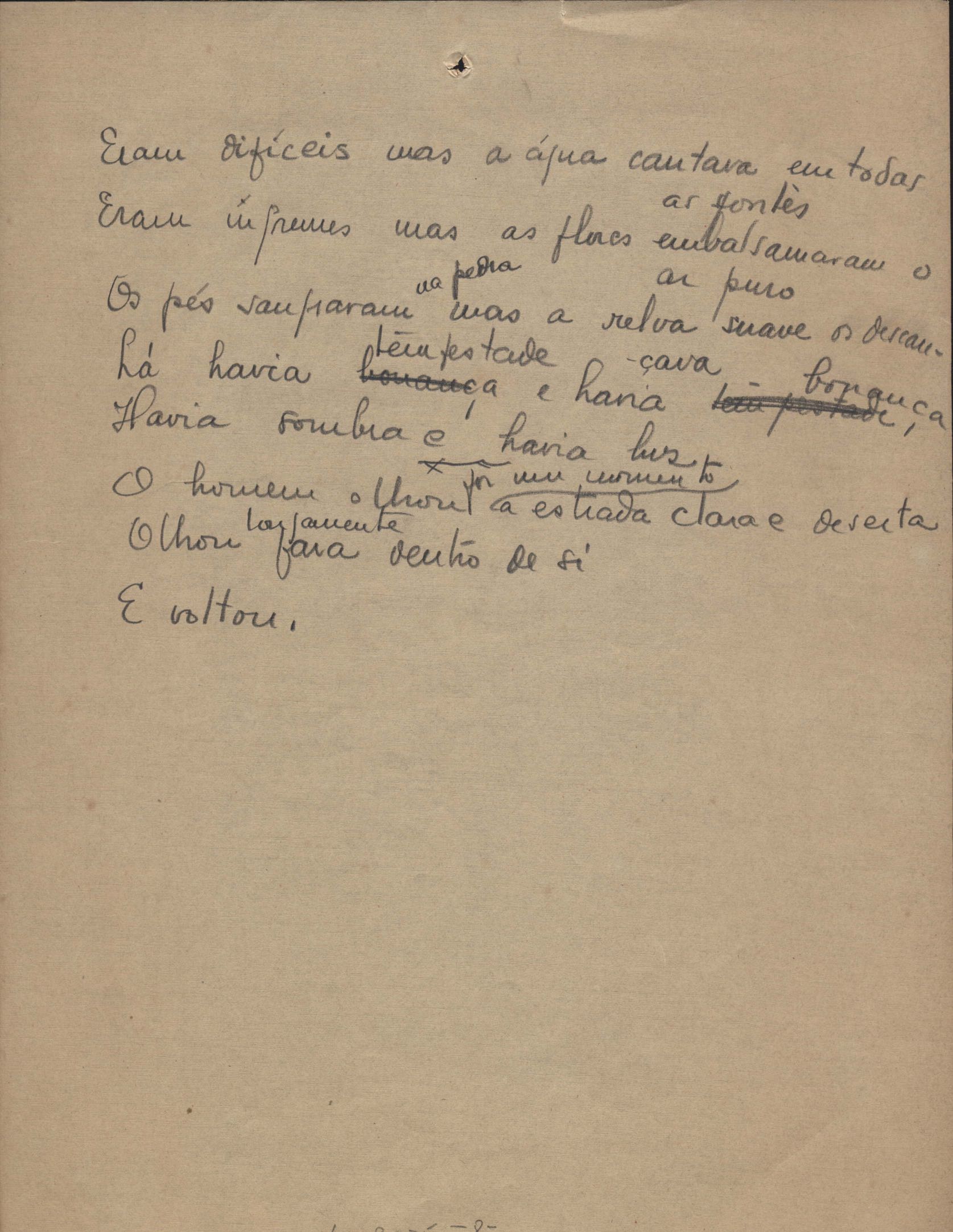 Poemas (40). "A que há de vir", "A uma mulher", "Ânsia", "O bom pastor", "Carne", "Desde sempre", "A esposa", "Extensão", "Fim", "A floresta", "A grande voz", "Inatingível", "Os inconsoláveis", "Introspecção", "Judeu errante", "Minha mãe", "Místico", "Mormaço", "Olhos mortos", "O poeta na madrugada", "O poeta", "Purificação", "Quietação", "Revolta", "Romanza", "Rua da Amargura", "Sacrifício", "Senhor, eu não sou digno", "Solidão", "Sonoridade", "Suspensão", "Tarde", "O terceiro filho", "O único caminho", "O vale do paraíso", "Vazio", "Velha história", "Velhice", "Vigília" e "Vinte anos". Anexo: 1. Recortes de alguns poemas impressos da 1ª edição com correções manuscritas; 2. Outras versões manuscritas e datilografadas, com emendas de: "A uma mulher", "O bom pastor", "Fim", "A grande voz", "Inatingível", "Introspecção", "Mormaço", "O poeta" (inc.), "Quietação", "Romanza", "Rua da amargura", "Solidão", "Sonoridade", "Suspensão", "Tarde", "O vale do paraíso", "Vazio", "Velha história" e "Vigília".