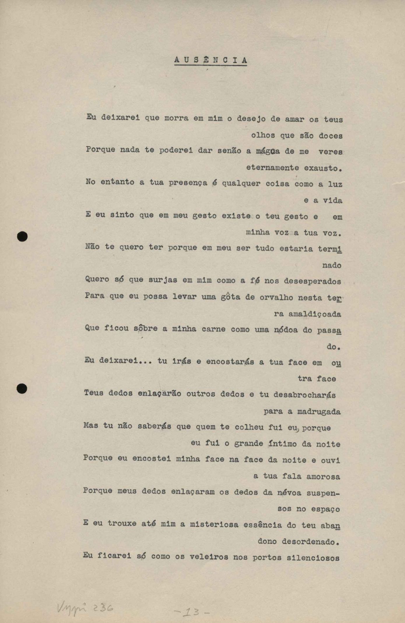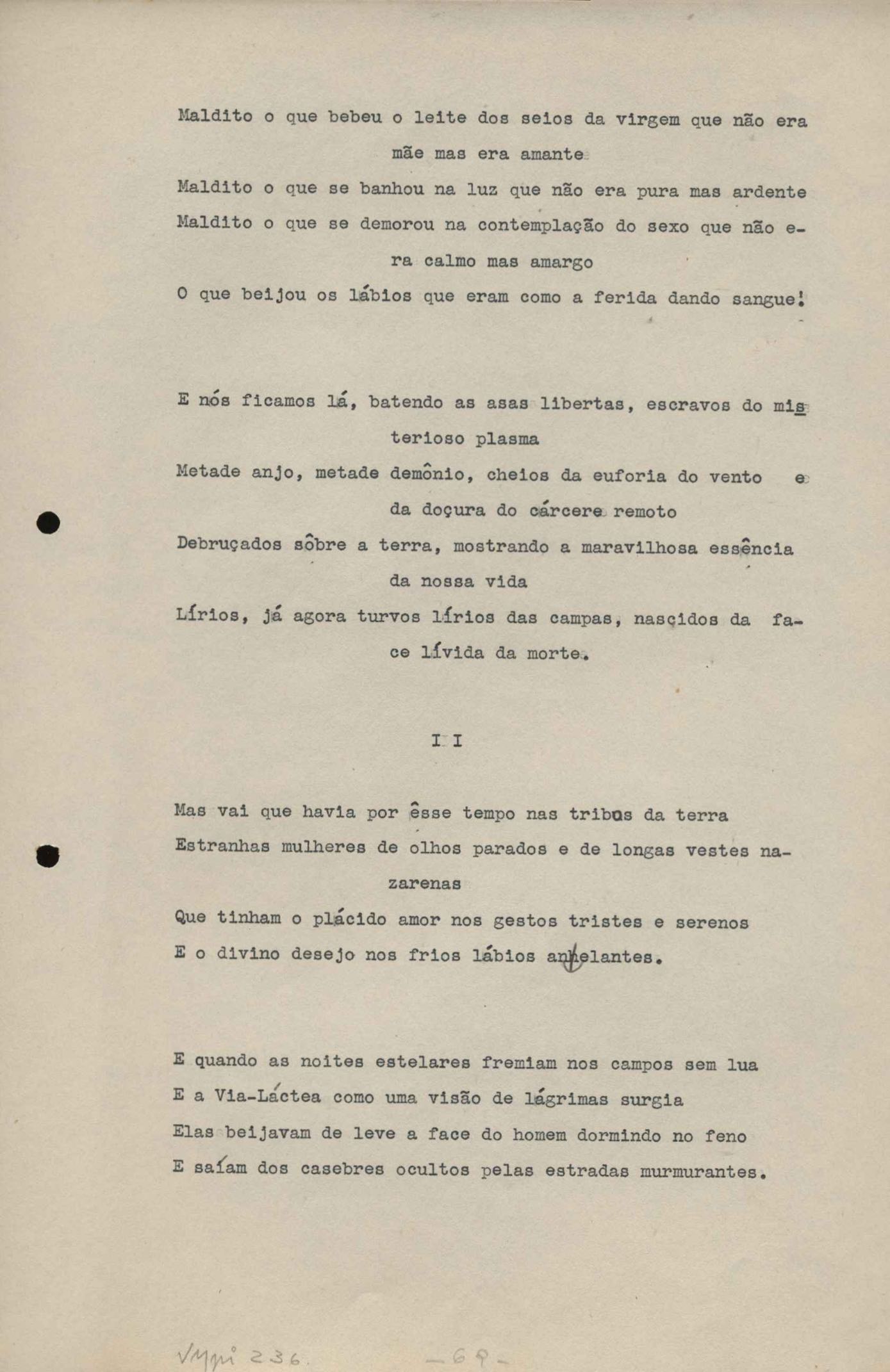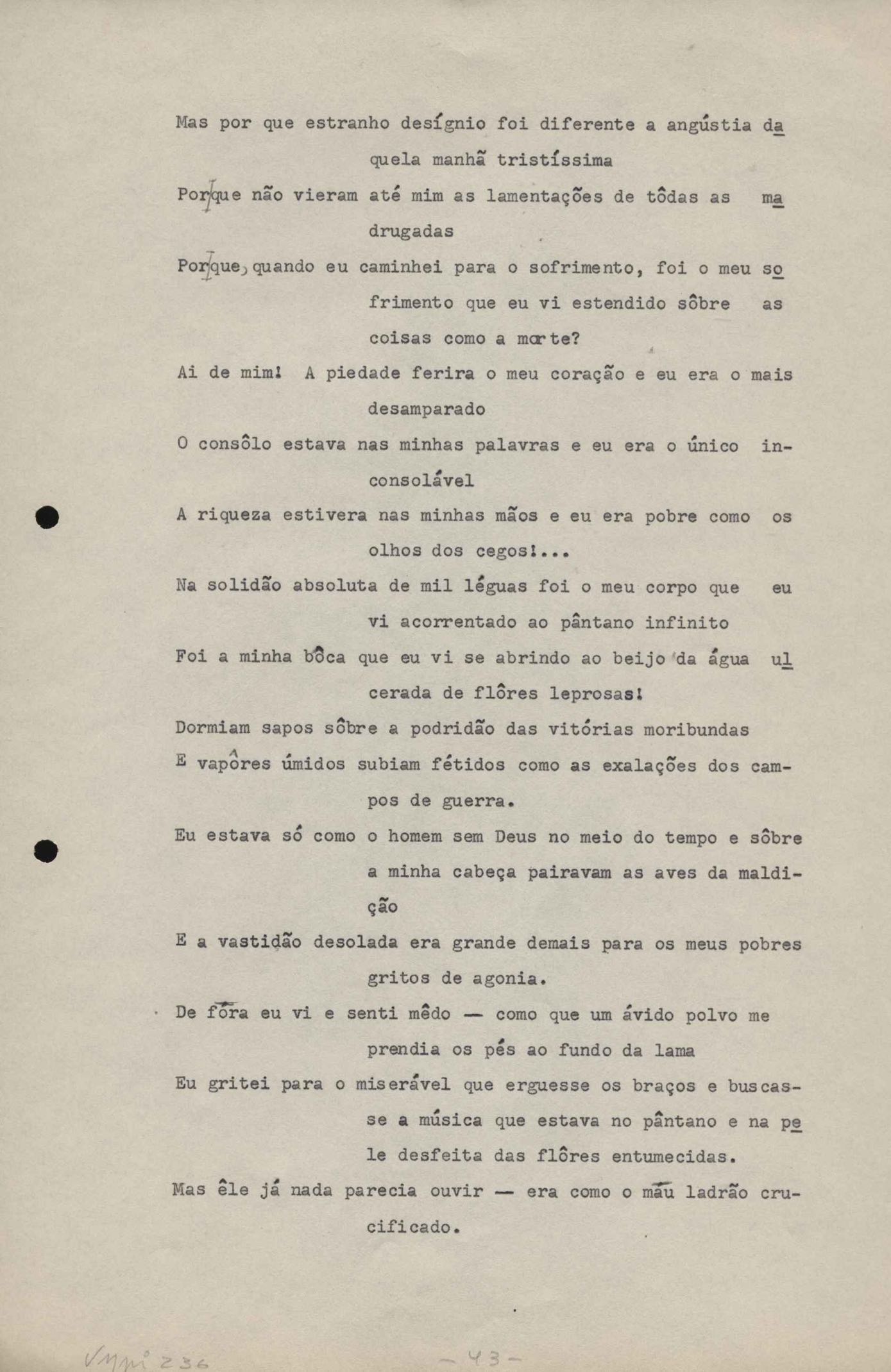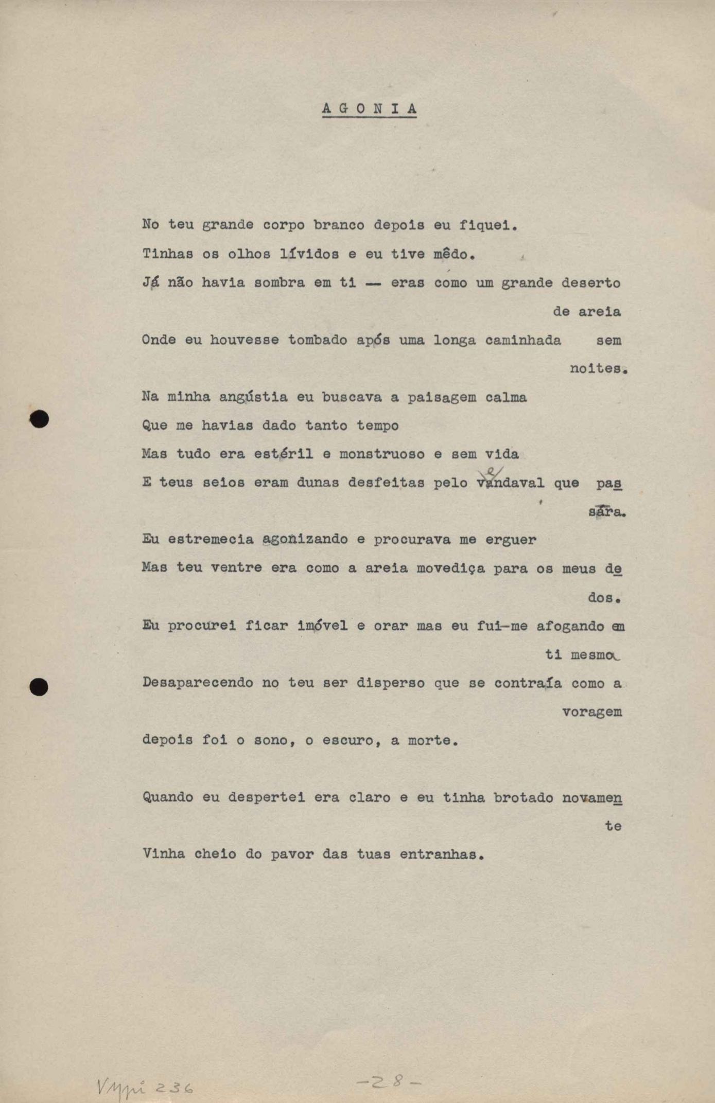 Poemas (27). "Agonia", "Alba", "Ausência", "O bergantim da aurora", "O bom ladrão", "O cadafalso", "A criação da poesia", "O escravo", "Ilha do Governador", "A impossível partida", "O incriado", "A legião dos úrias", "A lenda da maldição", "Os malditos (a aparição do poeta)", "A mulher na noite", "Uma mulher no meio do mar", "A música das almas", "O nascimento do homem", "O olhar para trás", "O outro", "O prisioneiro", "A queda", "Sursum", "Três respostas em face de Deus", "A última parábola", "Variações sobre o tema da essência" e "A volta da mulher morena". Anexo: 1. Datiloscrito que serviu de base à primeira edição; 2. Outras versões manuscritas e datilografadas de: "Agonia", "O bergantim da aurora", "O bom ladrão", "A criação da poesia", "O escravo", "Ilha do Governador", "A impossível partida", "O incriado", "Os malditos (a aparição do poeta)", "A mulher na noite", "Uma mulher no meio do mar", "A música das almas", "O nascimento do homem", "A queda", "Três respostas em face de deus", "A última parábola", "Variações sobre o tema da essência" e "A volta da mulher morena".