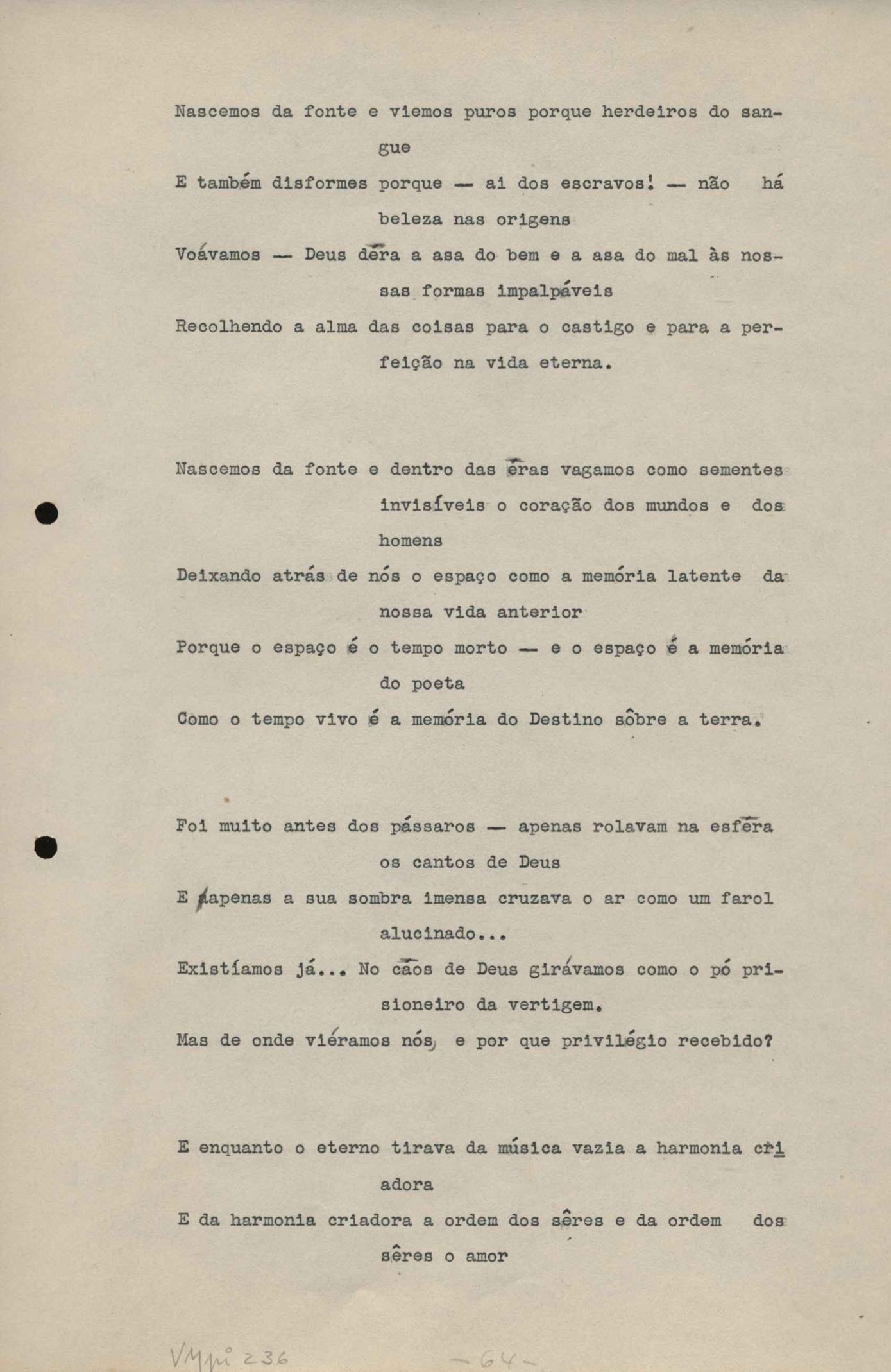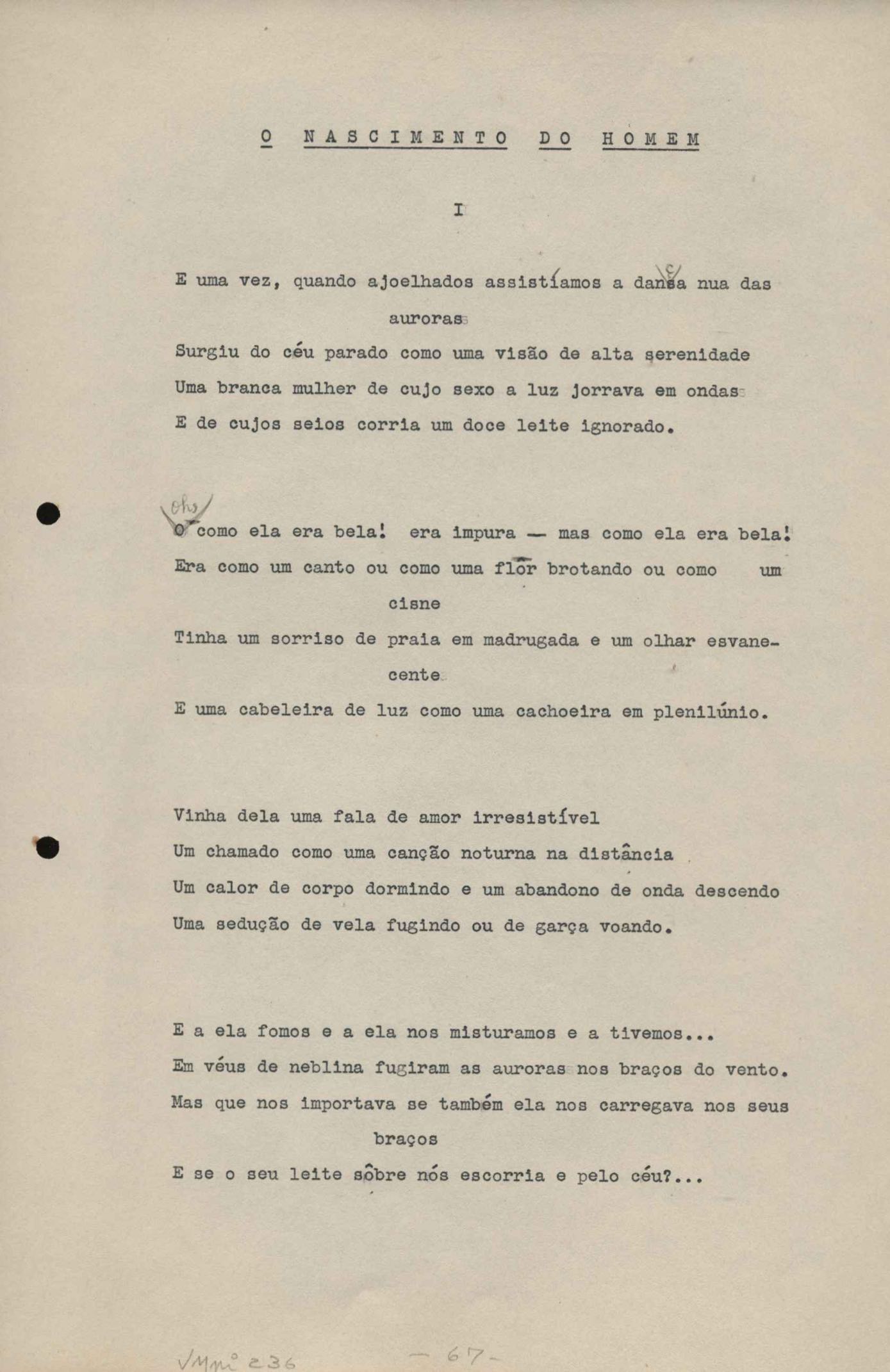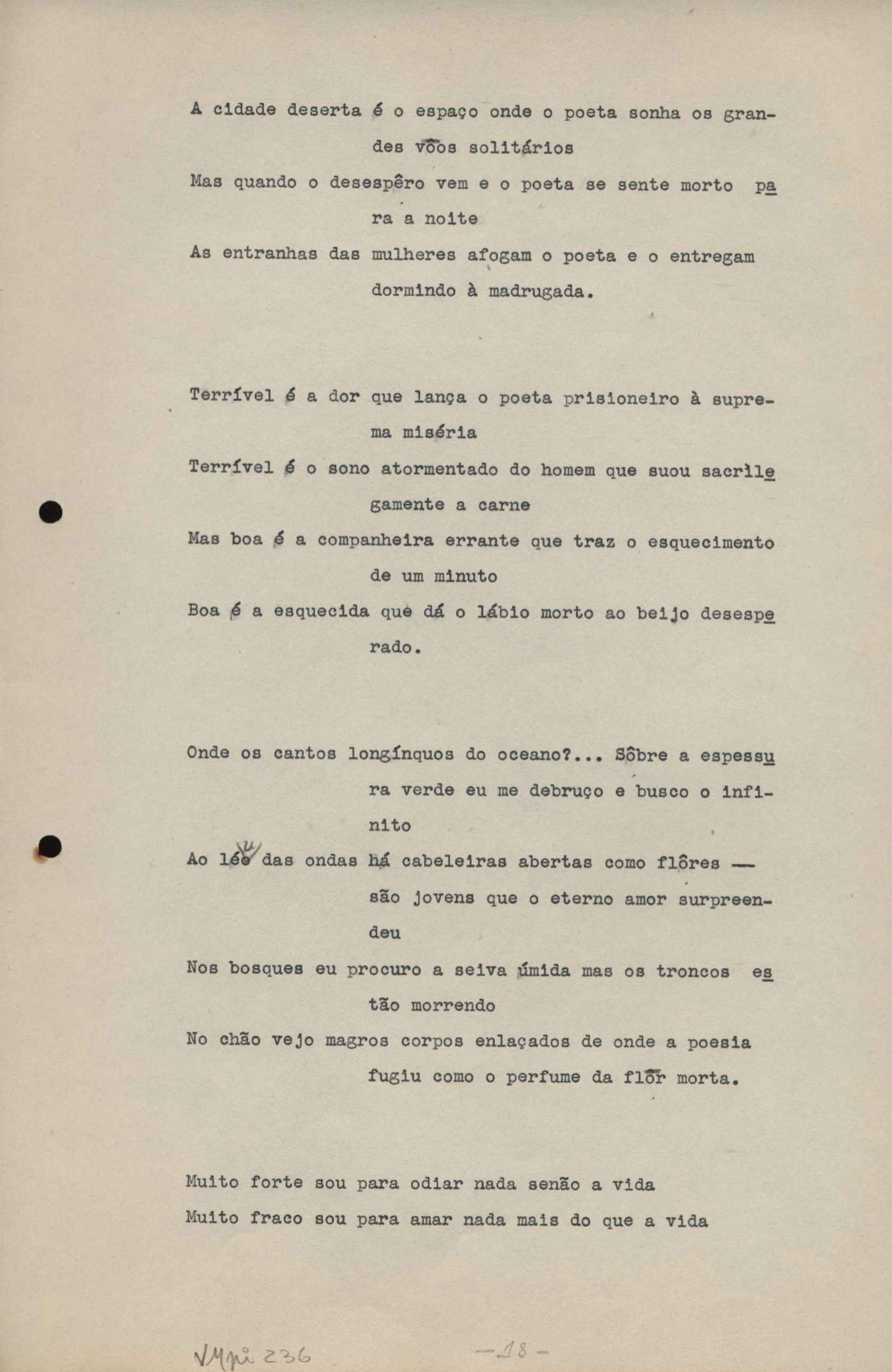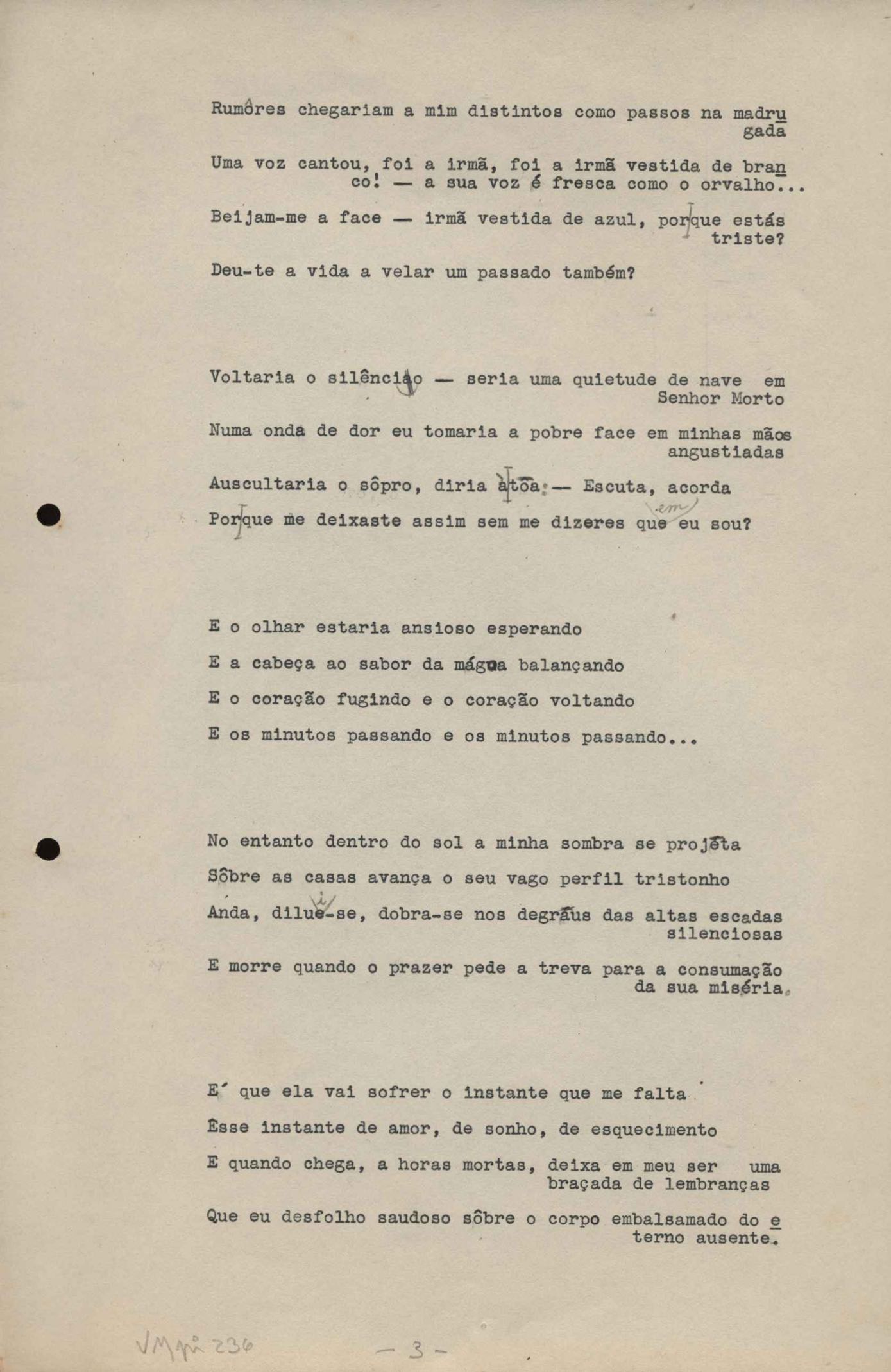 Poemas (27). "Agonia", "Alba", "Ausência", "O bergantim da aurora", "O bom ladrão", "O cadafalso", "A criação da poesia", "O escravo", "Ilha do Governador", "A impossível partida", "O incriado", "A legião dos úrias", "A lenda da maldição", "Os malditos (a aparição do poeta)", "A mulher na noite", "Uma mulher no meio do mar", "A música das almas", "O nascimento do homem", "O olhar para trás", "O outro", "O prisioneiro", "A queda", "Sursum", "Três respostas em face de Deus", "A última parábola", "Variações sobre o tema da essência" e "A volta da mulher morena". Anexo: 1. Datiloscrito que serviu de base à primeira edição; 2. Outras versões manuscritas e datilografadas de: "Agonia", "O bergantim da aurora", "O bom ladrão", "A criação da poesia", "O escravo", "Ilha do Governador", "A impossível partida", "O incriado", "Os malditos (a aparição do poeta)", "A mulher na noite", "Uma mulher no meio do mar", "A música das almas", "O nascimento do homem", "A queda", "Três respostas em face de deus", "A última parábola", "Variações sobre o tema da essência" e "A volta da mulher morena".