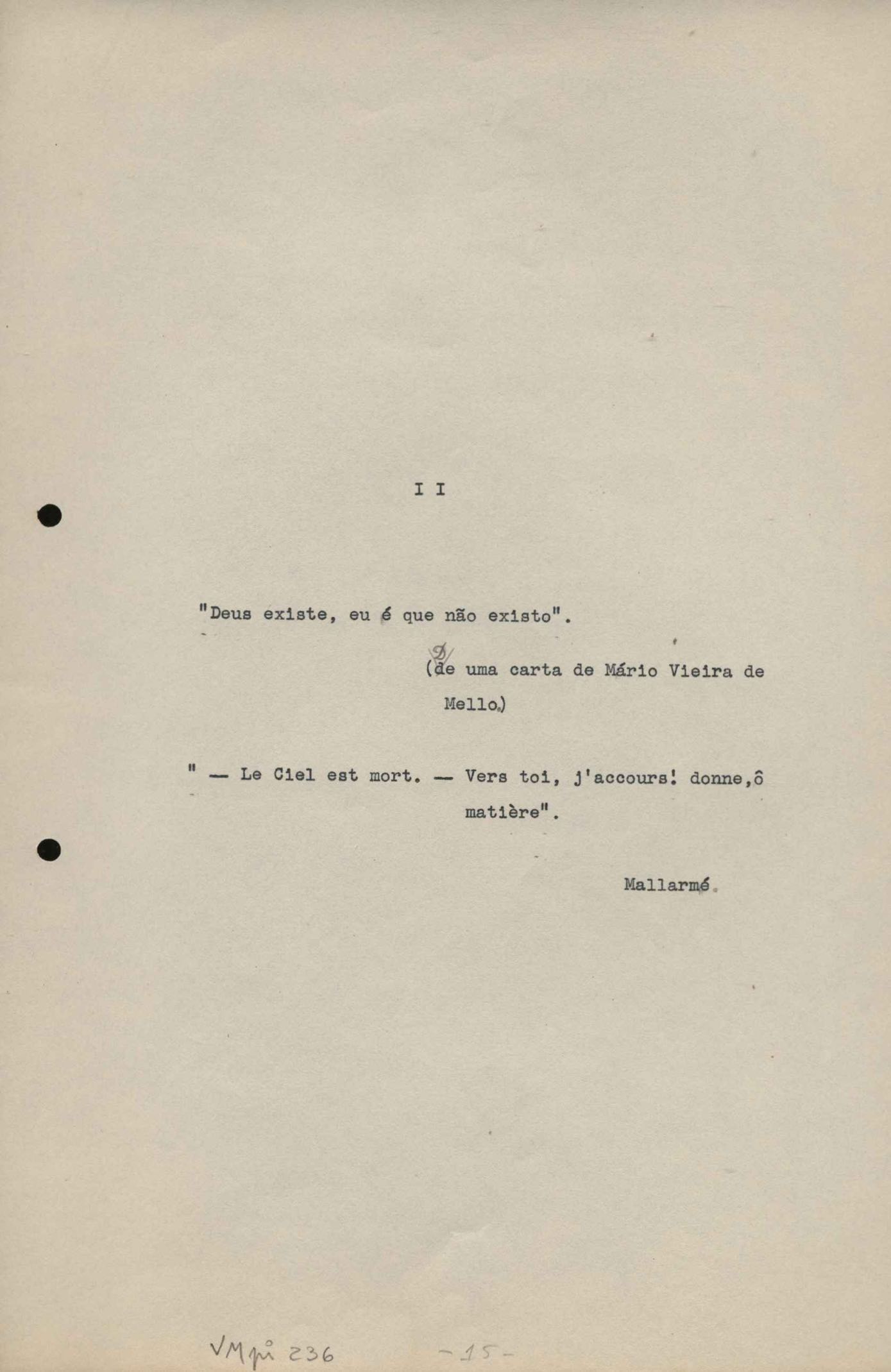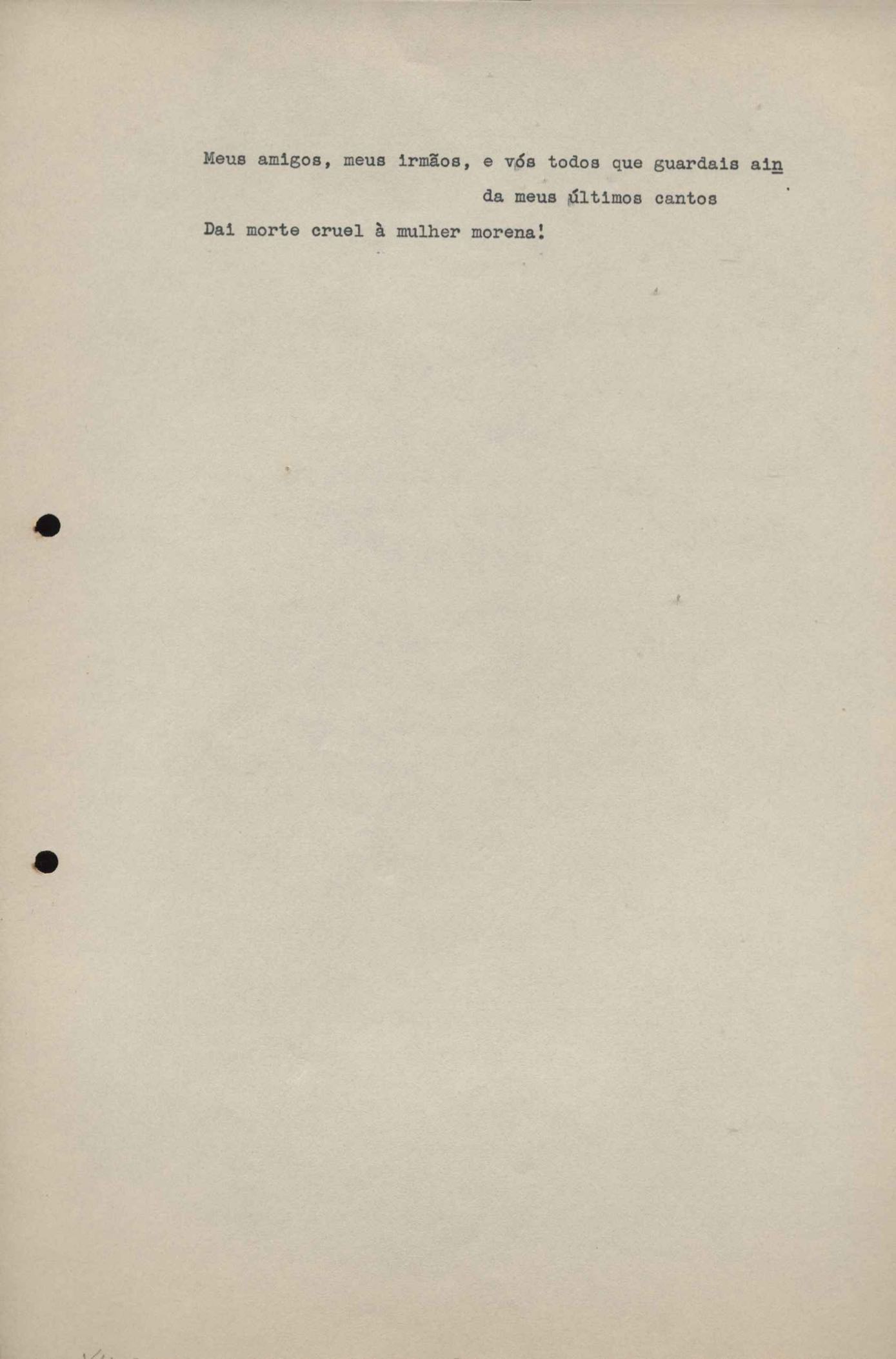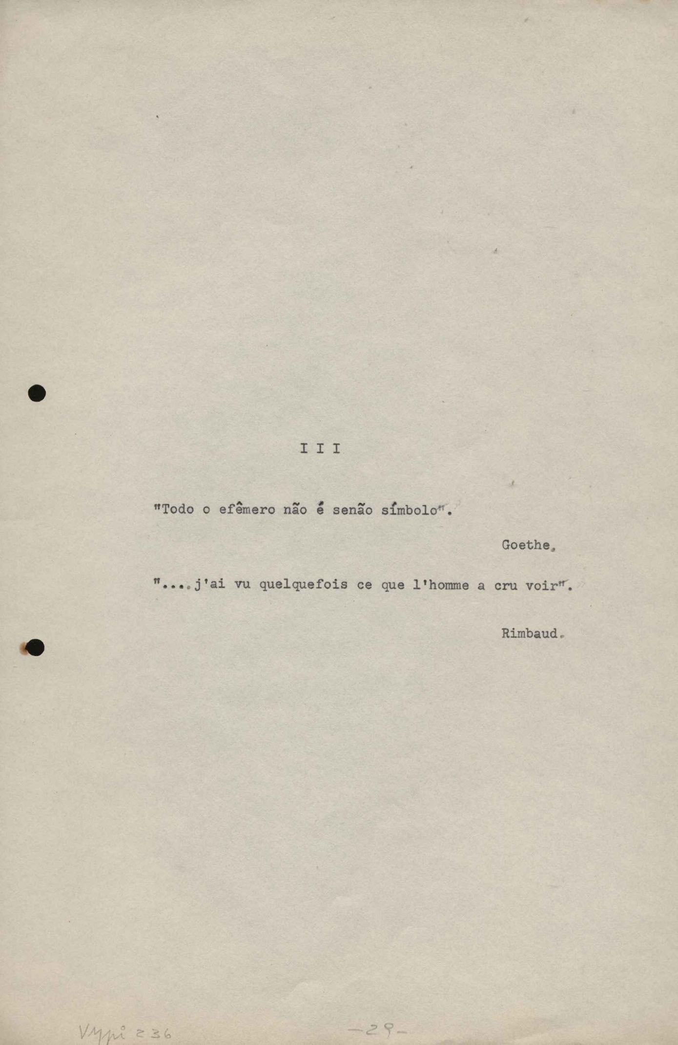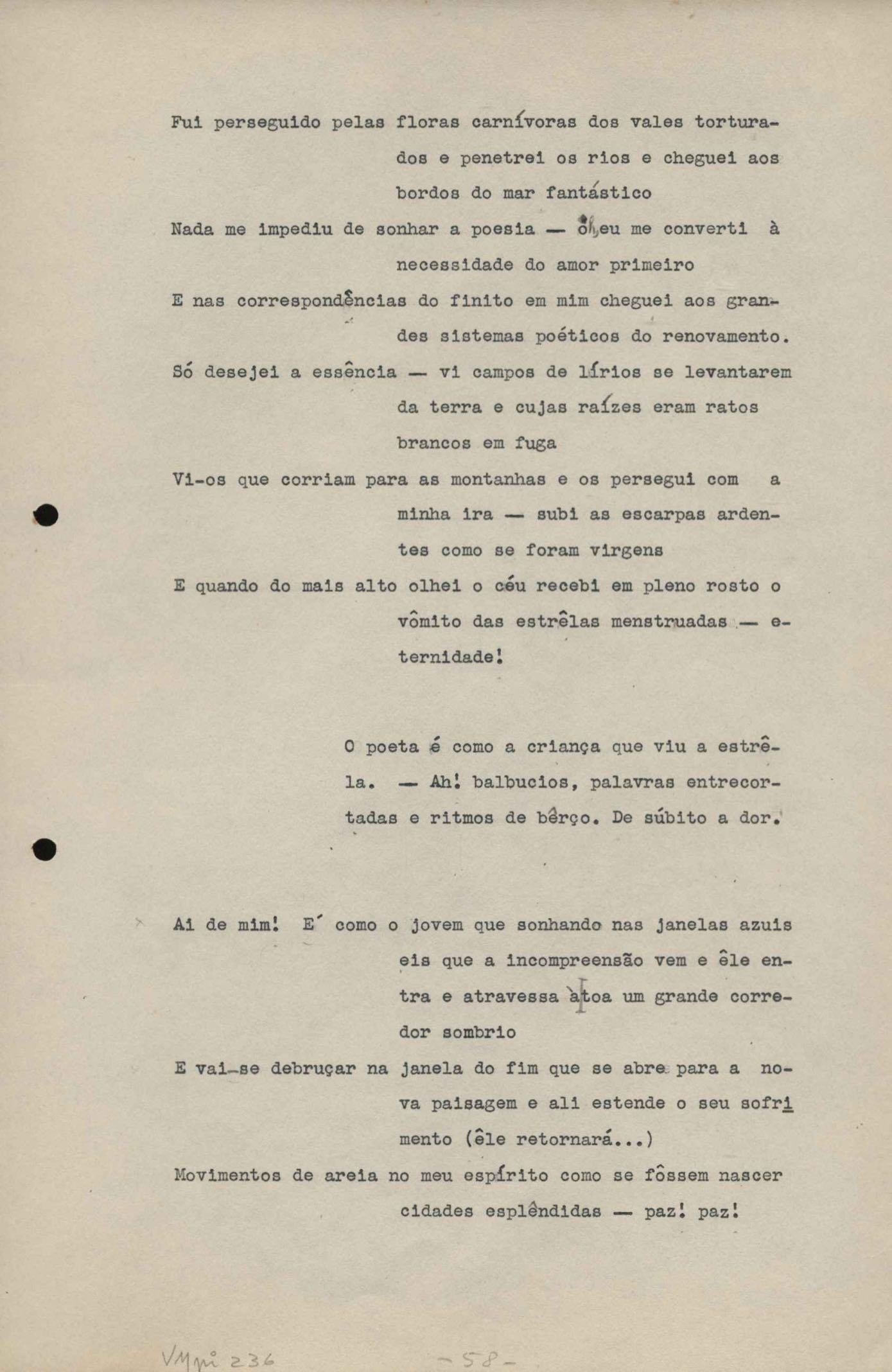Poemas (27). "Agonia", "Alba", "Ausência", "O bergantim da aurora", "O bom ladrão", "O cadafalso", "A criação da poesia", "O escravo", "Ilha do Governador", "A impossível partida", "O incriado", "A legião dos úrias", "A lenda da maldição", "Os malditos (a aparição do poeta)", "A mulher na noite", "Uma mulher no meio do mar", "A música das almas", "O nascimento do homem", "O olhar para trás", "O outro", "O prisioneiro", "A queda", "Sursum", "Três respostas em face de Deus", "A última parábola", "Variações sobre o tema da essência" e "A volta da mulher morena". Anexo: 1. Datiloscrito que serviu de base à primeira edição; 2. Outras versões manuscritas e datilografadas de: "Agonia", "O bergantim da aurora", "O bom ladrão", "A criação da poesia", "O escravo", "Ilha do Governador", "A impossível partida", "O incriado", "Os malditos (a aparição do poeta)", "A mulher na noite", "Uma mulher no meio do mar", "A música das almas", "O nascimento do homem", "A queda", "Três respostas em face de deus", "A última parábola", "Variações sobre o tema da essência" e "A volta da mulher morena".