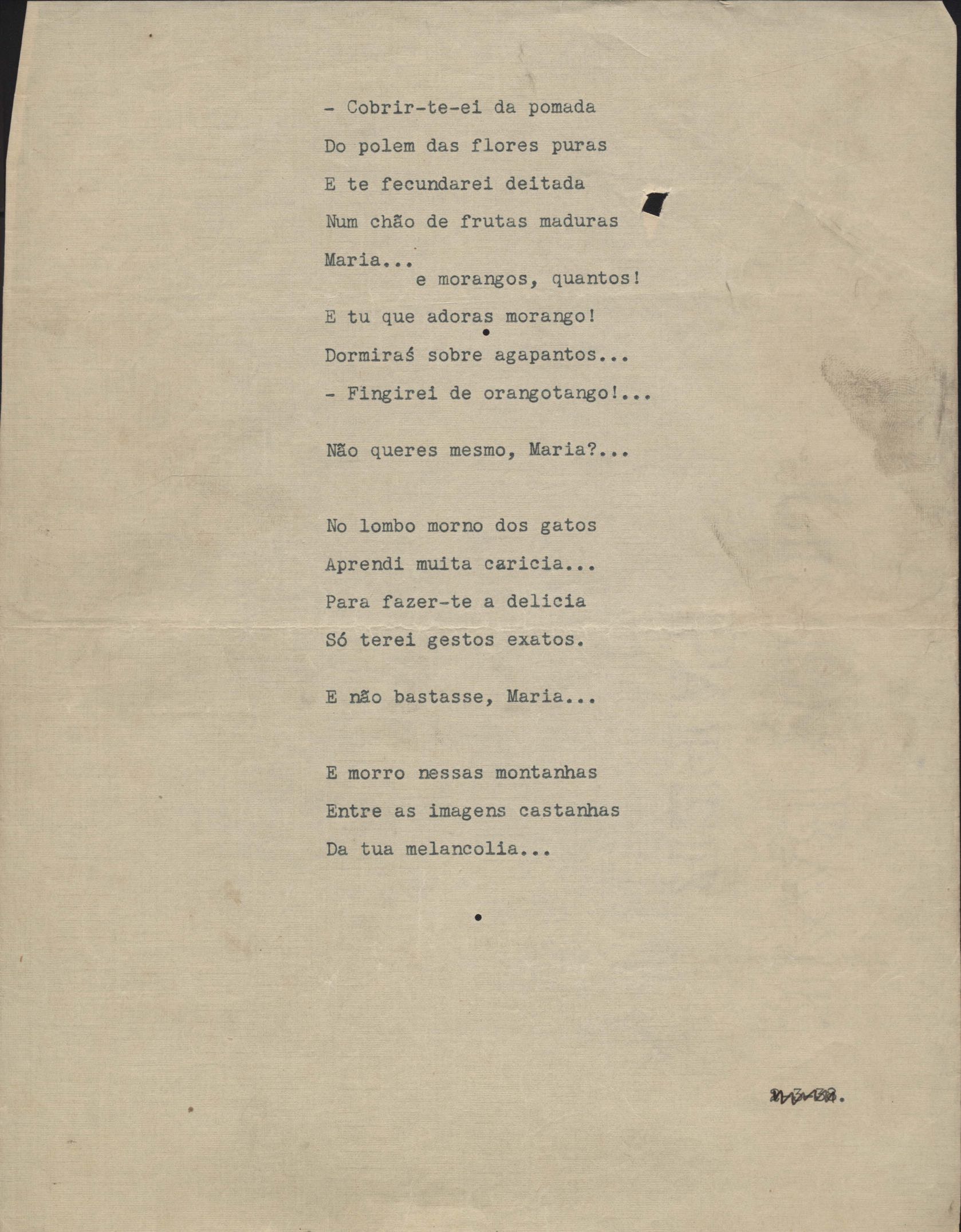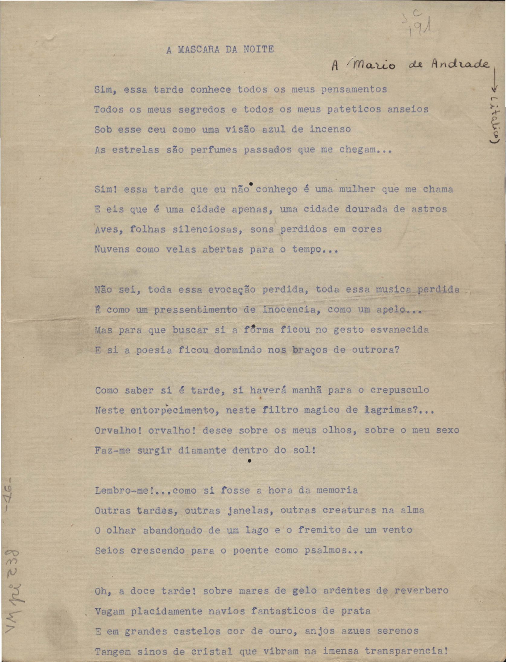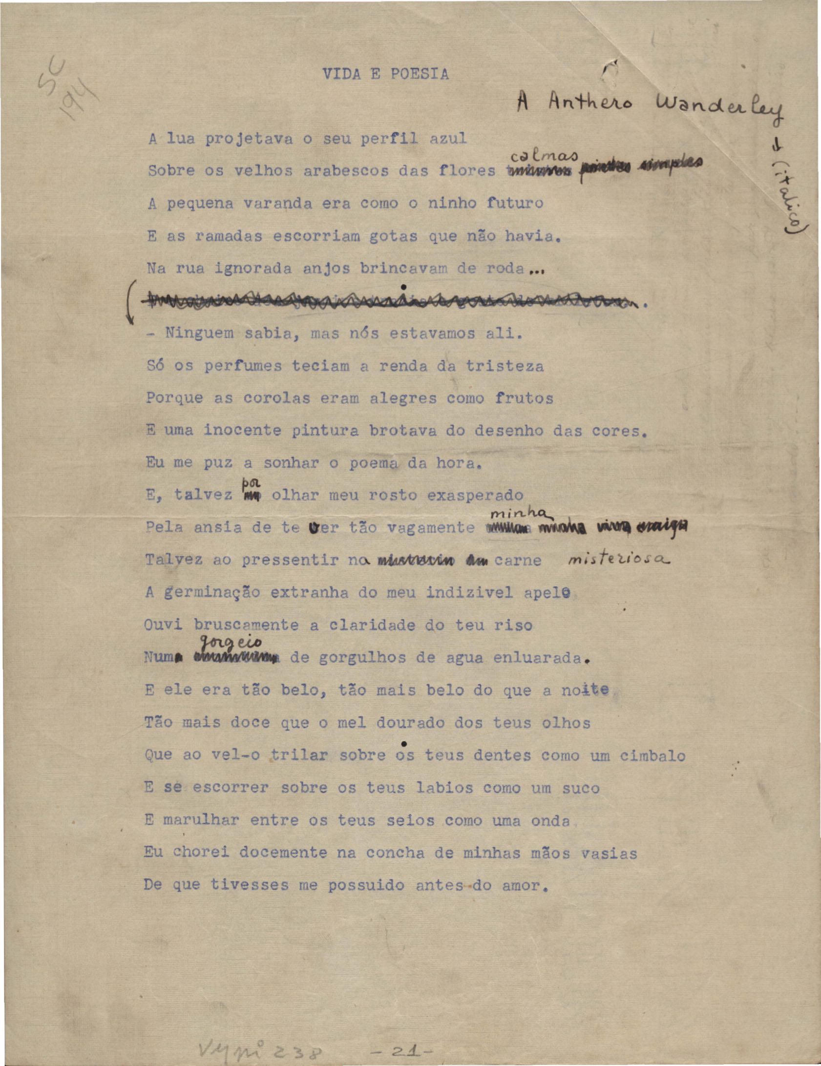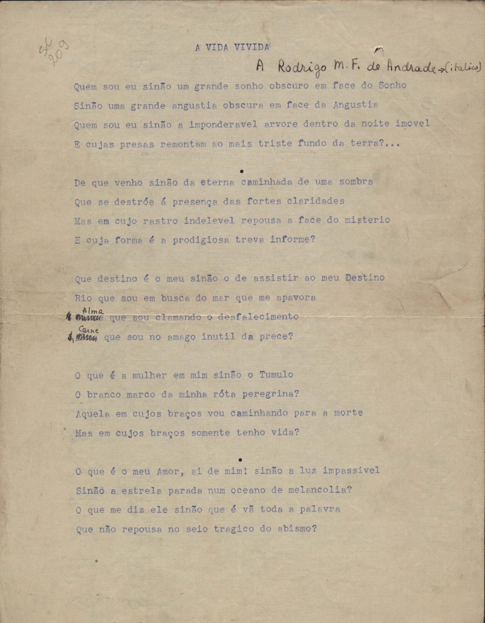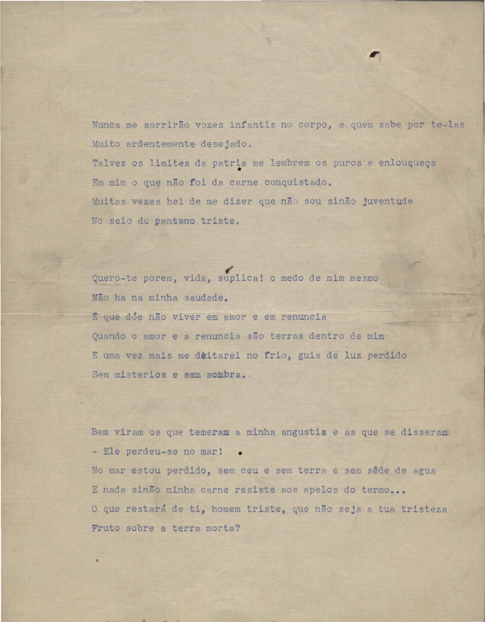 Poemas (33). "Amor nos três pavimentos", "Ária para assovio", "Balada feroz", "Balada para Maria", "A brusca poesia da mulher amada", "O cemitério na madrugada", "O falso mendigo", "Idade Média", "Invocação à mulher única", "Lamento ouvido não sei onde", "O mágico", "A máscara da noite", "A mulher que passa", "Poema para todas as mulheres", "Princípio", "Solilóquio", "Sonata do amor perdido" [Lamento nº 1, Intermédio e Lamento nº 2], "Soneto à lua", "Soneto de agosto", "Soneto de carta e mensagem", "Soneto de contrição", "Soneto de devoção", "Soneto de inspiração", "Soneto de intimidade", "Soneto de Katherine Mansfield", "Soneto simples", "Ternura", "Três retratos", [Jóia, Maja Raquel e Milady], "Viagem à sombra", "Vida e poesia" e "A vida vivida". Anexo: 1. Prova tipográfica [da primeira edição]; 2. Outras versões manuscritas e datilografadas, com emendas, faltando os poemas "O mágico" e "Soneto à lua".