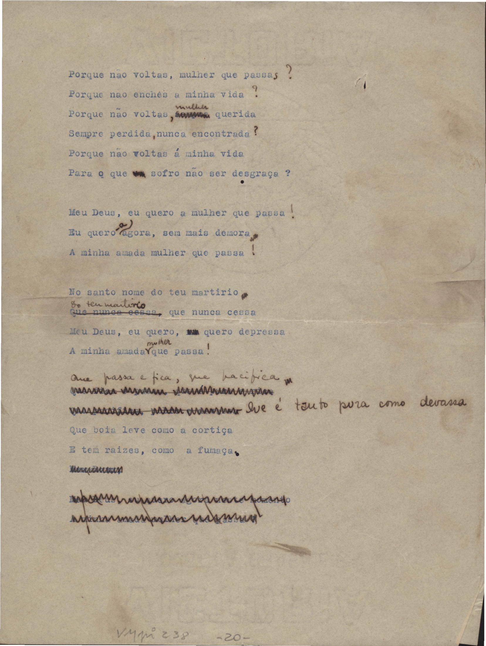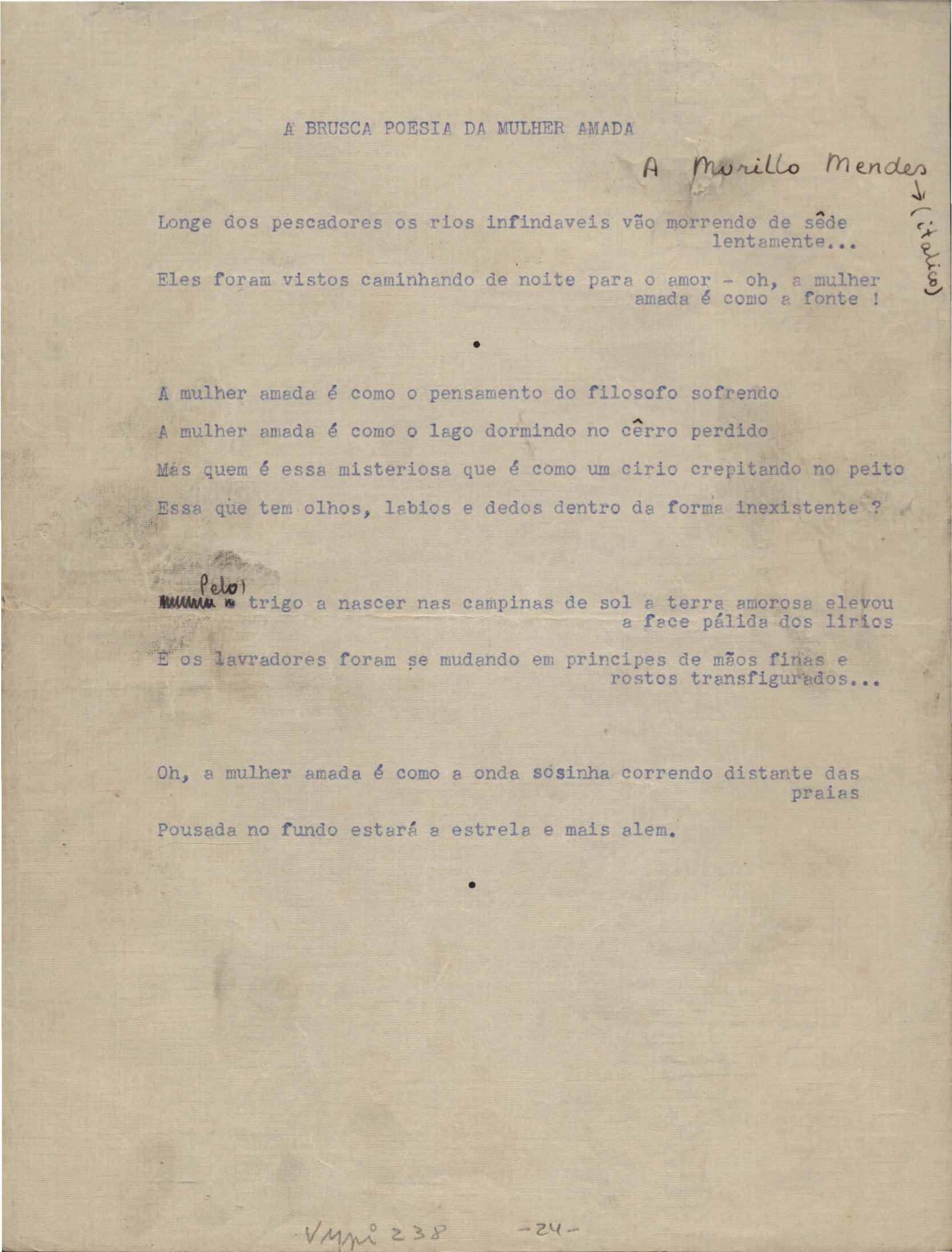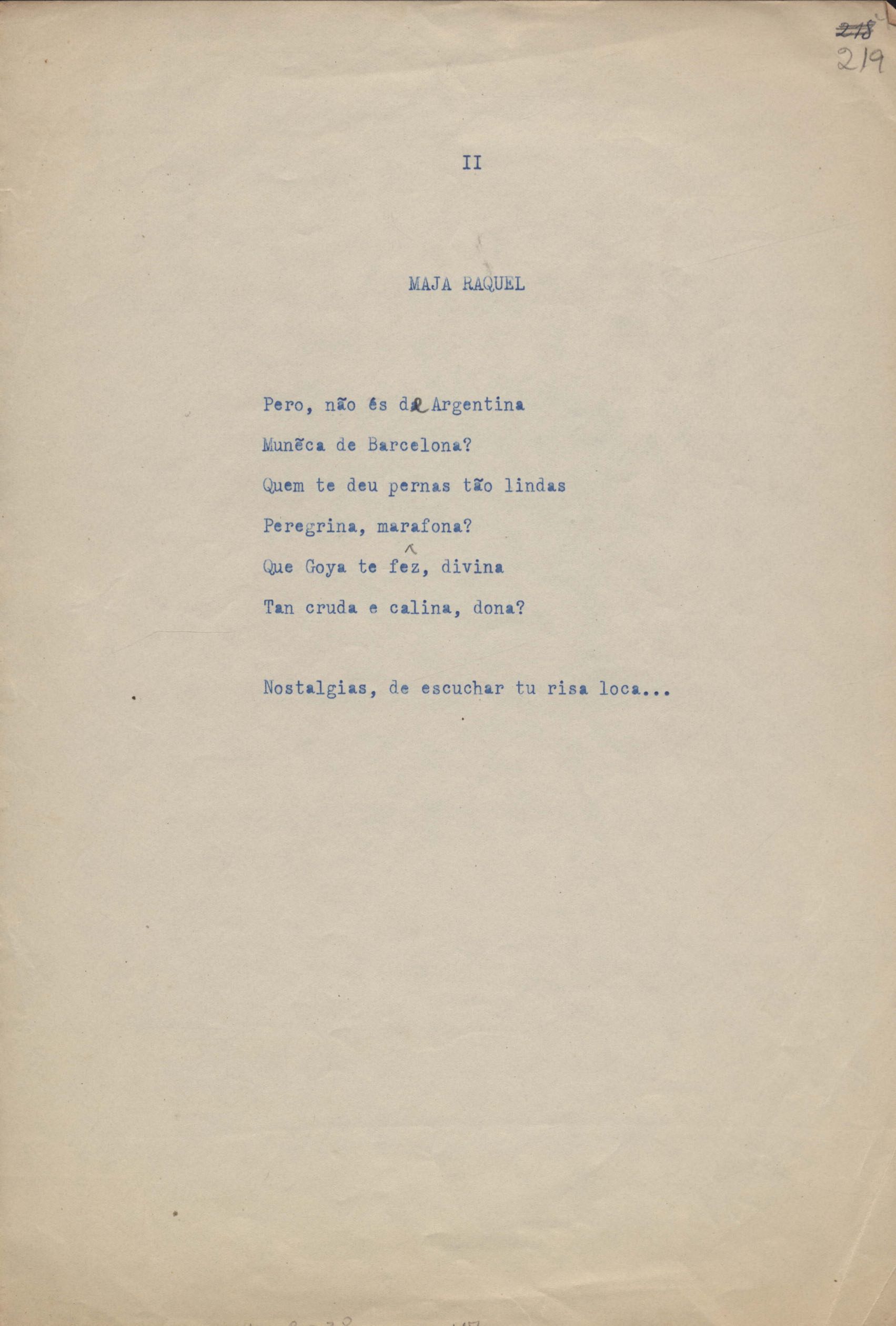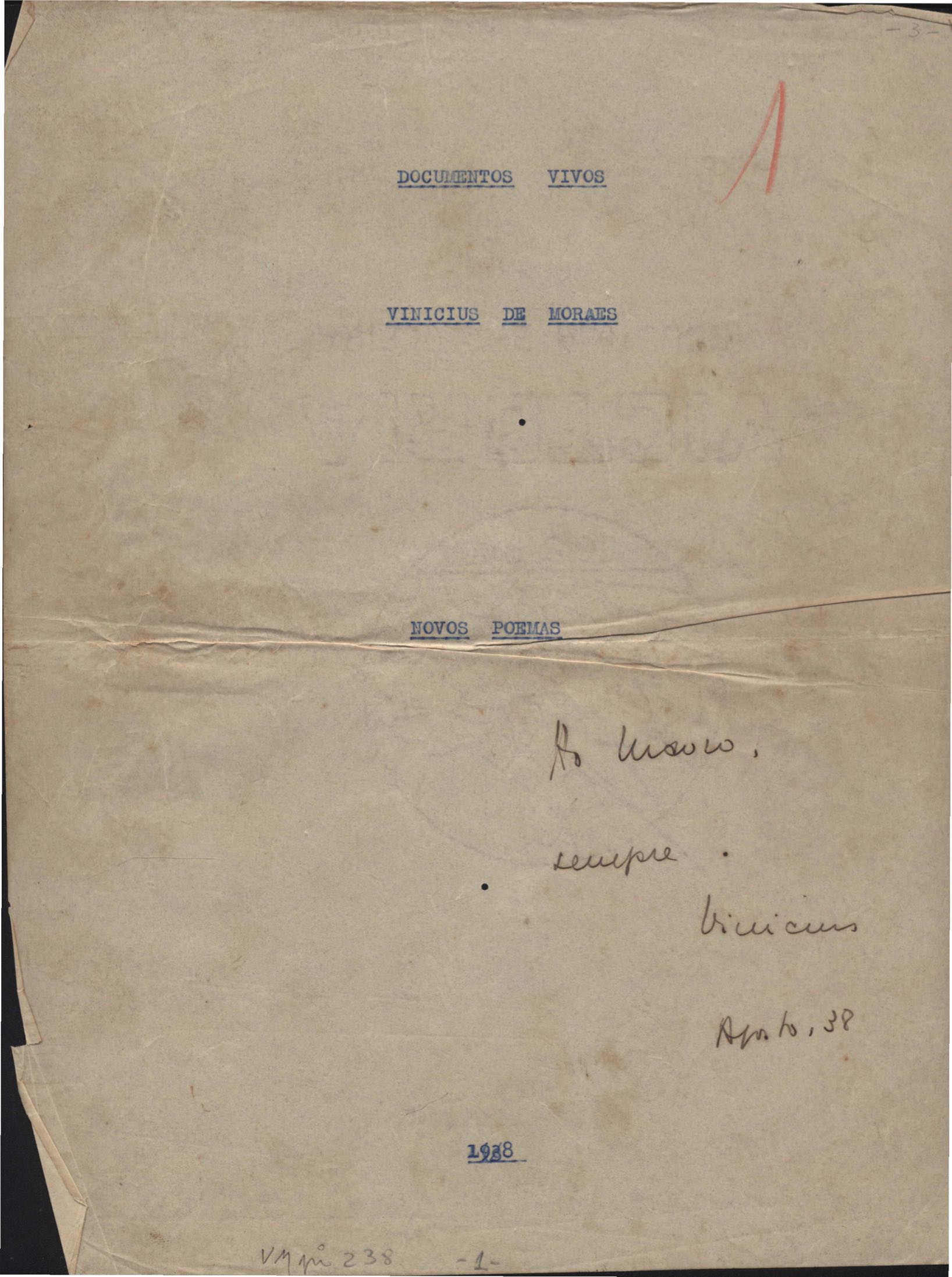 Poemas (33). "Amor nos três pavimentos", "Ária para assovio", "Balada feroz", "Balada para Maria", "A brusca poesia da mulher amada", "O cemitério na madrugada", "O falso mendigo", "Idade Média", "Invocação à mulher única", "Lamento ouvido não sei onde", "O mágico", "A máscara da noite", "A mulher que passa", "Poema para todas as mulheres", "Princípio", "Solilóquio", "Sonata do amor perdido" [Lamento nº 1, Intermédio e Lamento nº 2], "Soneto à lua", "Soneto de agosto", "Soneto de carta e mensagem", "Soneto de contrição", "Soneto de devoção", "Soneto de inspiração", "Soneto de intimidade", "Soneto de Katherine Mansfield", "Soneto simples", "Ternura", "Três retratos", [Jóia, Maja Raquel e Milady], "Viagem à sombra", "Vida e poesia" e "A vida vivida". Anexo: 1. Prova tipográfica [da primeira edição]; 2. Outras versões manuscritas e datilografadas, com emendas, faltando os poemas "O mágico" e "Soneto à lua".
