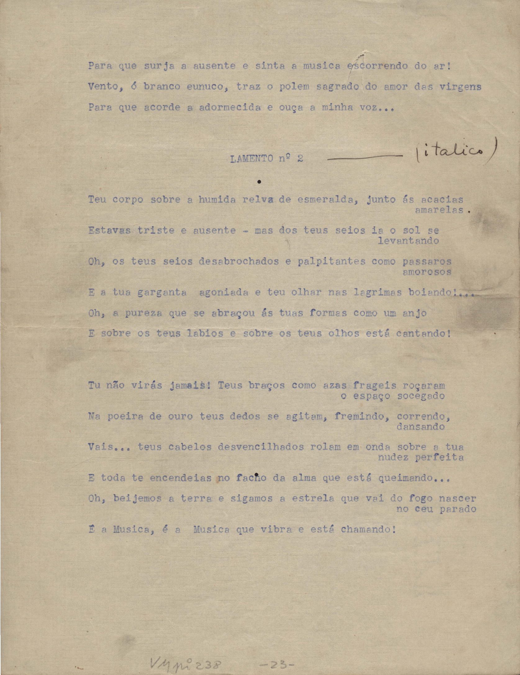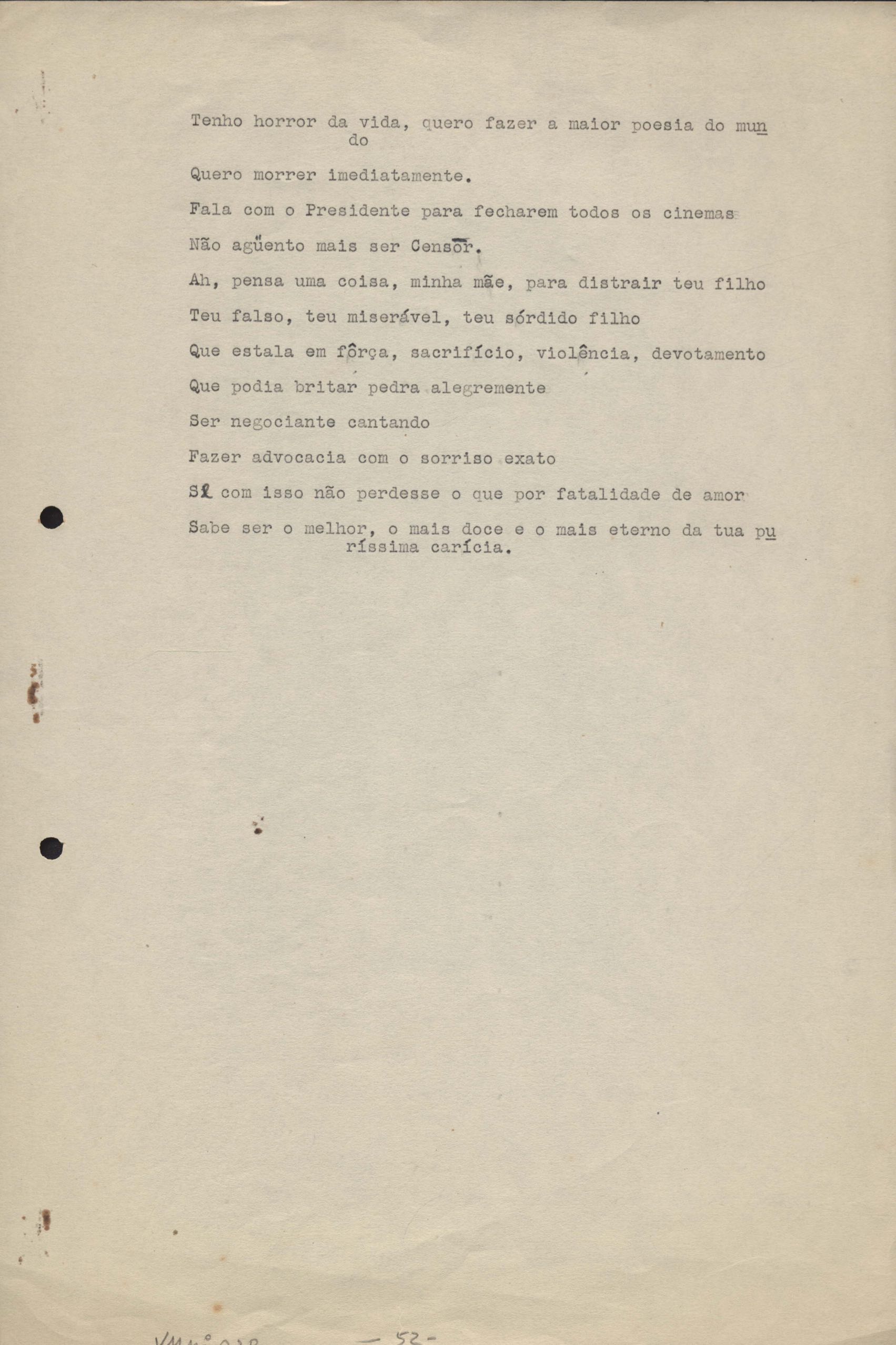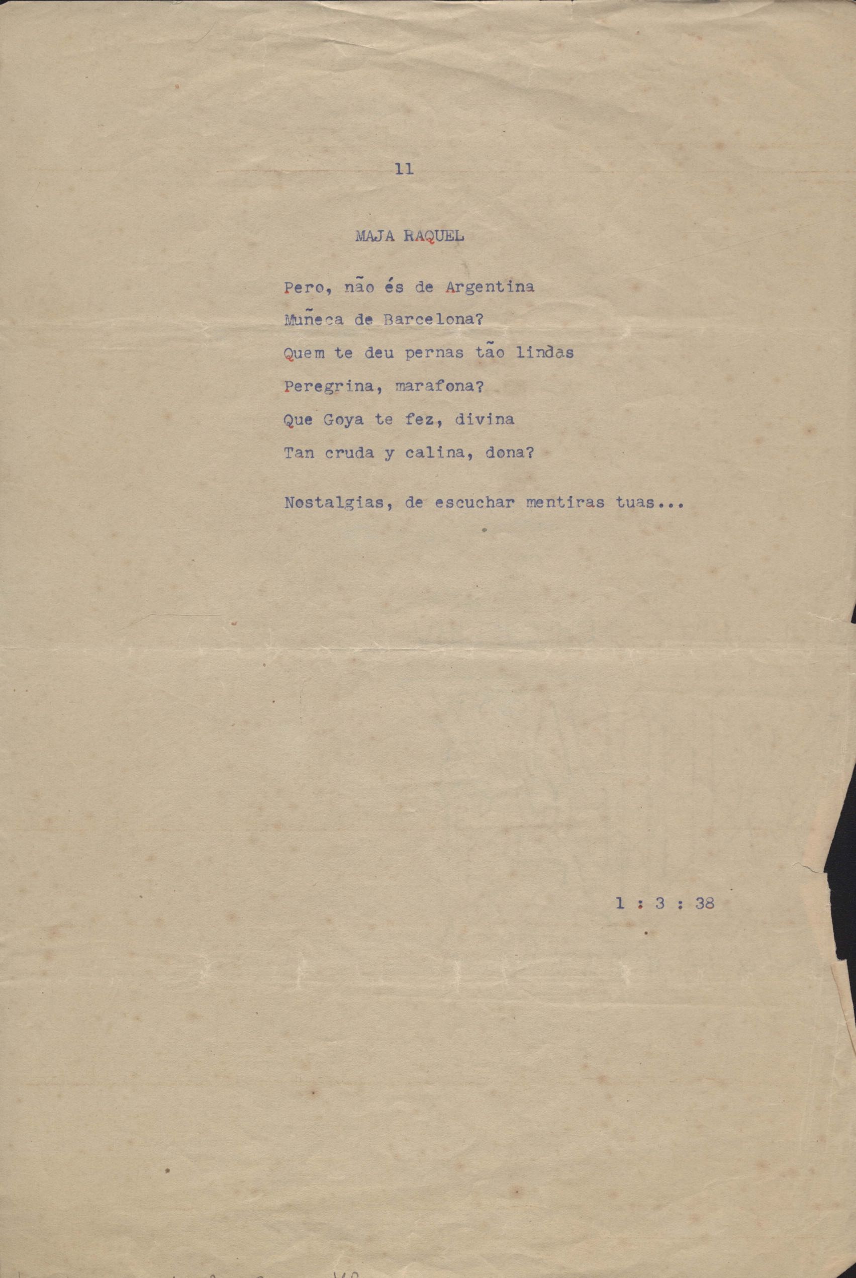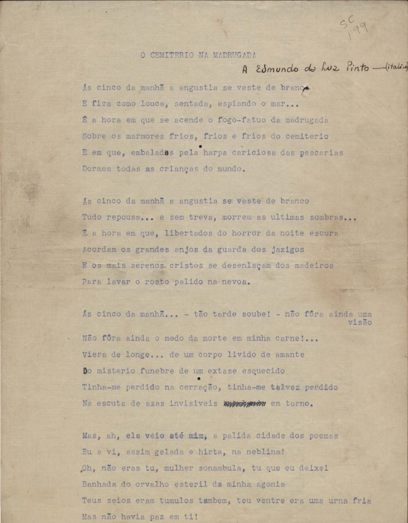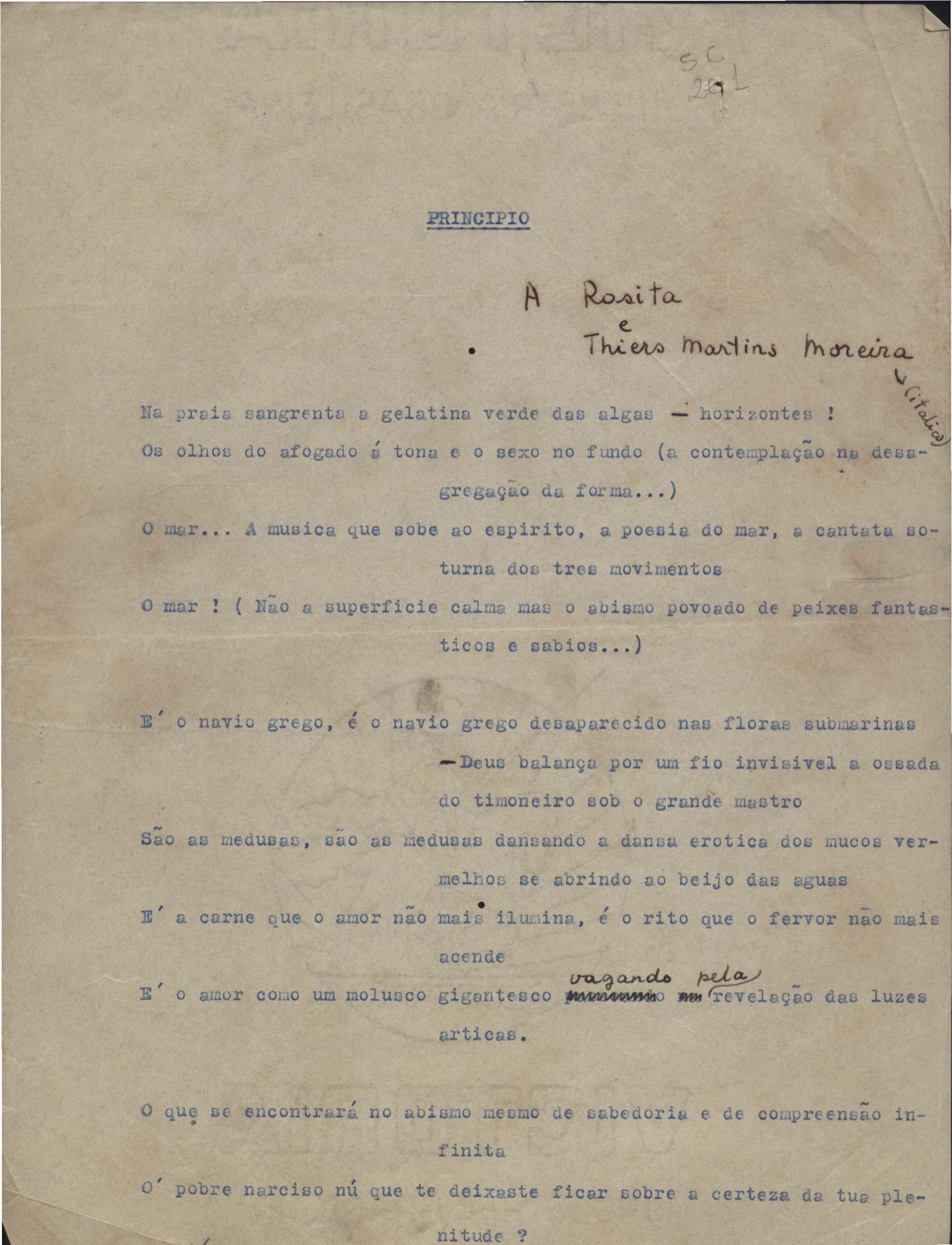 Poemas (33). "Amor nos três pavimentos", "Ária para assovio", "Balada feroz", "Balada para Maria", "A brusca poesia da mulher amada", "O cemitério na madrugada", "O falso mendigo", "Idade Média", "Invocação à mulher única", "Lamento ouvido não sei onde", "O mágico", "A máscara da noite", "A mulher que passa", "Poema para todas as mulheres", "Princípio", "Solilóquio", "Sonata do amor perdido" [Lamento nº 1, Intermédio e Lamento nº 2], "Soneto à lua", "Soneto de agosto", "Soneto de carta e mensagem", "Soneto de contrição", "Soneto de devoção", "Soneto de inspiração", "Soneto de intimidade", "Soneto de Katherine Mansfield", "Soneto simples", "Ternura", "Três retratos", [Jóia, Maja Raquel e Milady], "Viagem à sombra", "Vida e poesia" e "A vida vivida". Anexo: 1. Prova tipográfica [da primeira edição]; 2. Outras versões manuscritas e datilografadas, com emendas, faltando os poemas "O mágico" e "Soneto à lua".