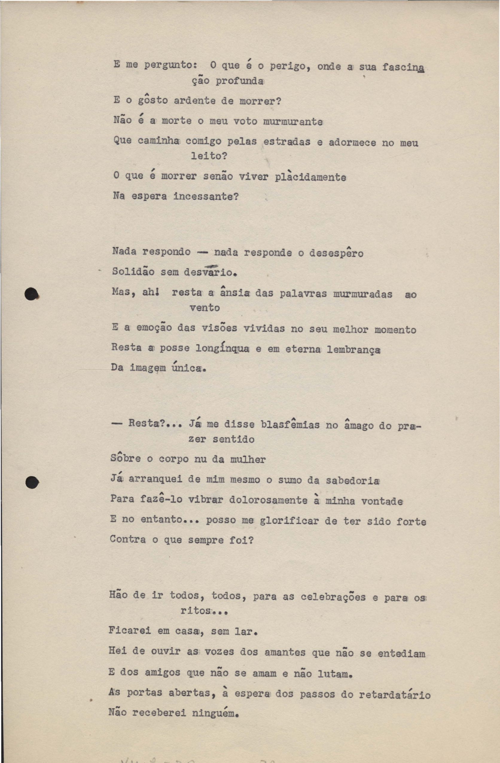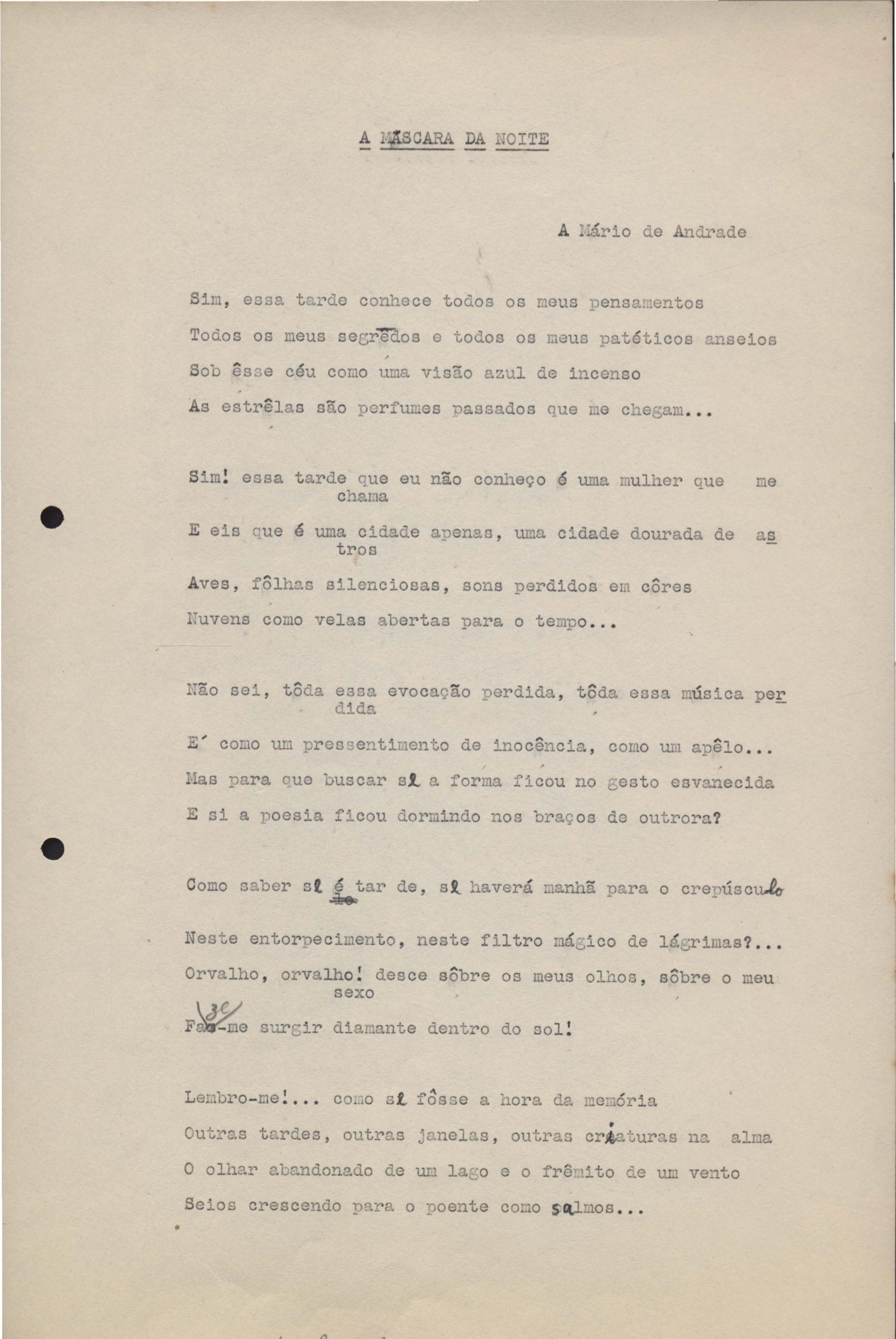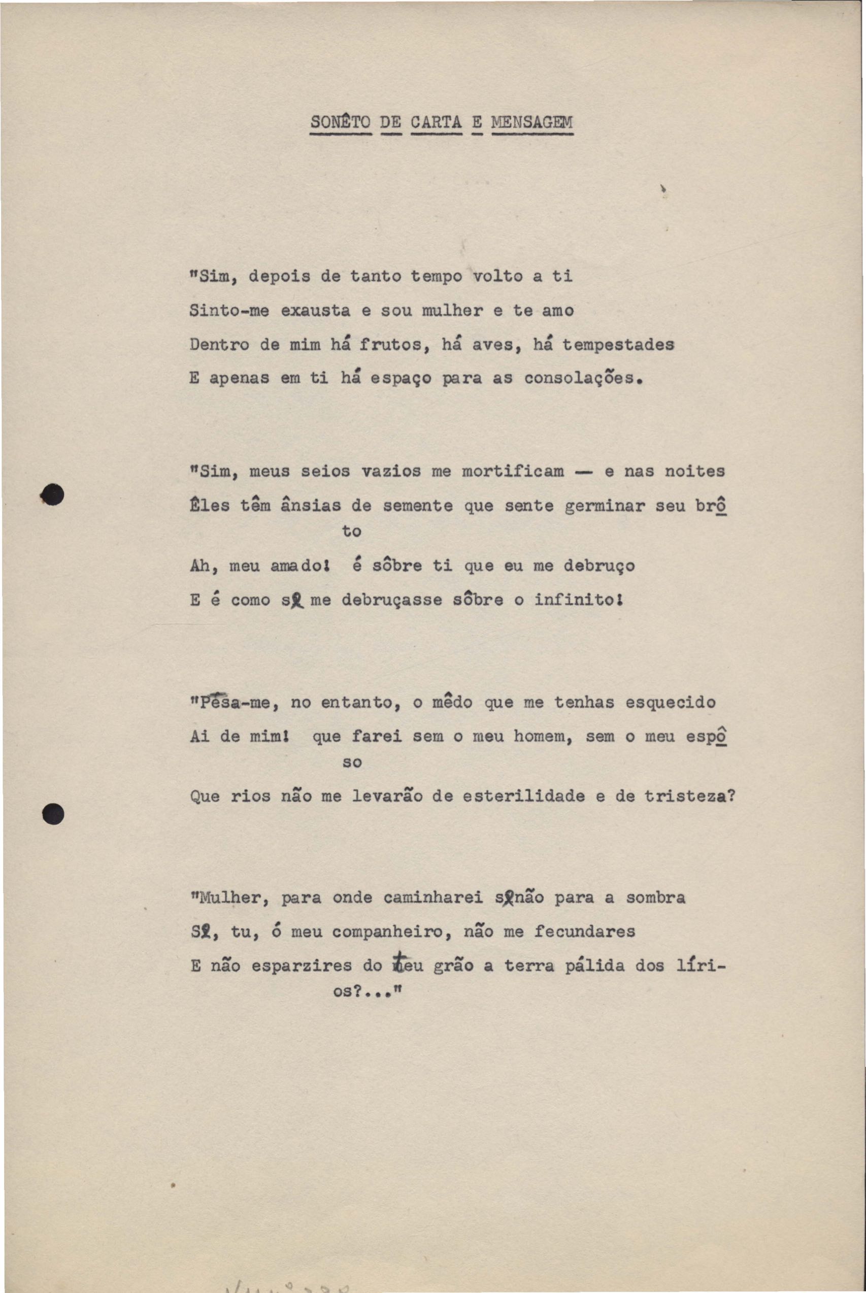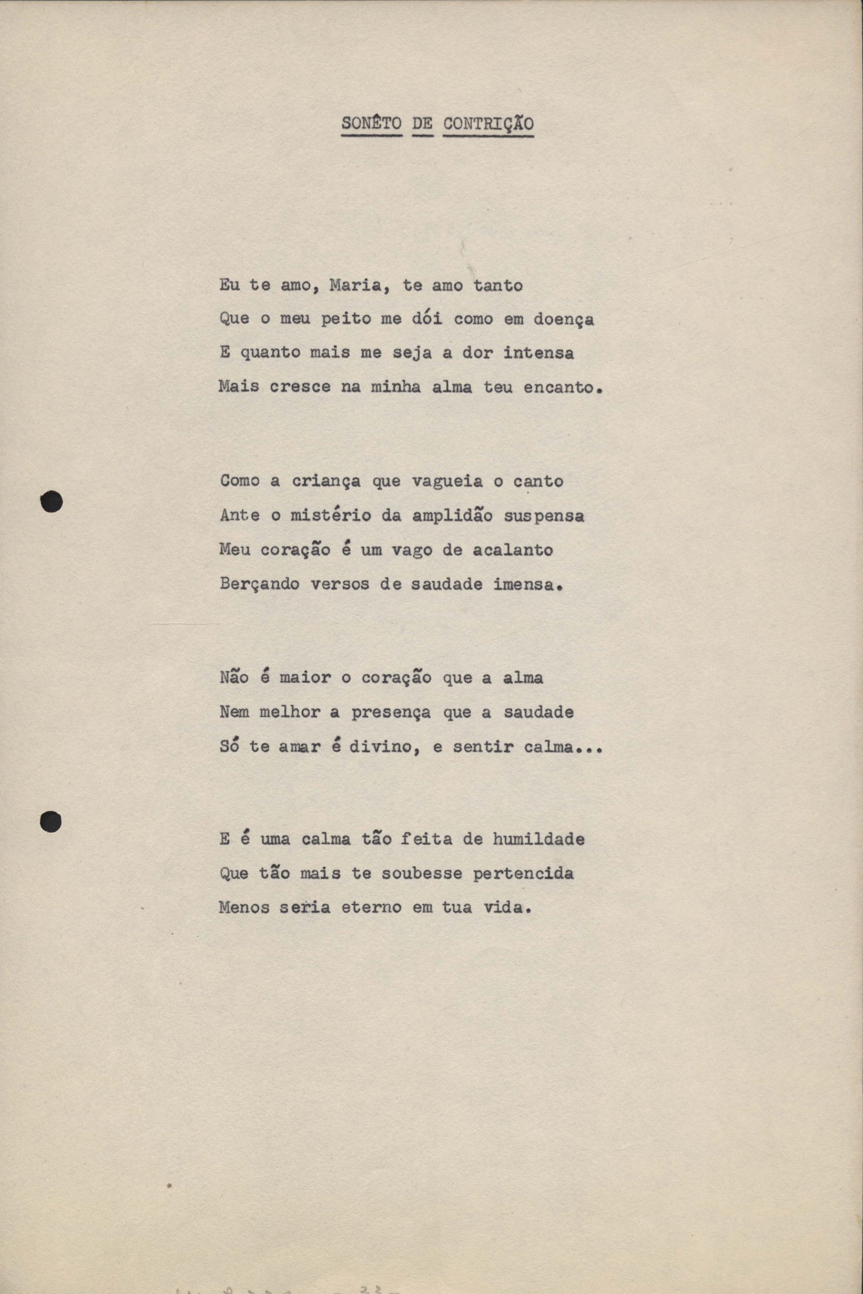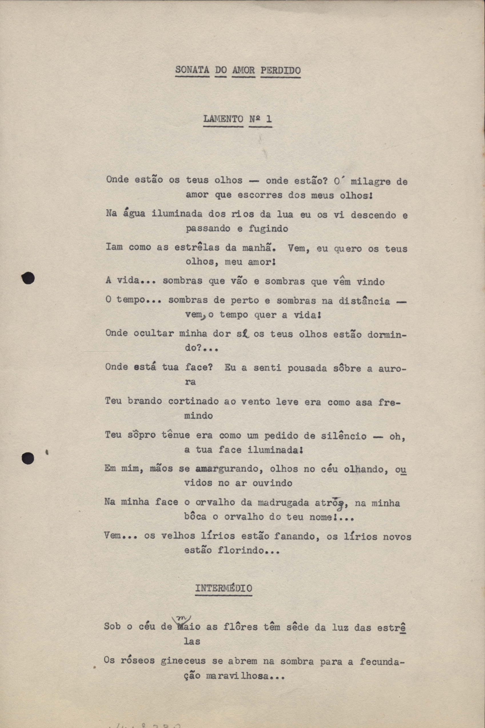 Poemas (33). "Amor nos três pavimentos", "Ária para assovio", "Balada feroz", "Balada para Maria", "A brusca poesia da mulher amada", "O cemitério na madrugada", "O falso mendigo", "Idade Média", "Invocação à mulher única", "Lamento ouvido não sei onde", "O mágico", "A máscara da noite", "A mulher que passa", "Poema para todas as mulheres", "Princípio", "Solilóquio", "Sonata do amor perdido" [Lamento nº 1, Intermédio e Lamento nº 2], "Soneto à lua", "Soneto de agosto", "Soneto de carta e mensagem", "Soneto de contrição", "Soneto de devoção", "Soneto de inspiração", "Soneto de intimidade", "Soneto de Katherine Mansfield", "Soneto simples", "Ternura", "Três retratos", [Jóia, Maja Raquel e Milady], "Viagem à sombra", "Vida e poesia" e "A vida vivida". Anexo: 1. Prova tipográfica [da primeira edição]; 2. Outras versões manuscritas e datilografadas, com emendas, faltando os poemas "O mágico" e "Soneto à lua".
