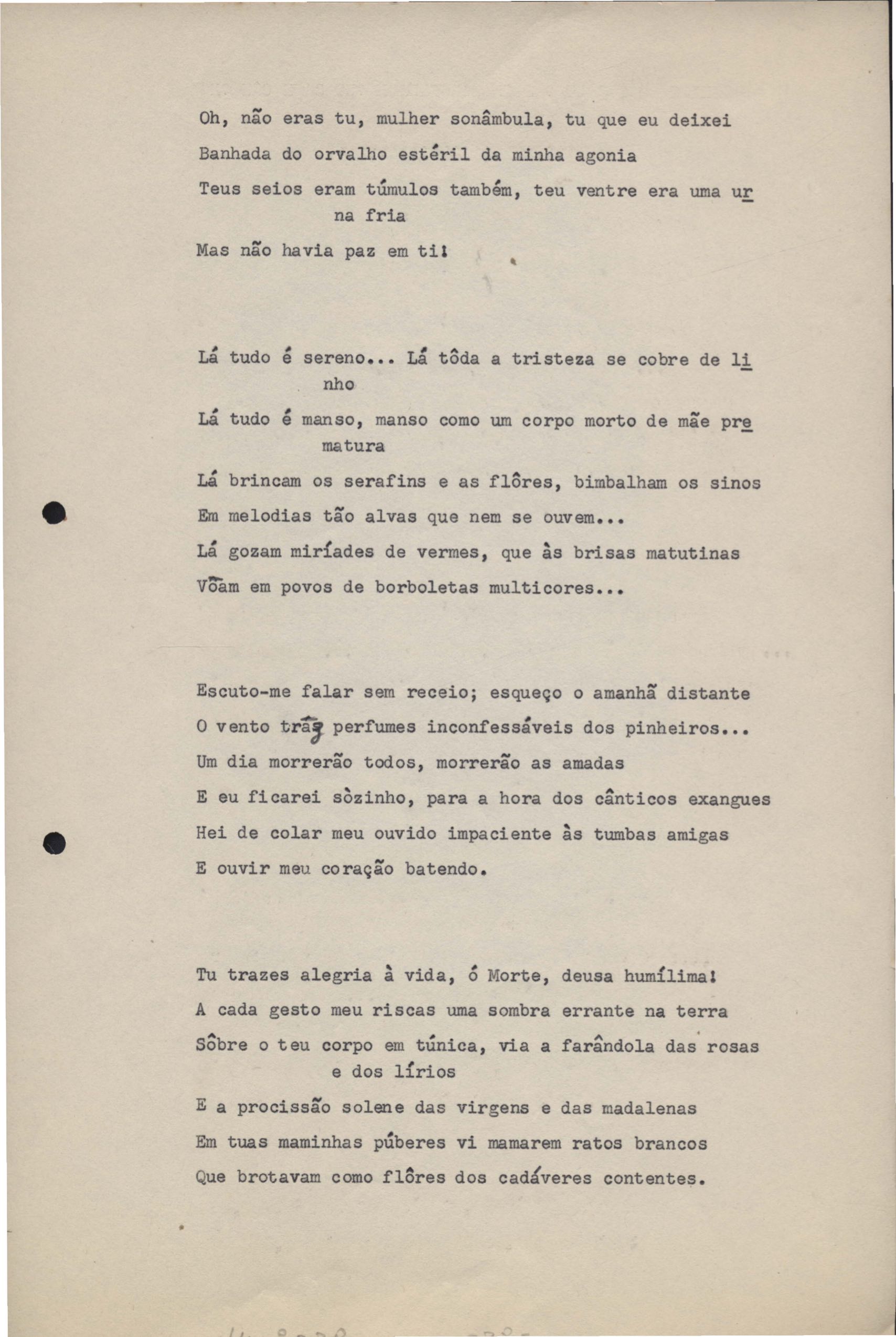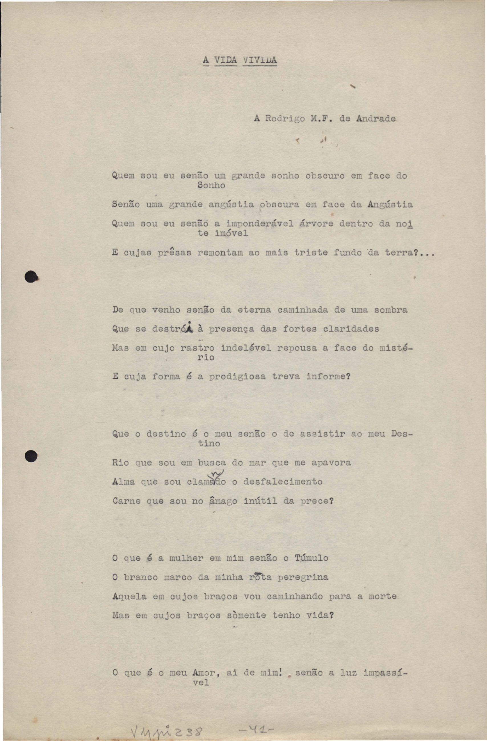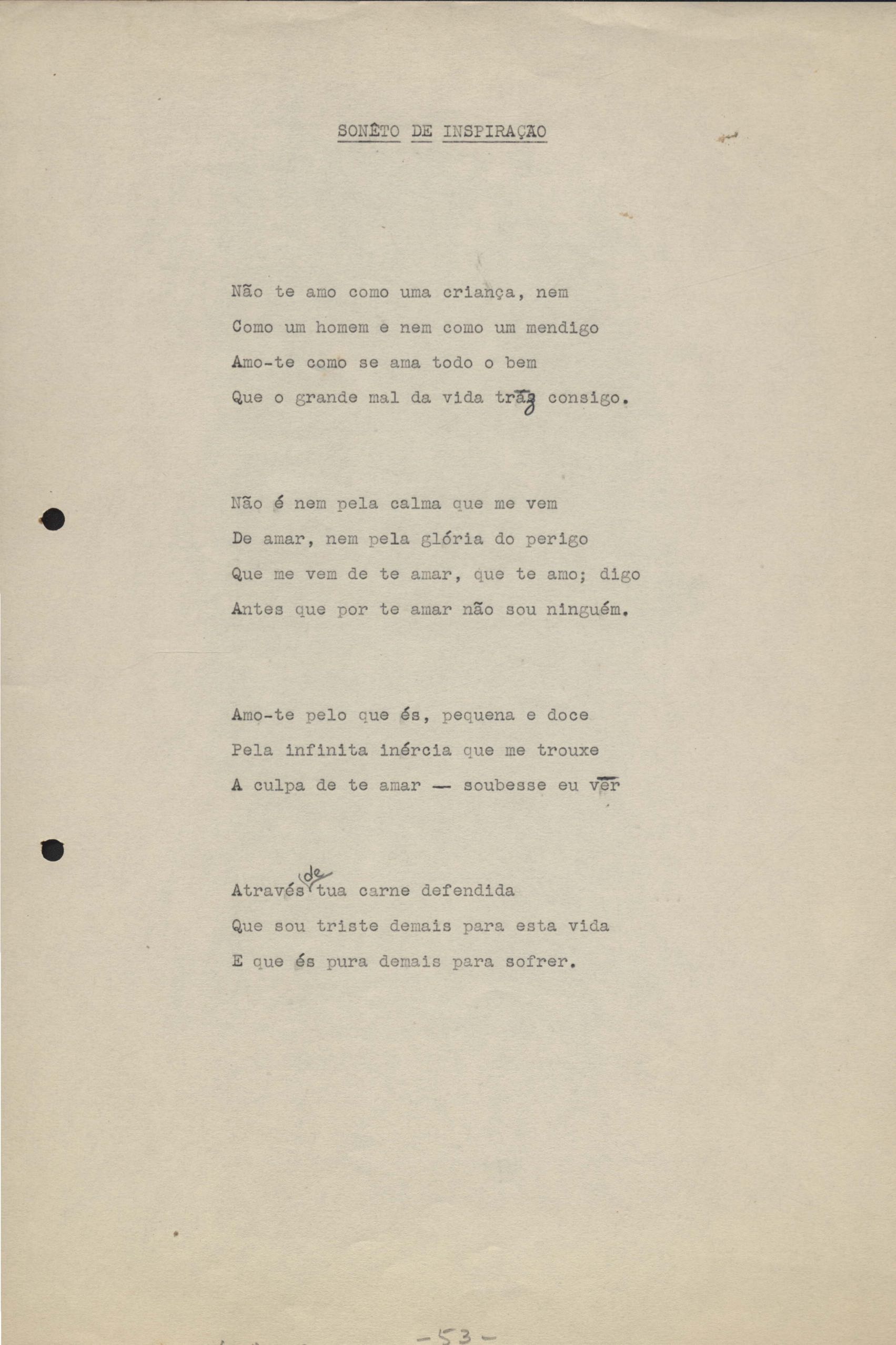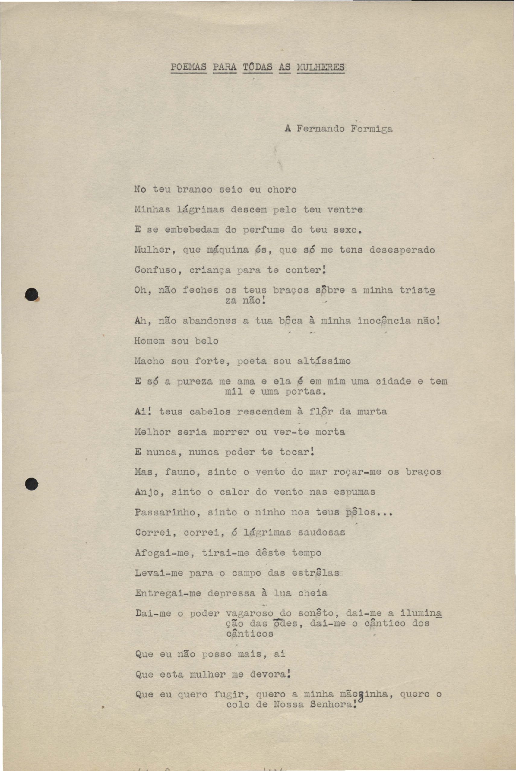 Poemas (33). "Amor nos três pavimentos", "Ária para assovio", "Balada feroz", "Balada para Maria", "A brusca poesia da mulher amada", "O cemitério na madrugada", "O falso mendigo", "Idade Média", "Invocação à mulher única", "Lamento ouvido não sei onde", "O mágico", "A máscara da noite", "A mulher que passa", "Poema para todas as mulheres", "Princípio", "Solilóquio", "Sonata do amor perdido" [Lamento nº 1, Intermédio e Lamento nº 2], "Soneto à lua", "Soneto de agosto", "Soneto de carta e mensagem", "Soneto de contrição", "Soneto de devoção", "Soneto de inspiração", "Soneto de intimidade", "Soneto de Katherine Mansfield", "Soneto simples", "Ternura", "Três retratos", [Jóia, Maja Raquel e Milady], "Viagem à sombra", "Vida e poesia" e "A vida vivida". Anexo: 1. Prova tipográfica [da primeira edição]; 2. Outras versões manuscritas e datilografadas, com emendas, faltando os poemas "O mágico" e "Soneto à lua".