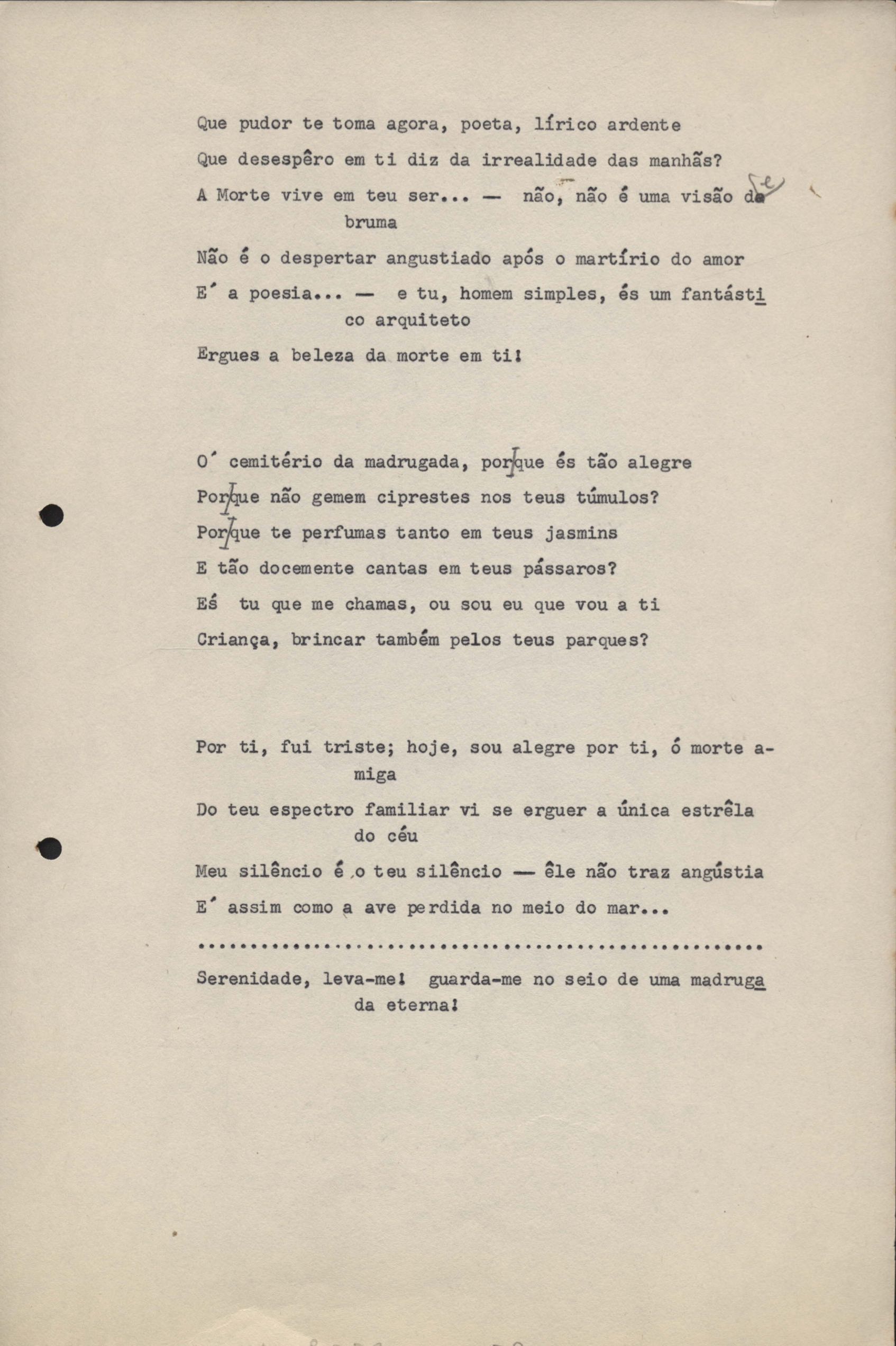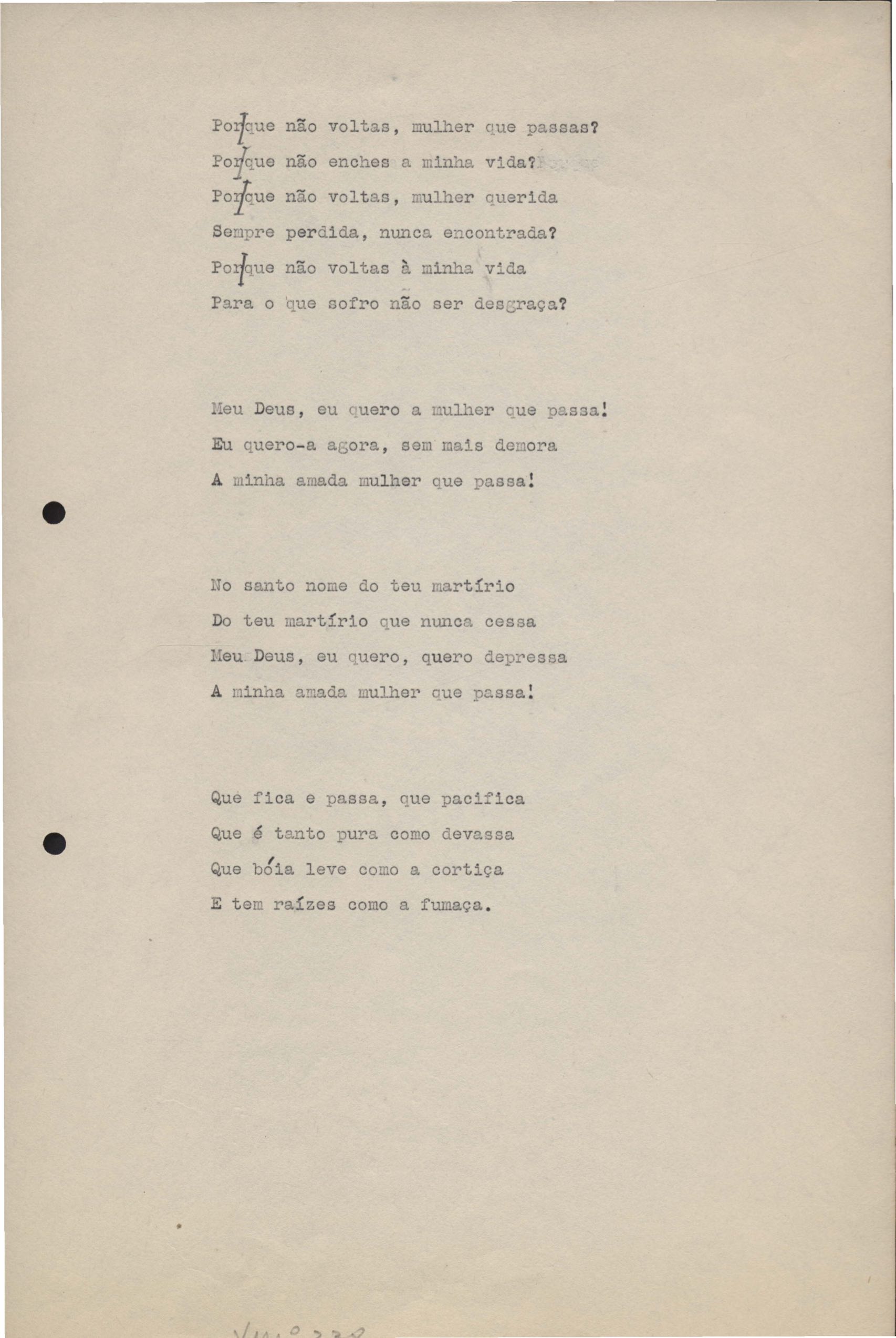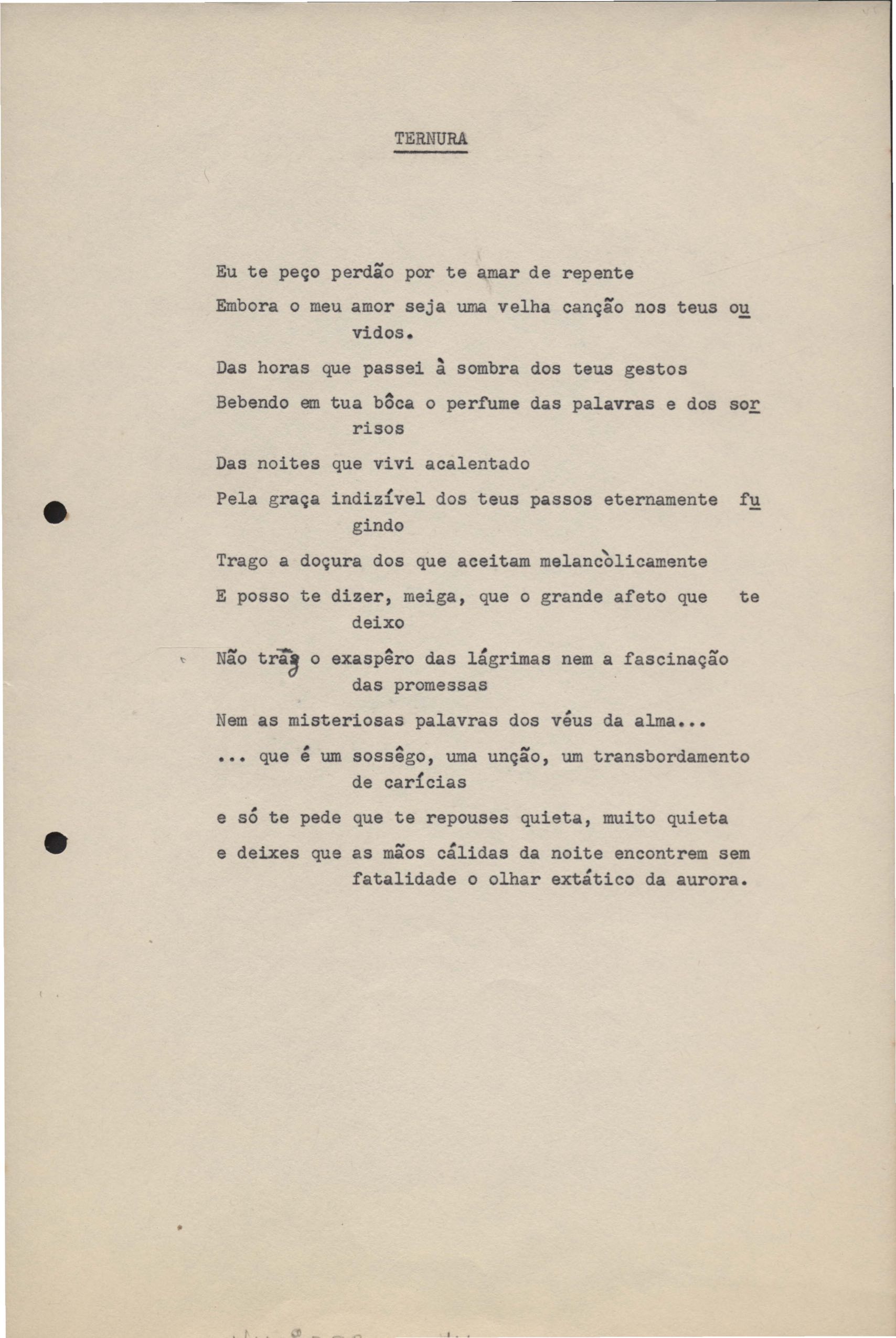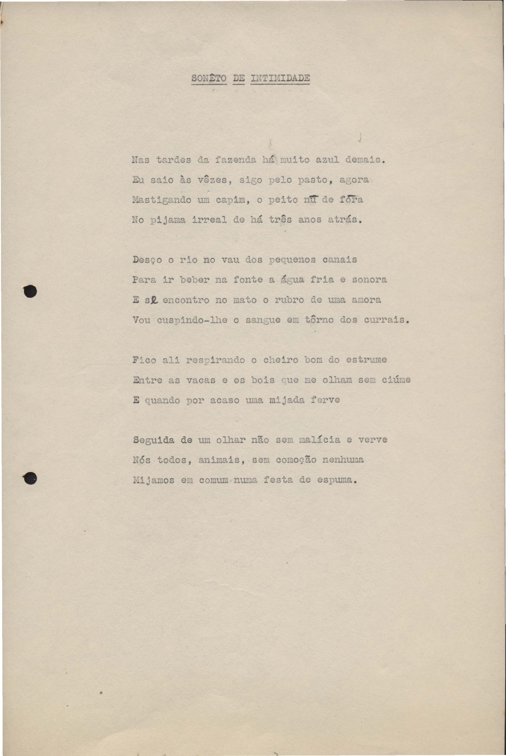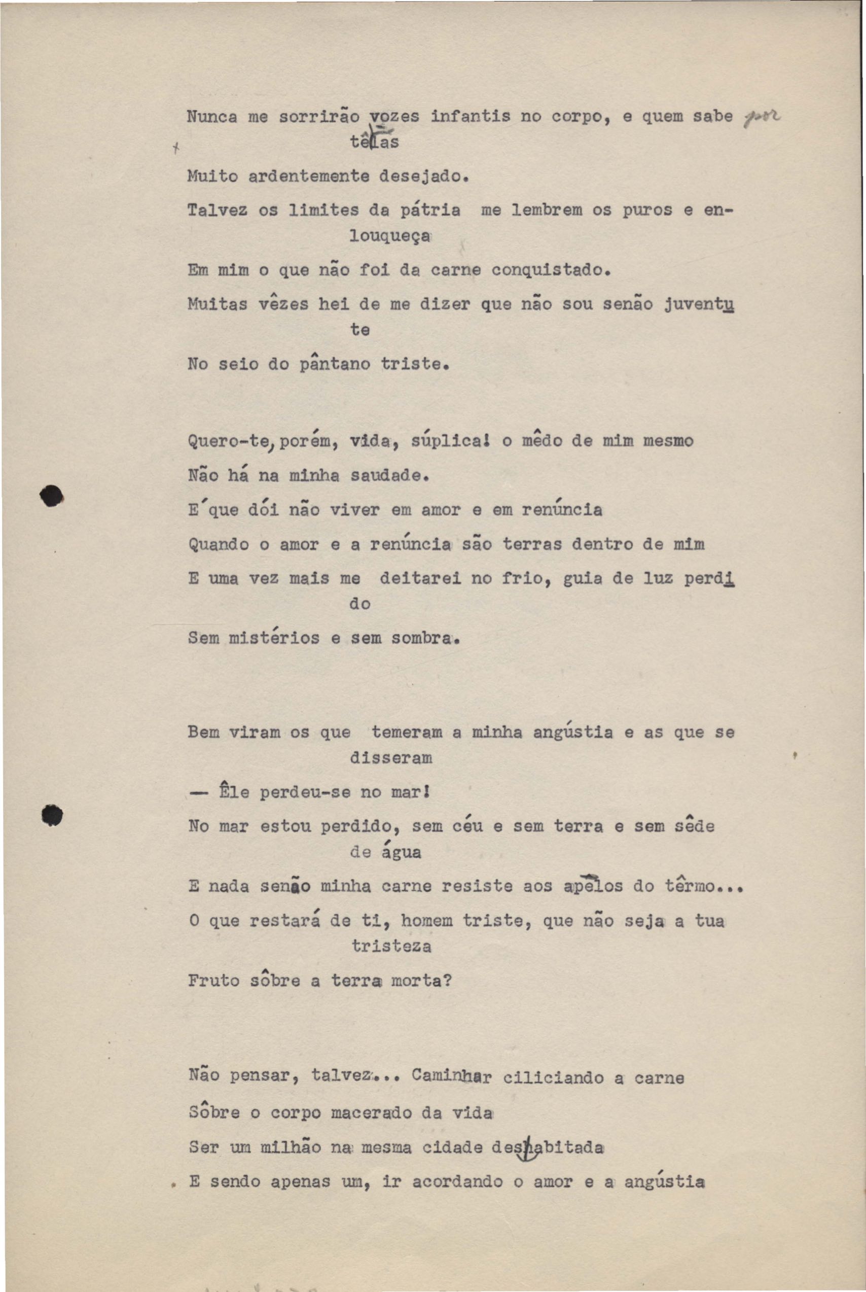 Poemas (33). "Amor nos três pavimentos", "Ária para assovio", "Balada feroz", "Balada para Maria", "A brusca poesia da mulher amada", "O cemitério na madrugada", "O falso mendigo", "Idade Média", "Invocação à mulher única", "Lamento ouvido não sei onde", "O mágico", "A máscara da noite", "A mulher que passa", "Poema para todas as mulheres", "Princípio", "Solilóquio", "Sonata do amor perdido" [Lamento nº 1, Intermédio e Lamento nº 2], "Soneto à lua", "Soneto de agosto", "Soneto de carta e mensagem", "Soneto de contrição", "Soneto de devoção", "Soneto de inspiração", "Soneto de intimidade", "Soneto de Katherine Mansfield", "Soneto simples", "Ternura", "Três retratos", [Jóia, Maja Raquel e Milady], "Viagem à sombra", "Vida e poesia" e "A vida vivida". Anexo: 1. Prova tipográfica [da primeira edição]; 2. Outras versões manuscritas e datilografadas, com emendas, faltando os poemas "O mágico" e "Soneto à lua".