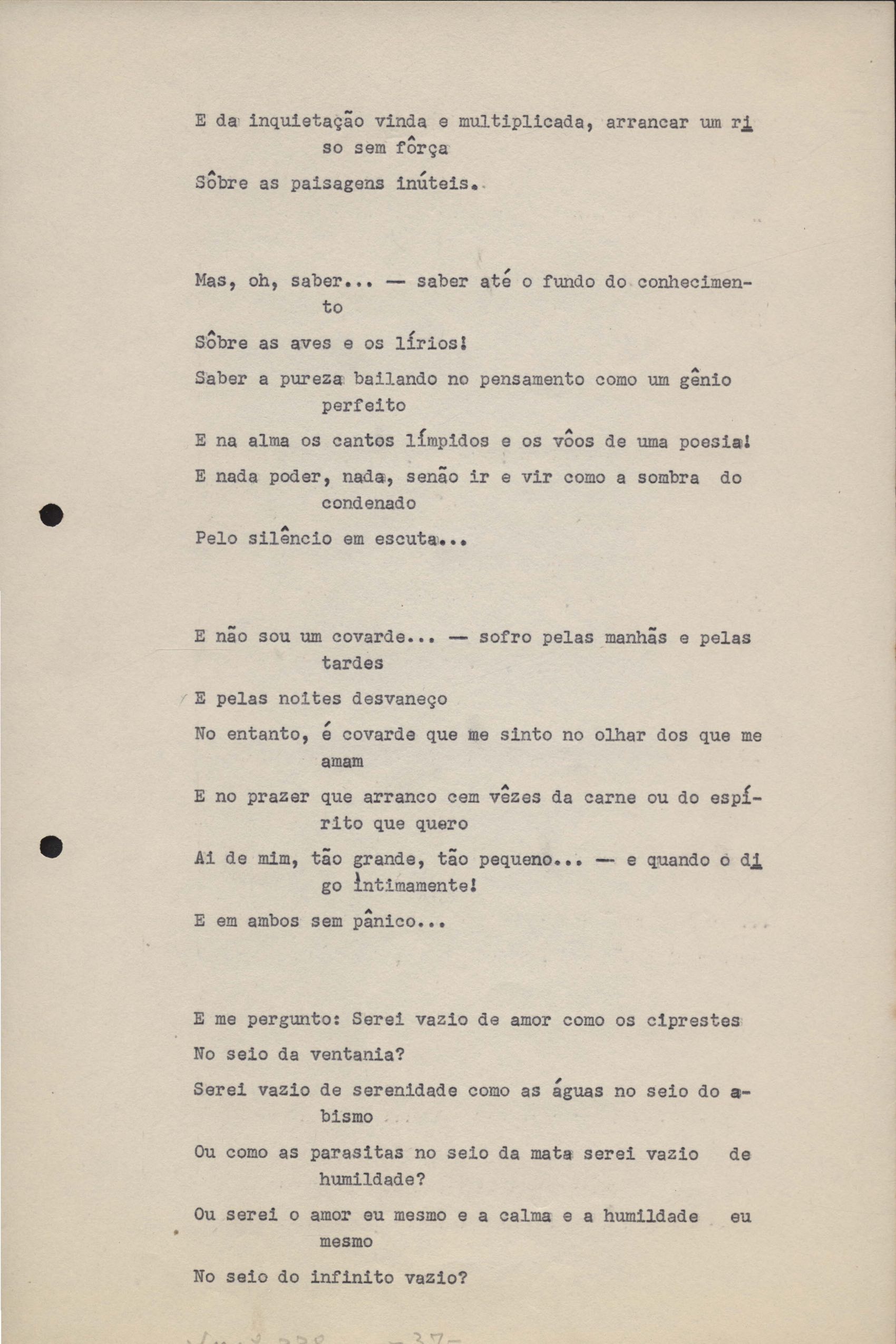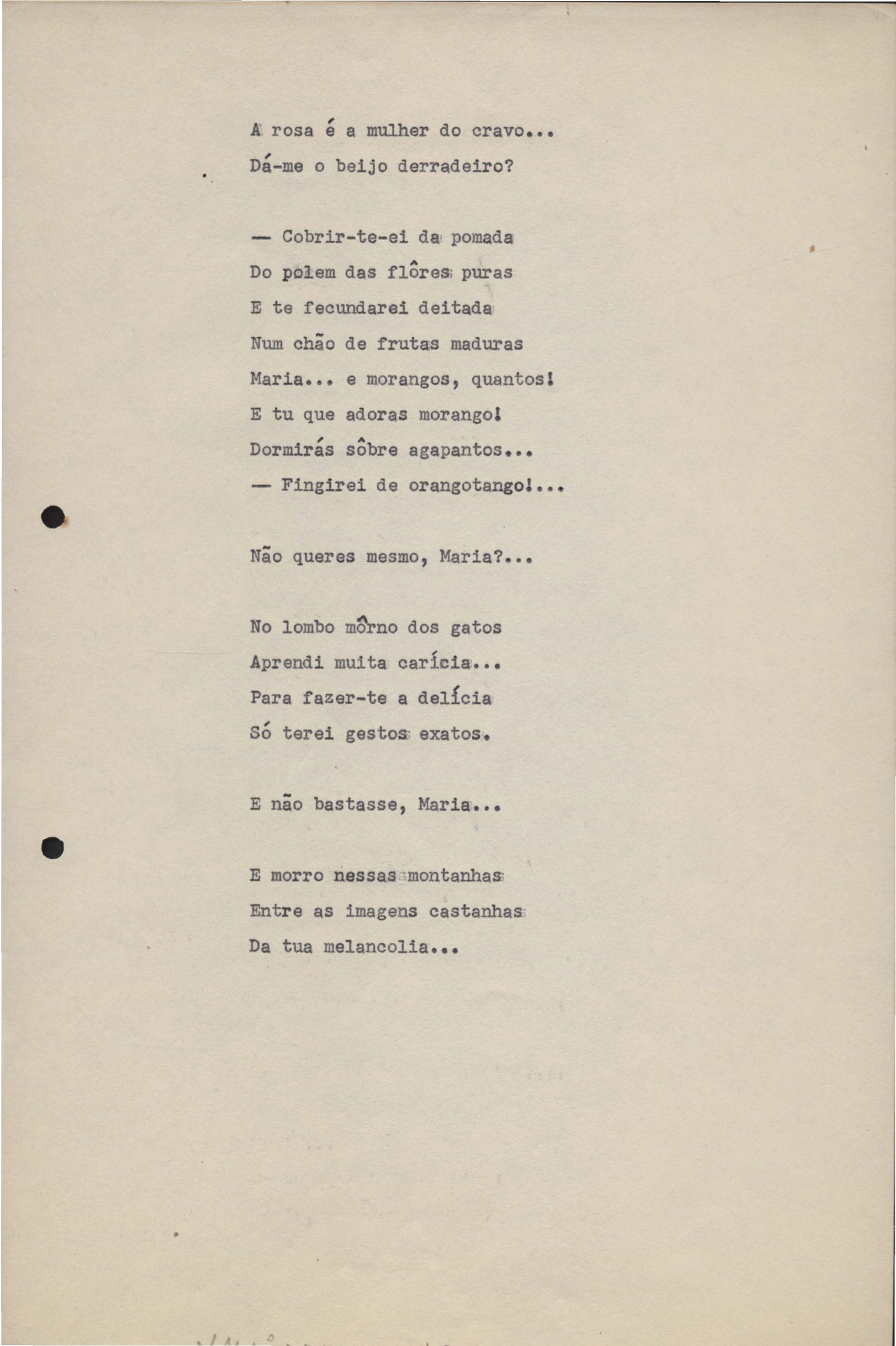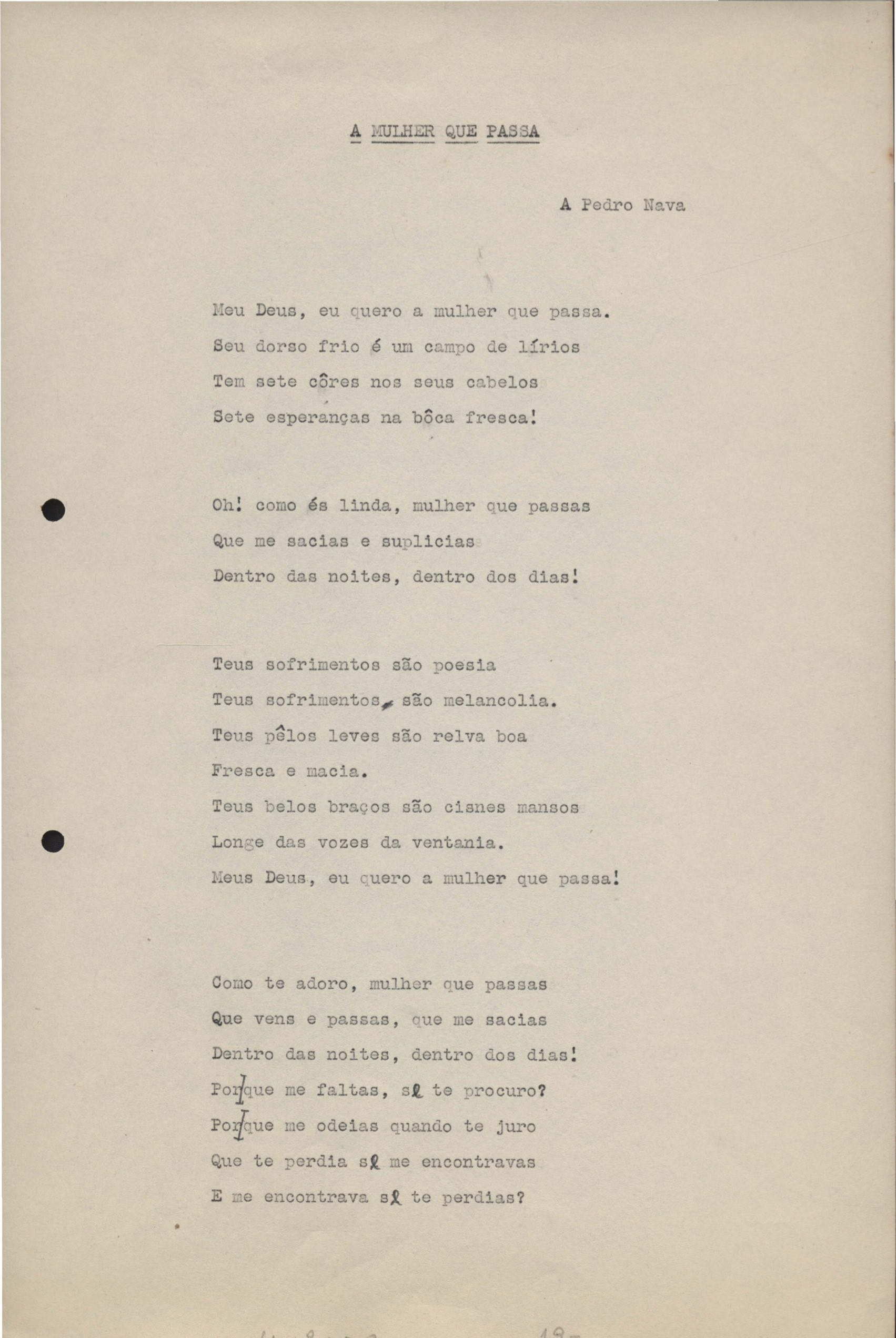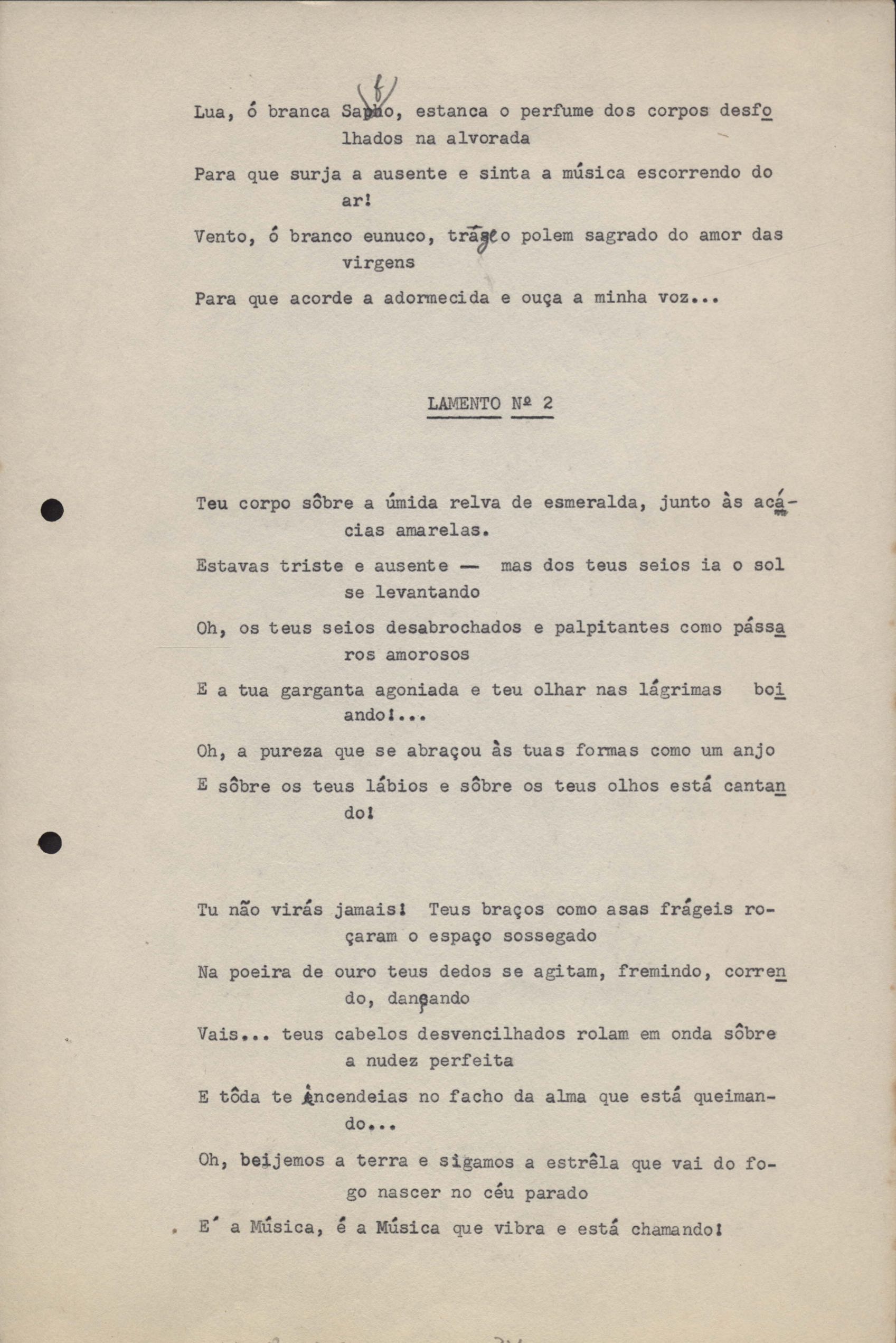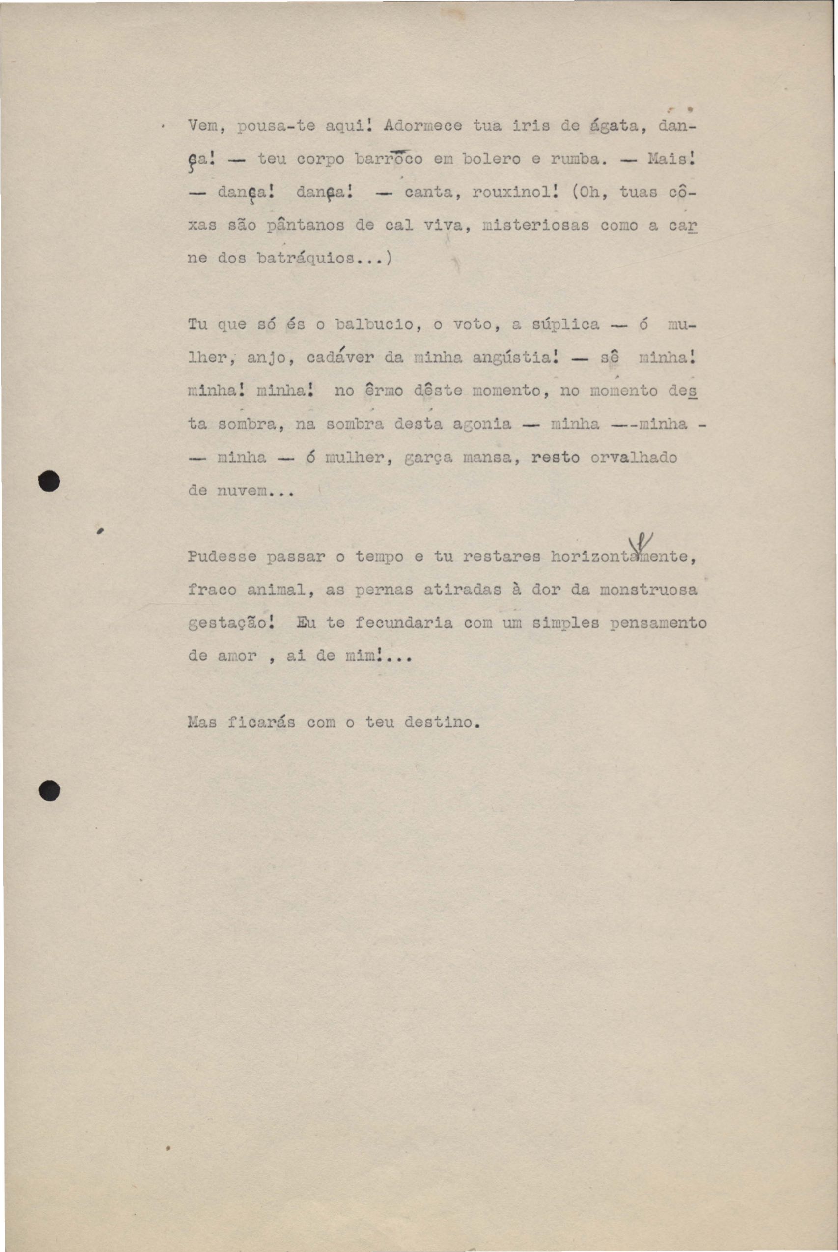 Poemas (33). "Amor nos três pavimentos", "Ária para assovio", "Balada feroz", "Balada para Maria", "A brusca poesia da mulher amada", "O cemitério na madrugada", "O falso mendigo", "Idade Média", "Invocação à mulher única", "Lamento ouvido não sei onde", "O mágico", "A máscara da noite", "A mulher que passa", "Poema para todas as mulheres", "Princípio", "Solilóquio", "Sonata do amor perdido" [Lamento nº 1, Intermédio e Lamento nº 2], "Soneto à lua", "Soneto de agosto", "Soneto de carta e mensagem", "Soneto de contrição", "Soneto de devoção", "Soneto de inspiração", "Soneto de intimidade", "Soneto de Katherine Mansfield", "Soneto simples", "Ternura", "Três retratos", [Jóia, Maja Raquel e Milady], "Viagem à sombra", "Vida e poesia" e "A vida vivida". Anexo: 1. Prova tipográfica [da primeira edição]; 2. Outras versões manuscritas e datilografadas, com emendas, faltando os poemas "O mágico" e "Soneto à lua".