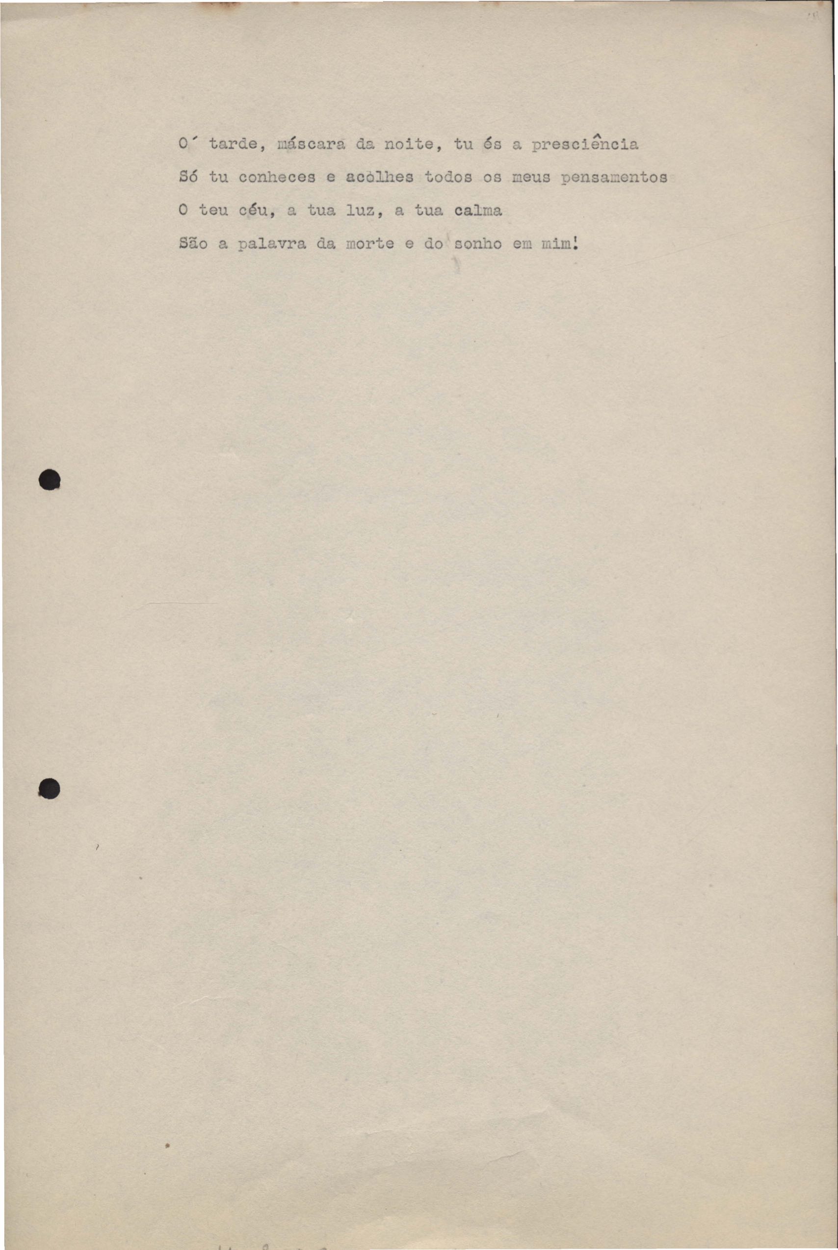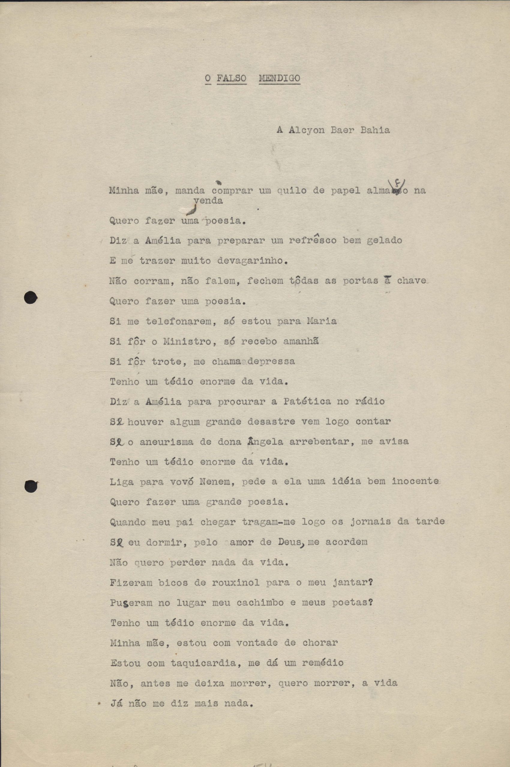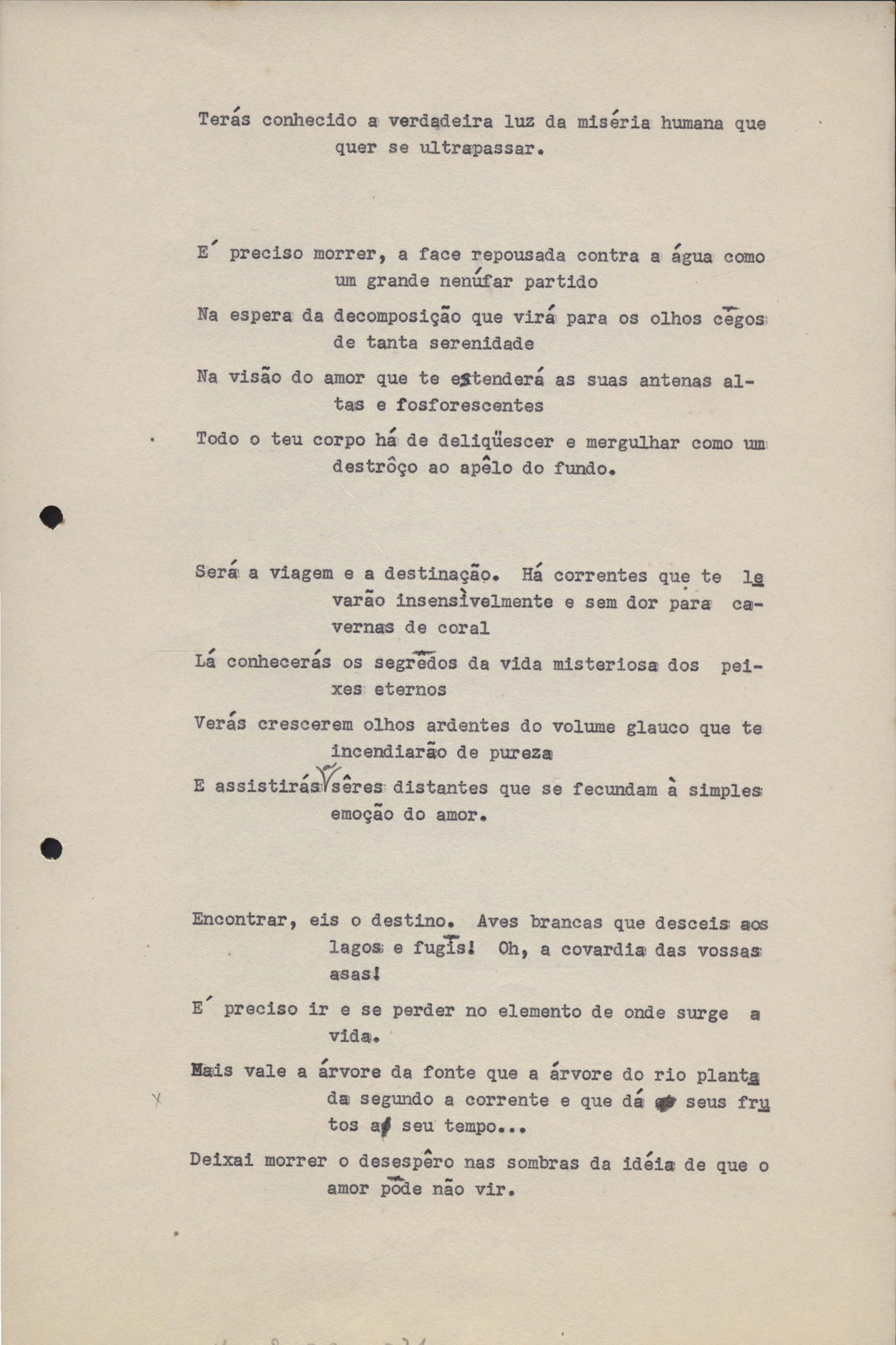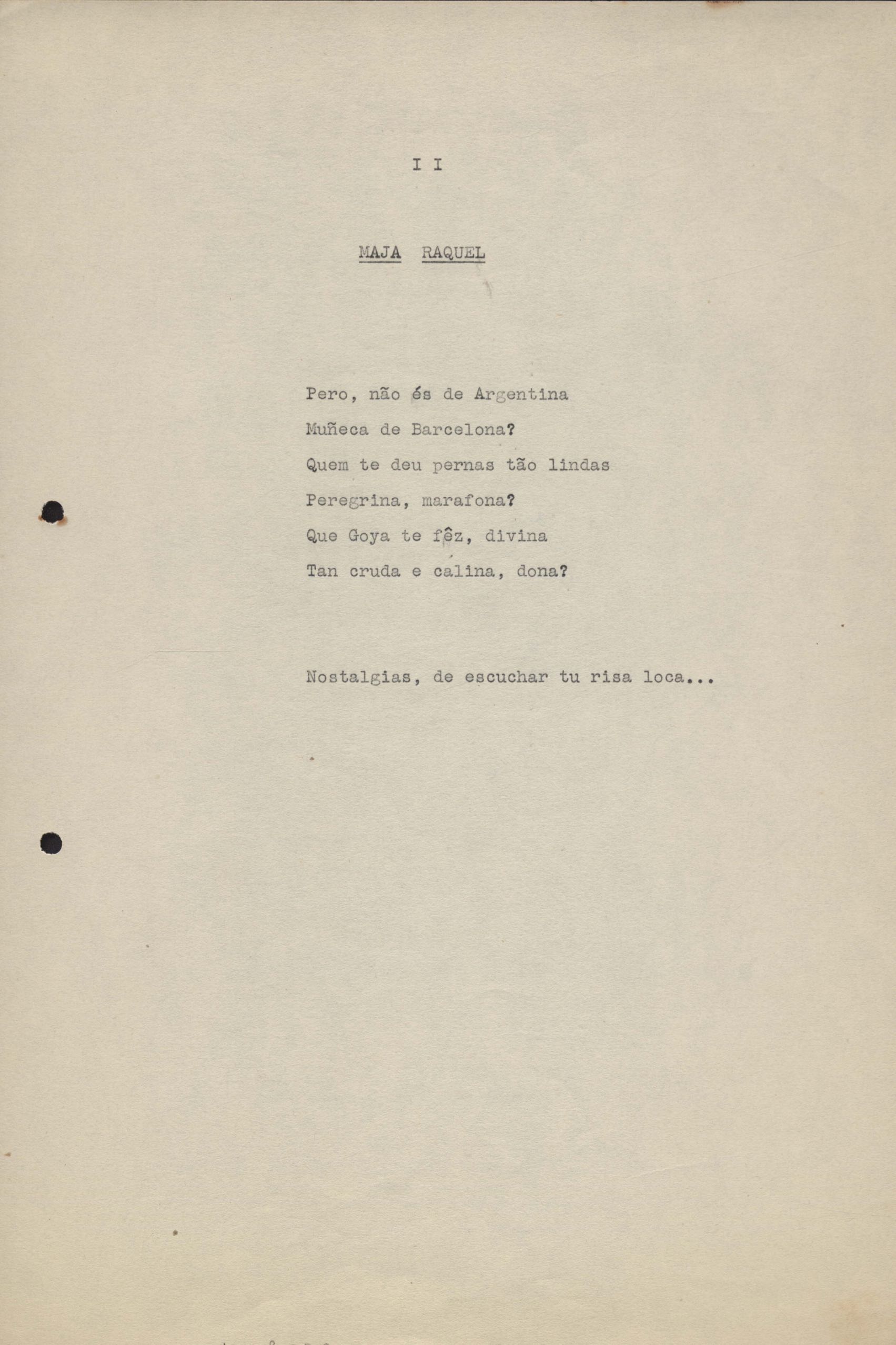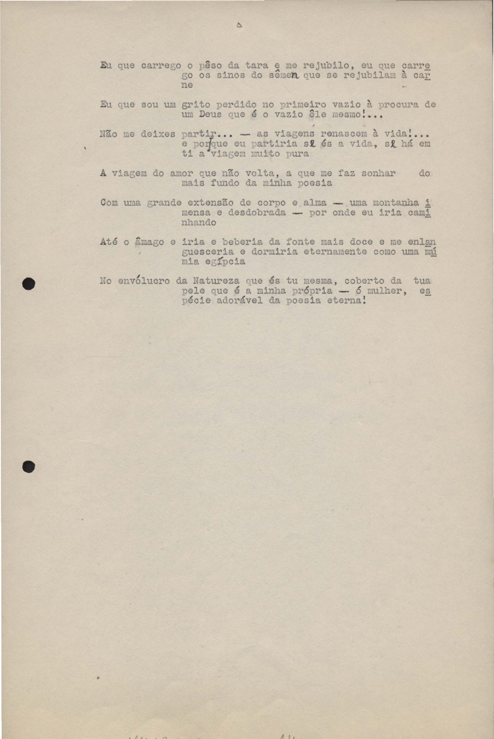 Poemas (33). "Amor nos três pavimentos", "Ária para assovio", "Balada feroz", "Balada para Maria", "A brusca poesia da mulher amada", "O cemitério na madrugada", "O falso mendigo", "Idade Média", "Invocação à mulher única", "Lamento ouvido não sei onde", "O mágico", "A máscara da noite", "A mulher que passa", "Poema para todas as mulheres", "Princípio", "Solilóquio", "Sonata do amor perdido" [Lamento nº 1, Intermédio e Lamento nº 2], "Soneto à lua", "Soneto de agosto", "Soneto de carta e mensagem", "Soneto de contrição", "Soneto de devoção", "Soneto de inspiração", "Soneto de intimidade", "Soneto de Katherine Mansfield", "Soneto simples", "Ternura", "Três retratos", [Jóia, Maja Raquel e Milady], "Viagem à sombra", "Vida e poesia" e "A vida vivida". Anexo: 1. Prova tipográfica [da primeira edição]; 2. Outras versões manuscritas e datilografadas, com emendas, faltando os poemas "O mágico" e "Soneto à lua".