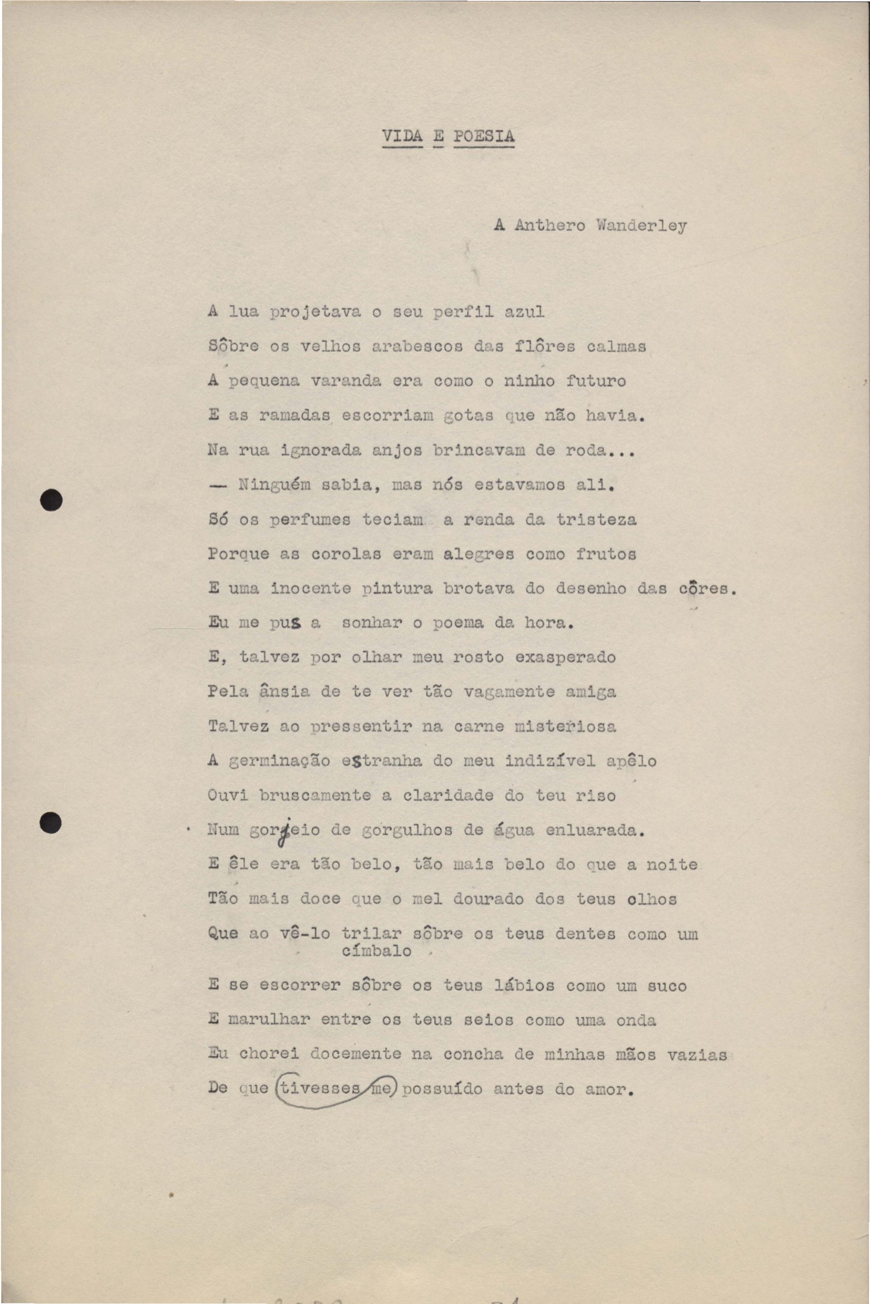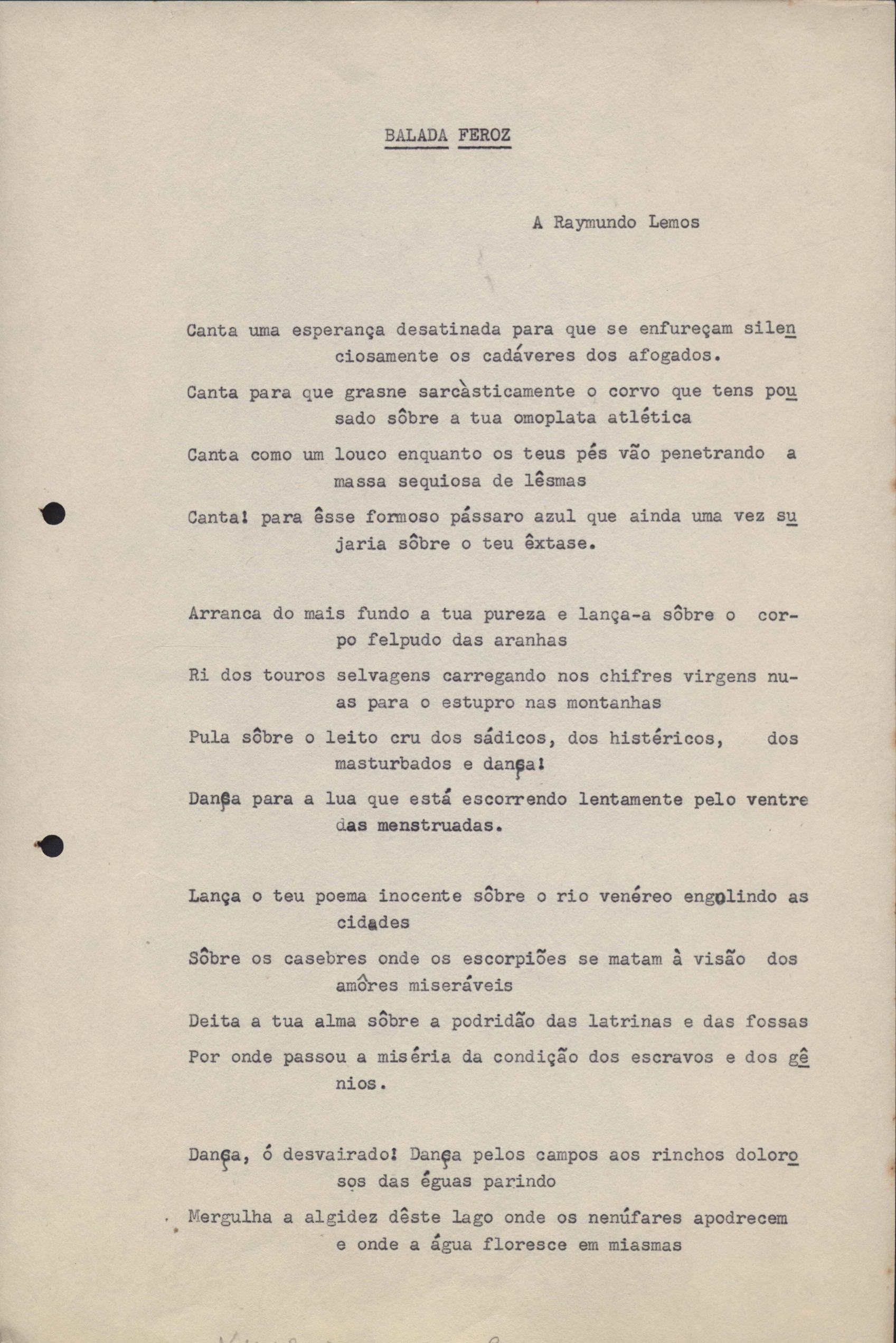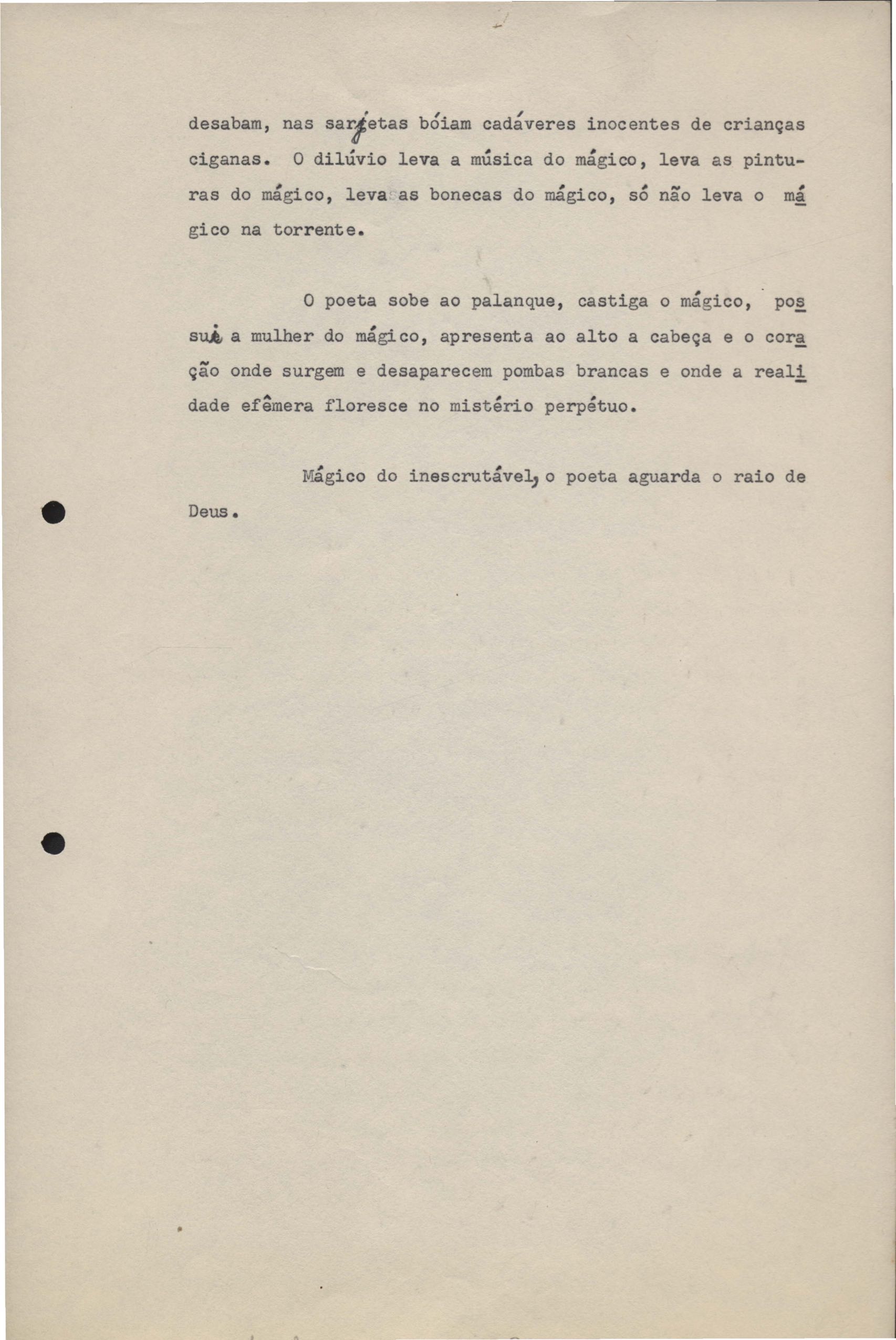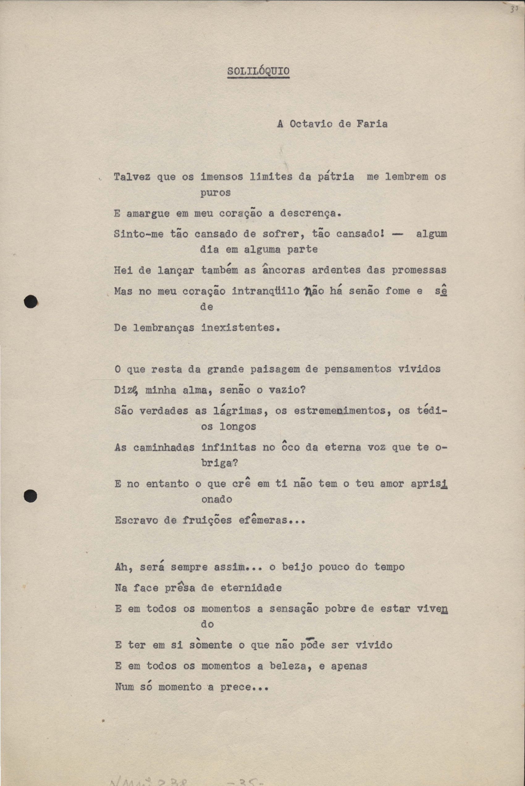 Poemas (33). "Amor nos três pavimentos", "Ária para assovio", "Balada feroz", "Balada para Maria", "A brusca poesia da mulher amada", "O cemitério na madrugada", "O falso mendigo", "Idade Média", "Invocação à mulher única", "Lamento ouvido não sei onde", "O mágico", "A máscara da noite", "A mulher que passa", "Poema para todas as mulheres", "Princípio", "Solilóquio", "Sonata do amor perdido" [Lamento nº 1, Intermédio e Lamento nº 2], "Soneto à lua", "Soneto de agosto", "Soneto de carta e mensagem", "Soneto de contrição", "Soneto de devoção", "Soneto de inspiração", "Soneto de intimidade", "Soneto de Katherine Mansfield", "Soneto simples", "Ternura", "Três retratos", [Jóia, Maja Raquel e Milady], "Viagem à sombra", "Vida e poesia" e "A vida vivida". Anexo: 1. Prova tipográfica [da primeira edição]; 2. Outras versões manuscritas e datilografadas, com emendas, faltando os poemas "O mágico" e "Soneto à lua".