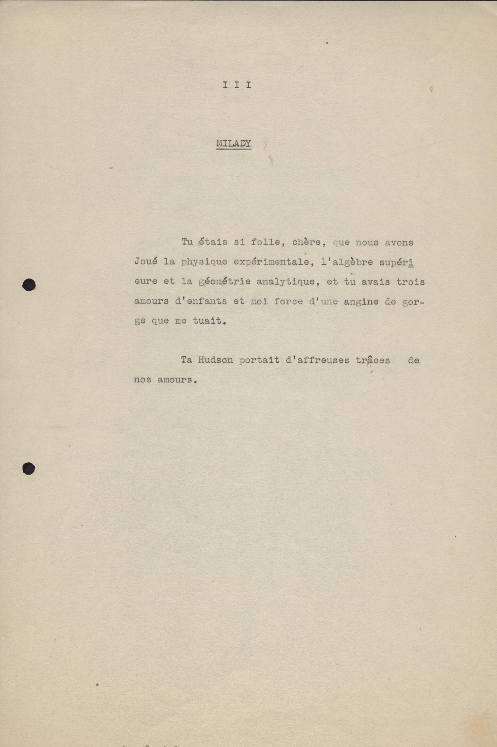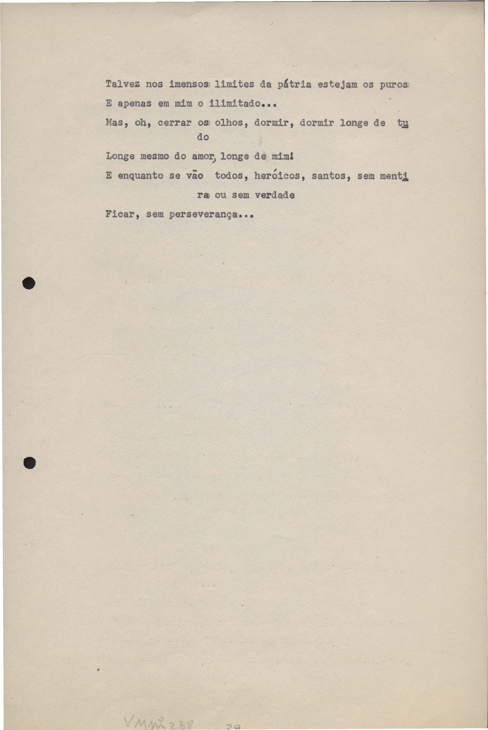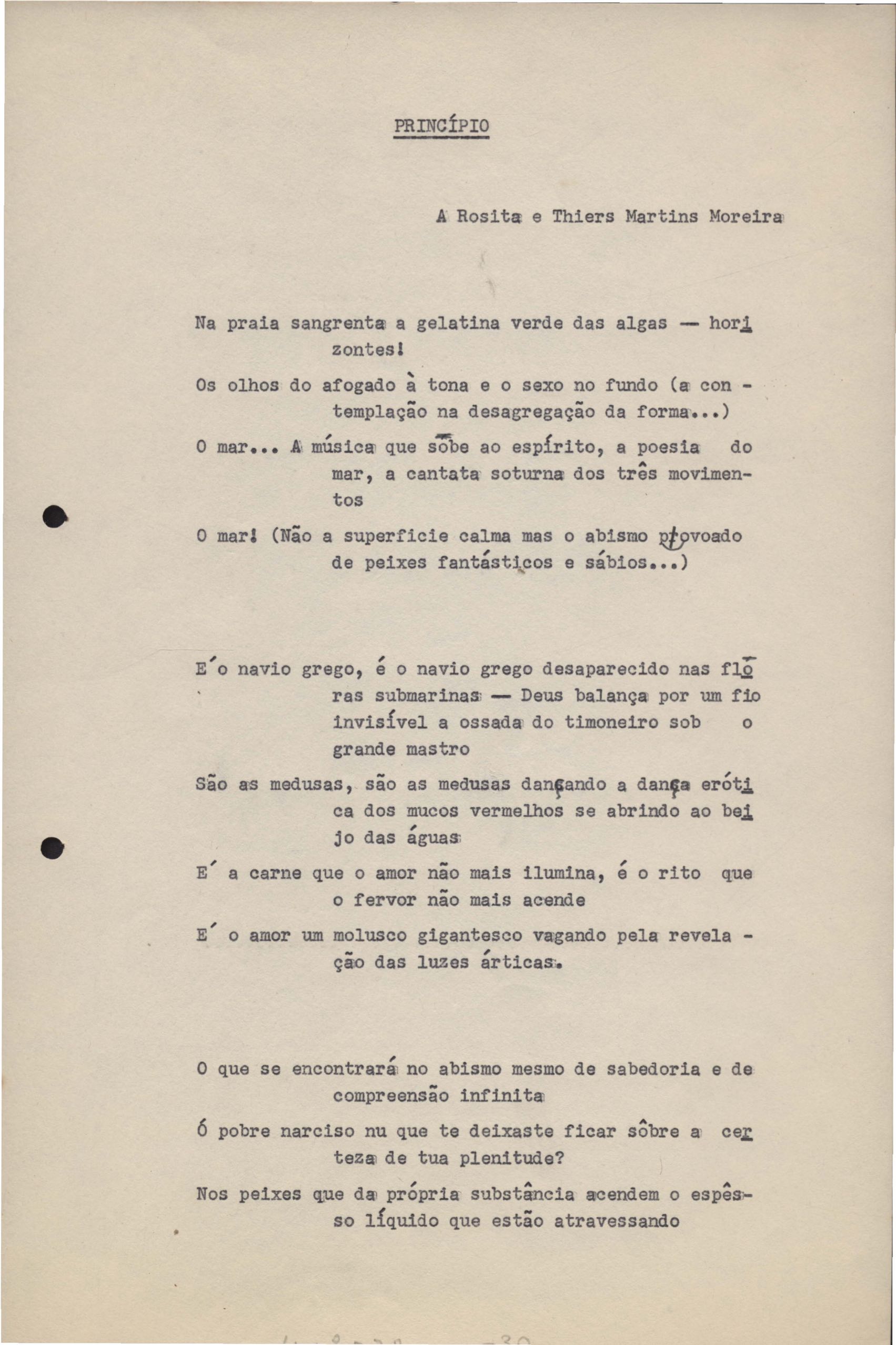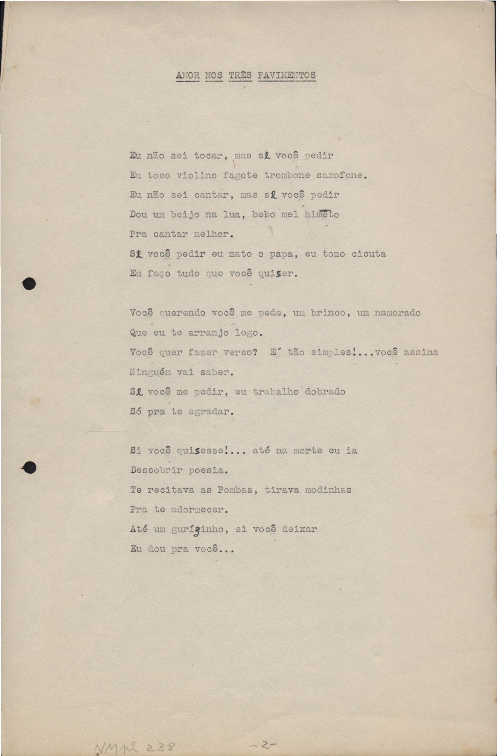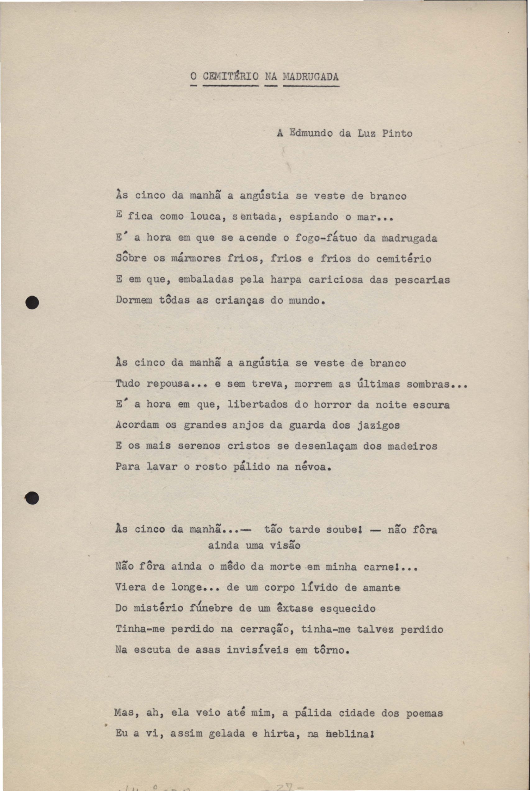 Poemas (33). "Amor nos três pavimentos", "Ária para assovio", "Balada feroz", "Balada para Maria", "A brusca poesia da mulher amada", "O cemitério na madrugada", "O falso mendigo", "Idade Média", "Invocação à mulher única", "Lamento ouvido não sei onde", "O mágico", "A máscara da noite", "A mulher que passa", "Poema para todas as mulheres", "Princípio", "Solilóquio", "Sonata do amor perdido" [Lamento nº 1, Intermédio e Lamento nº 2], "Soneto à lua", "Soneto de agosto", "Soneto de carta e mensagem", "Soneto de contrição", "Soneto de devoção", "Soneto de inspiração", "Soneto de intimidade", "Soneto de Katherine Mansfield", "Soneto simples", "Ternura", "Três retratos", [Jóia, Maja Raquel e Milady], "Viagem à sombra", "Vida e poesia" e "A vida vivida". Anexo: 1. Prova tipográfica [da primeira edição]; 2. Outras versões manuscritas e datilografadas, com emendas, faltando os poemas "O mágico" e "Soneto à lua".