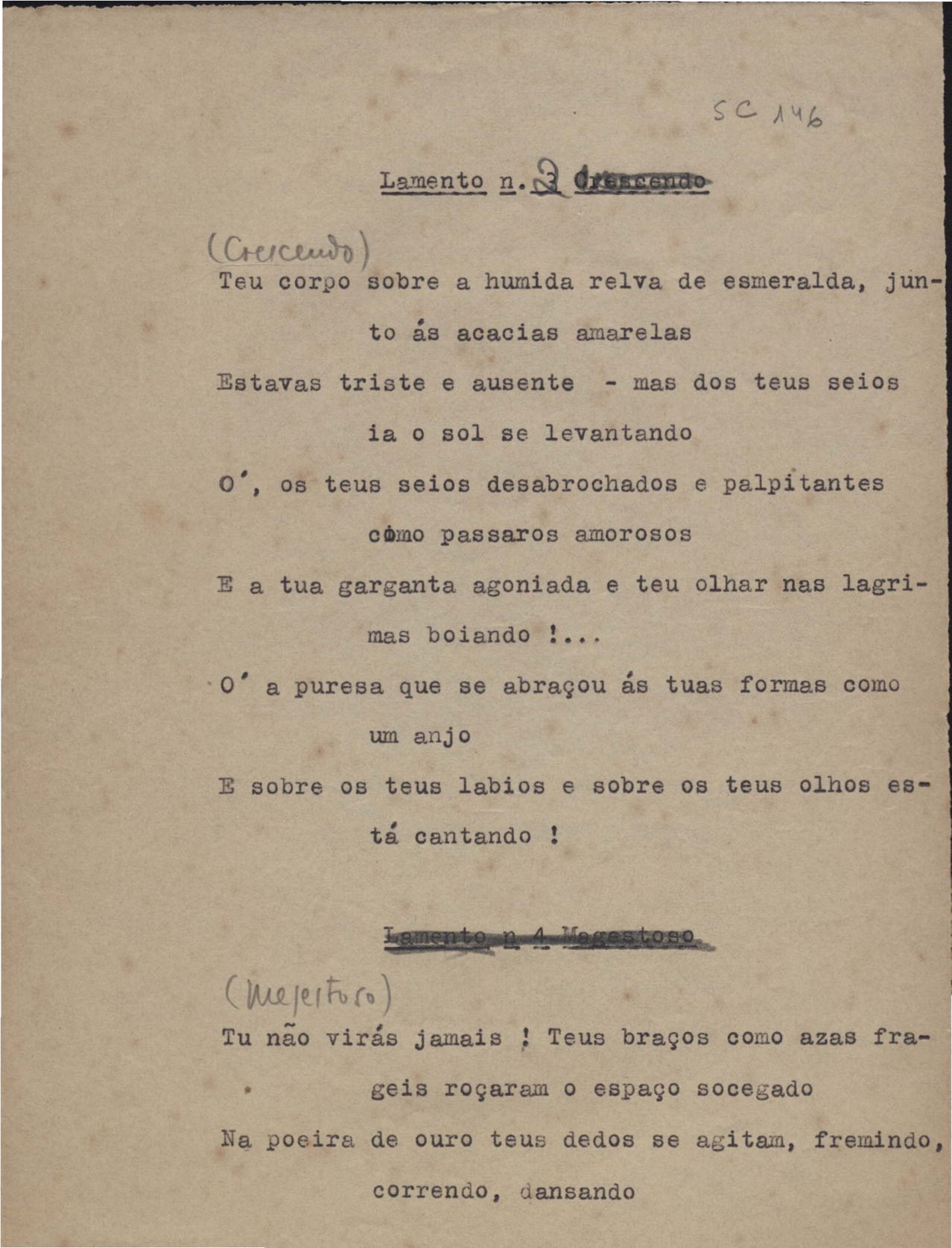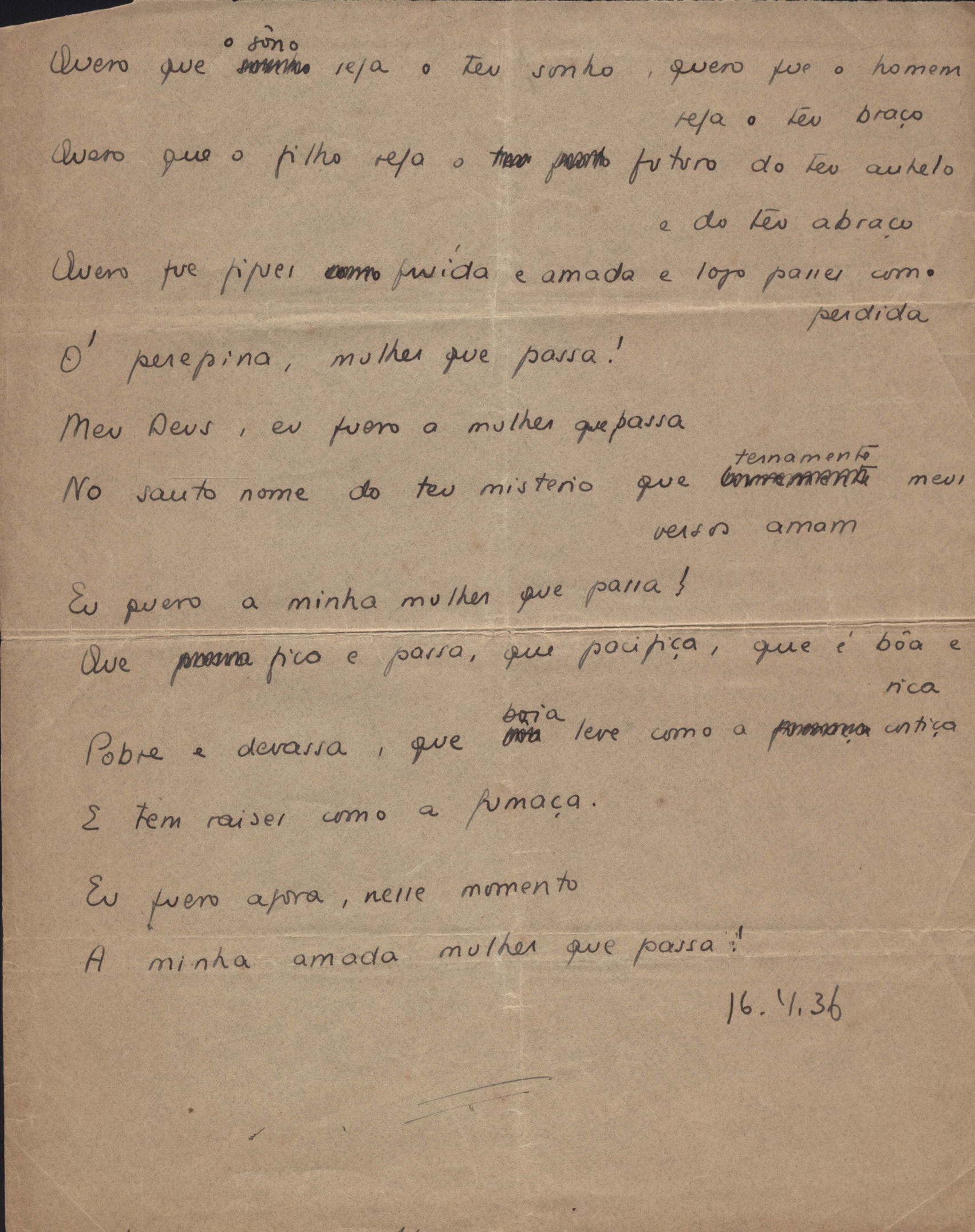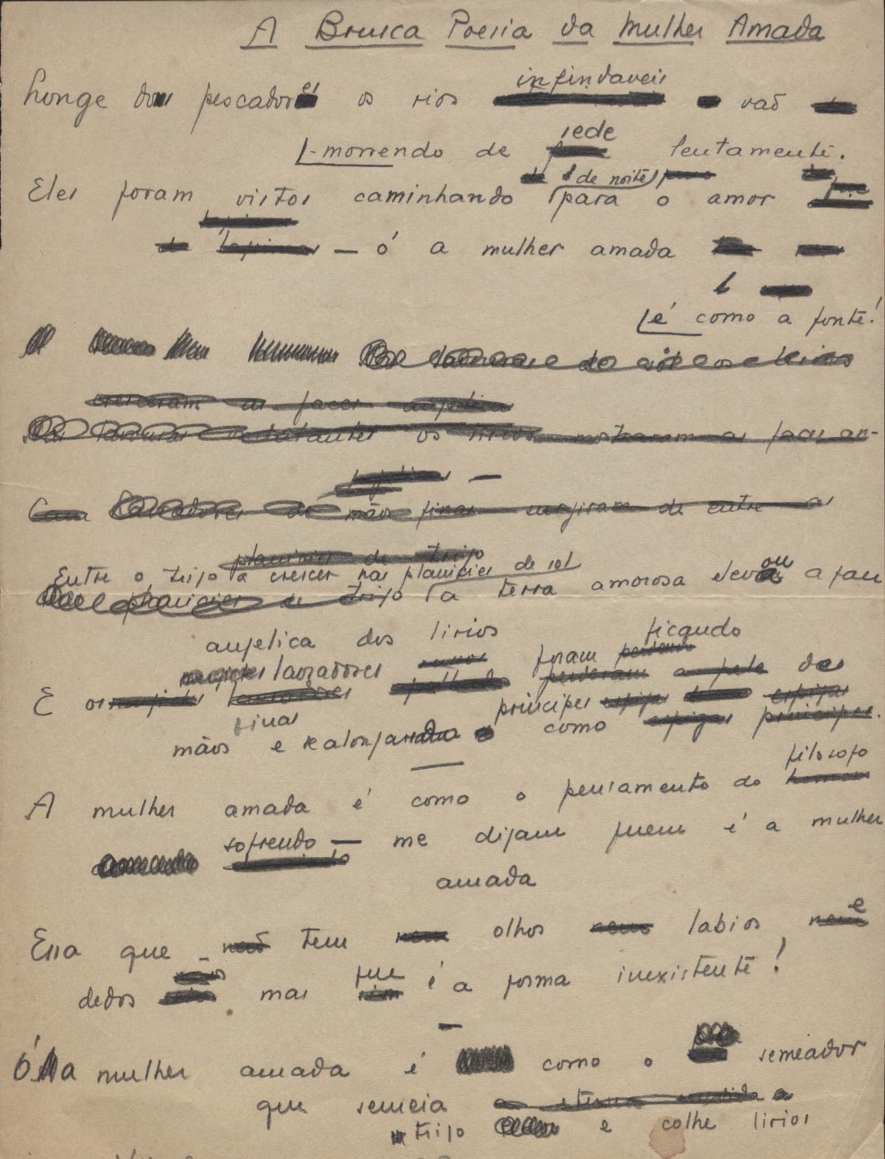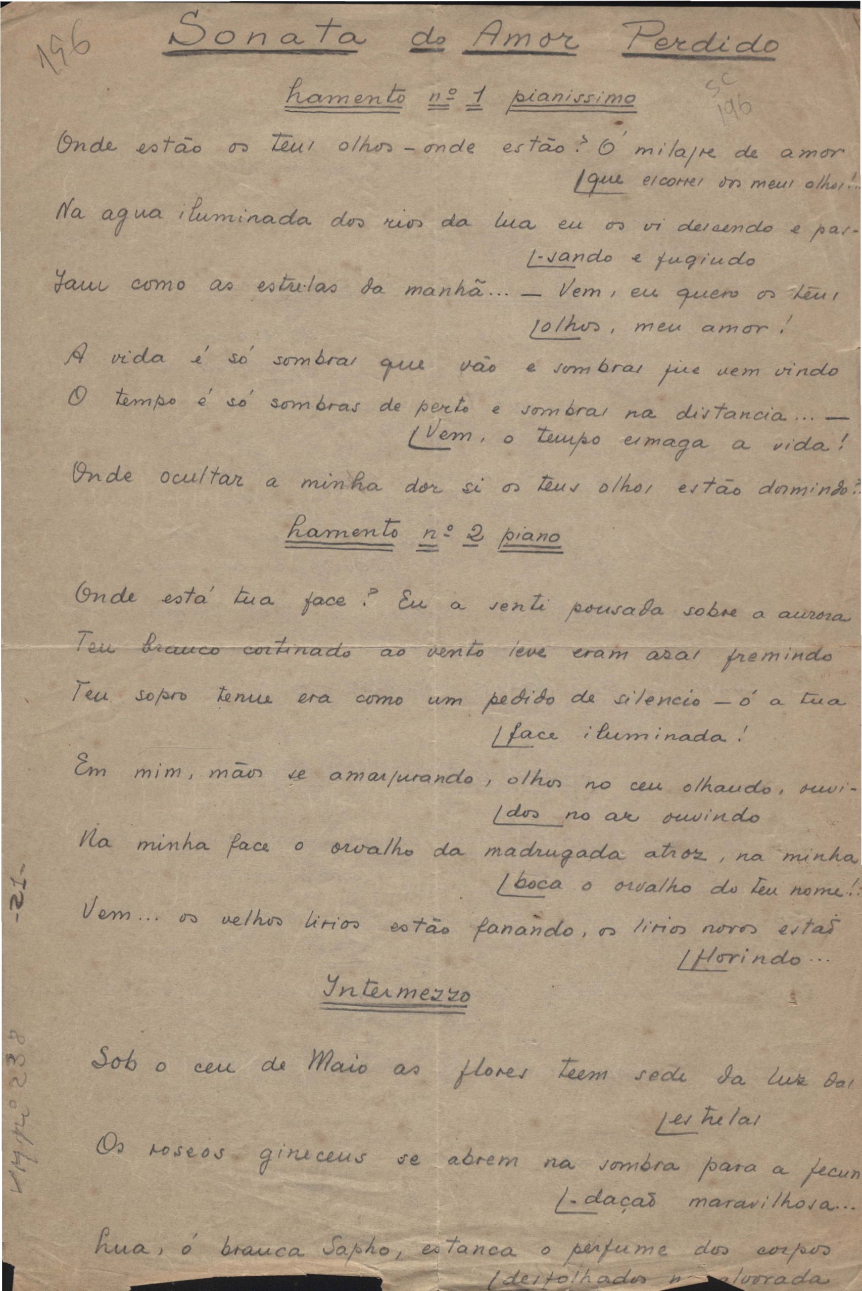 Poemas (33). "Amor nos três pavimentos", "Ária para assovio", "Balada feroz", "Balada para Maria", "A brusca poesia da mulher amada", "O cemitério na madrugada", "O falso mendigo", "Idade Média", "Invocação à mulher única", "Lamento ouvido não sei onde", "O mágico", "A máscara da noite", "A mulher que passa", "Poema para todas as mulheres", "Princípio", "Solilóquio", "Sonata do amor perdido" [Lamento nº 1, Intermédio e Lamento nº 2], "Soneto à lua", "Soneto de agosto", "Soneto de carta e mensagem", "Soneto de contrição", "Soneto de devoção", "Soneto de inspiração", "Soneto de intimidade", "Soneto de Katherine Mansfield", "Soneto simples", "Ternura", "Três retratos", [Jóia, Maja Raquel e Milady], "Viagem à sombra", "Vida e poesia" e "A vida vivida". Anexo: 1. Prova tipográfica [da primeira edição]; 2. Outras versões manuscritas e datilografadas, com emendas, faltando os poemas "O mágico" e "Soneto à lua".