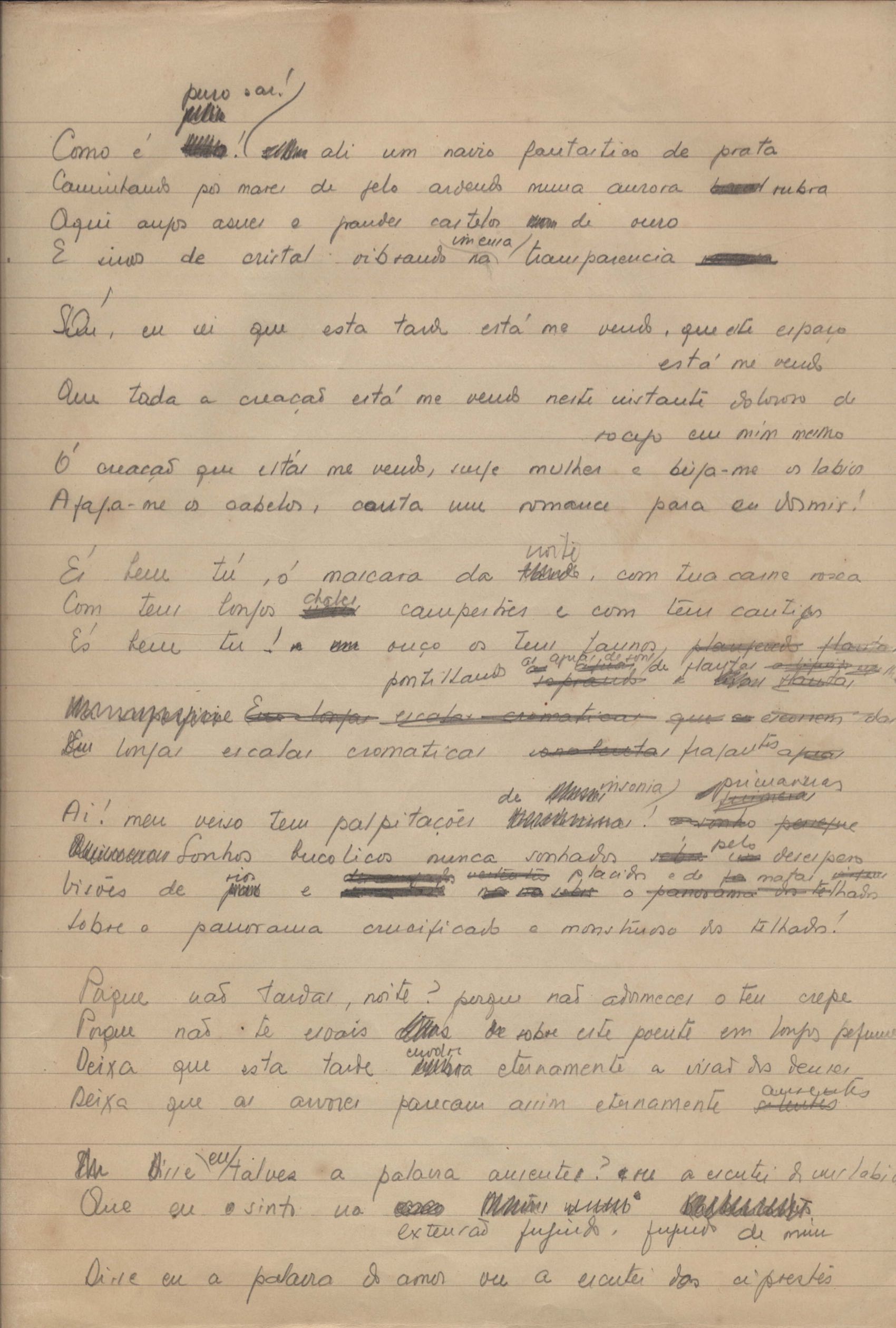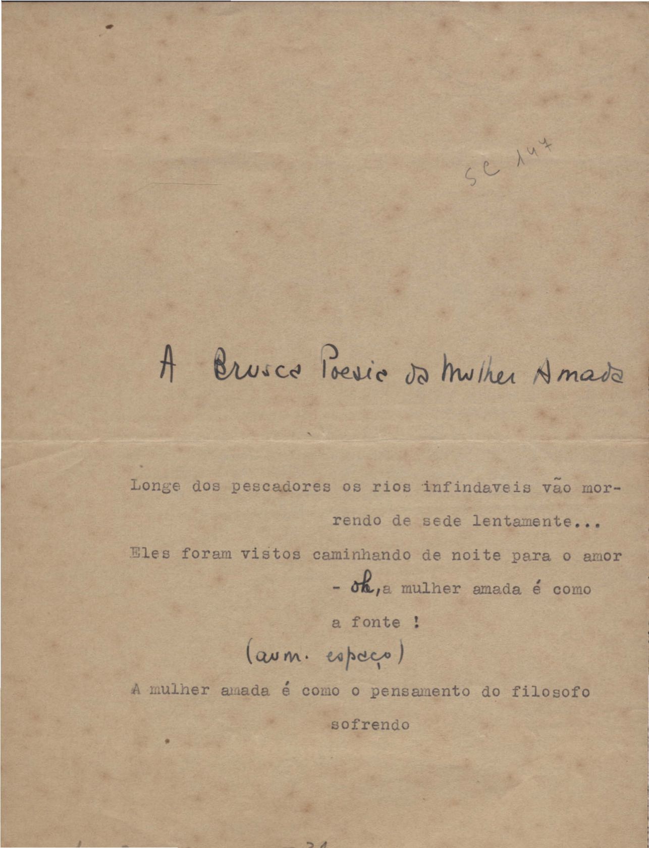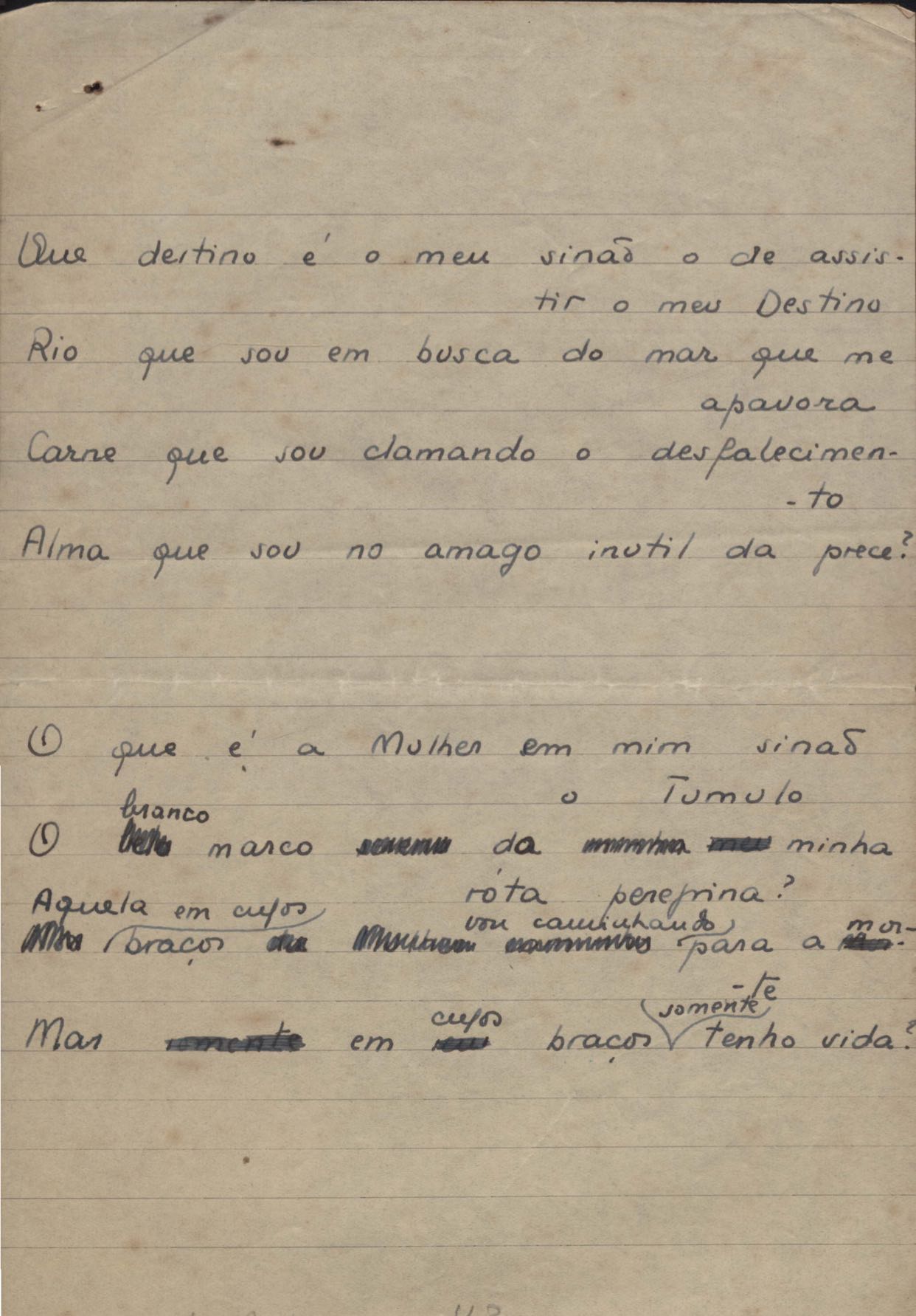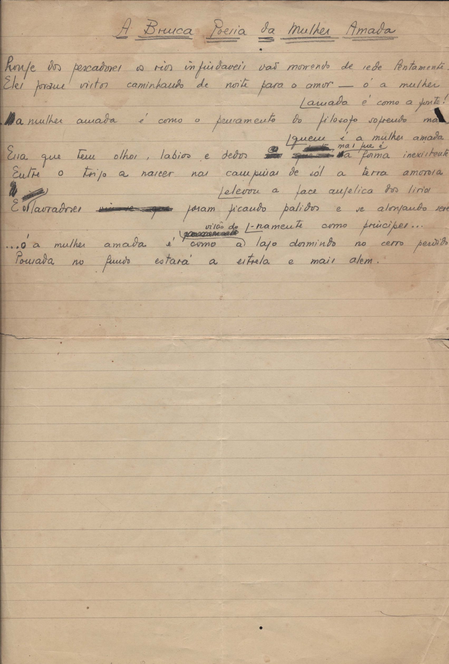 Poemas (33). "Amor nos três pavimentos", "Ária para assovio", "Balada feroz", "Balada para Maria", "A brusca poesia da mulher amada", "O cemitério na madrugada", "O falso mendigo", "Idade Média", "Invocação à mulher única", "Lamento ouvido não sei onde", "O mágico", "A máscara da noite", "A mulher que passa", "Poema para todas as mulheres", "Princípio", "Solilóquio", "Sonata do amor perdido" [Lamento nº 1, Intermédio e Lamento nº 2], "Soneto à lua", "Soneto de agosto", "Soneto de carta e mensagem", "Soneto de contrição", "Soneto de devoção", "Soneto de inspiração", "Soneto de intimidade", "Soneto de Katherine Mansfield", "Soneto simples", "Ternura", "Três retratos", [Jóia, Maja Raquel e Milady], "Viagem à sombra", "Vida e poesia" e "A vida vivida". Anexo: 1. Prova tipográfica [da primeira edição]; 2. Outras versões manuscritas e datilografadas, com emendas, faltando os poemas "O mágico" e "Soneto à lua".