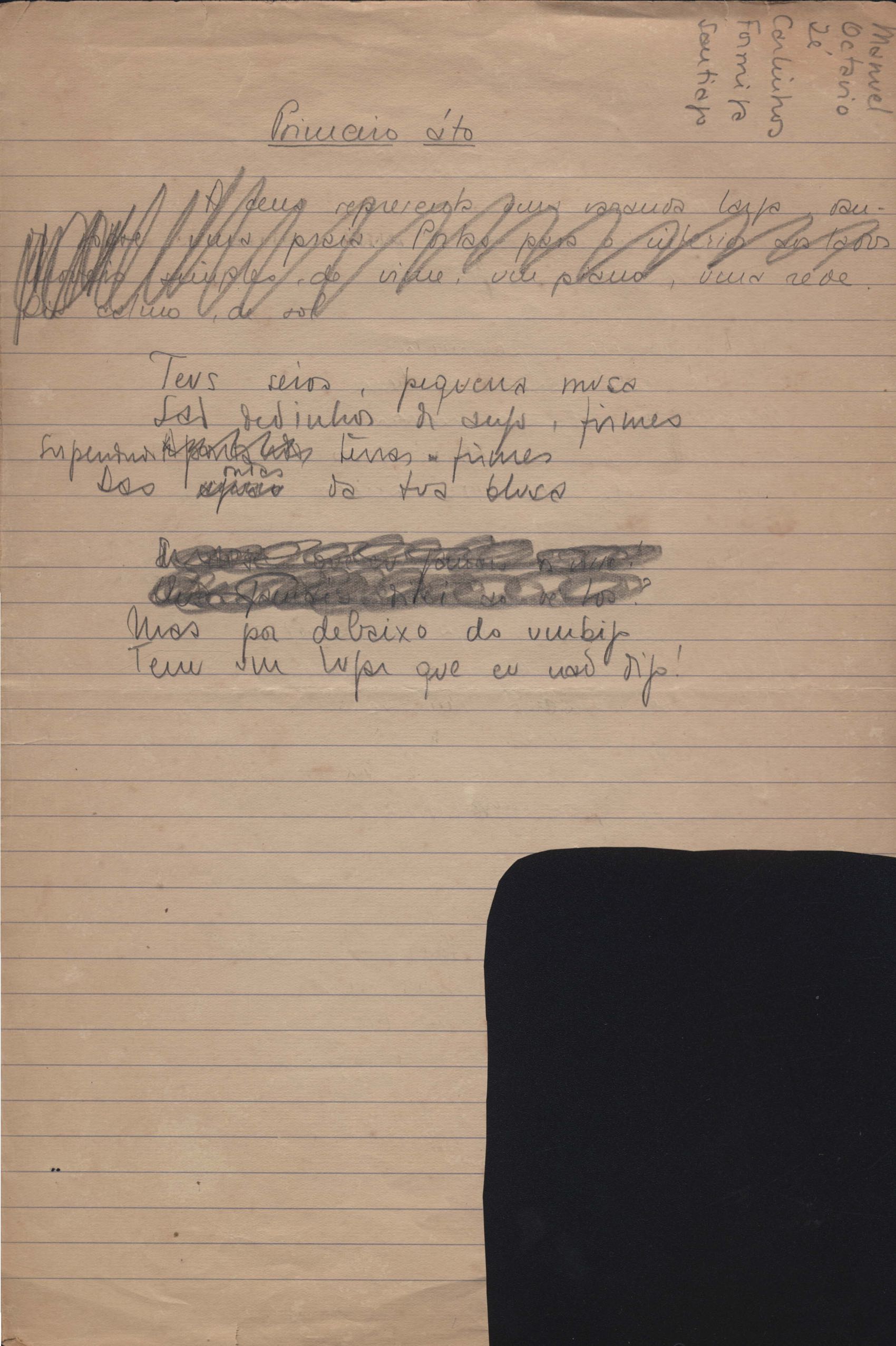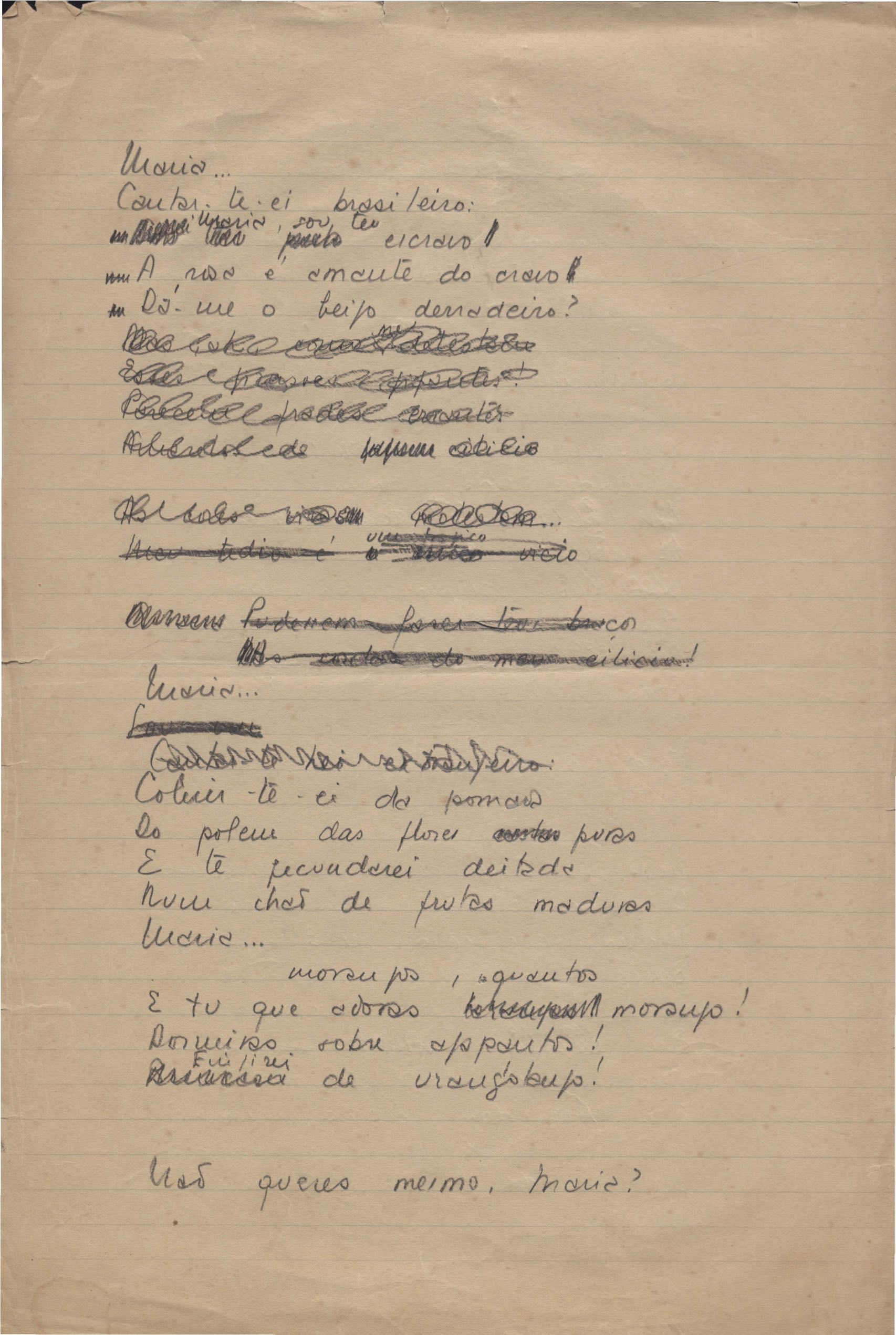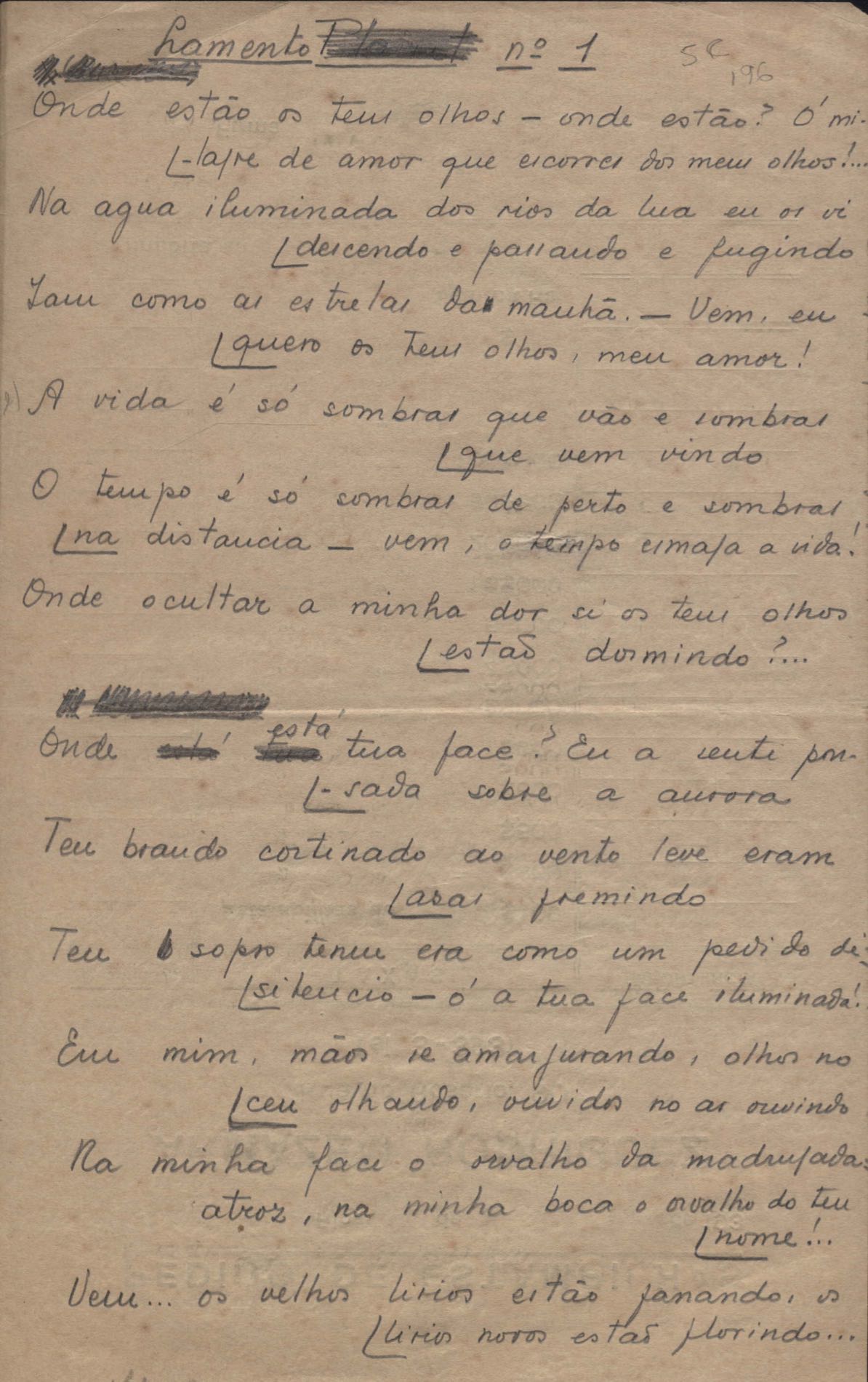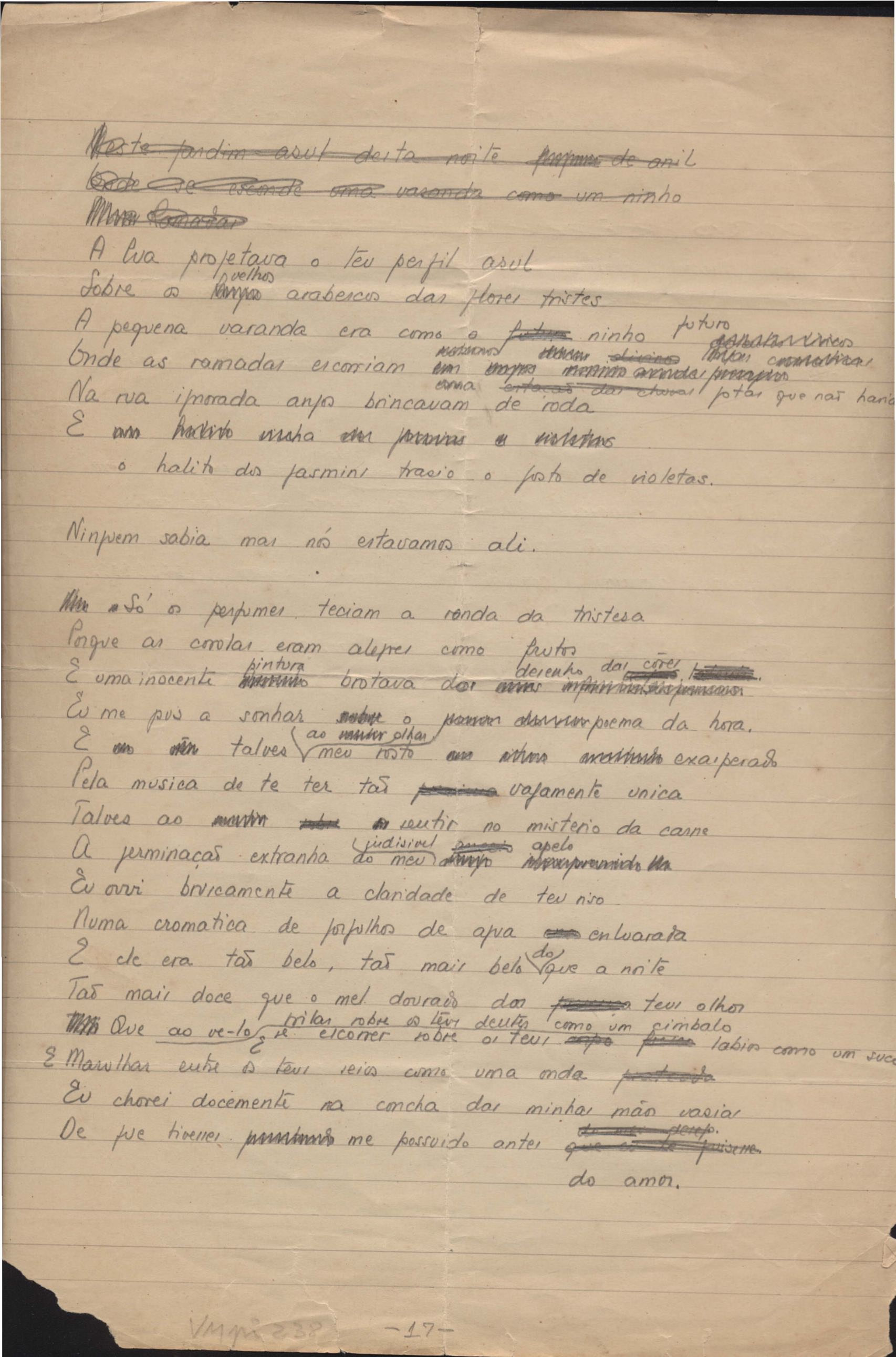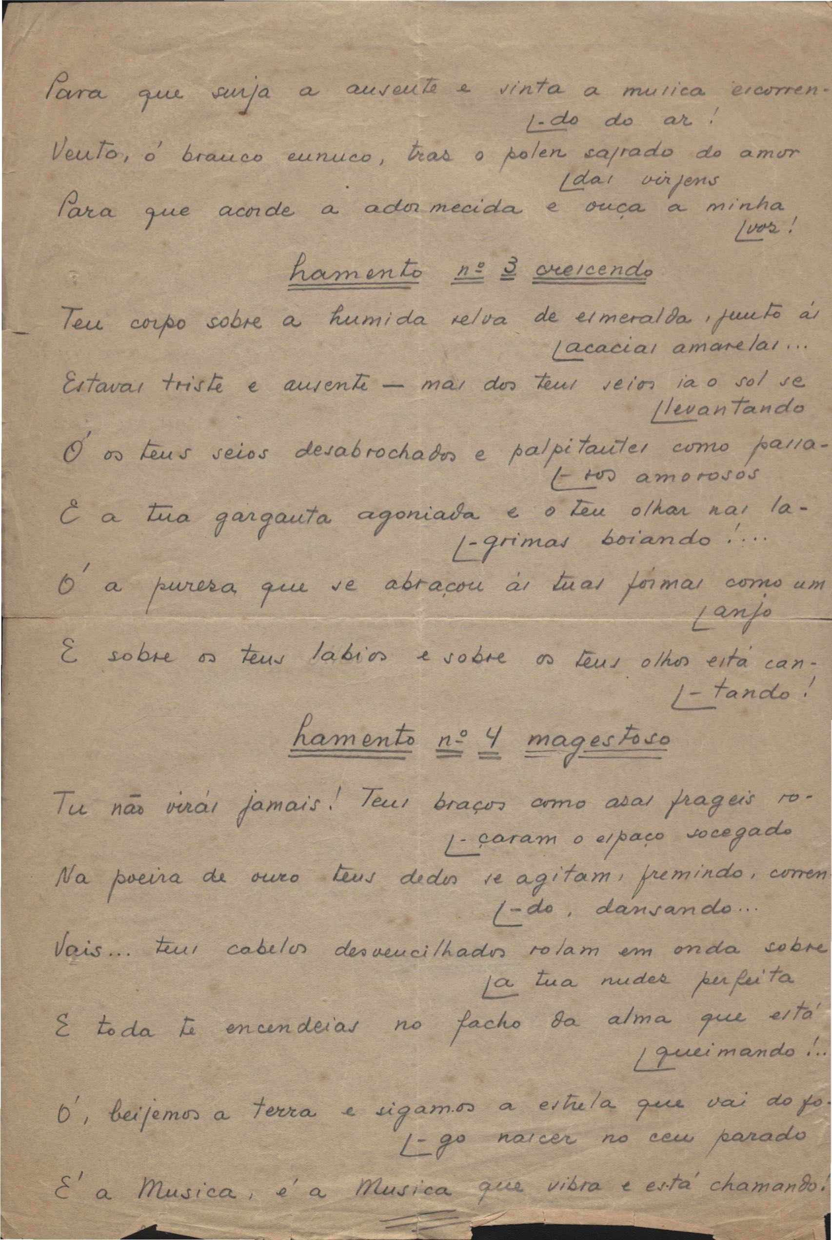 Poemas (33). "Amor nos três pavimentos", "Ária para assovio", "Balada feroz", "Balada para Maria", "A brusca poesia da mulher amada", "O cemitério na madrugada", "O falso mendigo", "Idade Média", "Invocação à mulher única", "Lamento ouvido não sei onde", "O mágico", "A máscara da noite", "A mulher que passa", "Poema para todas as mulheres", "Princípio", "Solilóquio", "Sonata do amor perdido" [Lamento nº 1, Intermédio e Lamento nº 2], "Soneto à lua", "Soneto de agosto", "Soneto de carta e mensagem", "Soneto de contrição", "Soneto de devoção", "Soneto de inspiração", "Soneto de intimidade", "Soneto de Katherine Mansfield", "Soneto simples", "Ternura", "Três retratos", [Jóia, Maja Raquel e Milady], "Viagem à sombra", "Vida e poesia" e "A vida vivida". Anexo: 1. Prova tipográfica [da primeira edição]; 2. Outras versões manuscritas e datilografadas, com emendas, faltando os poemas "O mágico" e "Soneto à lua".
