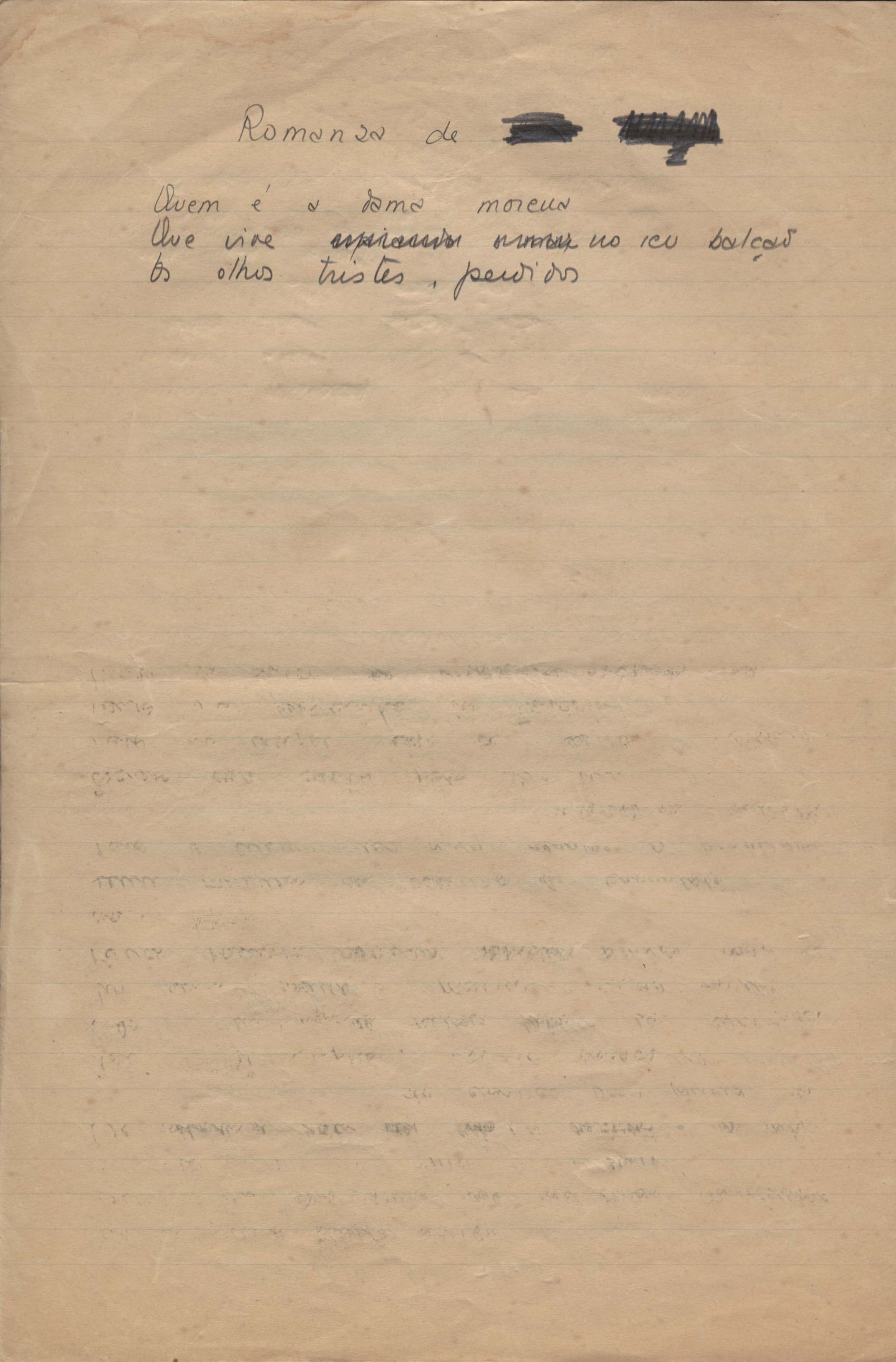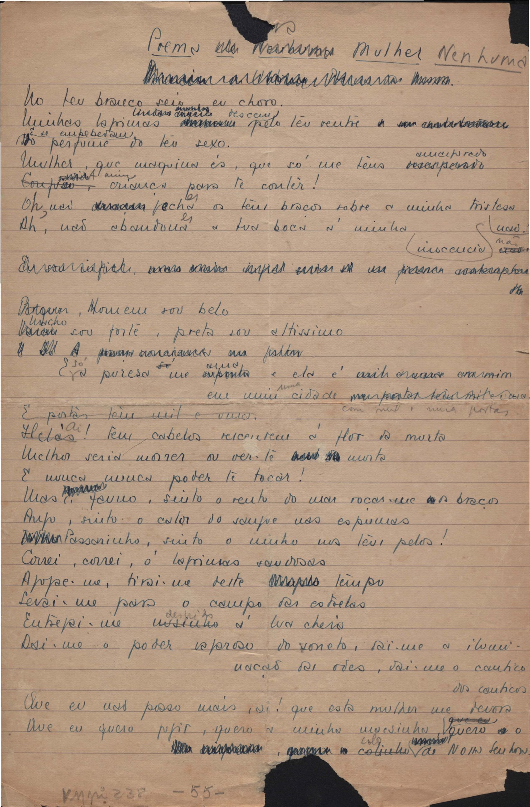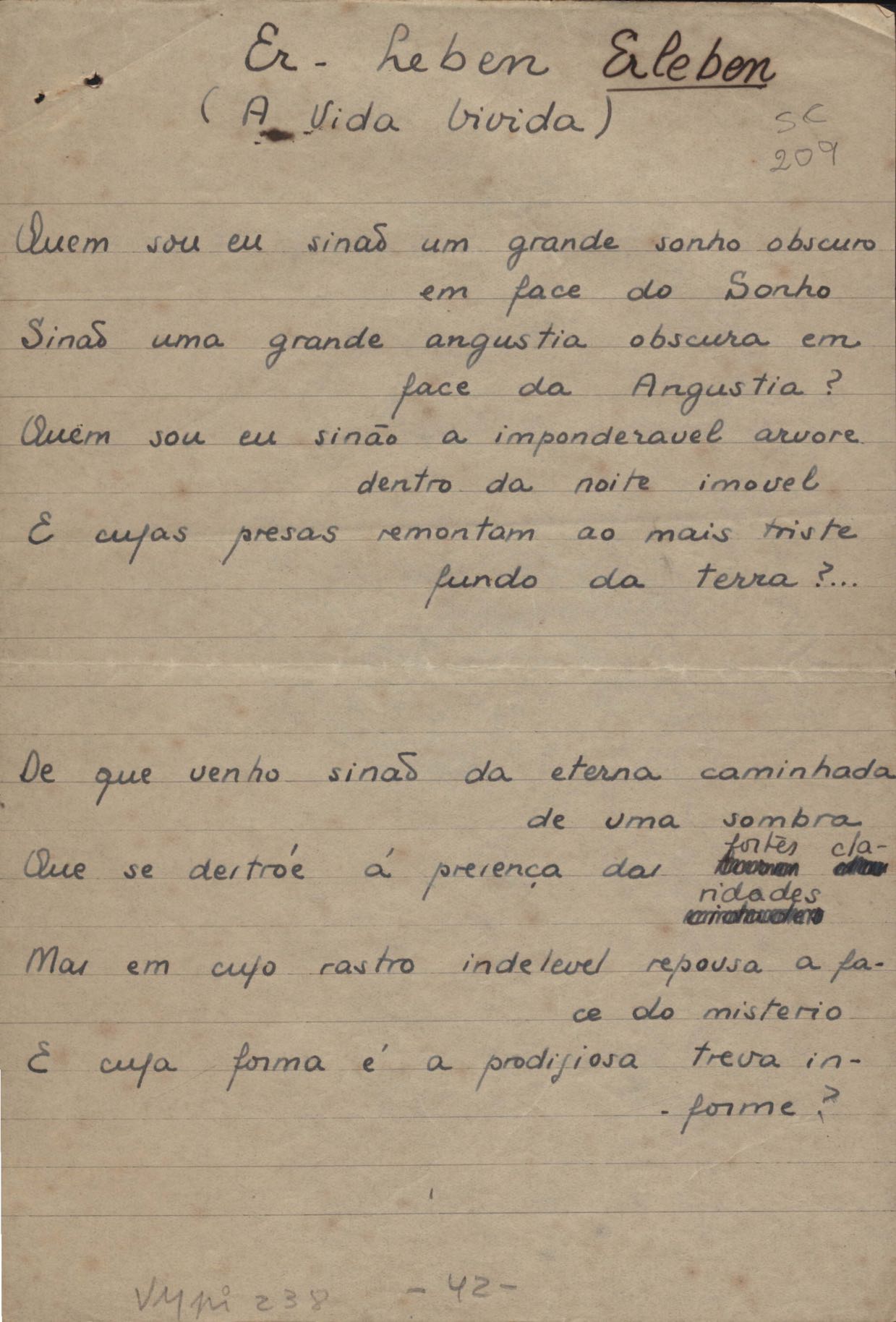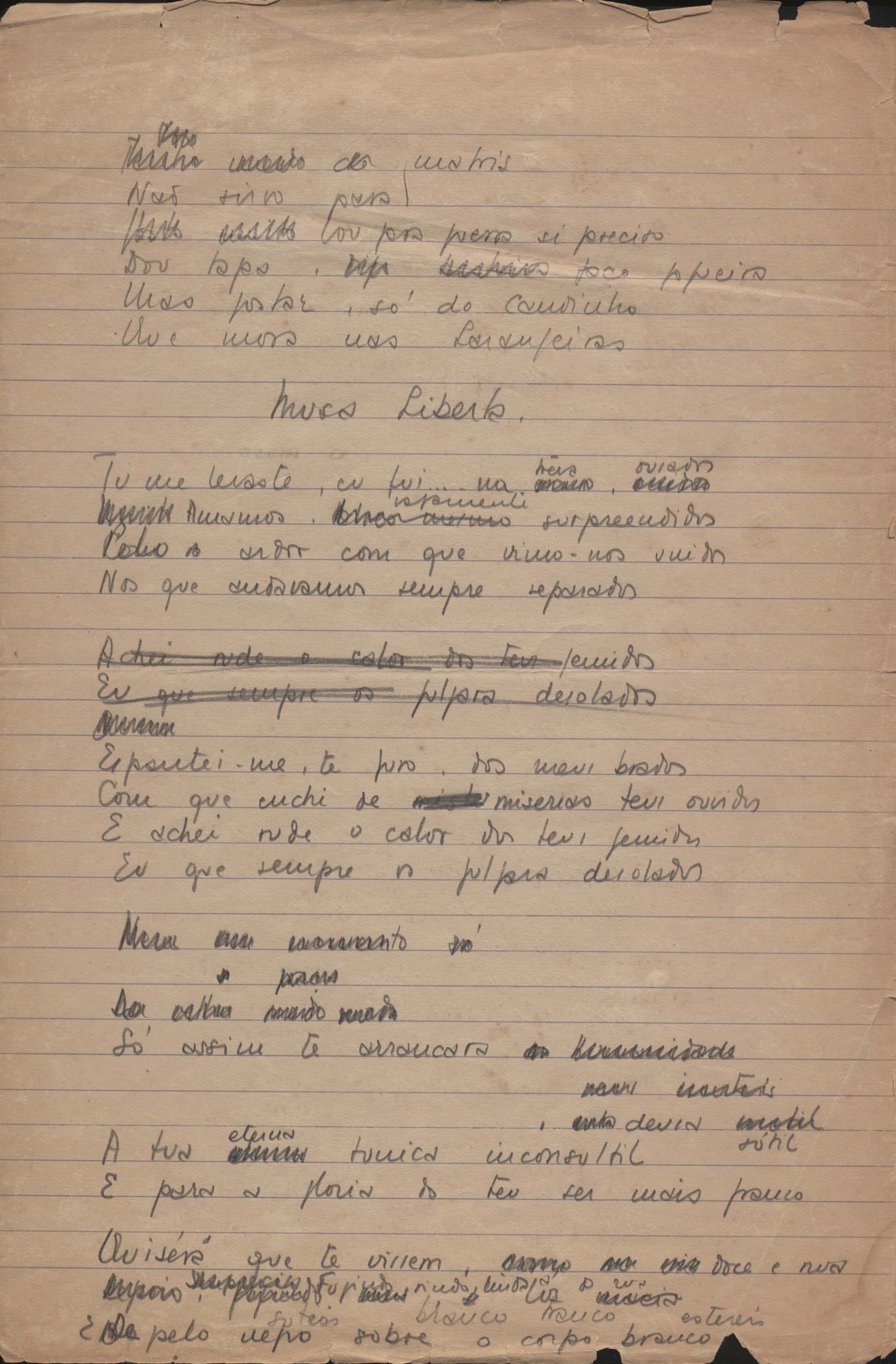 Poemas (33). "Amor nos três pavimentos", "Ária para assovio", "Balada feroz", "Balada para Maria", "A brusca poesia da mulher amada", "O cemitério na madrugada", "O falso mendigo", "Idade Média", "Invocação à mulher única", "Lamento ouvido não sei onde", "O mágico", "A máscara da noite", "A mulher que passa", "Poema para todas as mulheres", "Princípio", "Solilóquio", "Sonata do amor perdido" [Lamento nº 1, Intermédio e Lamento nº 2], "Soneto à lua", "Soneto de agosto", "Soneto de carta e mensagem", "Soneto de contrição", "Soneto de devoção", "Soneto de inspiração", "Soneto de intimidade", "Soneto de Katherine Mansfield", "Soneto simples", "Ternura", "Três retratos", [Jóia, Maja Raquel e Milady], "Viagem à sombra", "Vida e poesia" e "A vida vivida". Anexo: 1. Prova tipográfica [da primeira edição]; 2. Outras versões manuscritas e datilografadas, com emendas, faltando os poemas "O mágico" e "Soneto à lua".