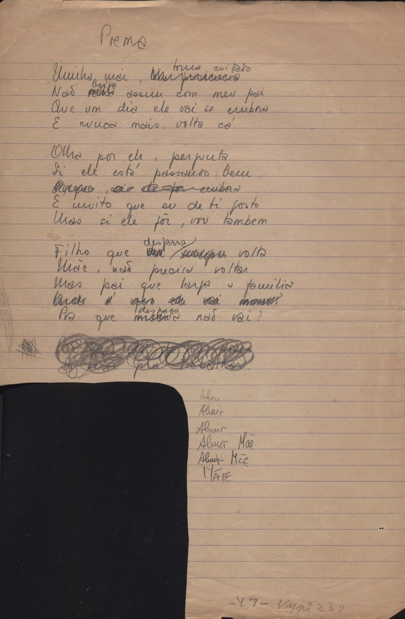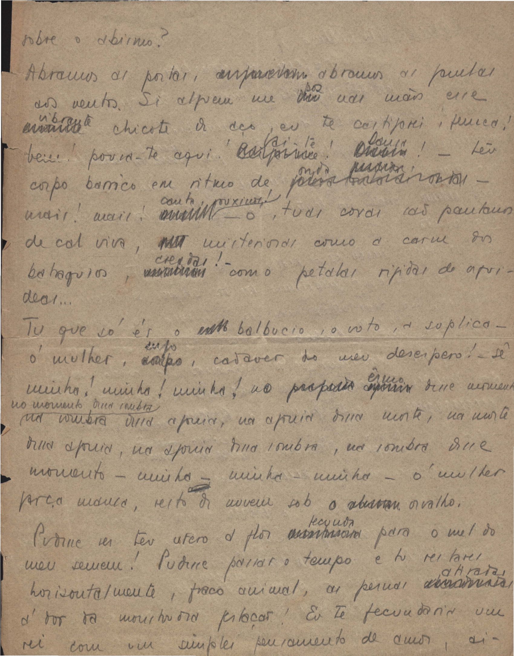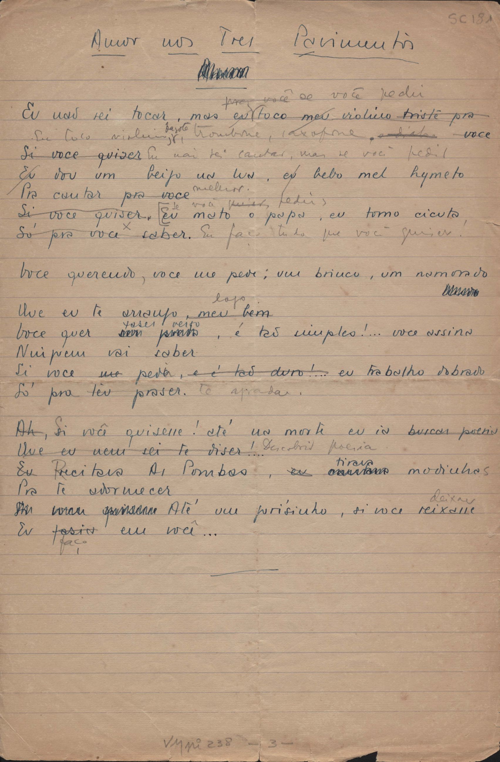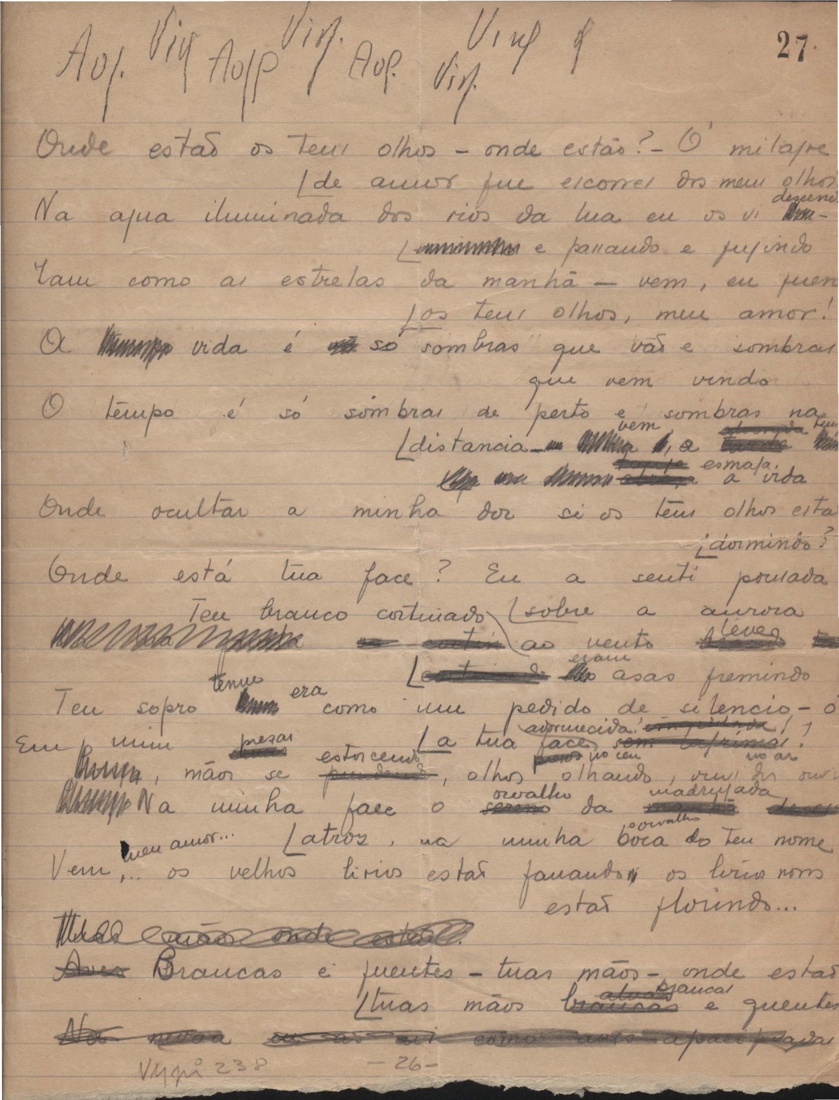 Poemas (33). "Amor nos três pavimentos", "Ária para assovio", "Balada feroz", "Balada para Maria", "A brusca poesia da mulher amada", "O cemitério na madrugada", "O falso mendigo", "Idade Média", "Invocação à mulher única", "Lamento ouvido não sei onde", "O mágico", "A máscara da noite", "A mulher que passa", "Poema para todas as mulheres", "Princípio", "Solilóquio", "Sonata do amor perdido" [Lamento nº 1, Intermédio e Lamento nº 2], "Soneto à lua", "Soneto de agosto", "Soneto de carta e mensagem", "Soneto de contrição", "Soneto de devoção", "Soneto de inspiração", "Soneto de intimidade", "Soneto de Katherine Mansfield", "Soneto simples", "Ternura", "Três retratos", [Jóia, Maja Raquel e Milady], "Viagem à sombra", "Vida e poesia" e "A vida vivida". Anexo: 1. Prova tipográfica [da primeira edição]; 2. Outras versões manuscritas e datilografadas, com emendas, faltando os poemas "O mágico" e "Soneto à lua".