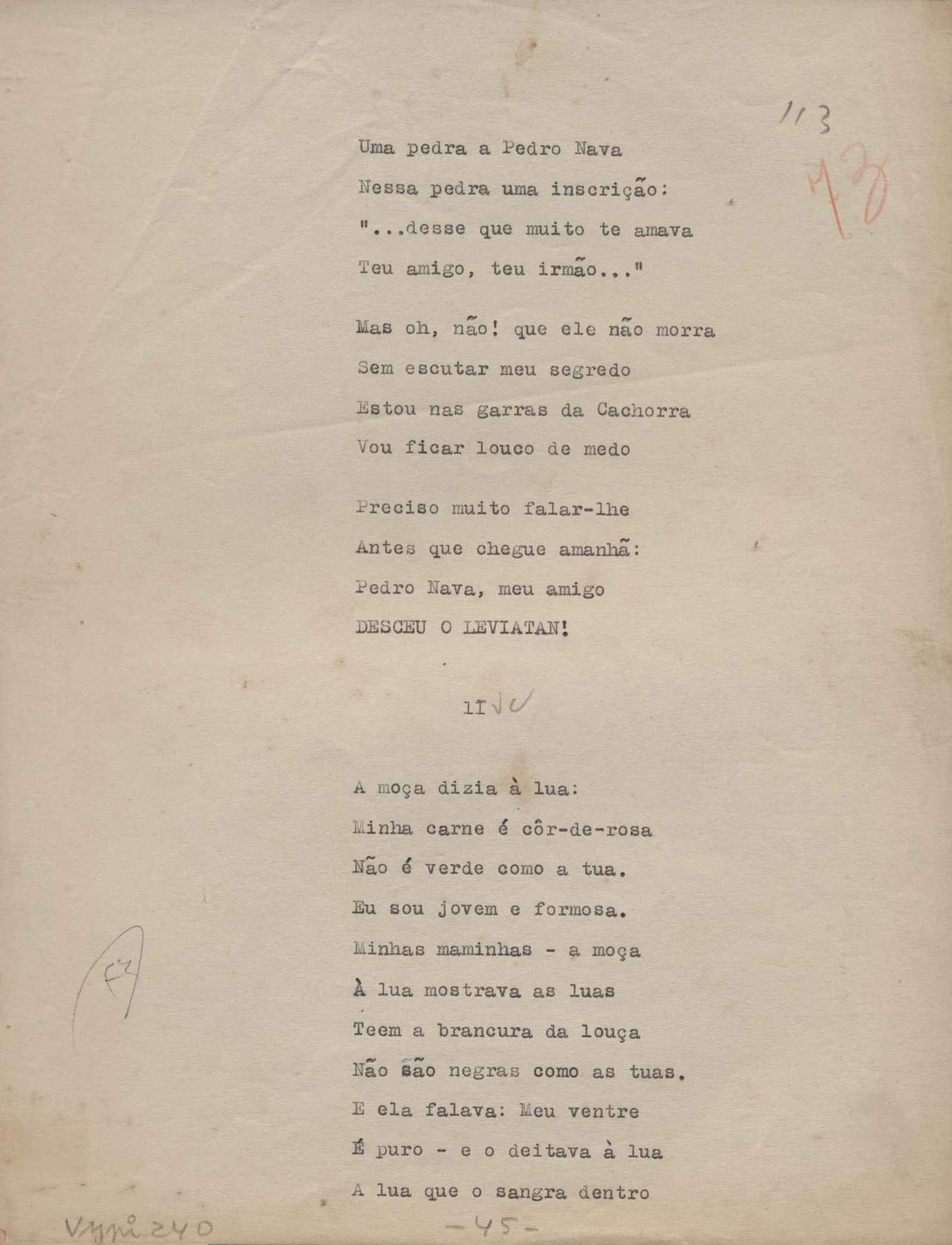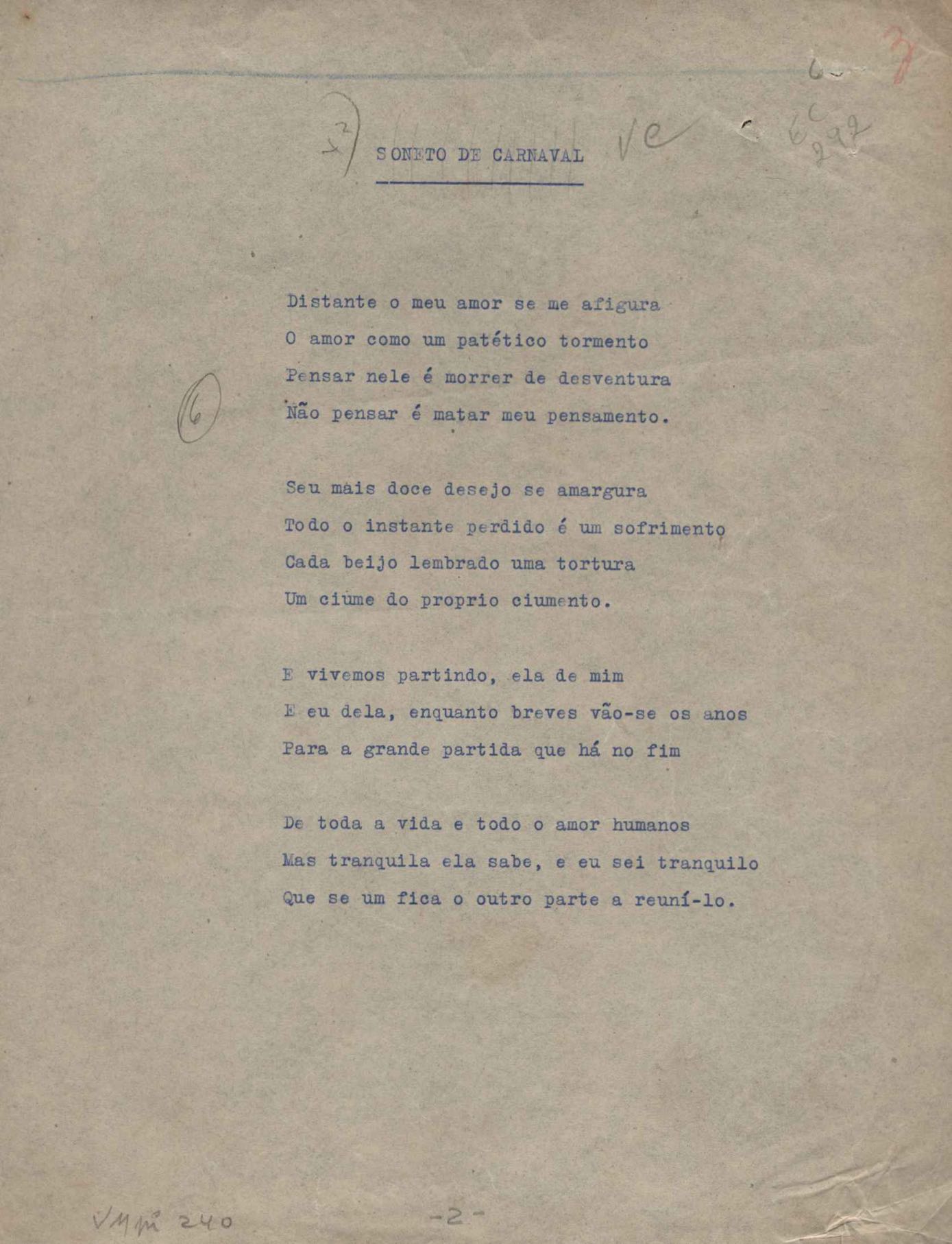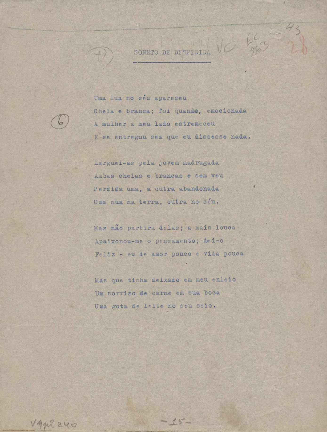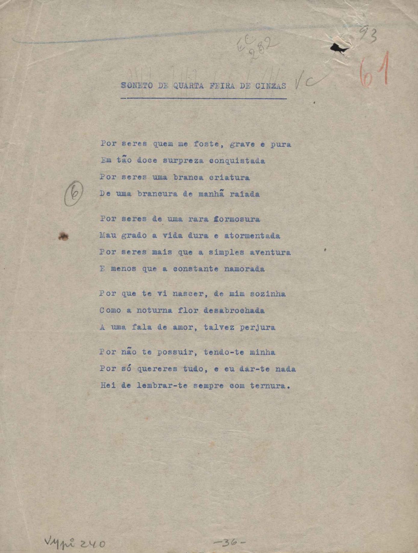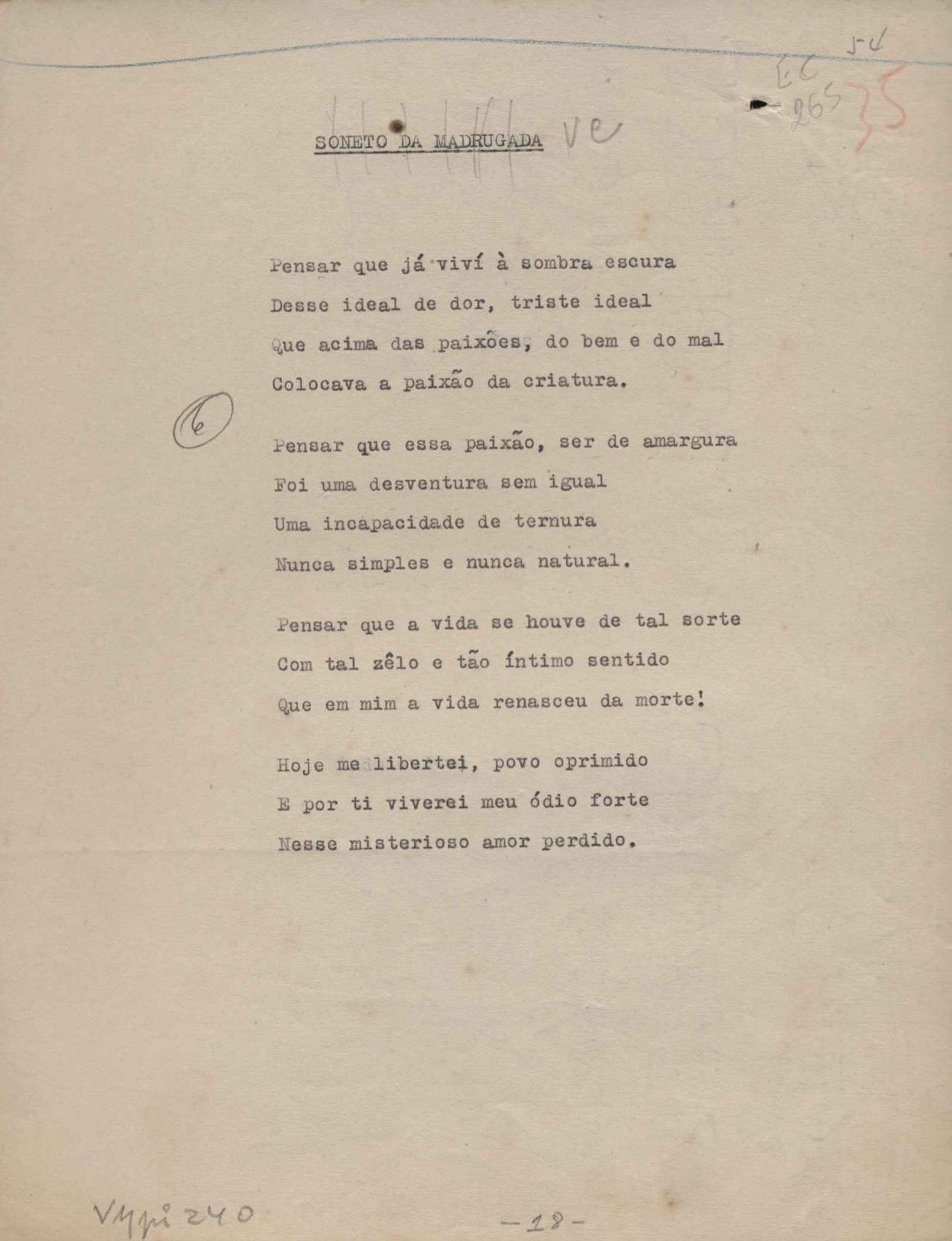 Poemas (52). "A um passarinho", "Os acrobatas", "Allegro", "O apelo", "Azul e branco", "balada da praia do Vidigal", "Balada das meninas de bicicleta", "Balada de Pedro Nava", "Balada do cavalão", "Balada do enterrado vivo", "Balada do mangue", "Barcarola", "Canção", "Cântico", "O dia da criação", "Epitáfio", "O escândalo da rosa", "Estrela polar", "Imitação de Rilke", "Lápide de Sinhazinha Ferreira", "Mar", "Marina", "Marinha", "A morte", "Notícia d'O Século", "Paisagem", "A partida", "Pescador", "Poema de Natal", "Quatro sonetos de meditação", "O riso", "Rosário", "Saudade de Manuel Bandeira", "Sinos de Oxford", "Sombra e luz", "Soneto a Otávio de Faria", "Soneto ao inverno", "Soneto da madrugada", "Soneto de Carnaval", "Soneto de despedida", "Soneto de fidelidade", "Soneto de Londres", "Soneto de quarta-feira de cinzas", "Soneto de separação", "Soneto de véspera", "Soneto do maior amor" e "Trecho". Anexo: 1. Prova tipográfica da primeira edição (incompleta); 2. Outras versões manuscritas e datilografadas, com emendas, exceto de: "Balada das meninas de bicicleta", "Marinha", "Notícia d'O Século", "Saudade de Manuel Bandeira" e "Soneto de despedida".
