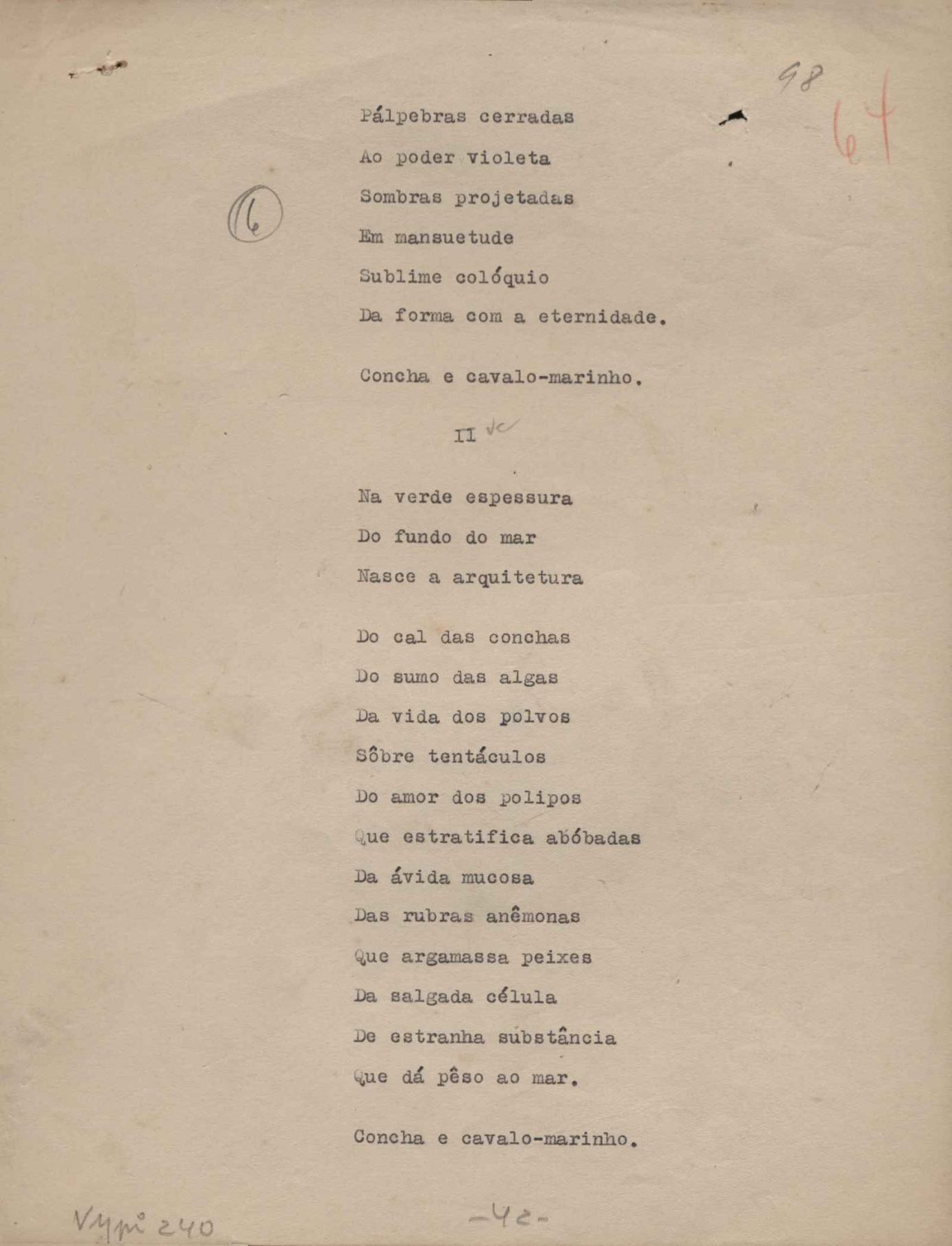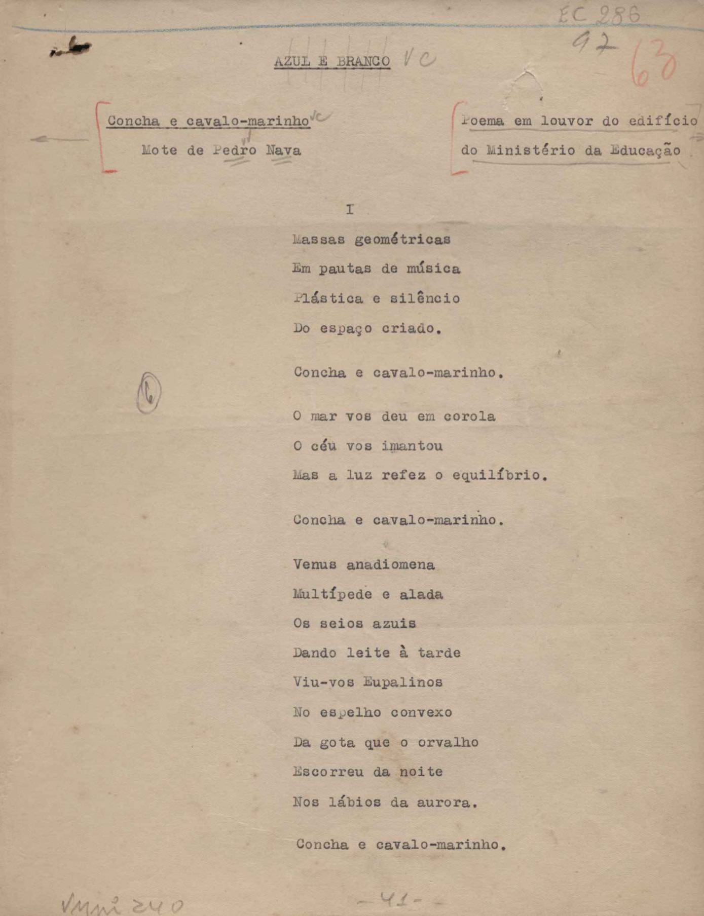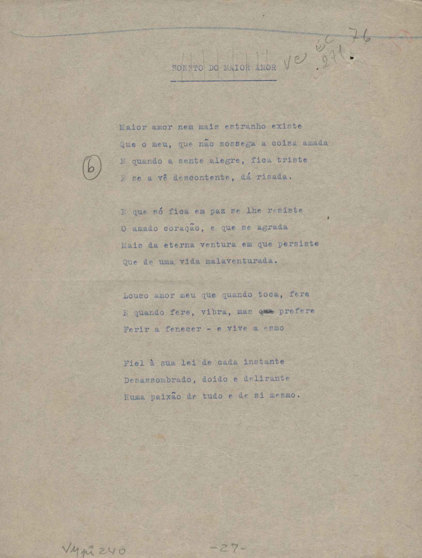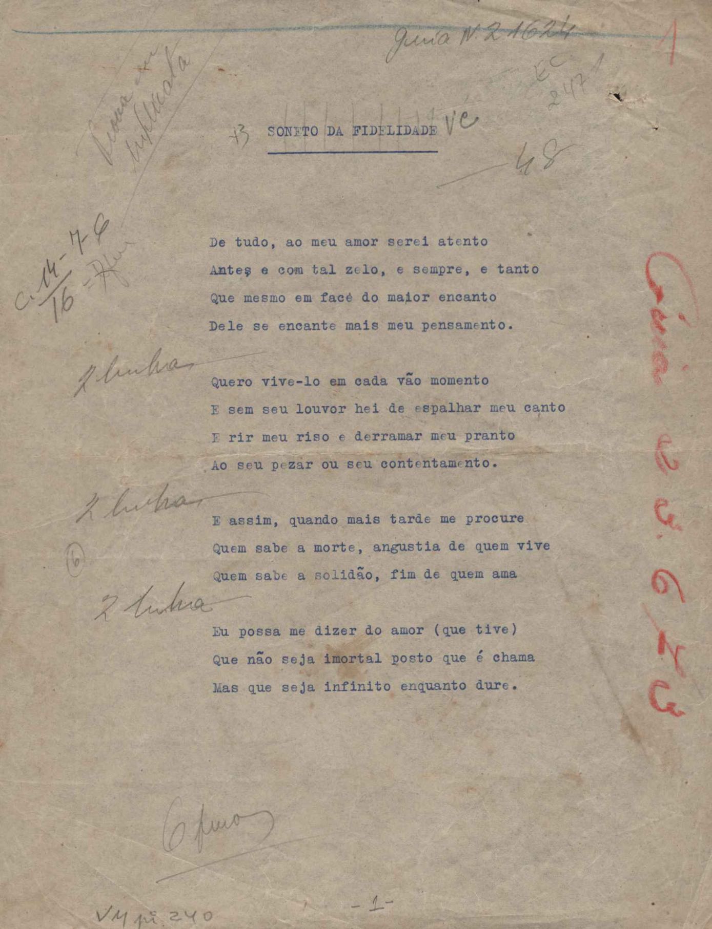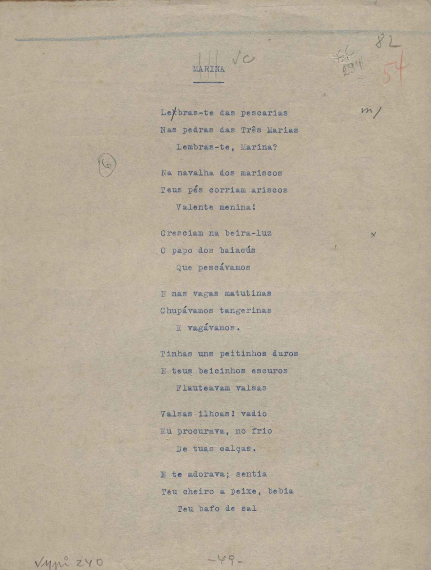 Poemas (52). "A um passarinho", "Os acrobatas", "Allegro", "O apelo", "Azul e branco", "balada da praia do Vidigal", "Balada das meninas de bicicleta", "Balada de Pedro Nava", "Balada do cavalão", "Balada do enterrado vivo", "Balada do mangue", "Barcarola", "Canção", "Cântico", "O dia da criação", "Epitáfio", "O escândalo da rosa", "Estrela polar", "Imitação de Rilke", "Lápide de Sinhazinha Ferreira", "Mar", "Marina", "Marinha", "A morte", "Notícia d'O Século", "Paisagem", "A partida", "Pescador", "Poema de Natal", "Quatro sonetos de meditação", "O riso", "Rosário", "Saudade de Manuel Bandeira", "Sinos de Oxford", "Sombra e luz", "Soneto a Otávio de Faria", "Soneto ao inverno", "Soneto da madrugada", "Soneto de Carnaval", "Soneto de despedida", "Soneto de fidelidade", "Soneto de Londres", "Soneto de quarta-feira de cinzas", "Soneto de separação", "Soneto de véspera", "Soneto do maior amor" e "Trecho". Anexo: 1. Prova tipográfica da primeira edição (incompleta); 2. Outras versões manuscritas e datilografadas, com emendas, exceto de: "Balada das meninas de bicicleta", "Marinha", "Notícia d'O Século", "Saudade de Manuel Bandeira" e "Soneto de despedida".